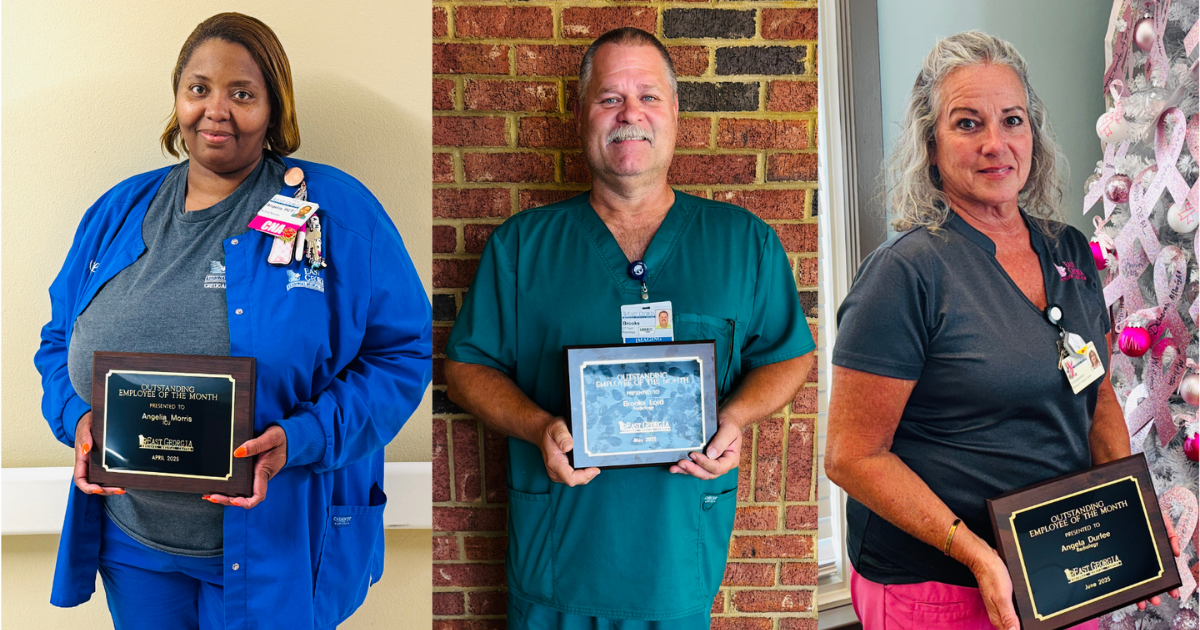 East Georgia Regional Medical Center (EGRMC) proudly recognizes its second-quarter Employees of the Month for 2025. These exceptional team members, Brooks Lord (April), Angelia Morris (May), and Renee Durfee (June), have each gone above and beyond in their roles, demonstrating outstanding dedication to our mission of providing exceptional and compassionate care for “Every patient. Every time. Always.”