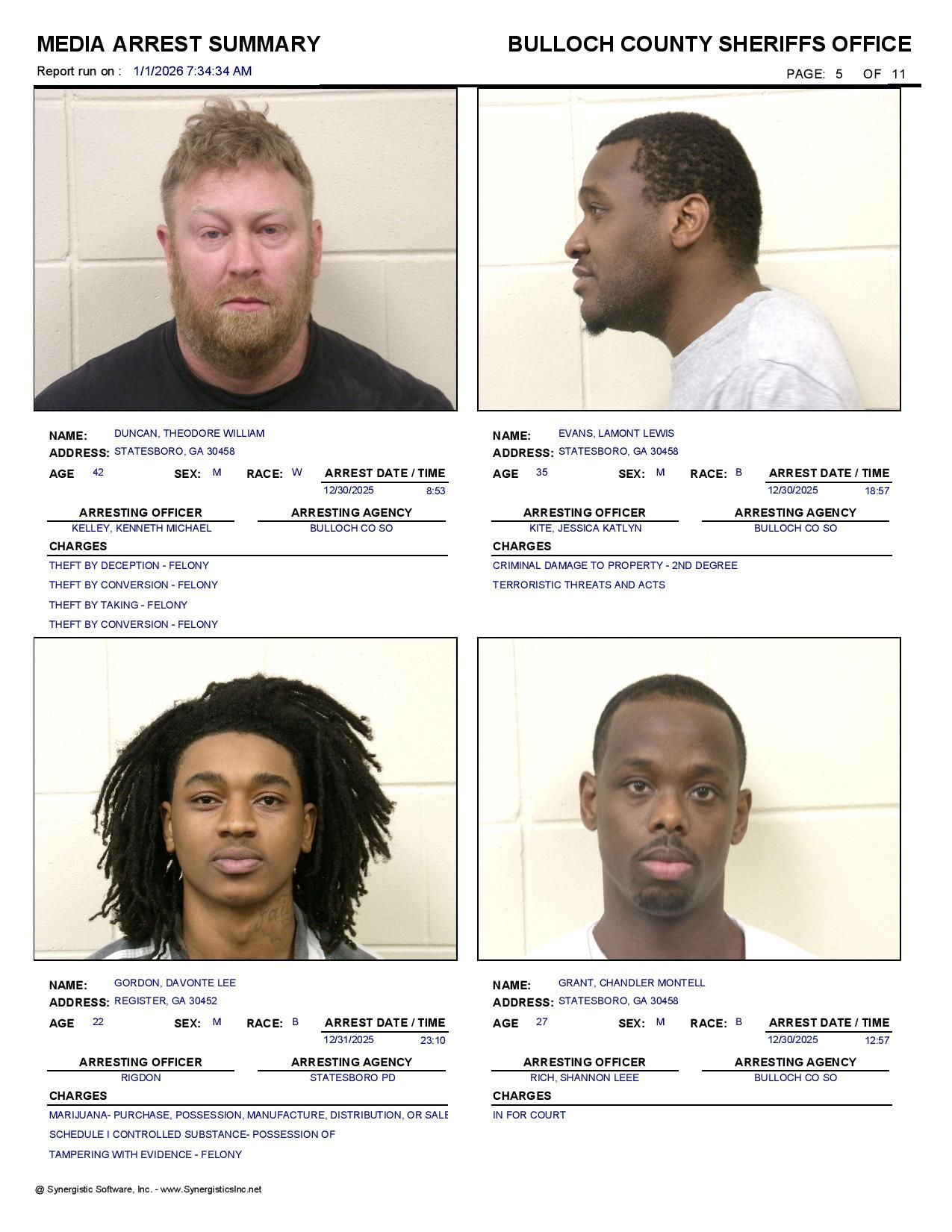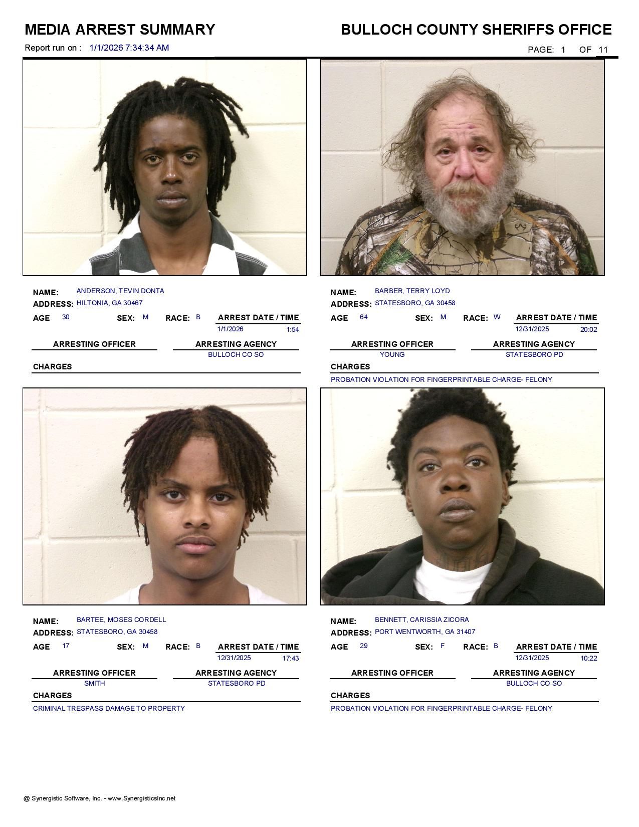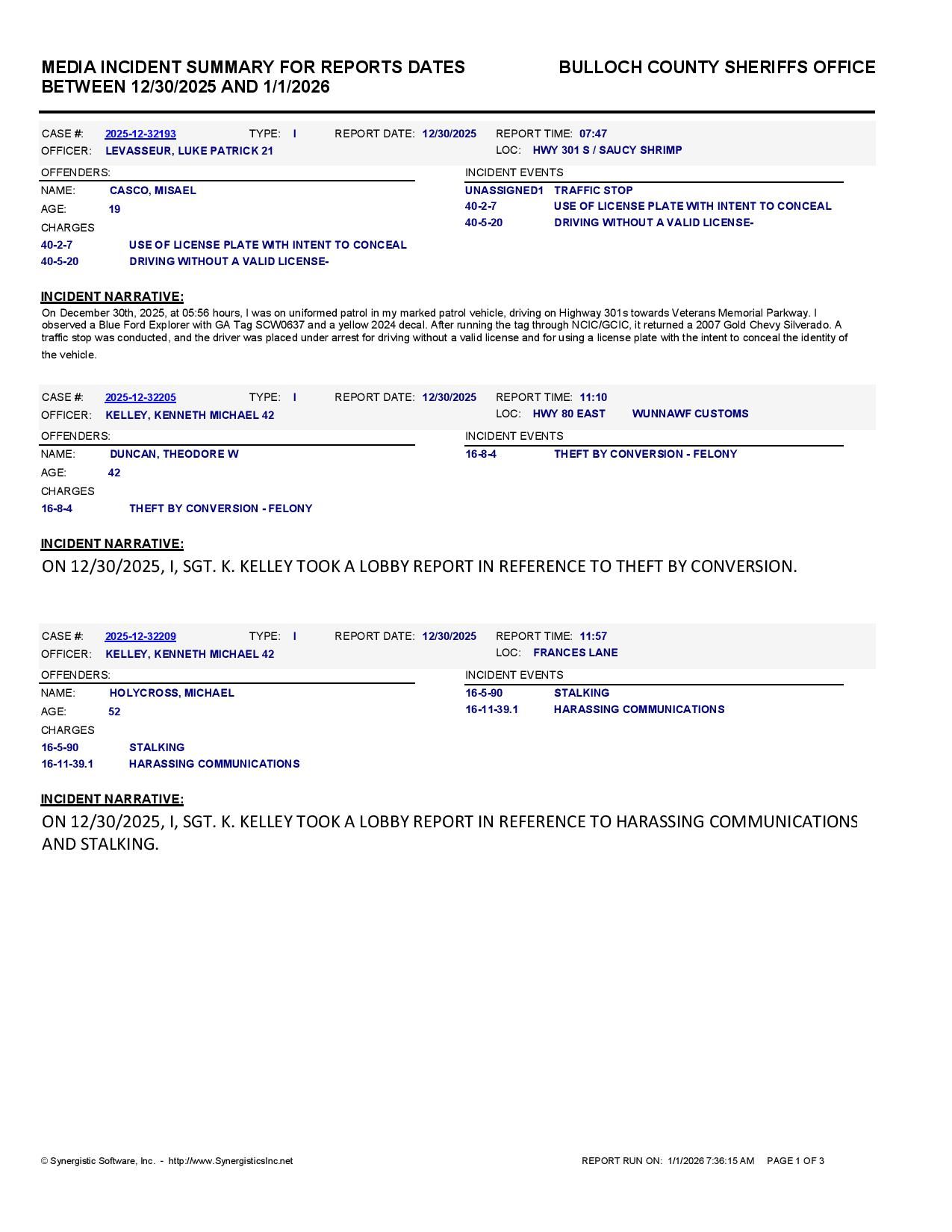 Bulloch Co. Jail Booking & Incident Report – 01/01/26