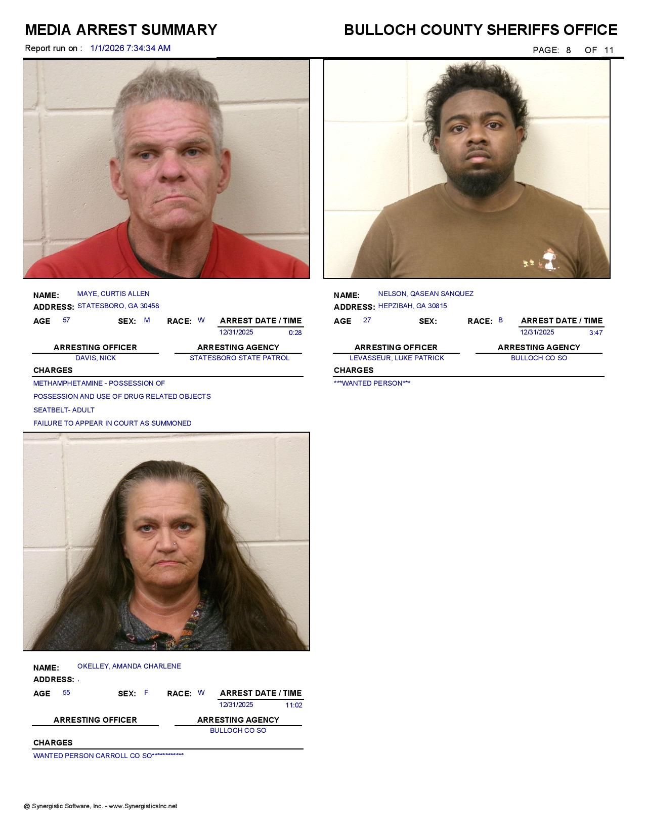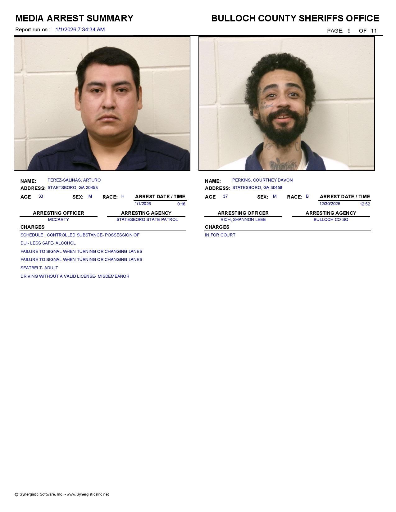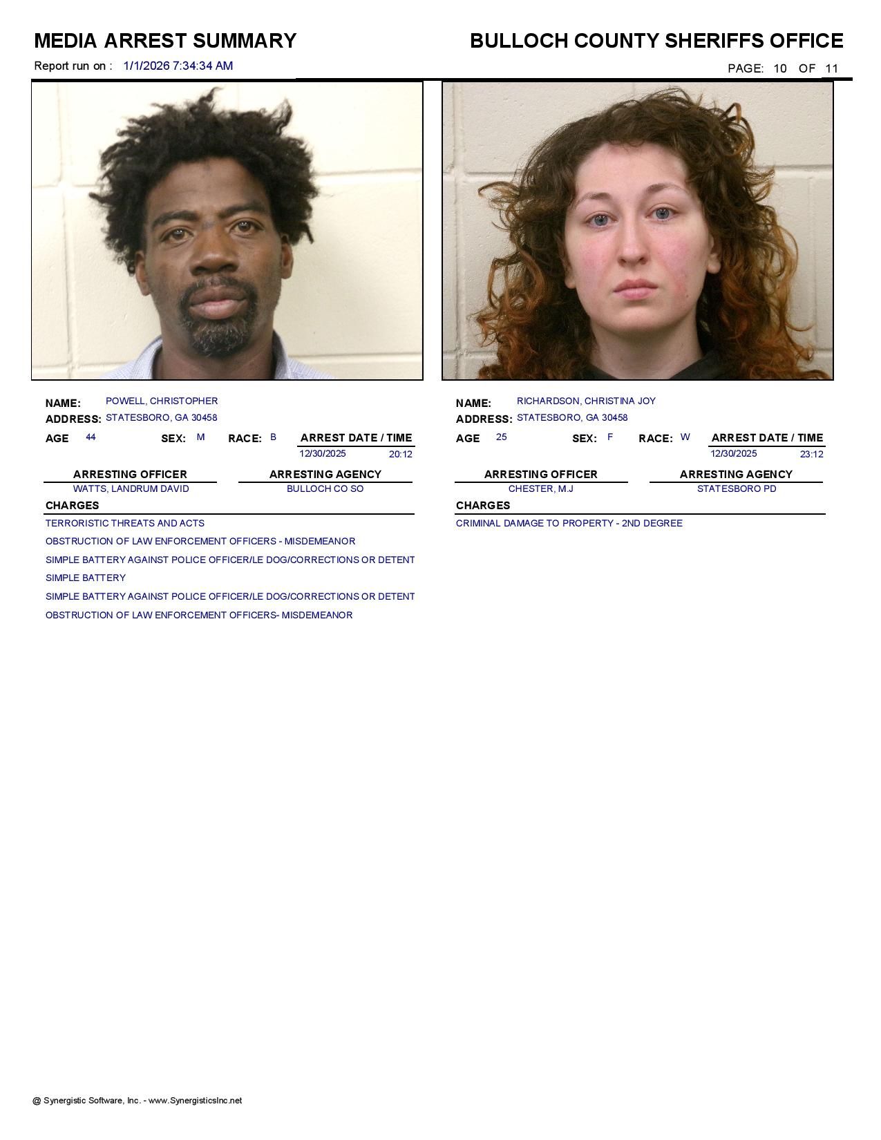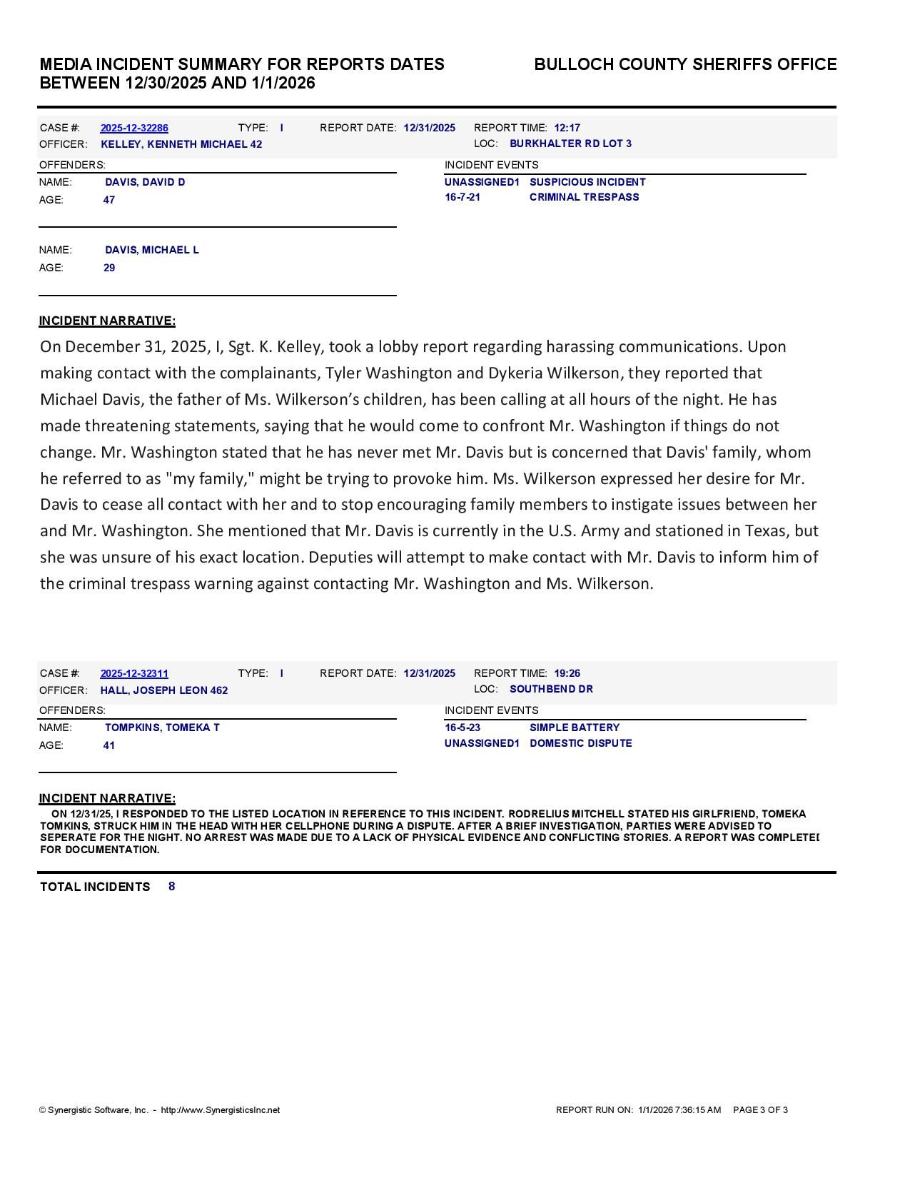 Bulloch Co. Jail Booking & Incident Report – 01/01/26
