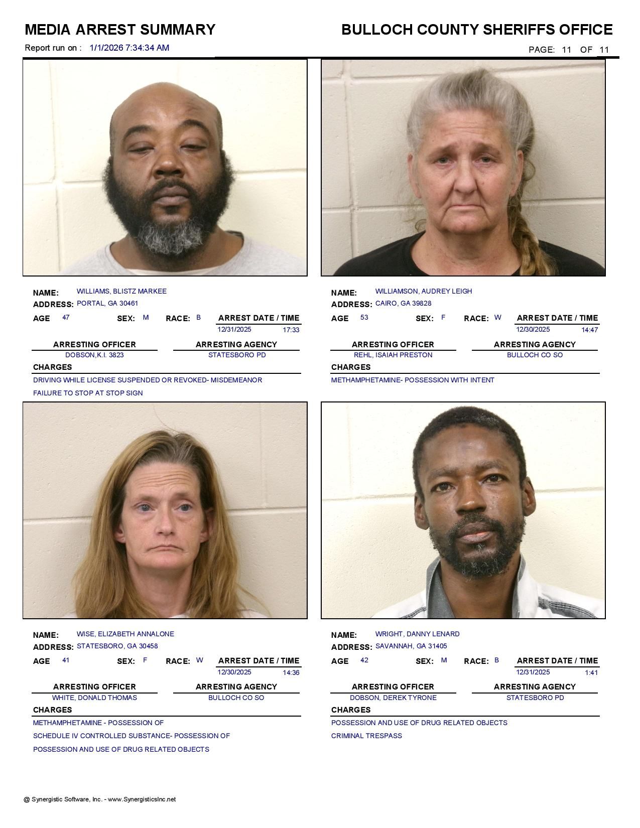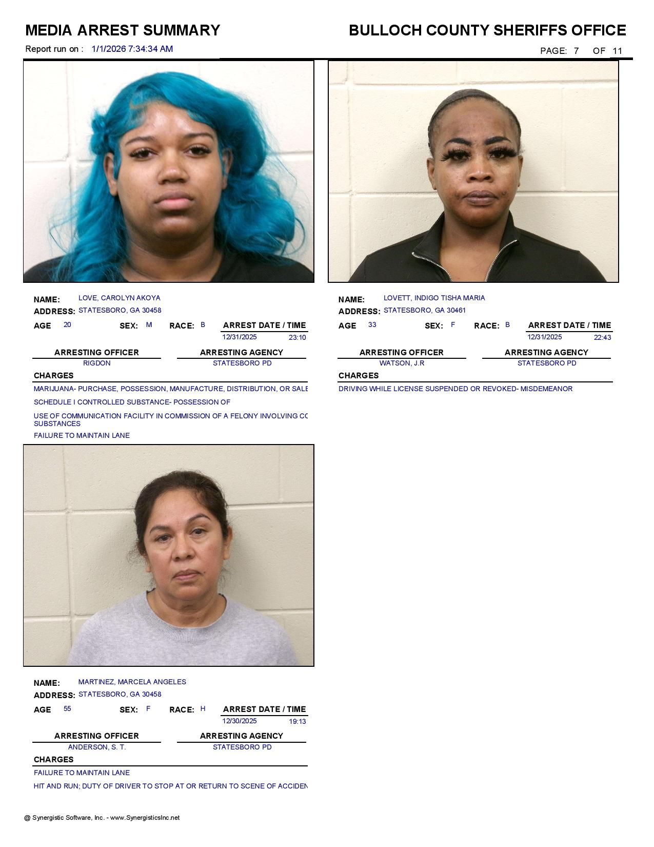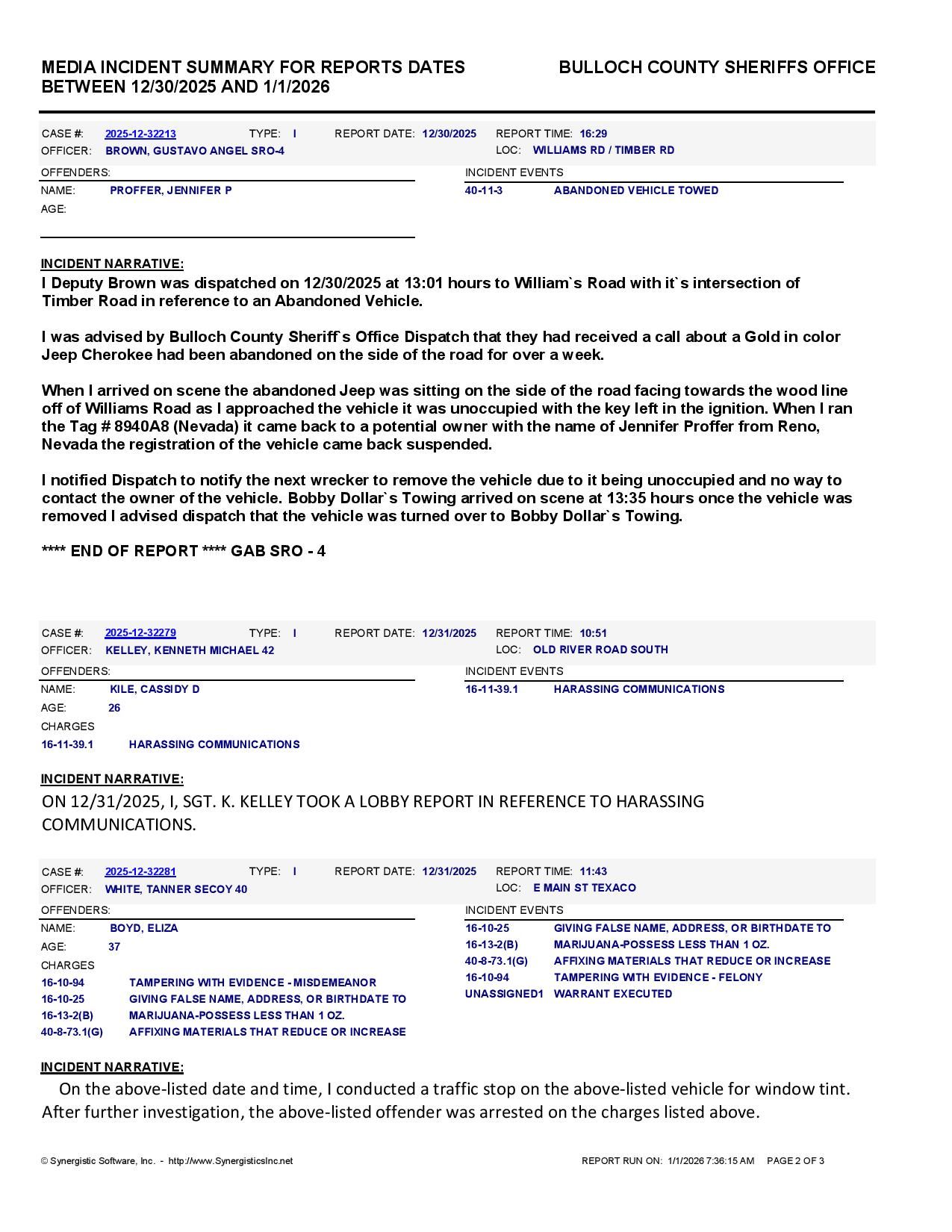 The Bulloch Co Jail Booking & Incident Report 01/01/26 details arrests from Bulloch Co., Statesboro, Brooklet, Portal, Register, and the Georgia State Patrol. Incident reports are from the Sheriff’s Office only.