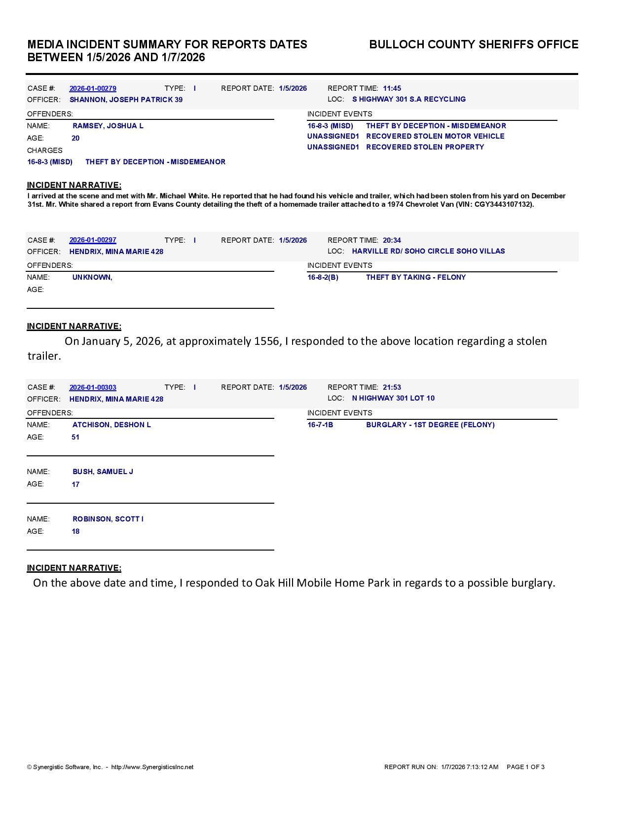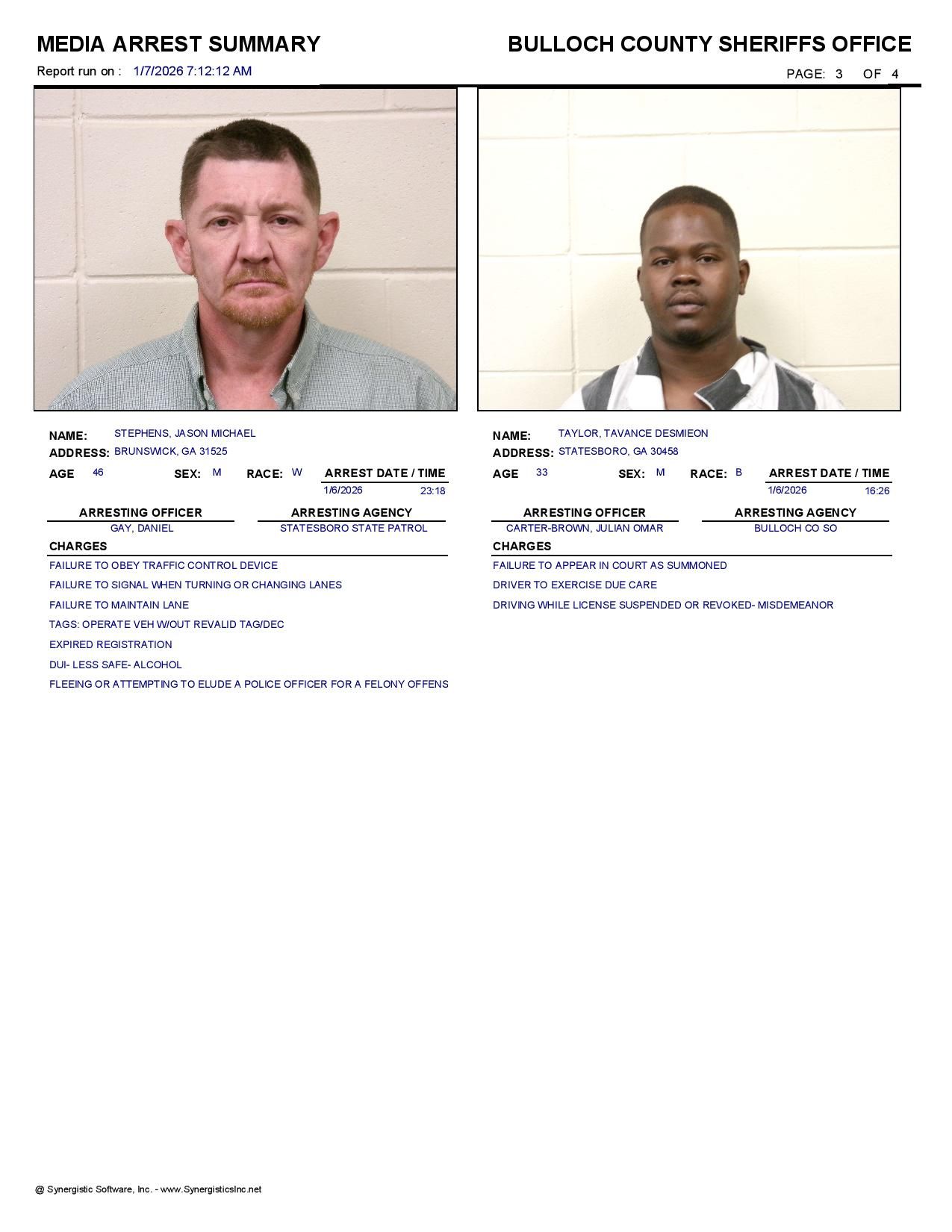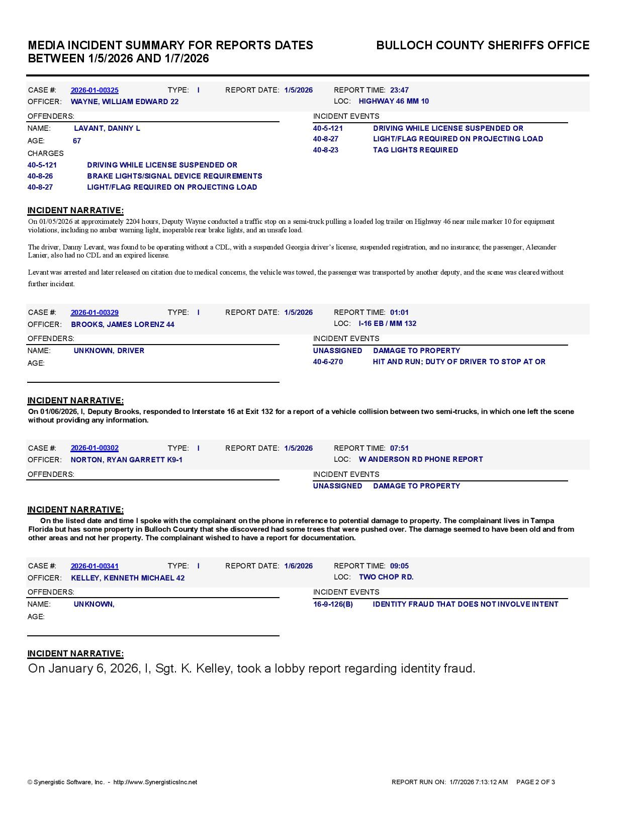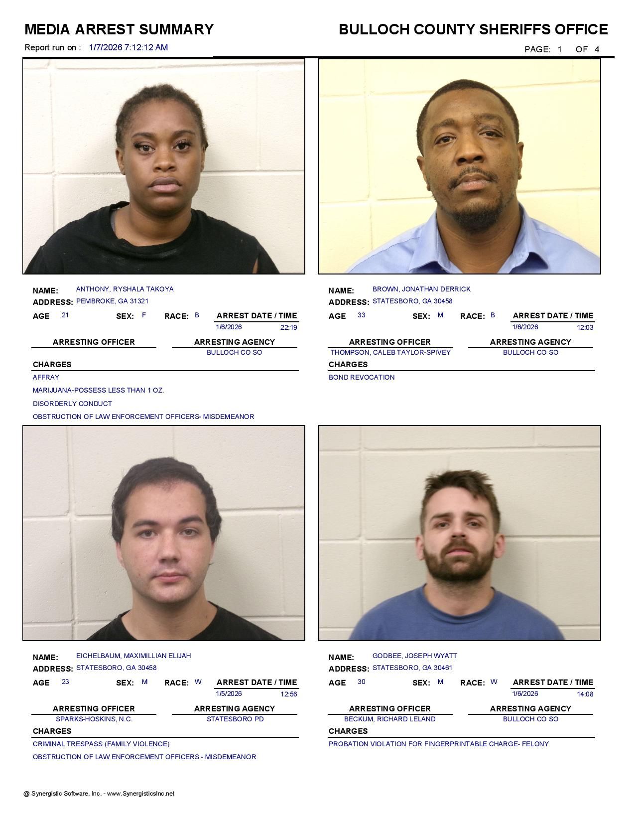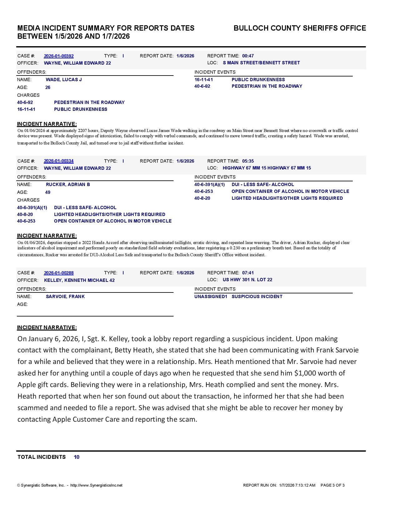 The Bulloch Co Jail Booking & Incident Report 01/07/26 details arrests from Bulloch Co., Statesboro, Brooklet, Portal, Register, and the Georgia State Patrol. Incident reports are from the Sheriff’s Office only.