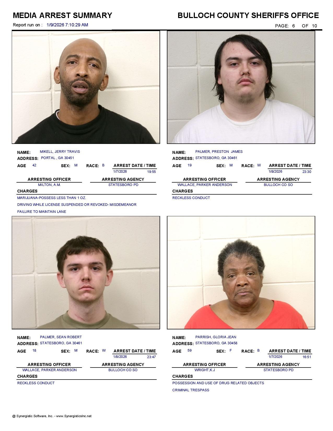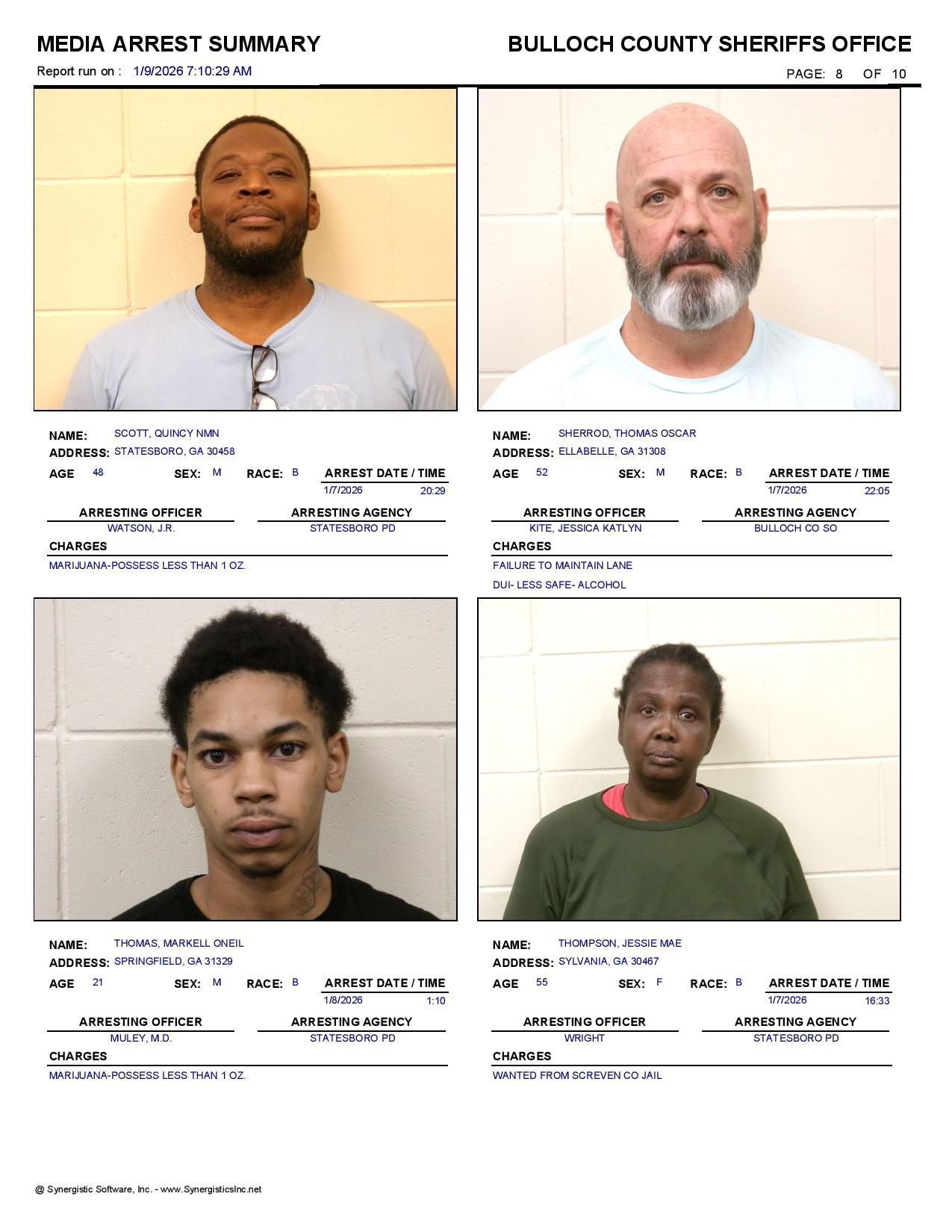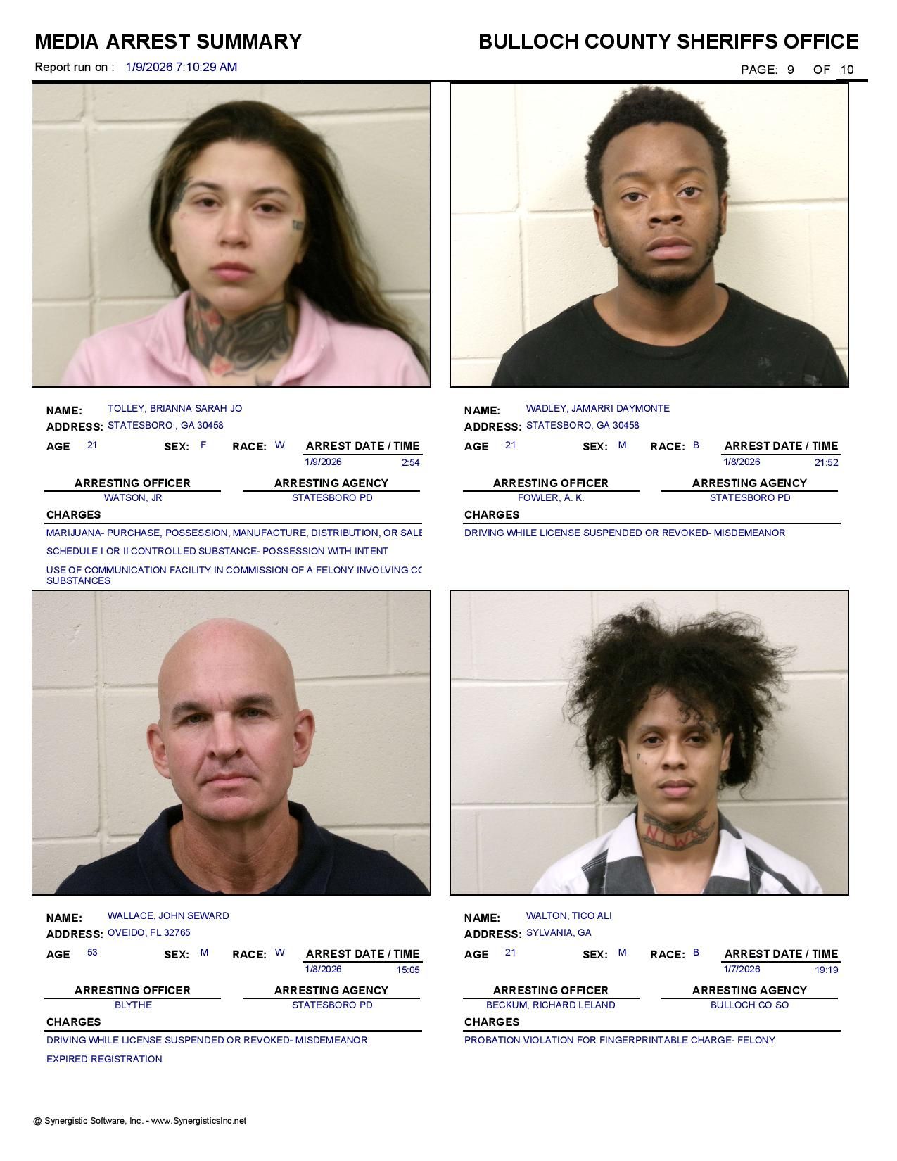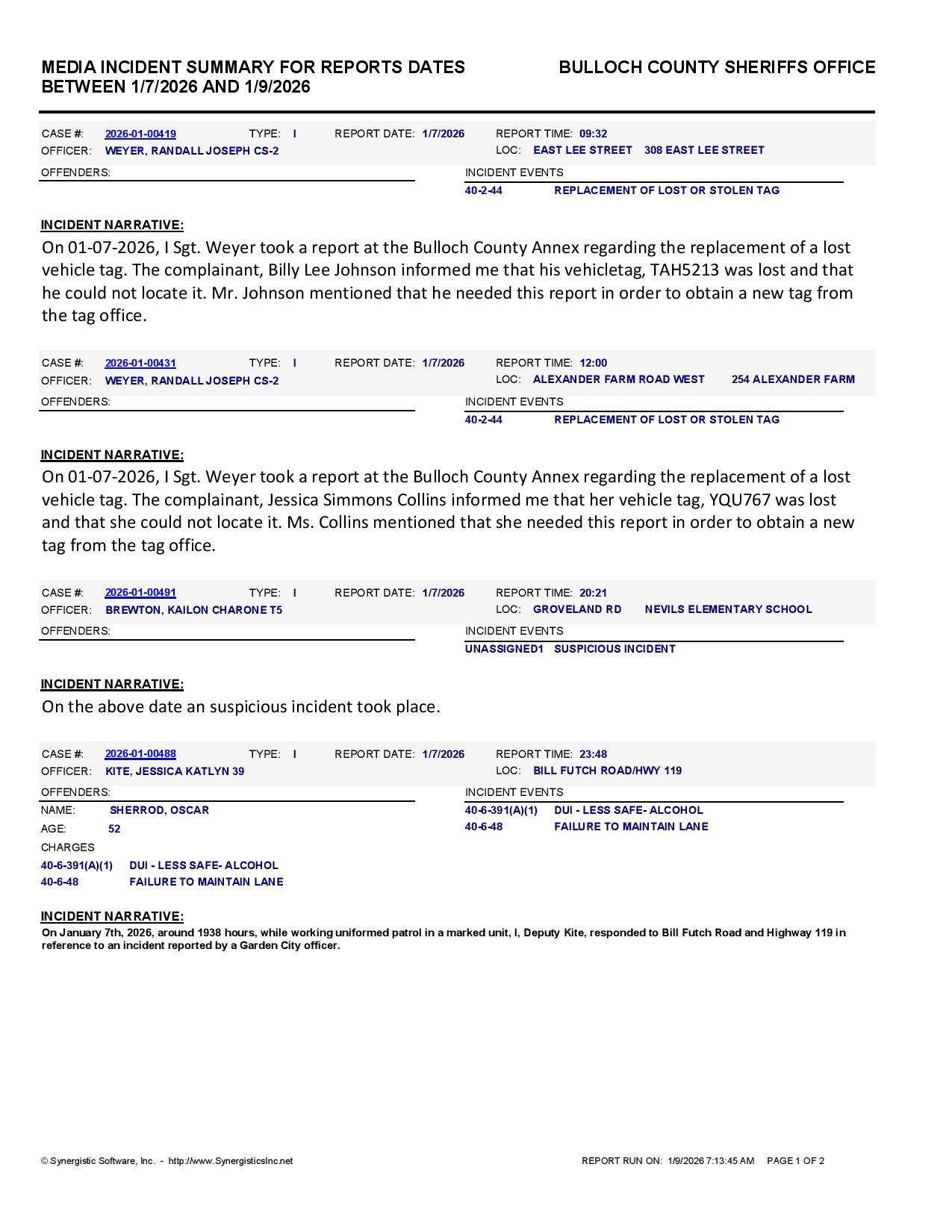 The Bulloch Co Jail Booking & Incident Report 01/09/26 details arrests from Bulloch Co., Statesboro, Brooklet, Portal, Register, and the Georgia State Patrol. Incident reports are from the Sheriff’s Office only.