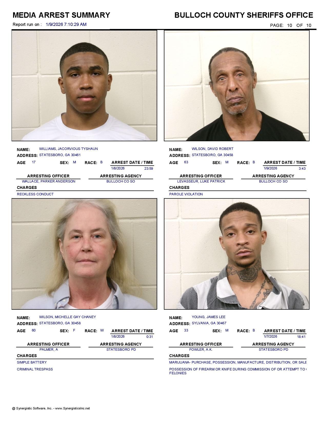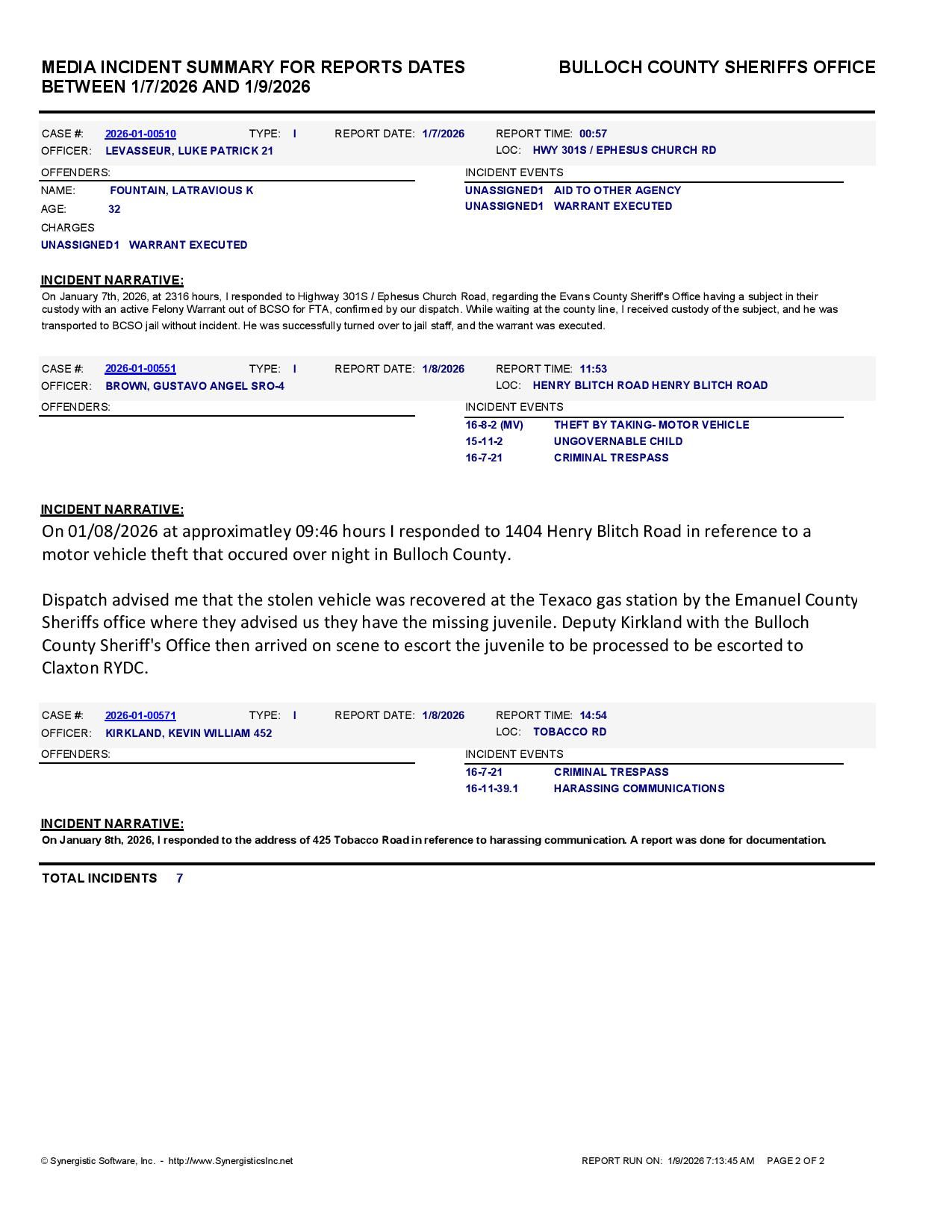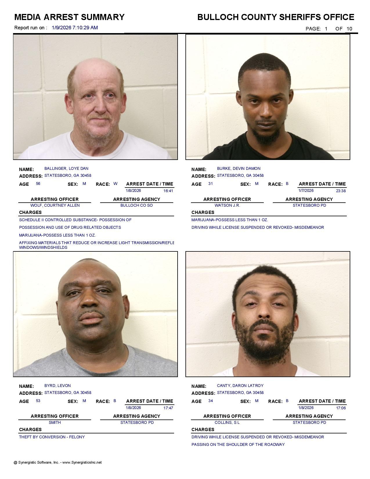 The Bulloch Co Jail Booking & Incident Report 01/09/26 details arrests from Bulloch Co., Statesboro, Brooklet, Portal, Register, and the Georgia State Patrol. Incident reports are from the Sheriff’s Office only.