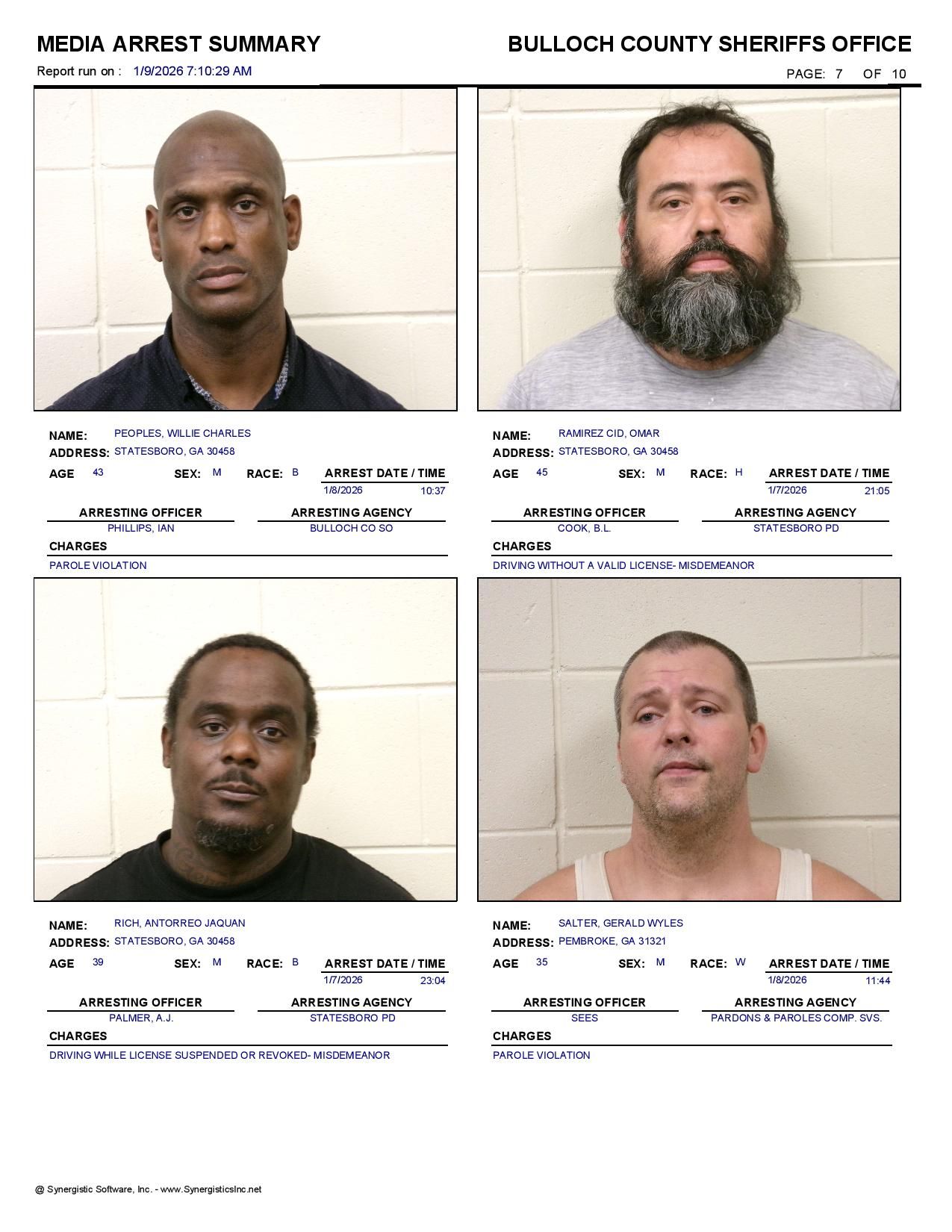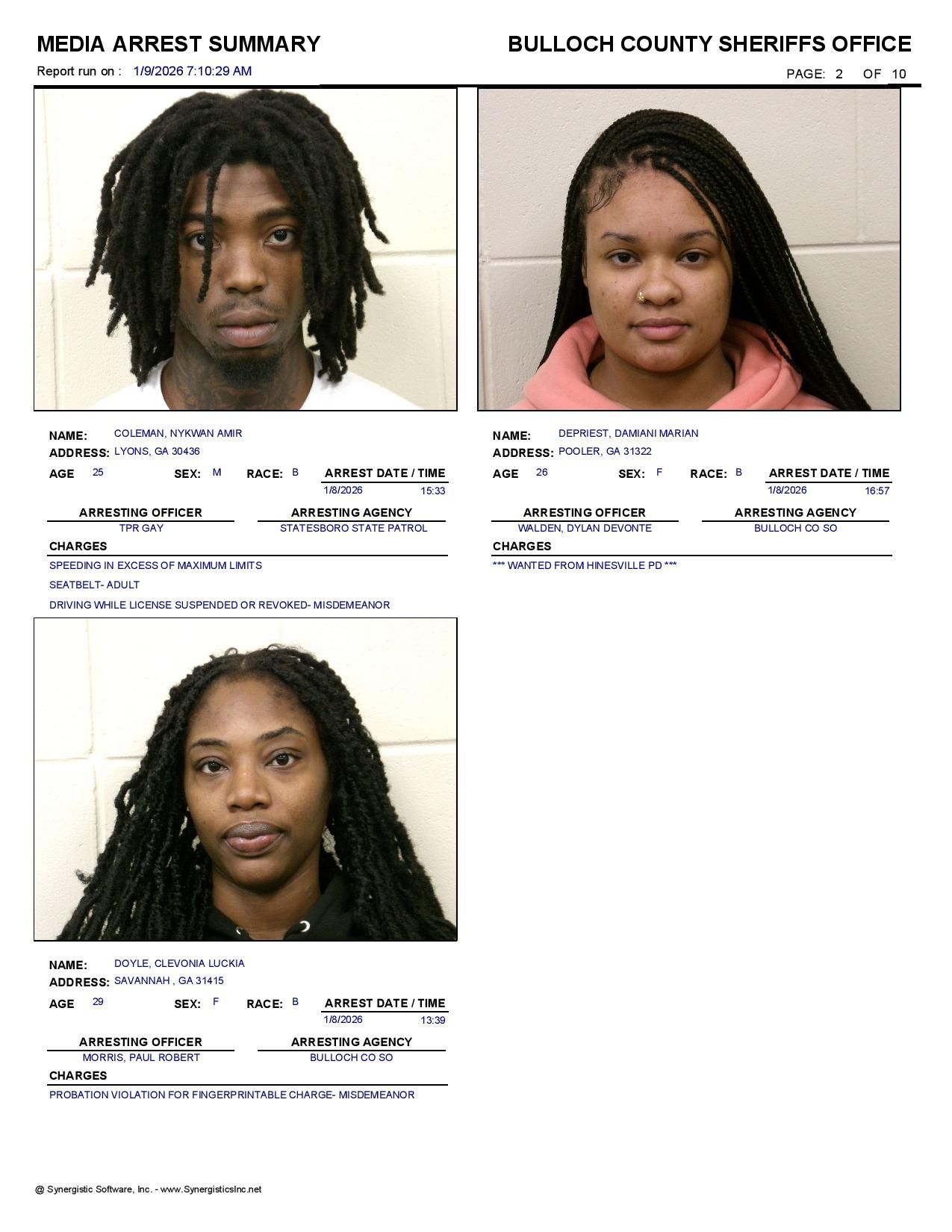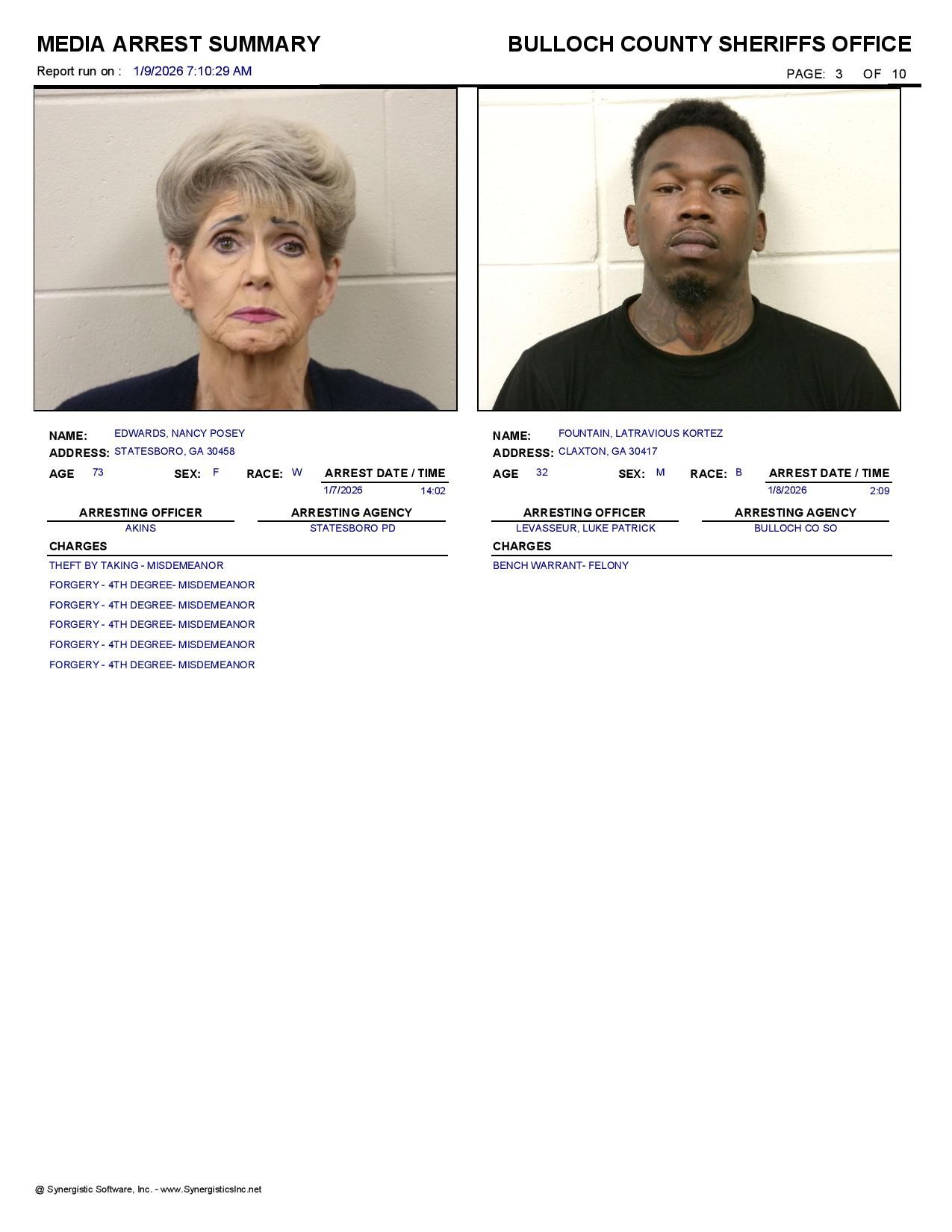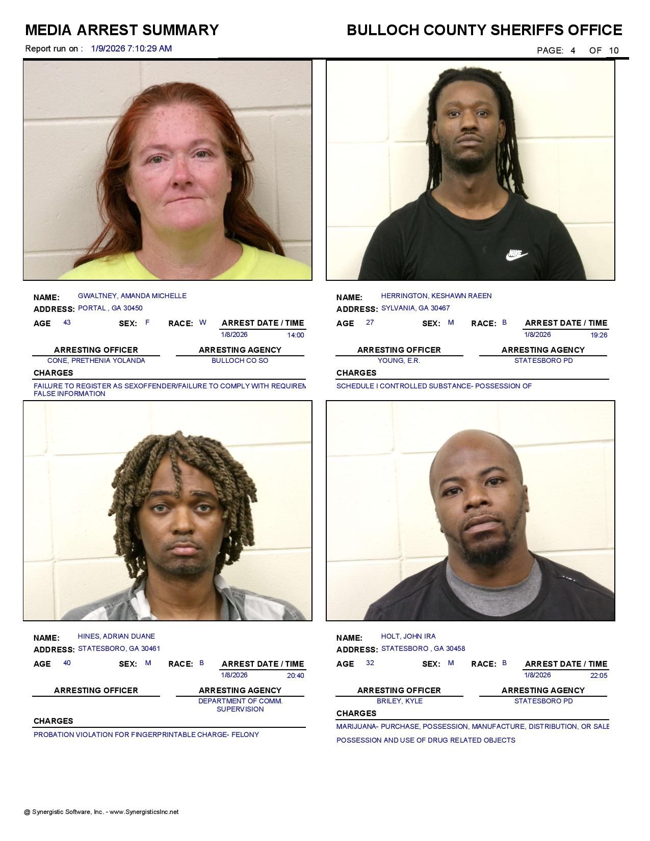 The Bulloch Co Jail Booking & Incident Report 01/09/26 details arrests from Bulloch Co., Statesboro, Brooklet, Portal, Register, and the Georgia State Patrol. Incident reports are from the Sheriff’s Office only.