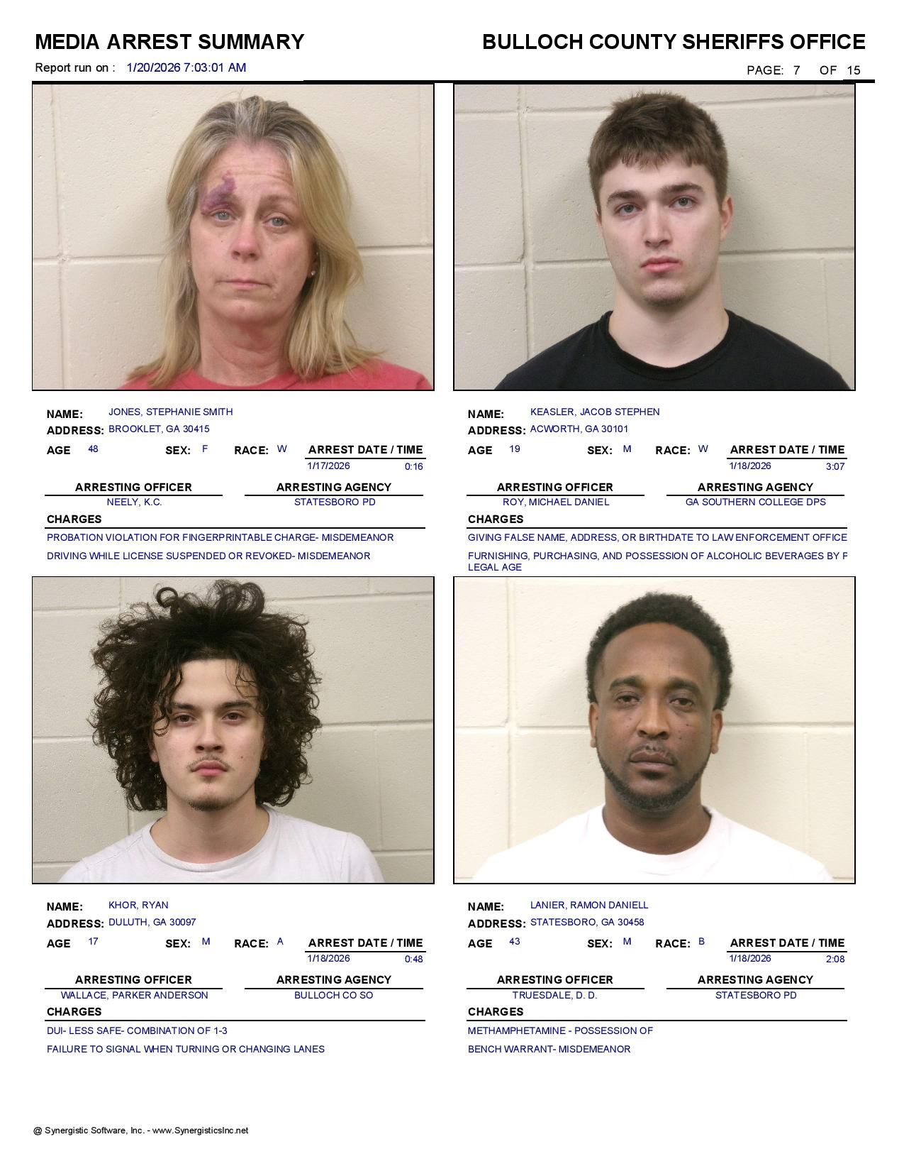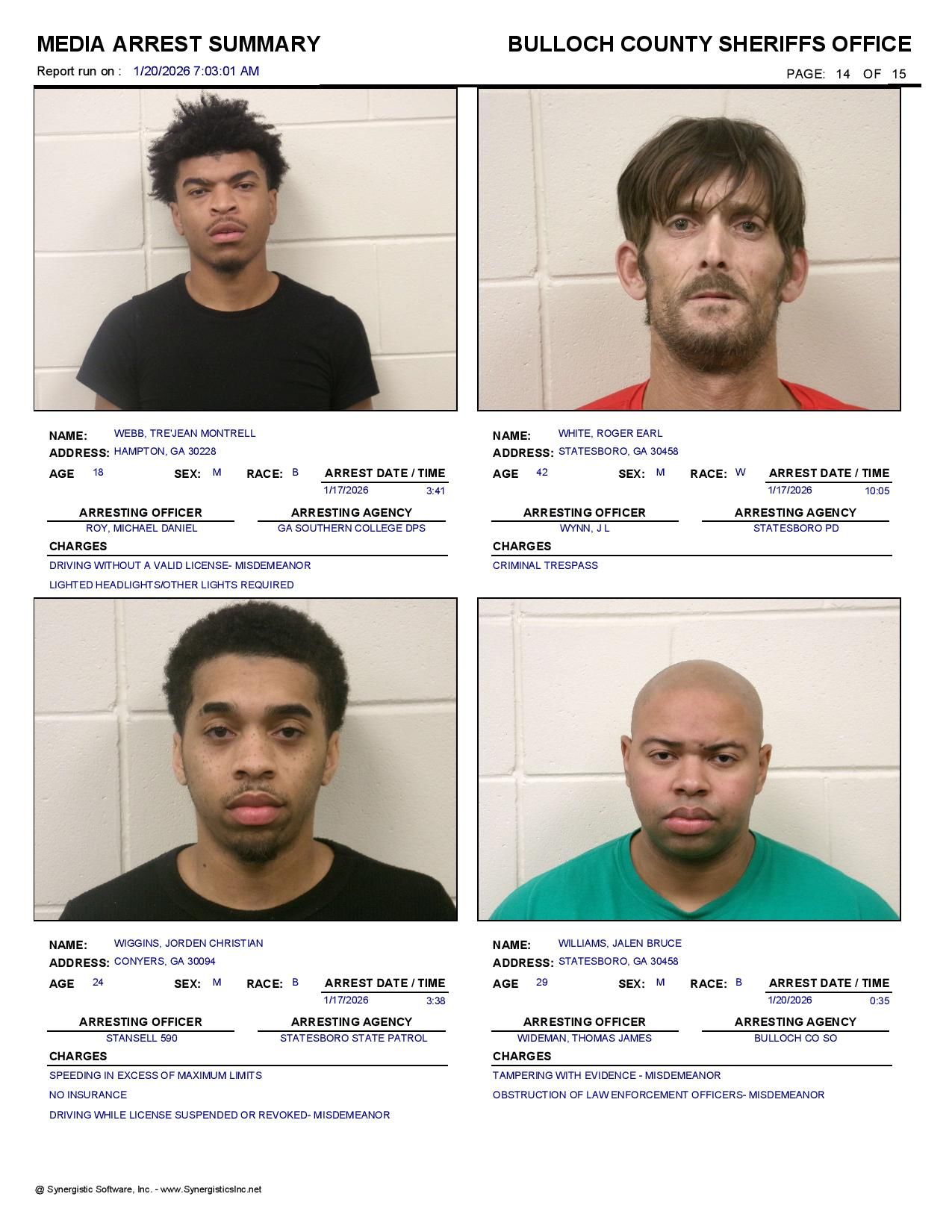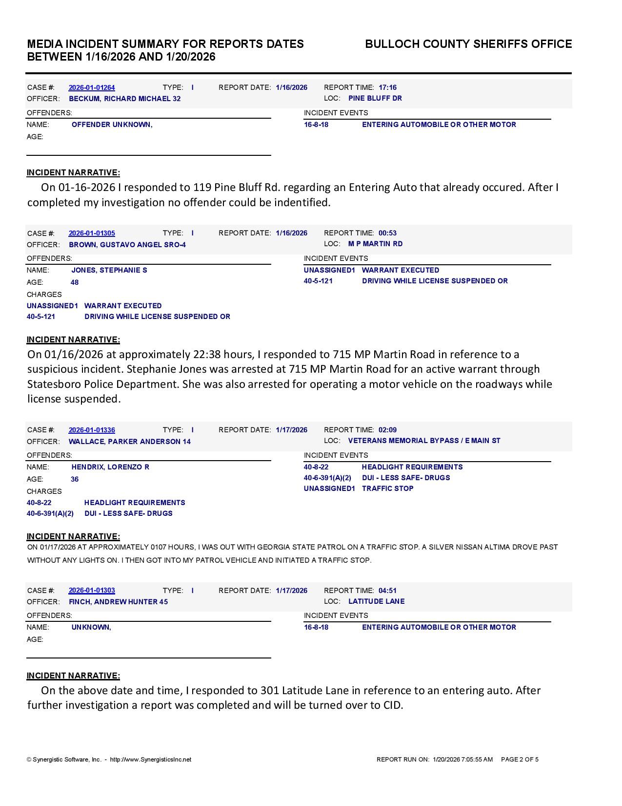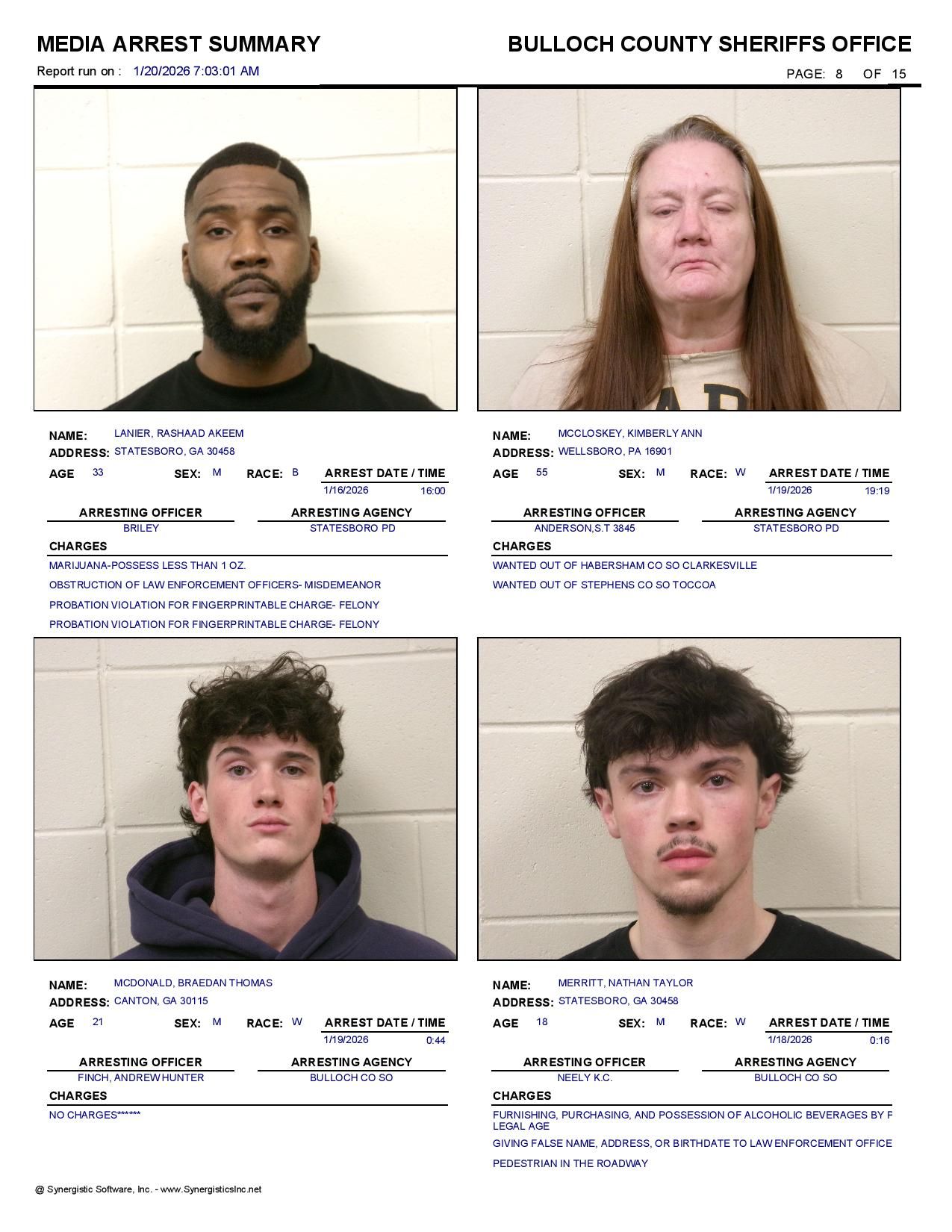 The Bulloch Co Jail Booking & Incident Report 01/20/26 details arrests from Bulloch Co., Statesboro, Brooklet, Portal, Register, and the Georgia State Patrol. Incident reports are from the Sheriff’s Office only.