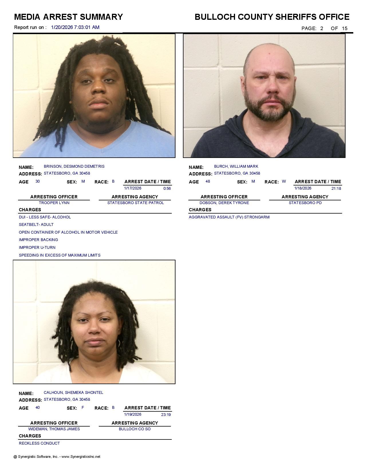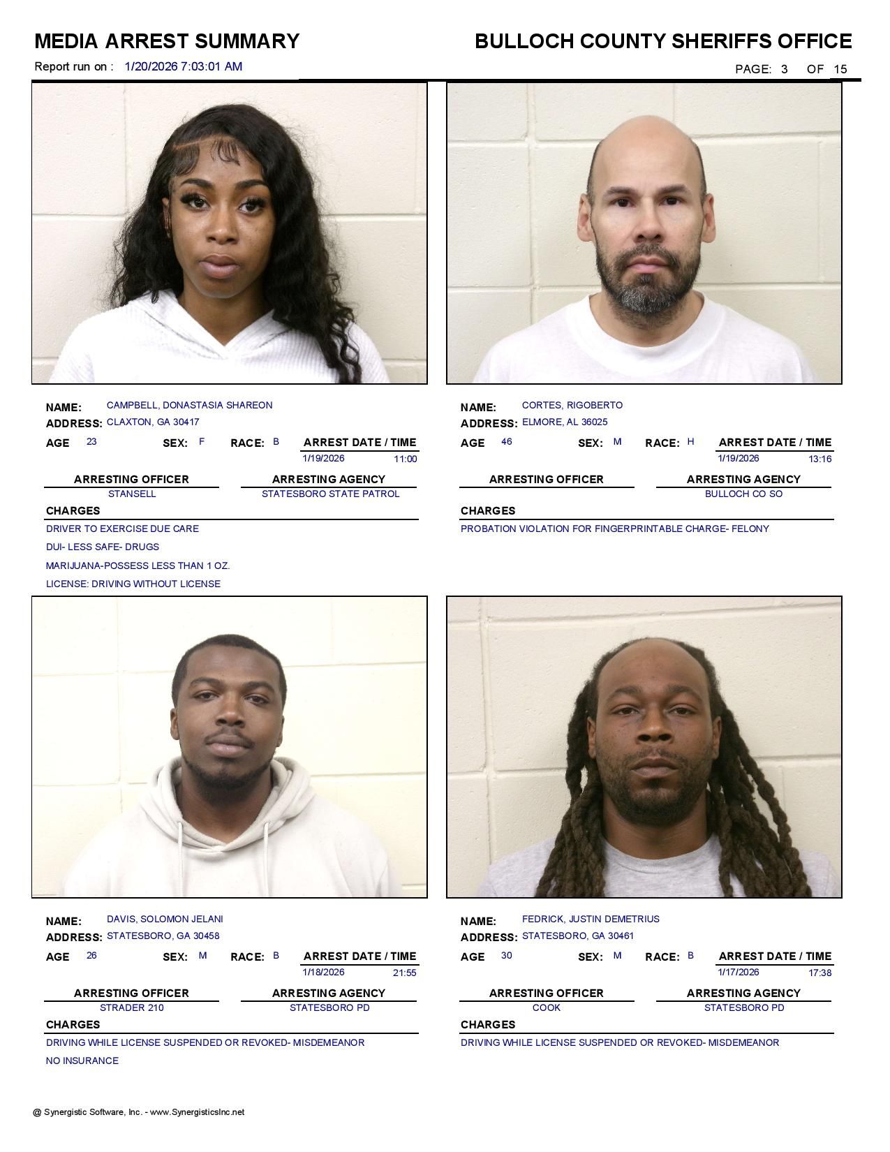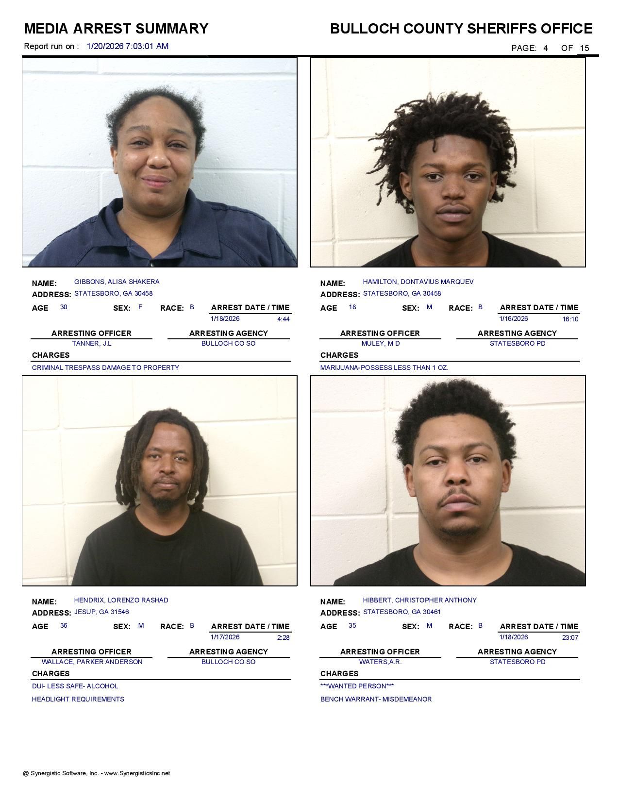 The Bulloch Co Jail Booking & Incident Report 01/20/26 details arrests from Bulloch Co., Statesboro, Brooklet, Portal, Register, and the Georgia State Patrol. Incident reports are from the Sheriff’s Office only.