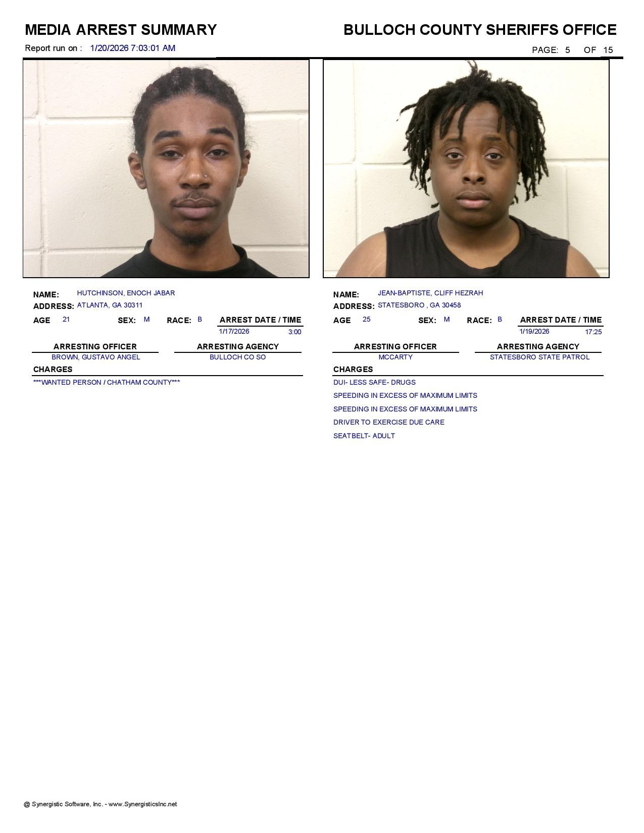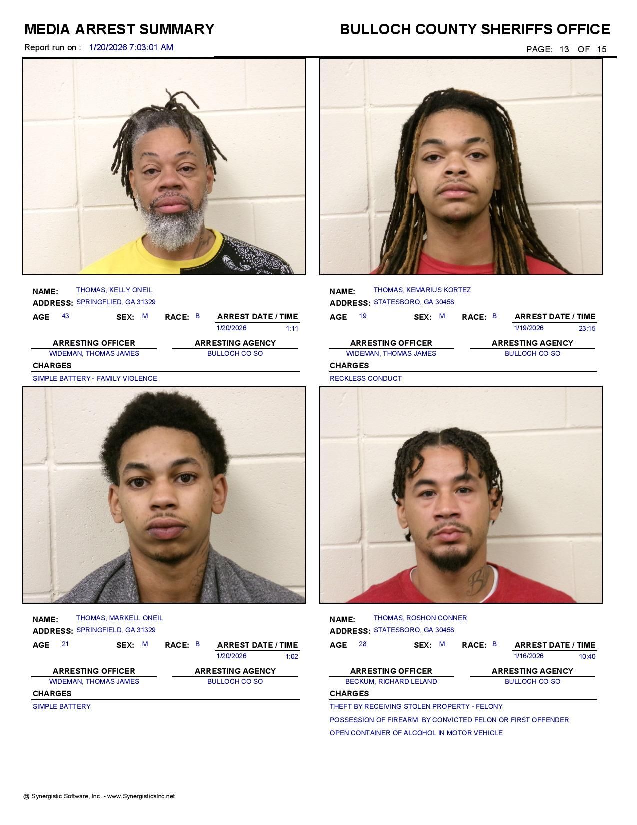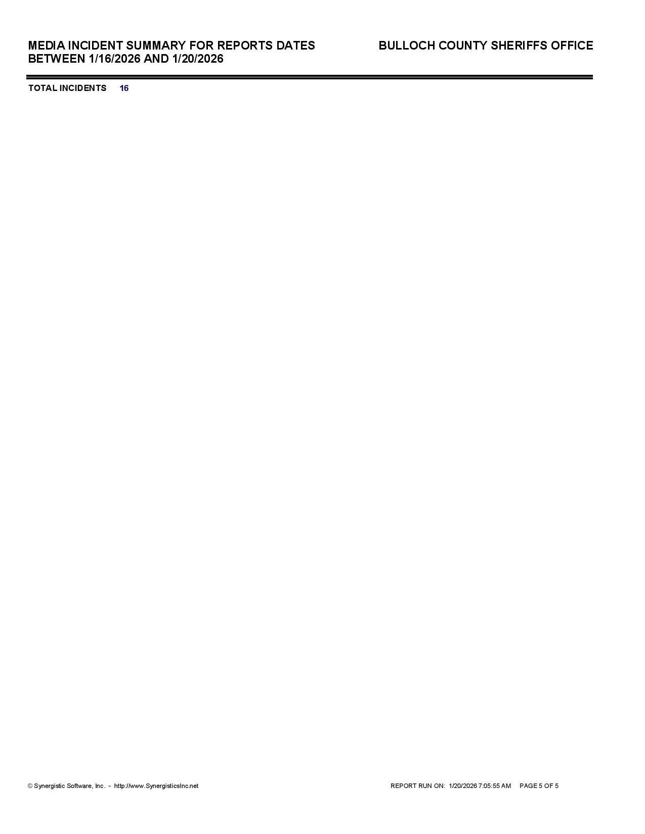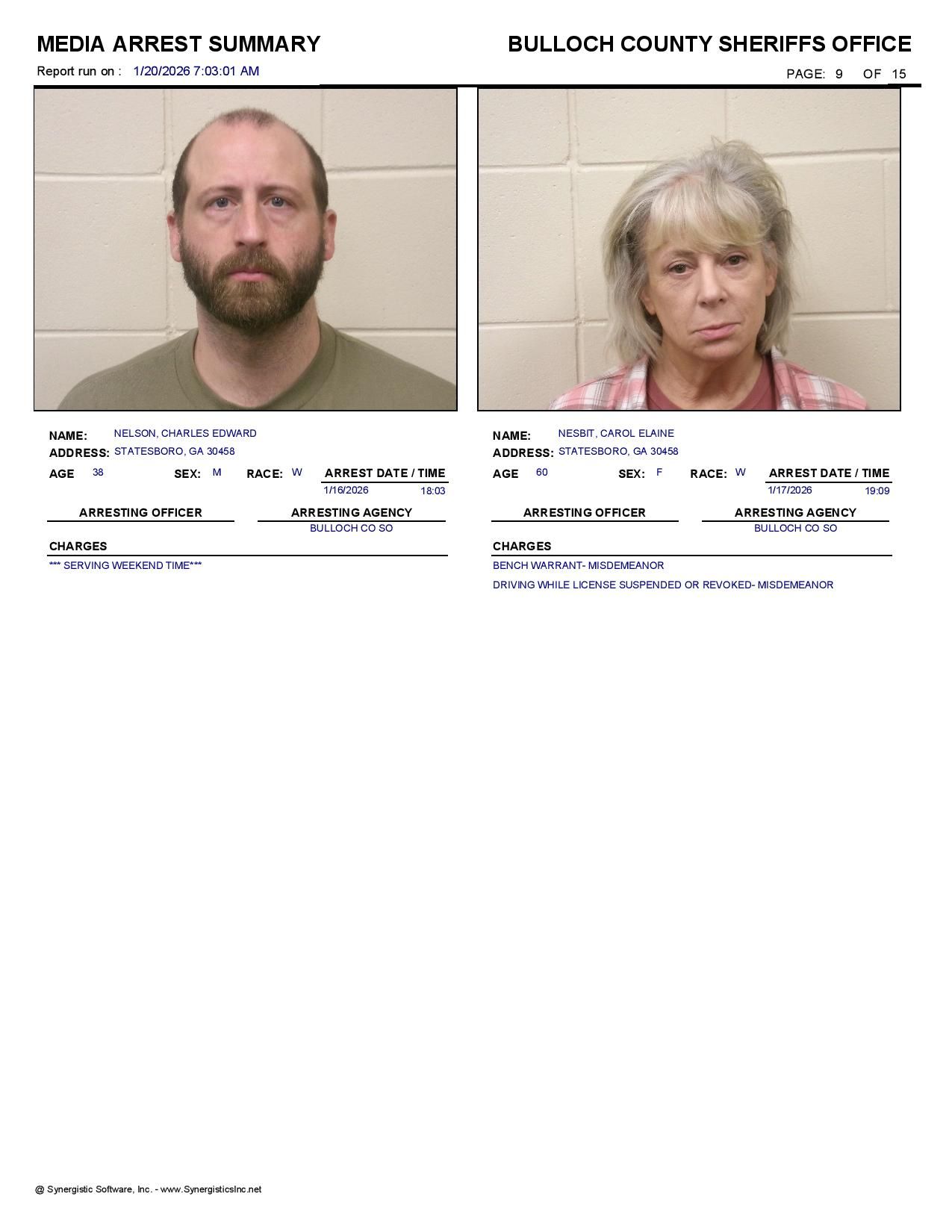 The Bulloch Co Jail Booking & Incident Report 01/20/26 details arrests from Bulloch Co., Statesboro, Brooklet, Portal, Register, and the Georgia State Patrol. Incident reports are from the Sheriff’s Office only.