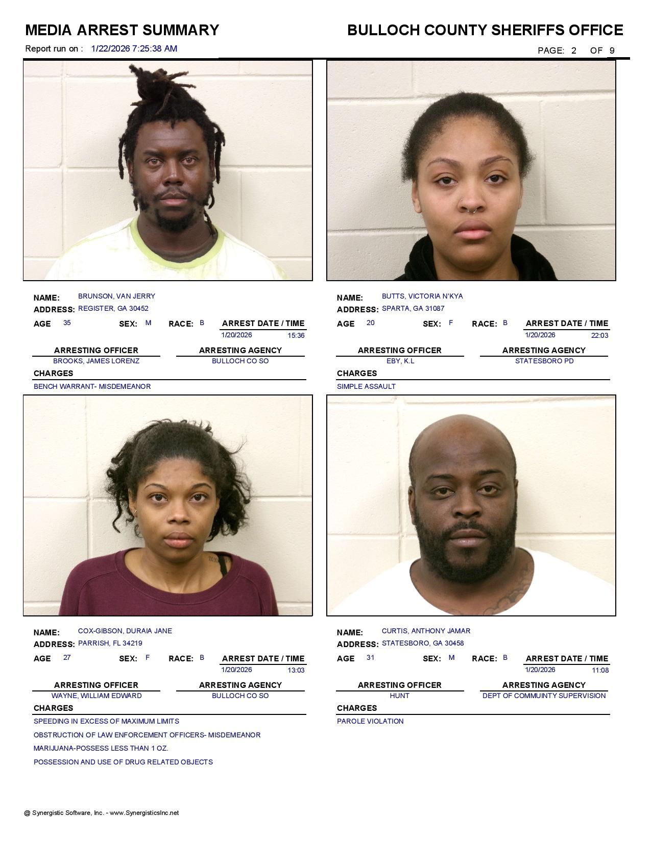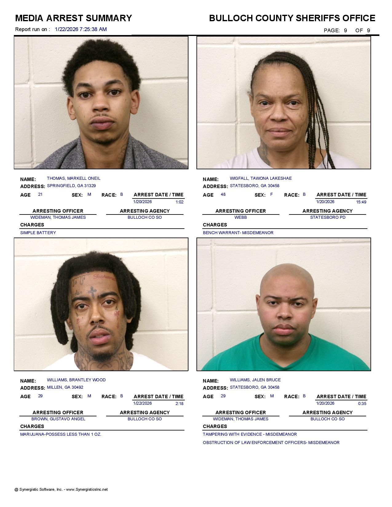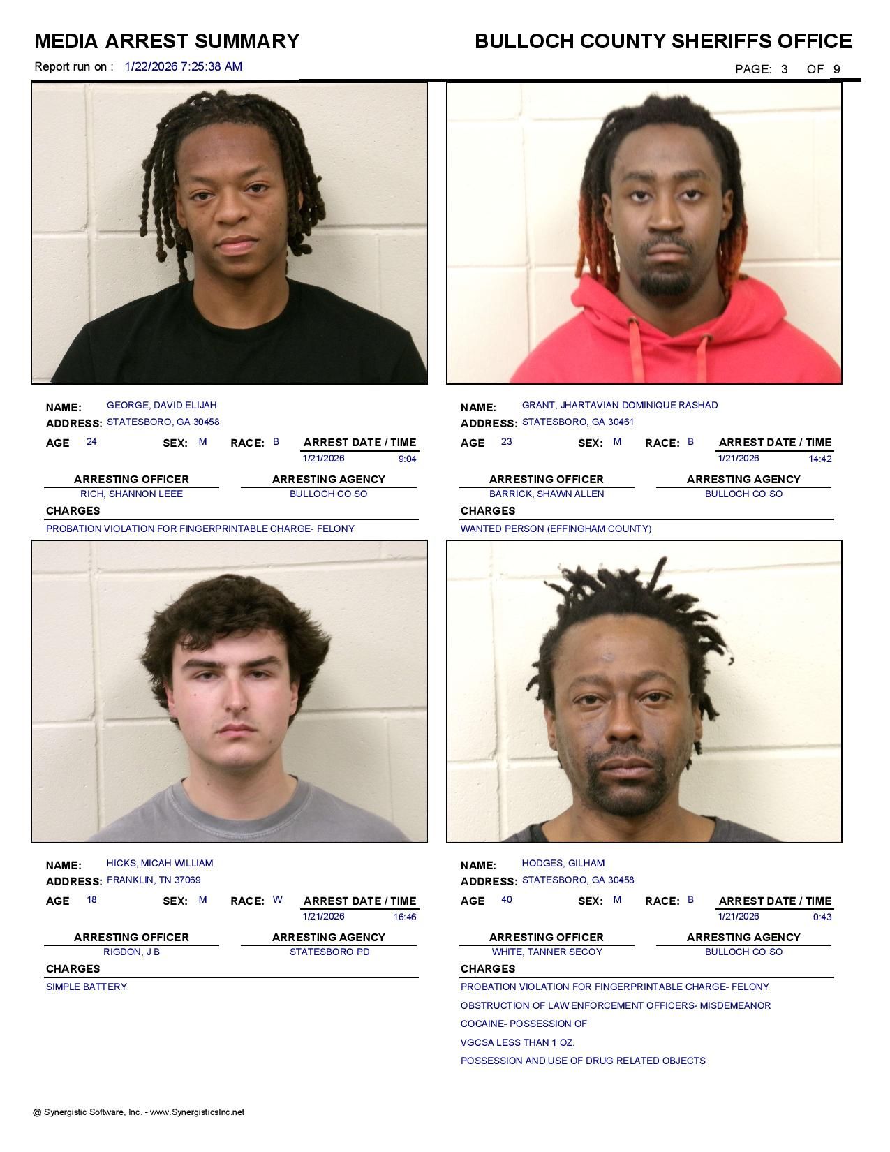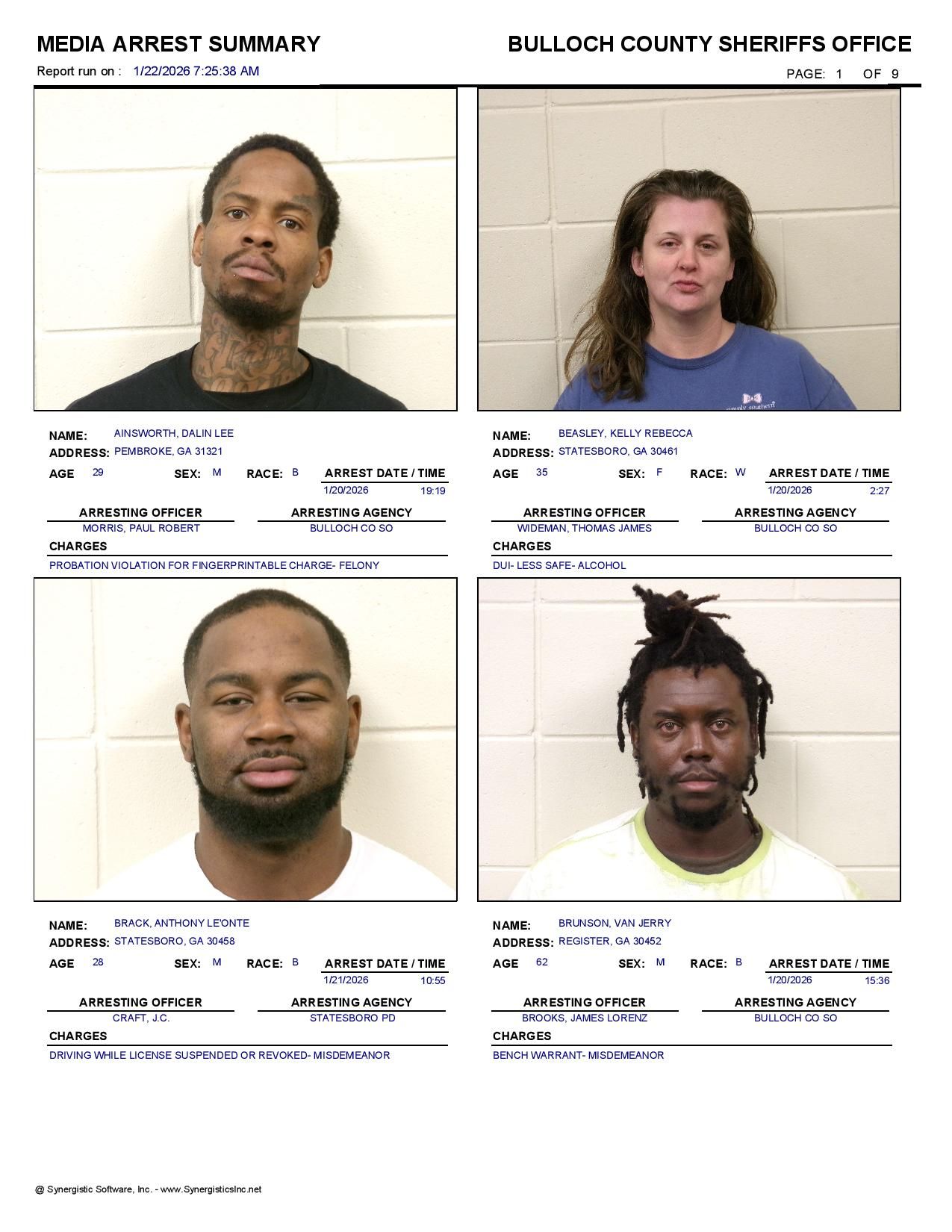 The Bulloch Co Jail Booking & Incident Report 01/22/26 details arrests from Bulloch Co., Statesboro, Brooklet, Portal, Register, and the Georgia State Patrol. Incident reports are from the Sheriff’s Office only.