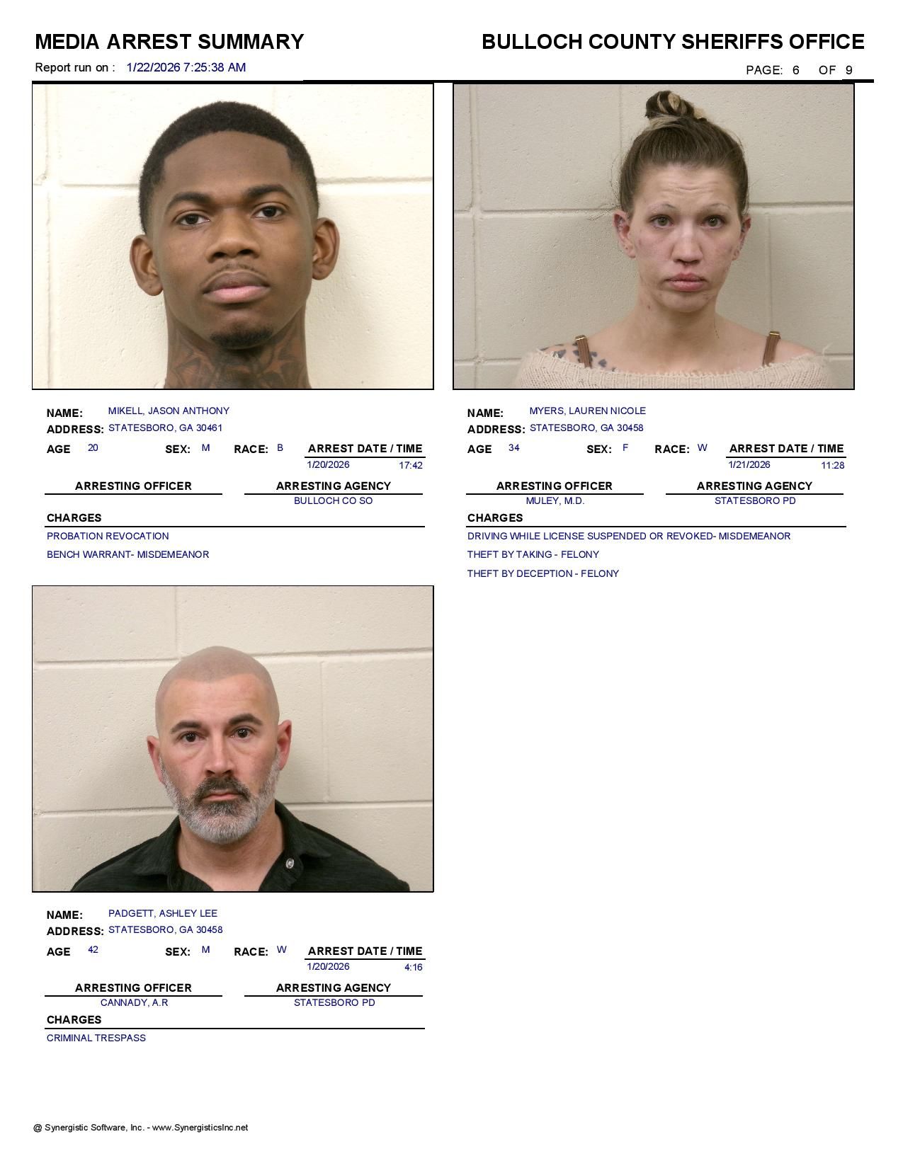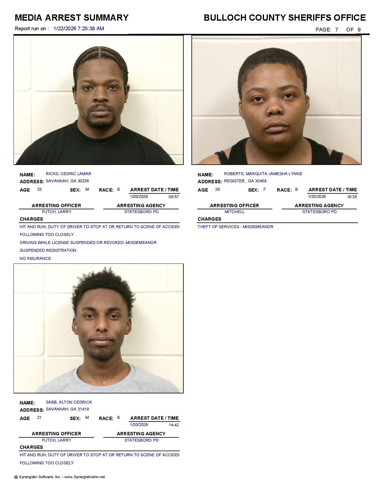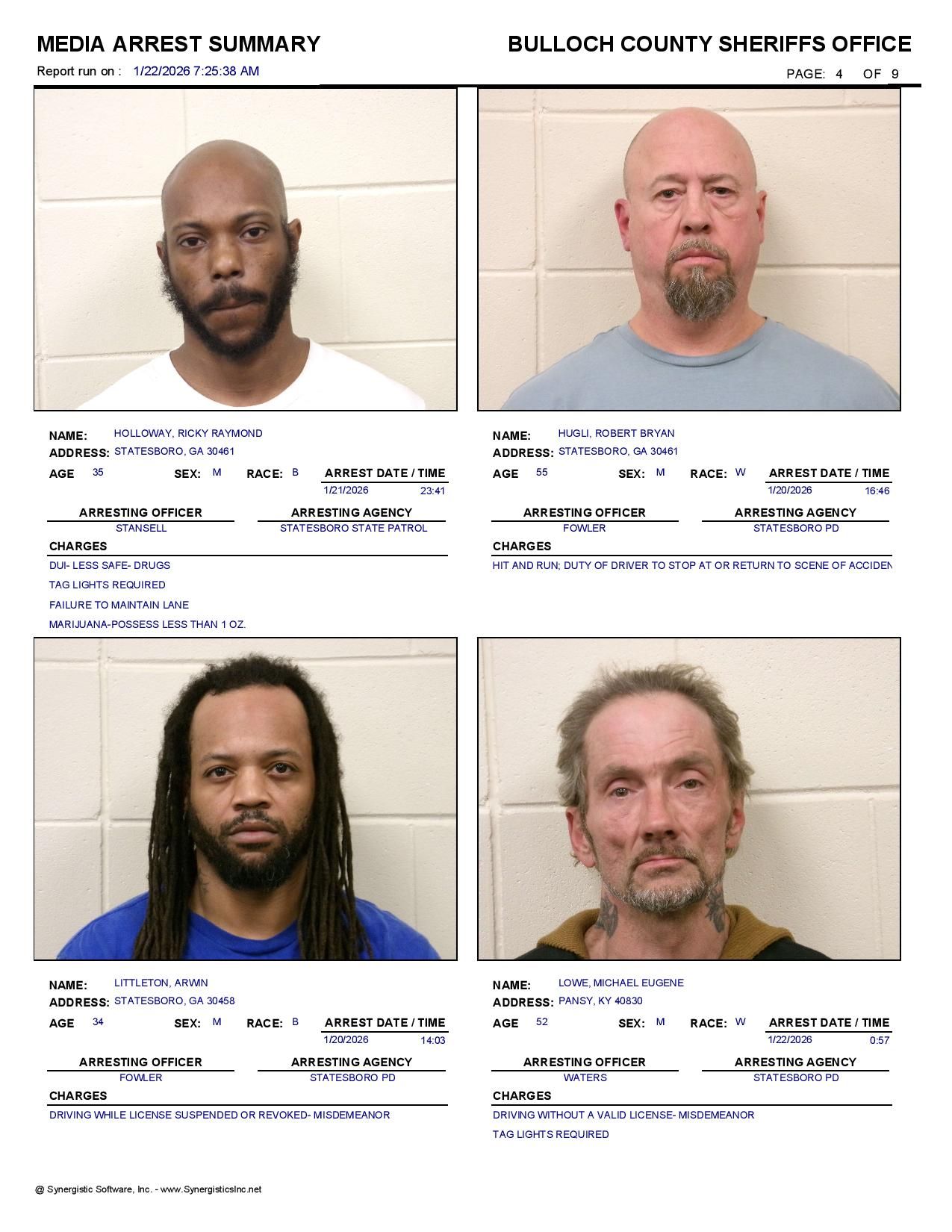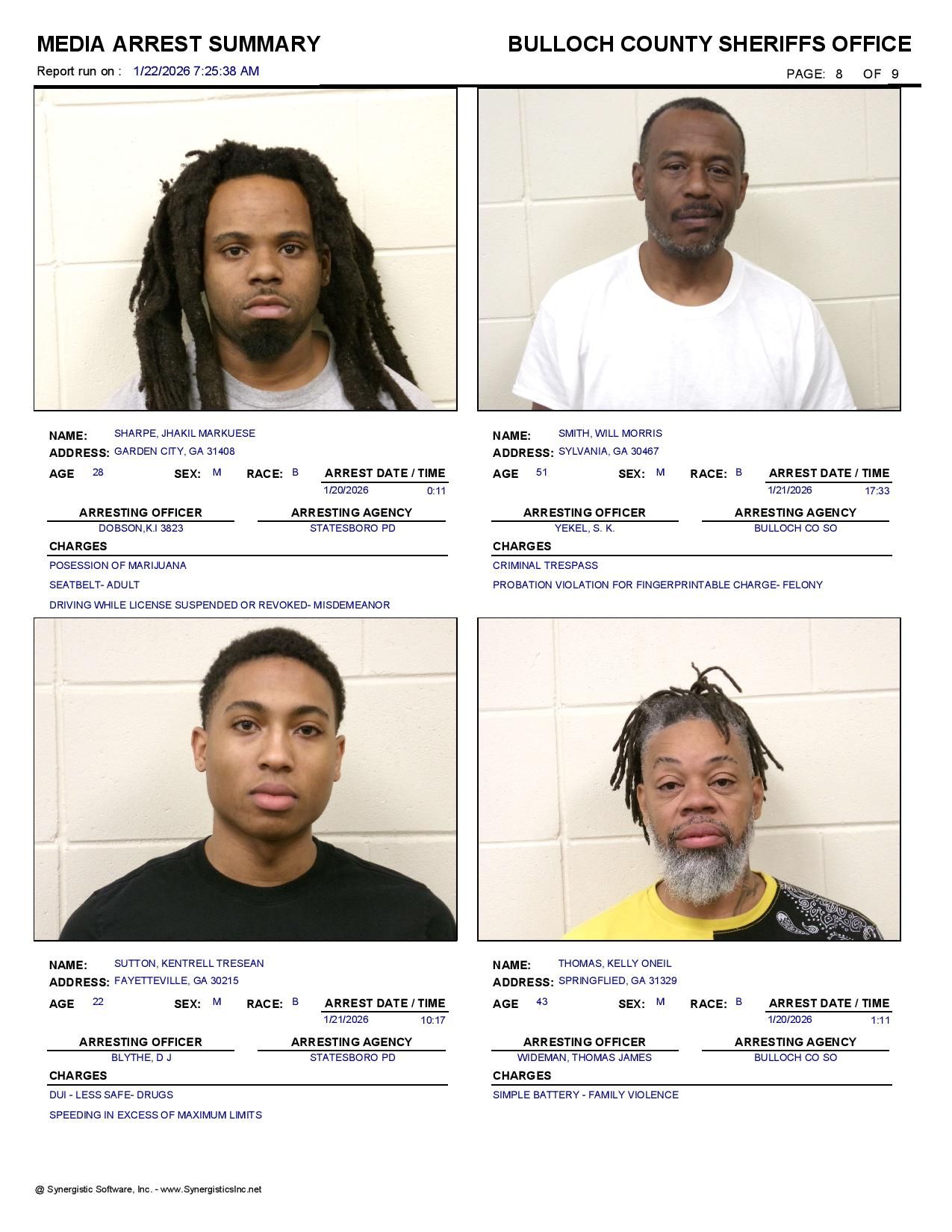 The Bulloch Co Jail Booking & Incident Report 01/22/26 details arrests from Bulloch Co., Statesboro, Brooklet, Portal, Register, and the Georgia State Patrol. Incident reports are from the Sheriff’s Office only.