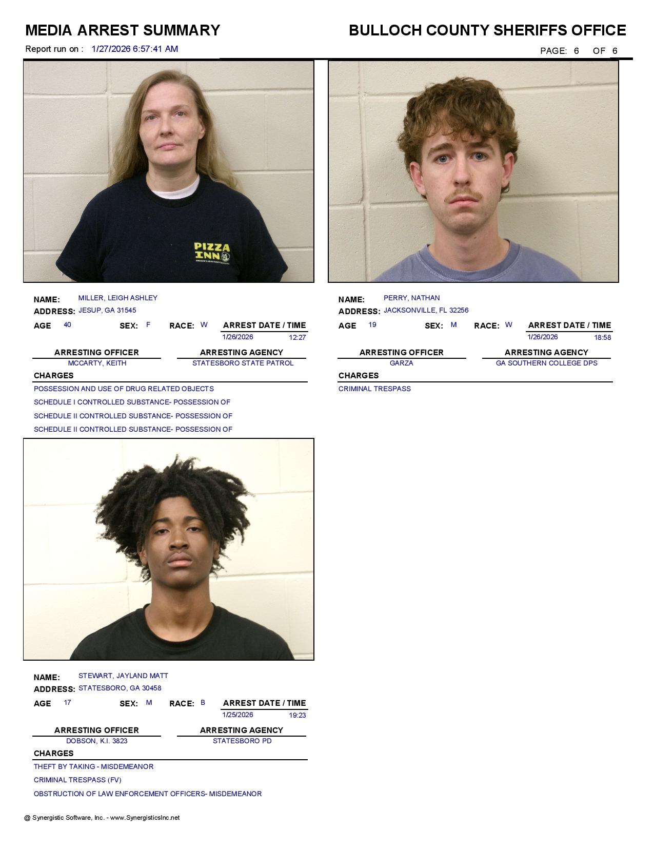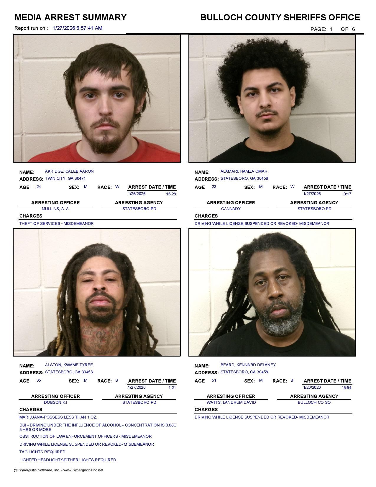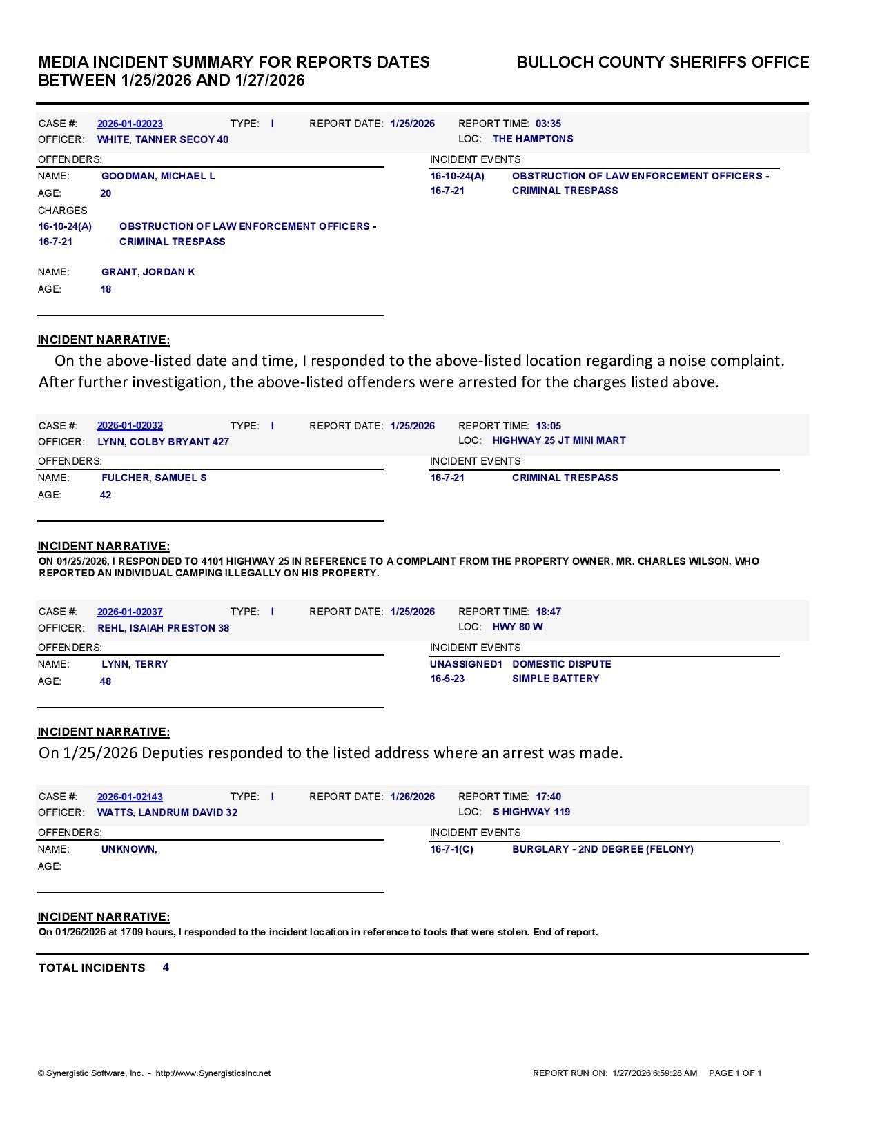 The Bulloch Co Jail Booking & Incident Report 01/27/26 details arrests from Bulloch Co., Statesboro, Brooklet, Portal, Register, and the Georgia State Patrol. Incident reports are from the Sheriff’s Office only.