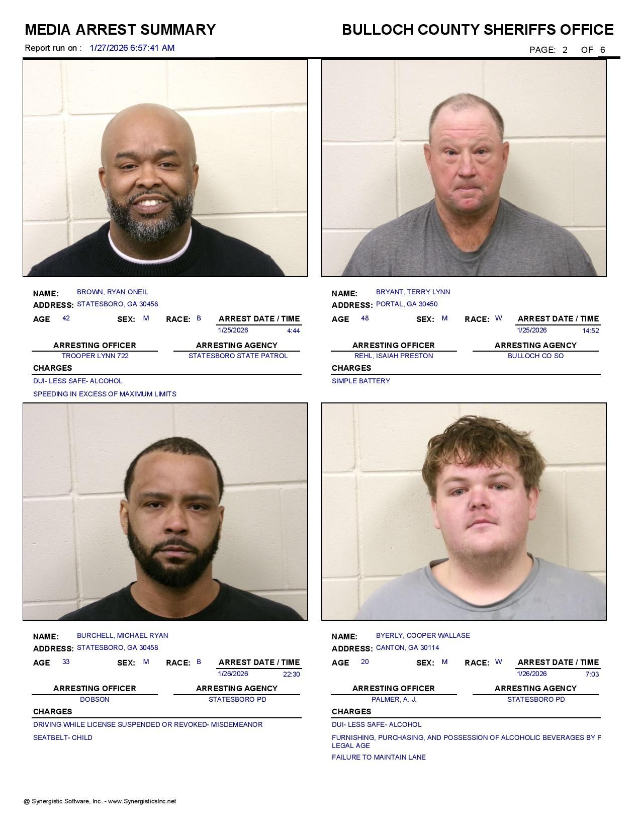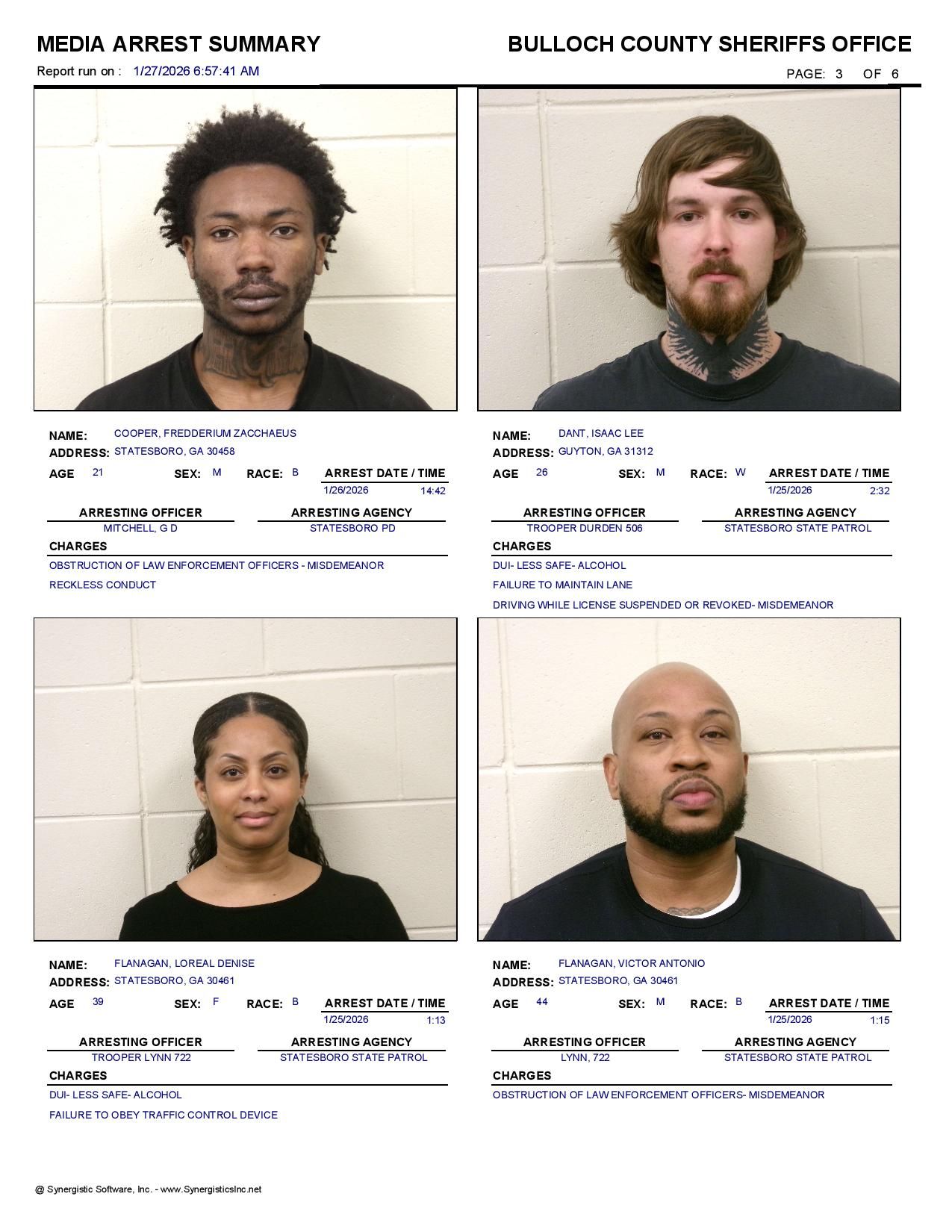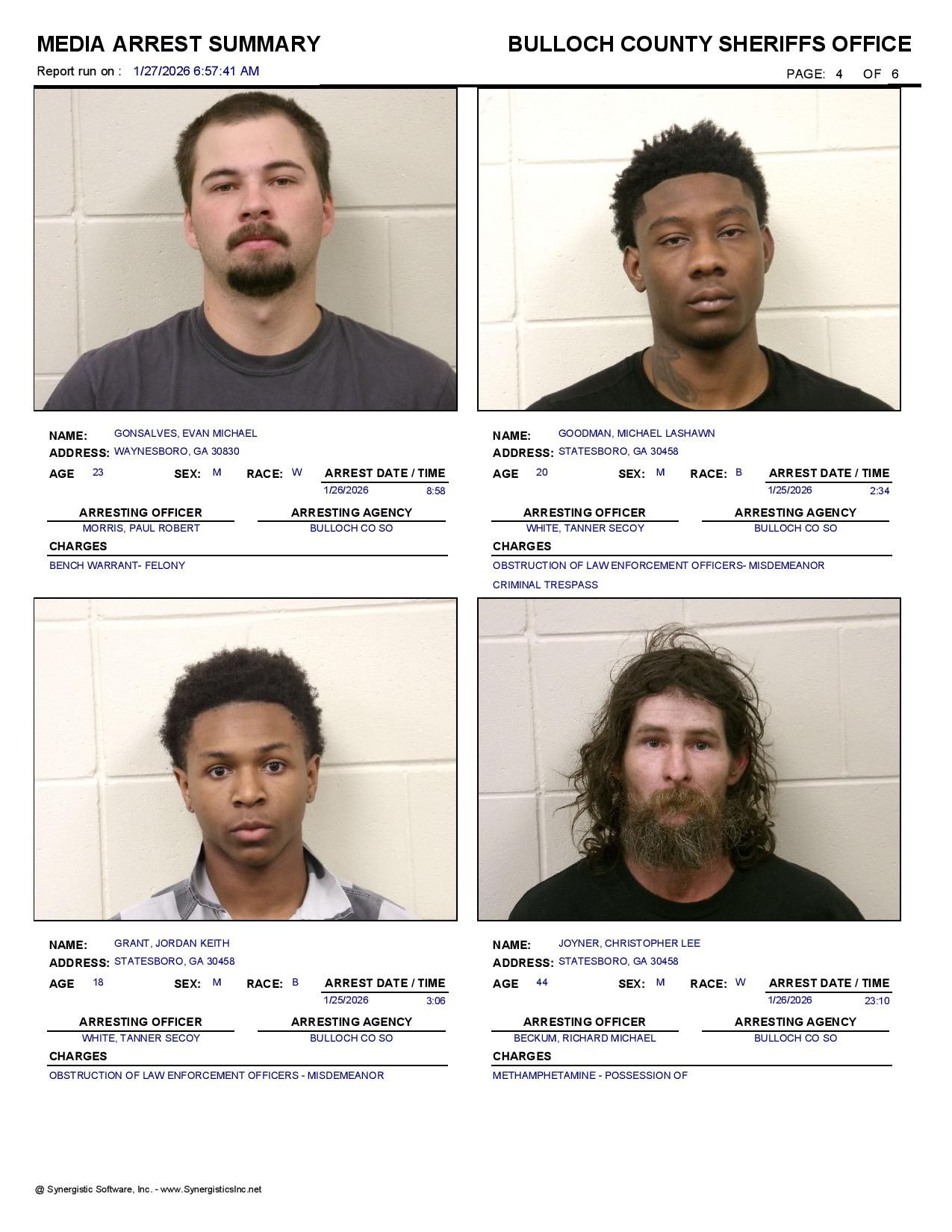 The Bulloch Co Jail Booking & Incident Report 01/27/26 details arrests from Bulloch Co., Statesboro, Brooklet, Portal, Register, and the Georgia State Patrol. Incident reports are from the Sheriff’s Office only.