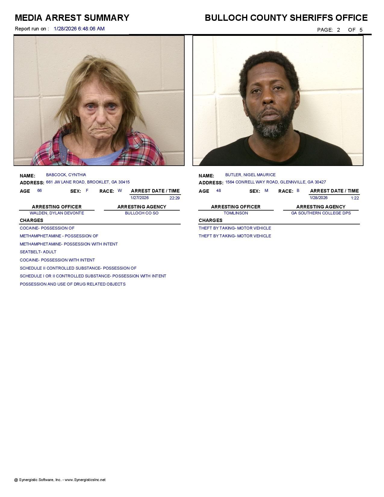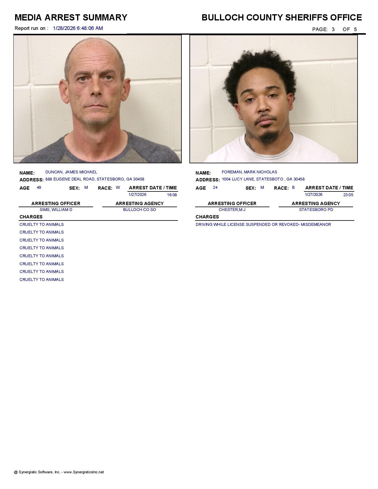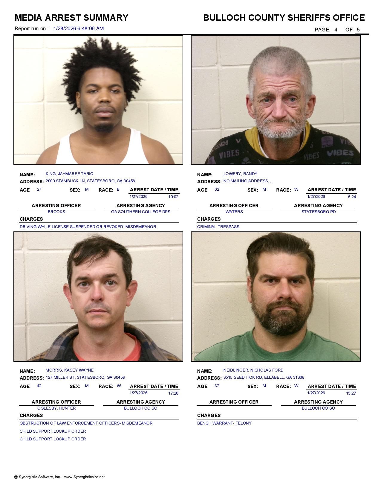 The Bulloch Co Jail Booking & Incident Report 01/28/26 details arrests from Bulloch Co., Statesboro, Brooklet, Portal, Register, and the Georgia State Patrol. Incident reports are from the Sheriff’s Office only.