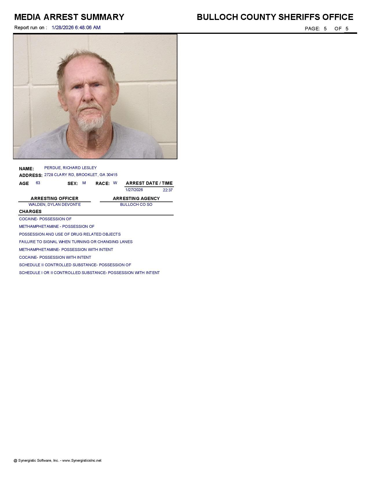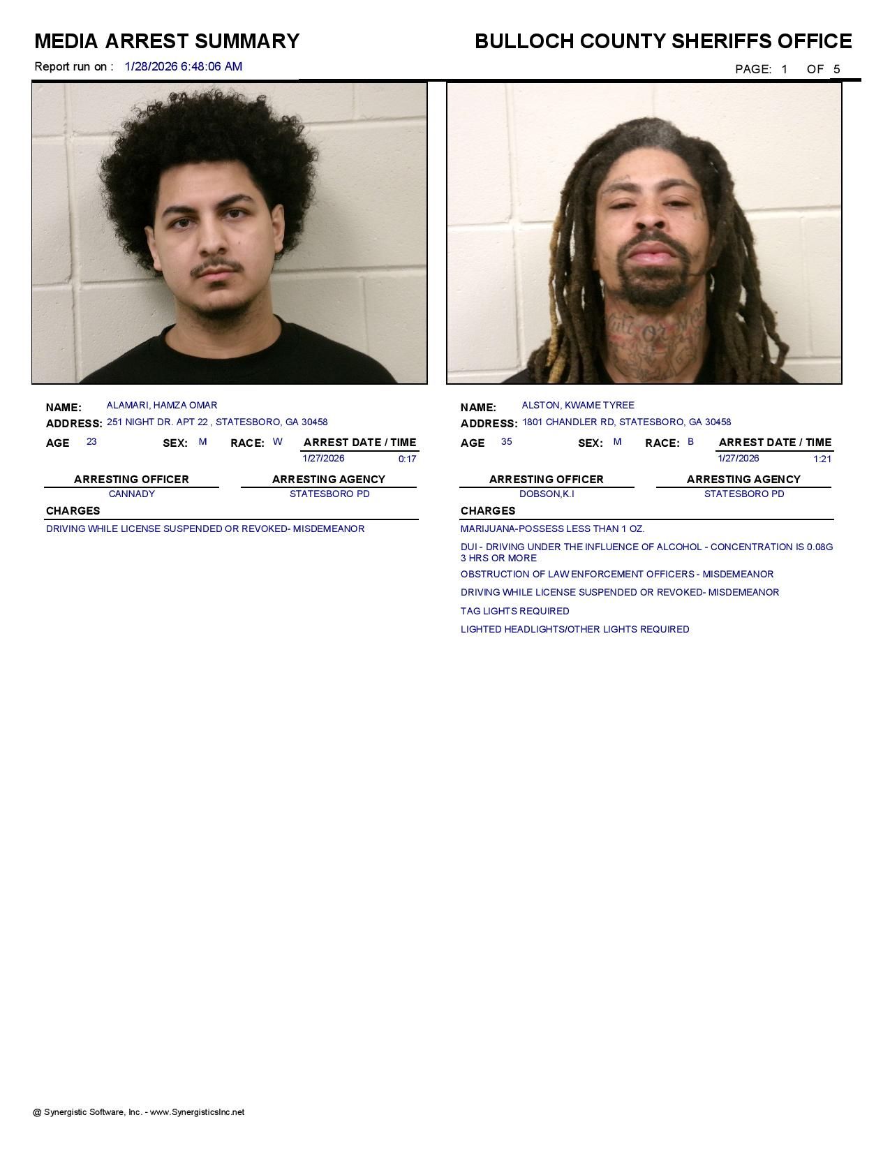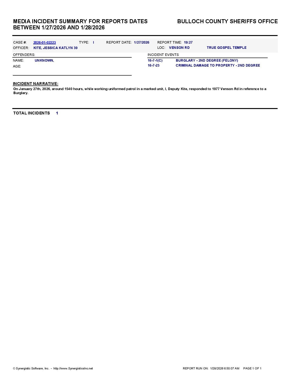 The Bulloch Co Jail Booking & Incident Report 01/28/26 details arrests from Bulloch Co., Statesboro, Brooklet, Portal, Register, and the Georgia State Patrol. Incident reports are from the Sheriff’s Office only.