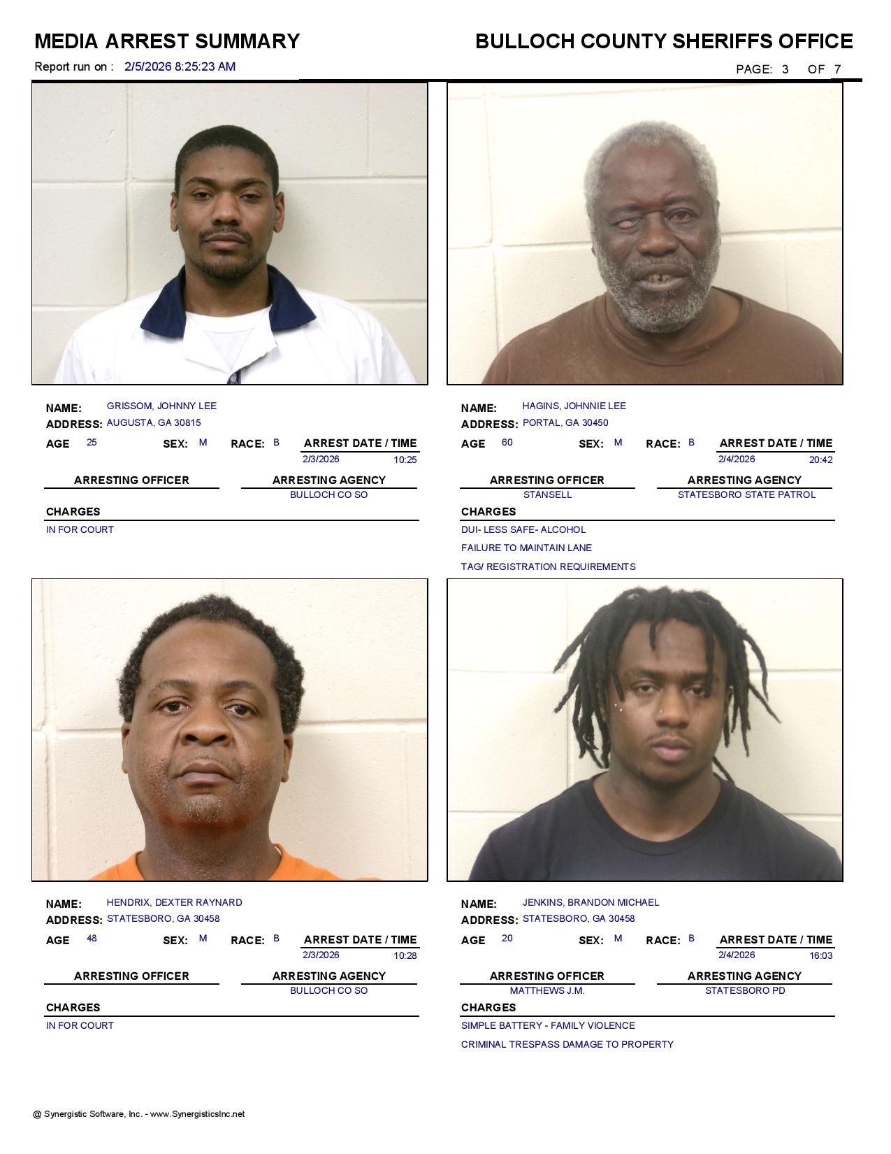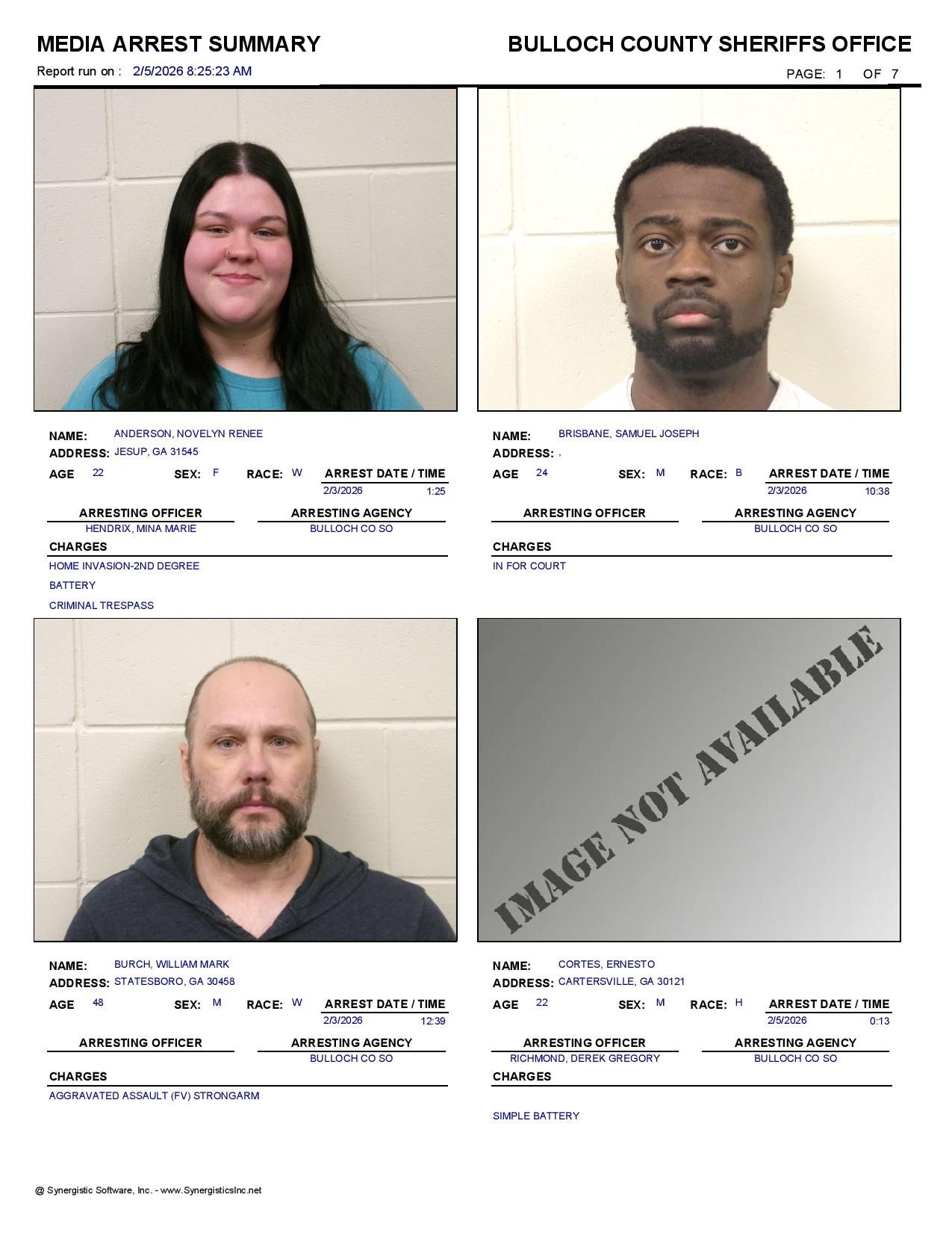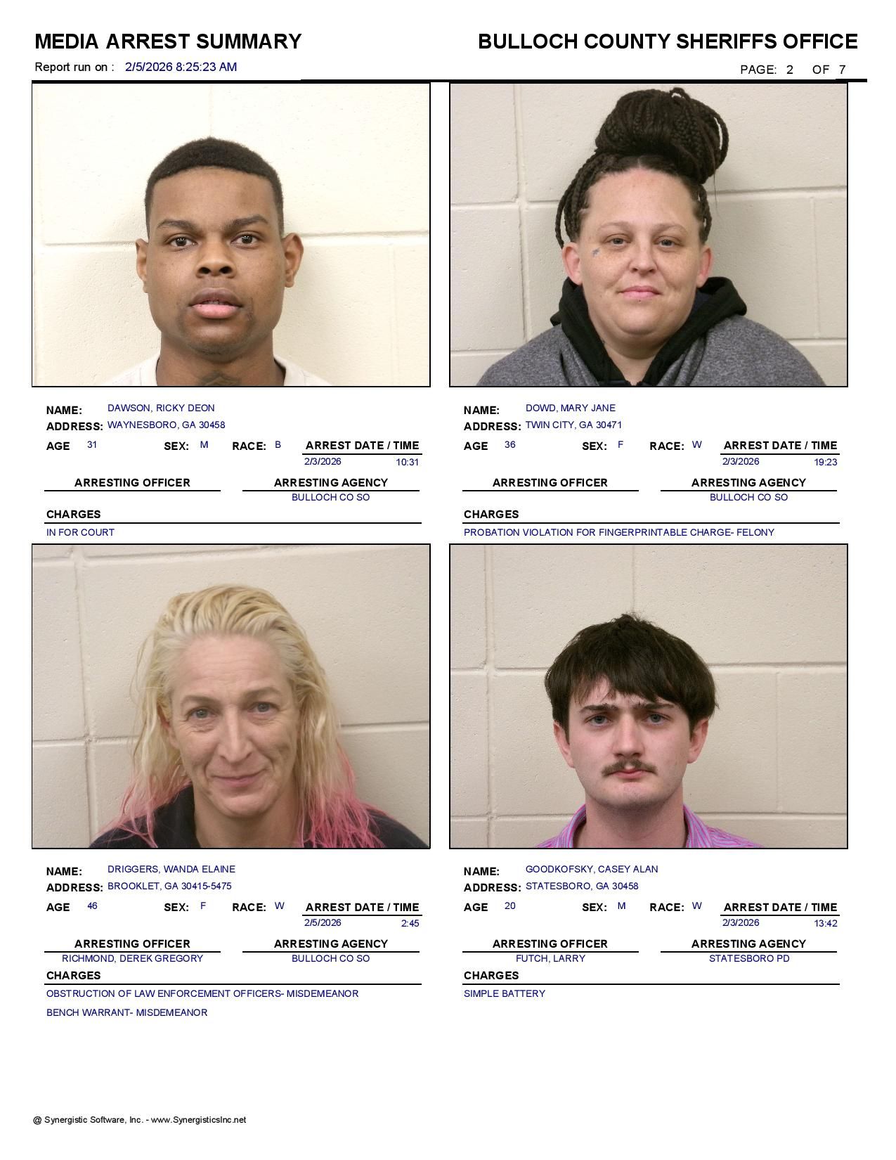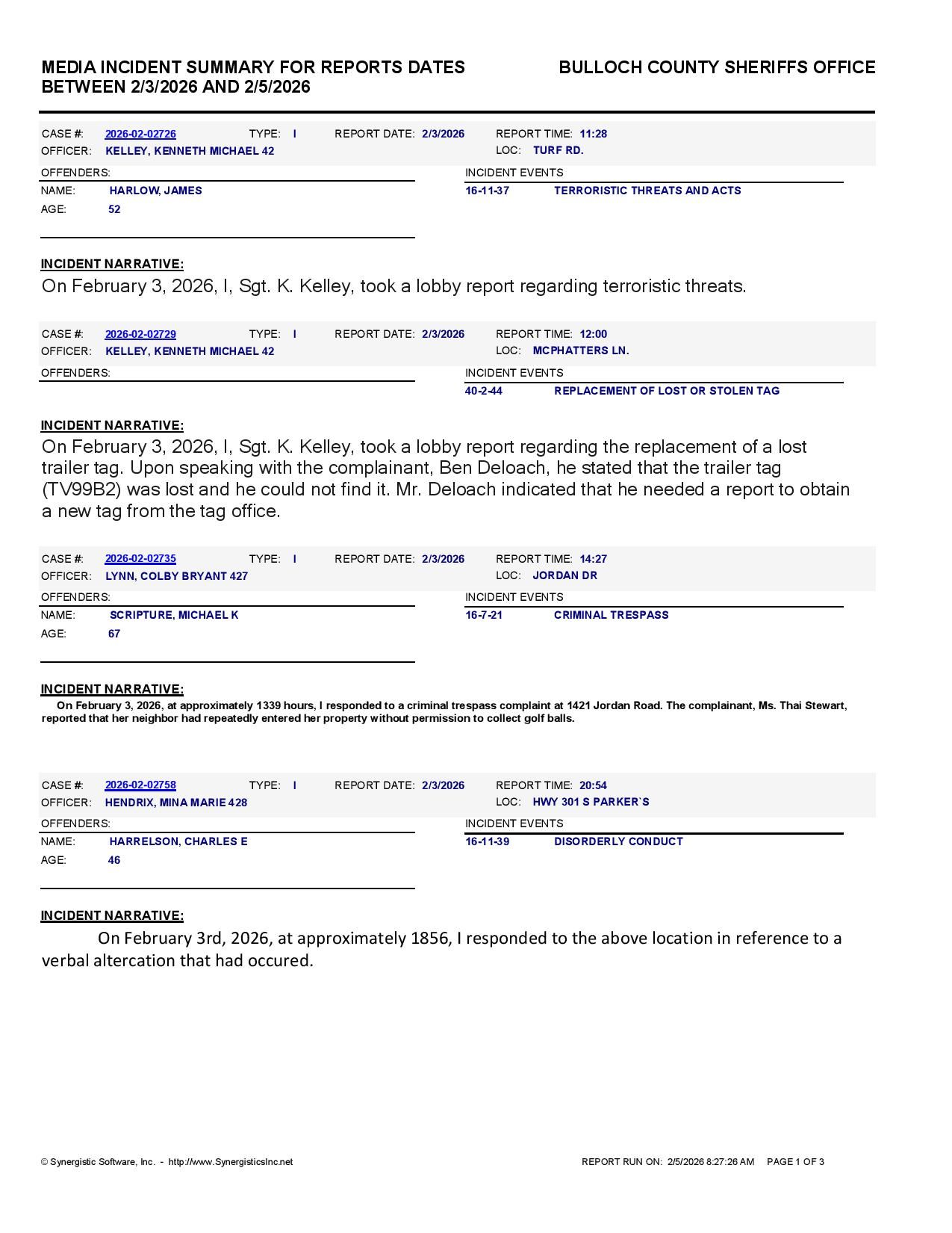 The Bulloch Co Jail Booking & Incident Report 02/05/26 details arrests from Bulloch Co., Statesboro, Brooklet, Portal, Register, and the Georgia State Patrol. Incident reports are from the Sheriff’s Office only.