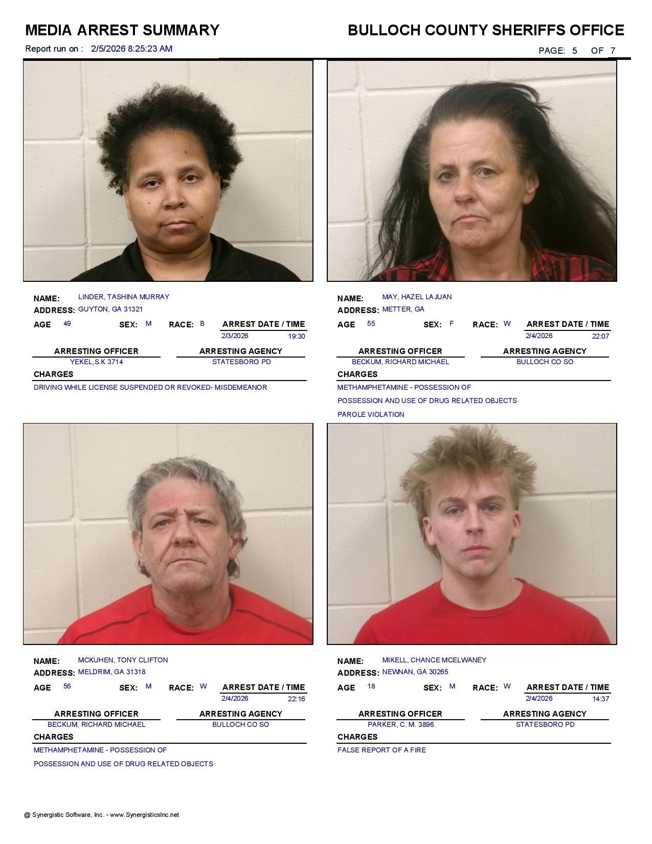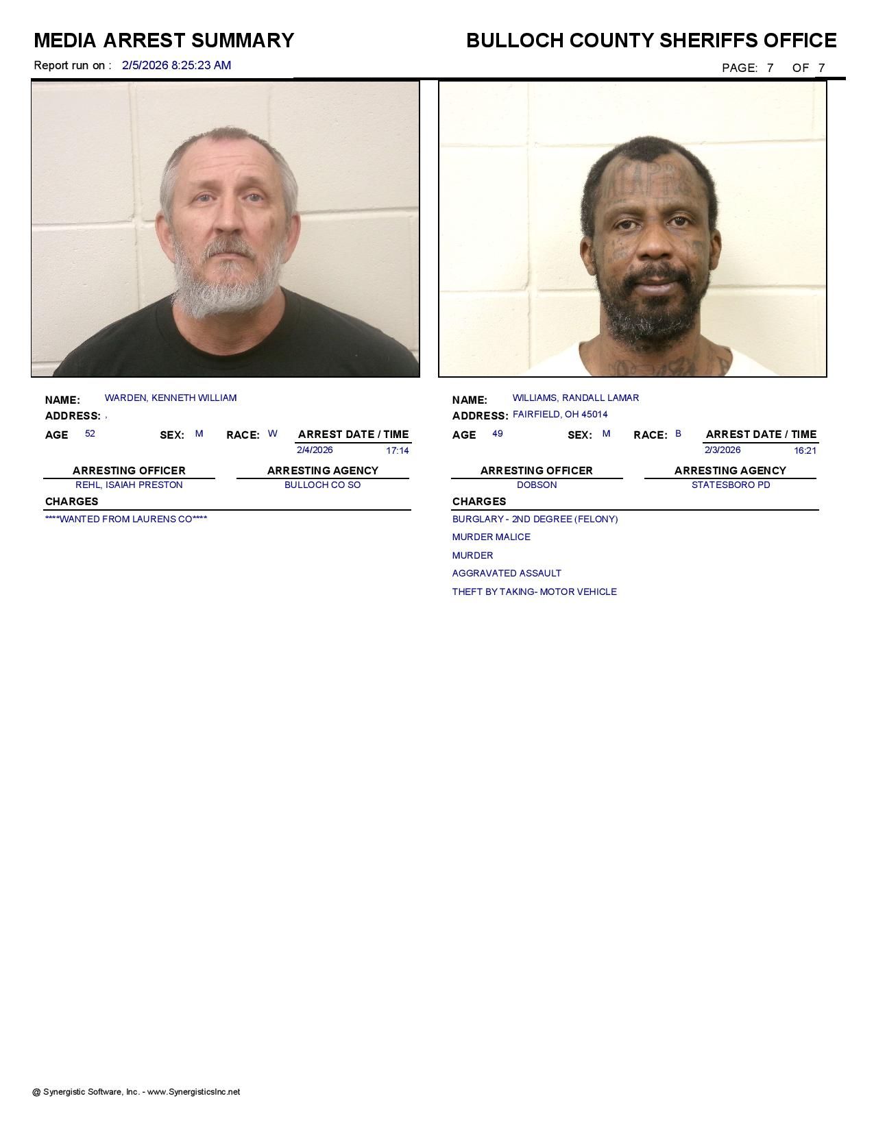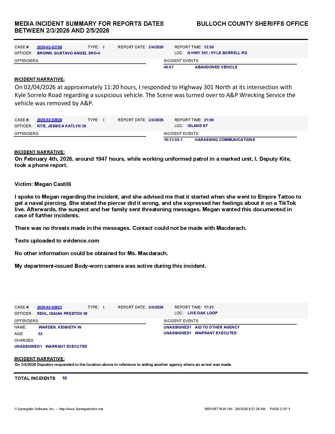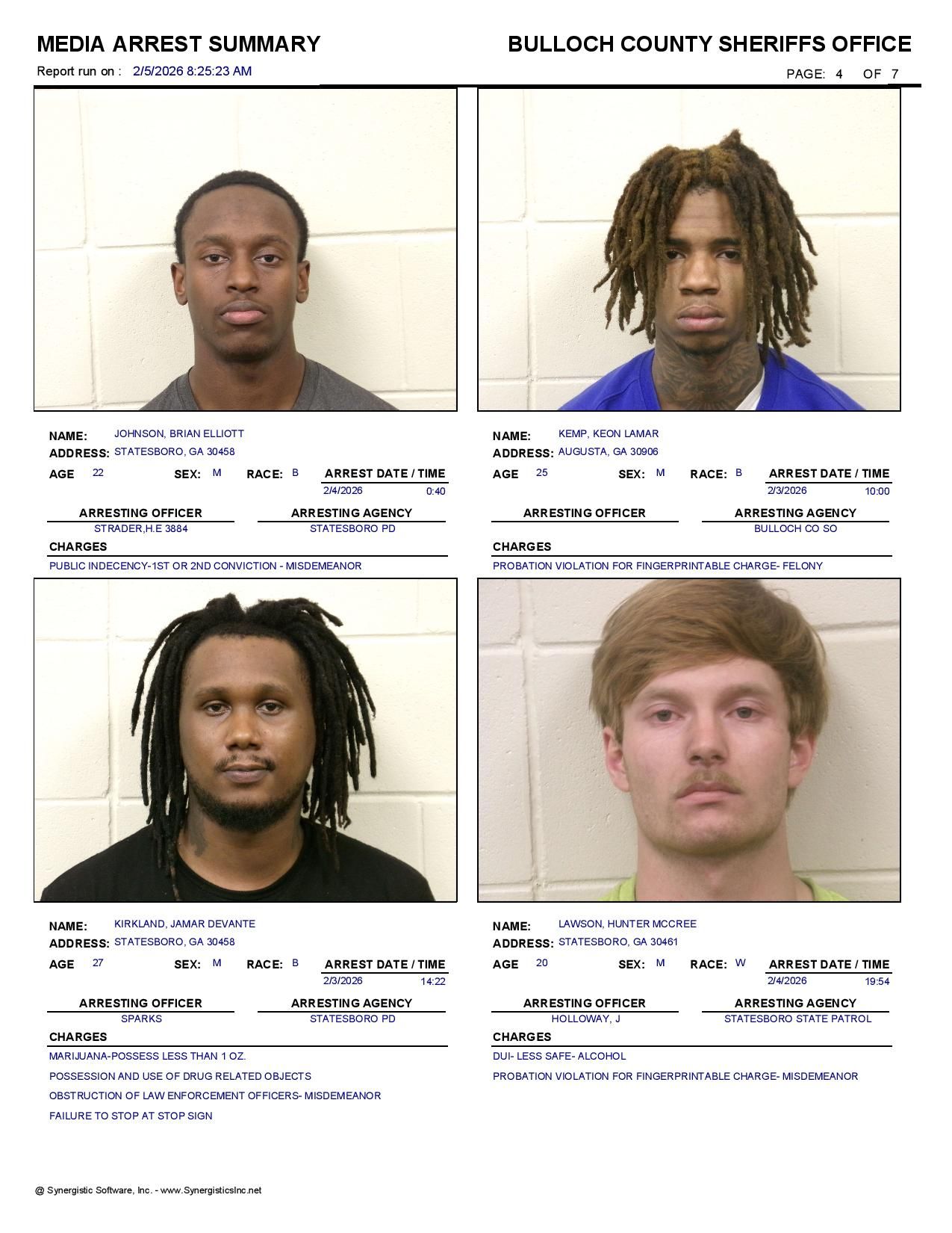 The Bulloch Co Jail Booking & Incident Report 02/05/26 details arrests from Bulloch Co., Statesboro, Brooklet, Portal, Register, and the Georgia State Patrol. Incident reports are from the Sheriff’s Office only.