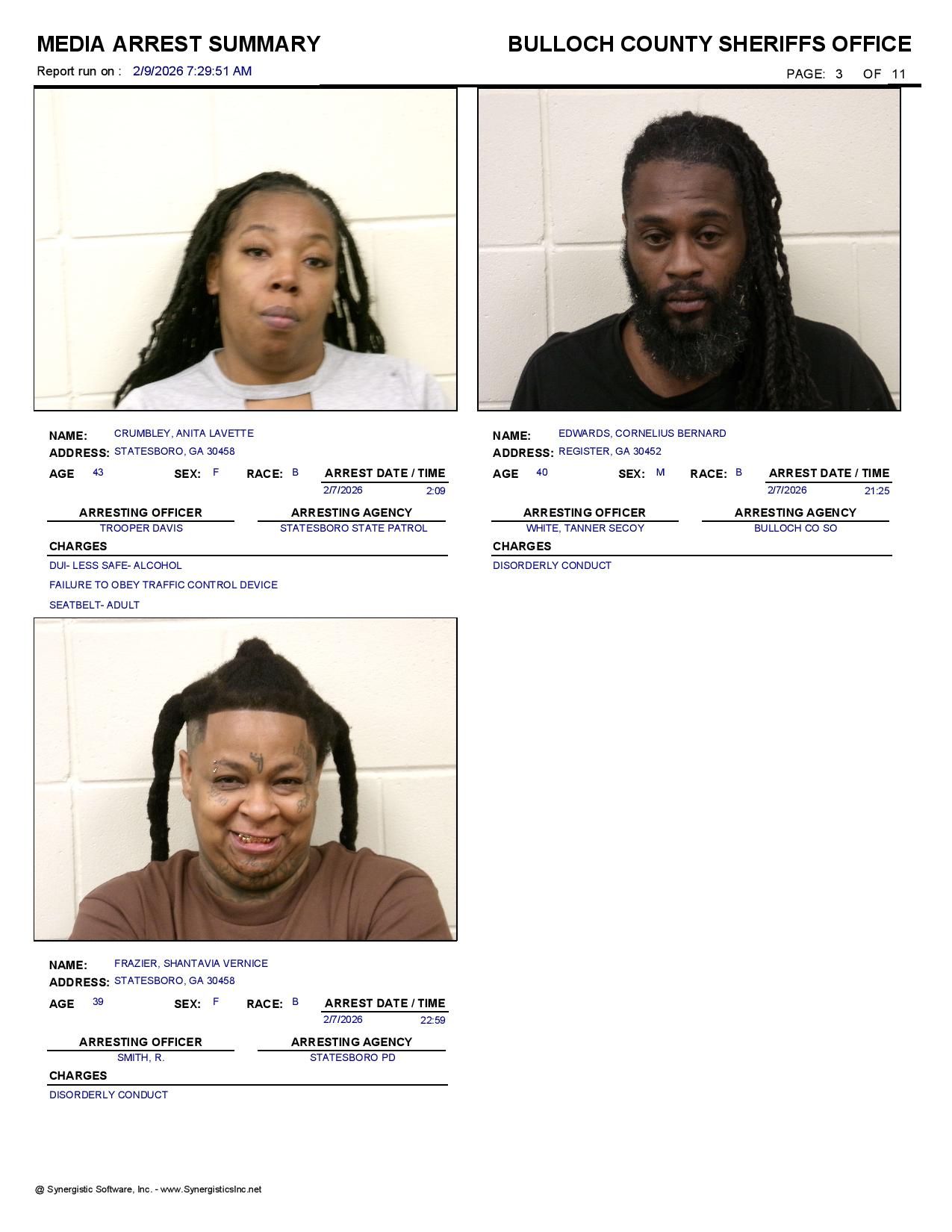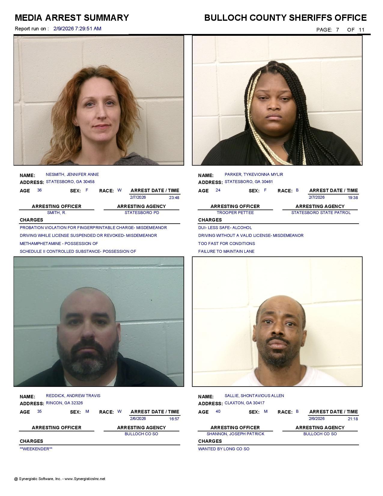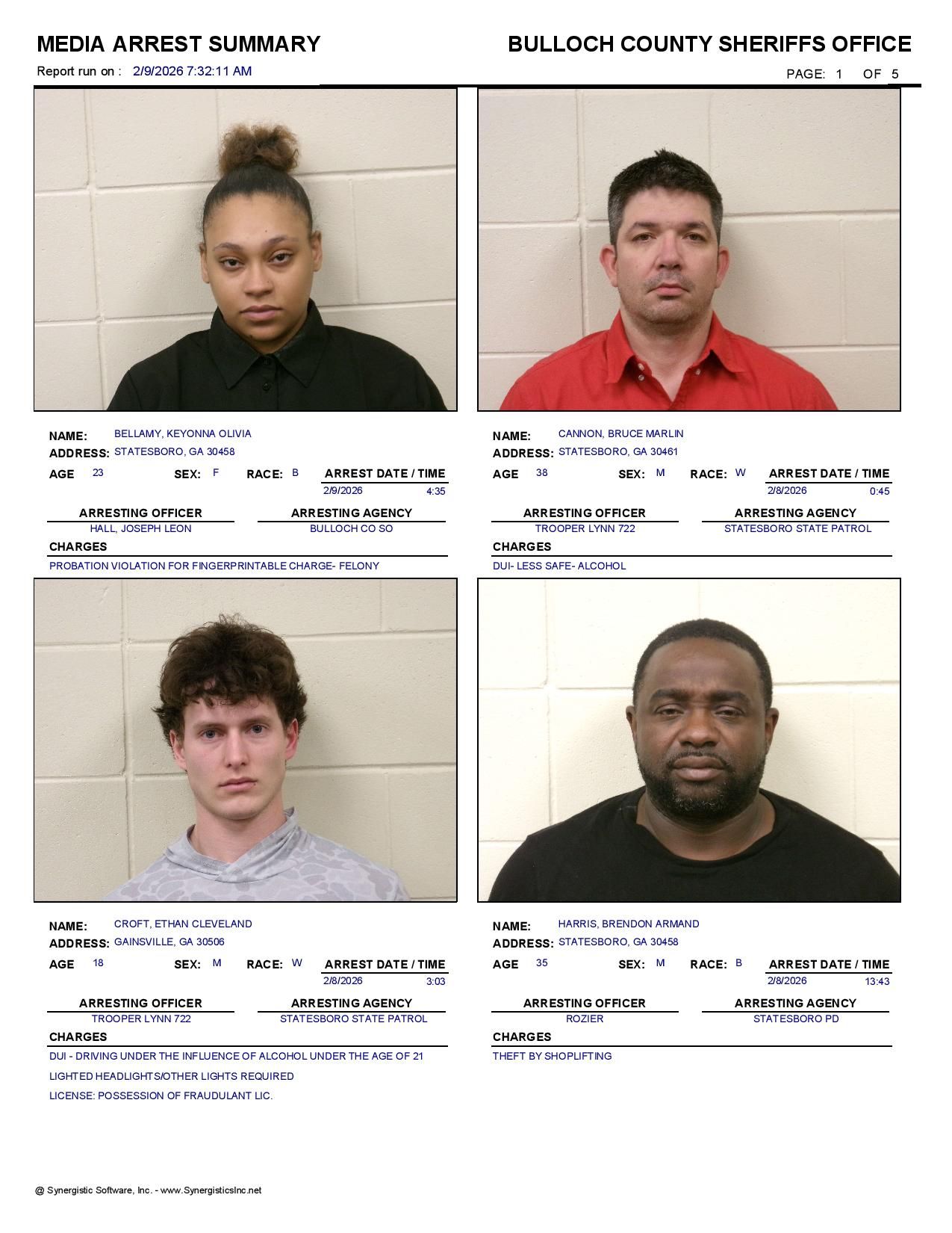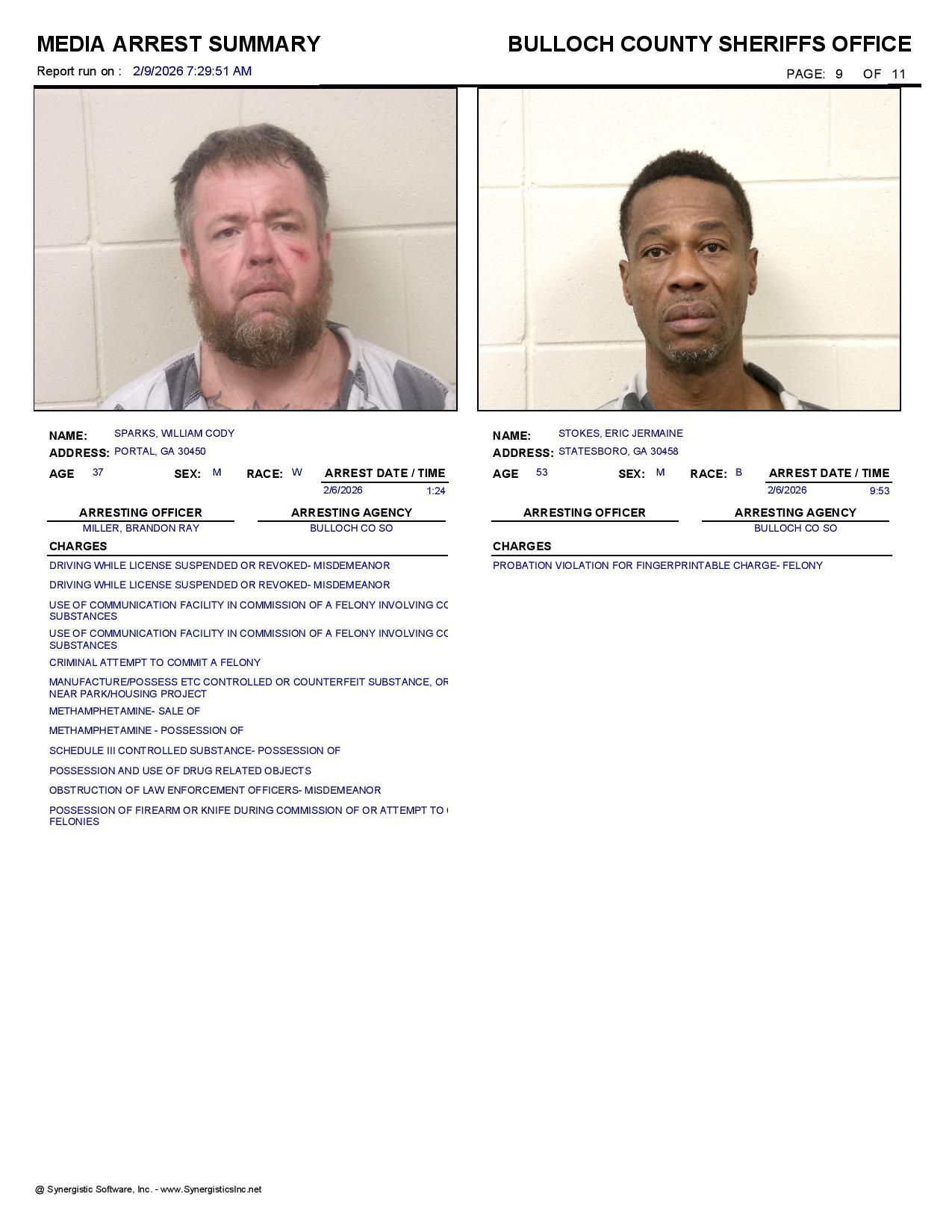 The Bulloch Co Jail Booking & Incident Report 02/09/26 details arrests from Bulloch Co., Statesboro, Brooklet, Portal, Register, and the Georgia State Patrol. Incident reports are from the Sheriff’s Office only.