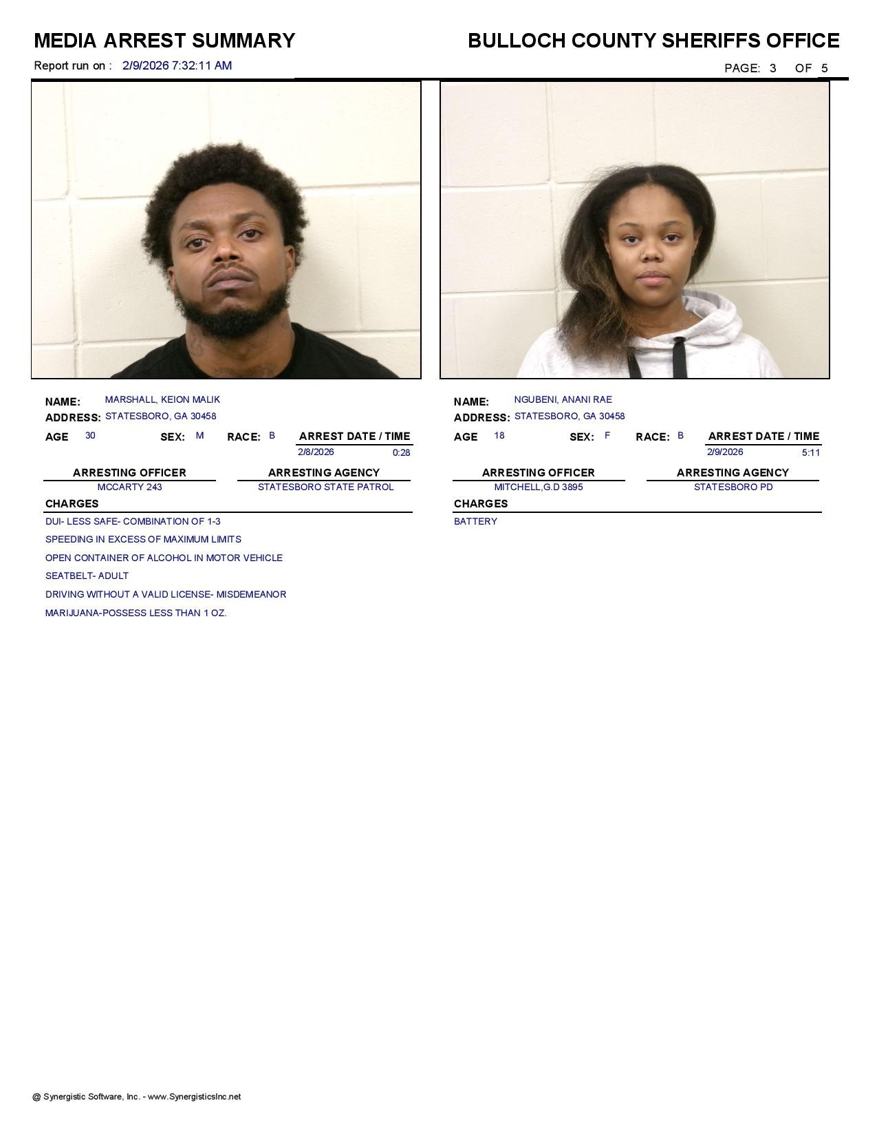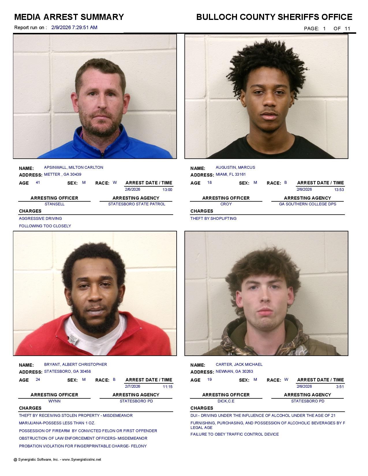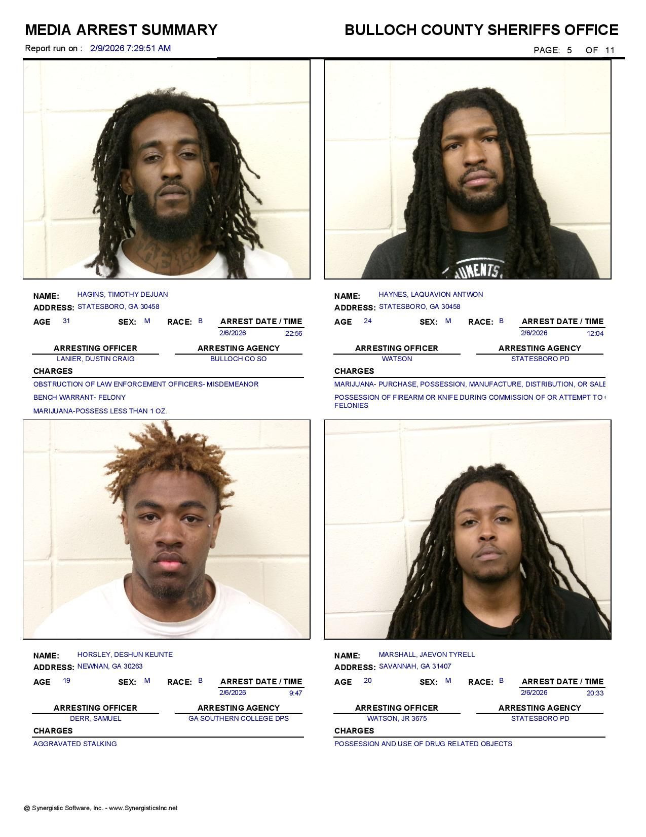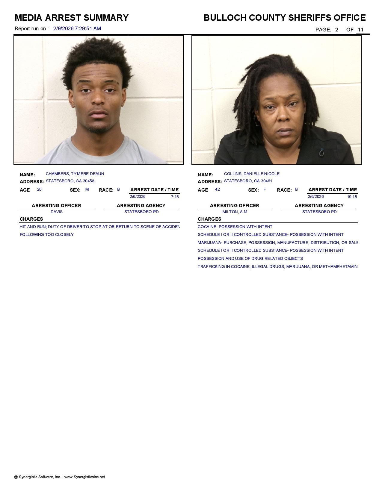 The Bulloch Co Jail Booking & Incident Report 02/09/26 details arrests from Bulloch Co., Statesboro, Brooklet, Portal, Register, and the Georgia State Patrol. Incident reports are from the Sheriff’s Office only.