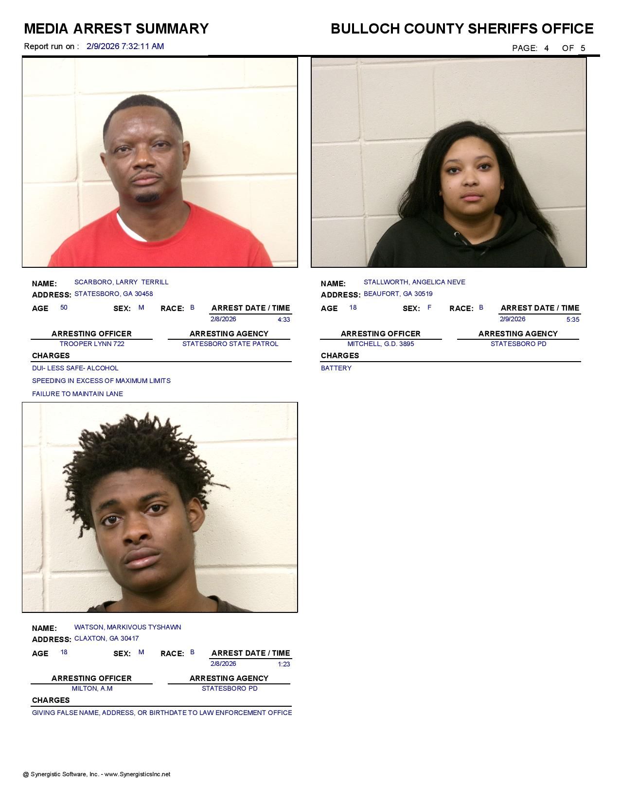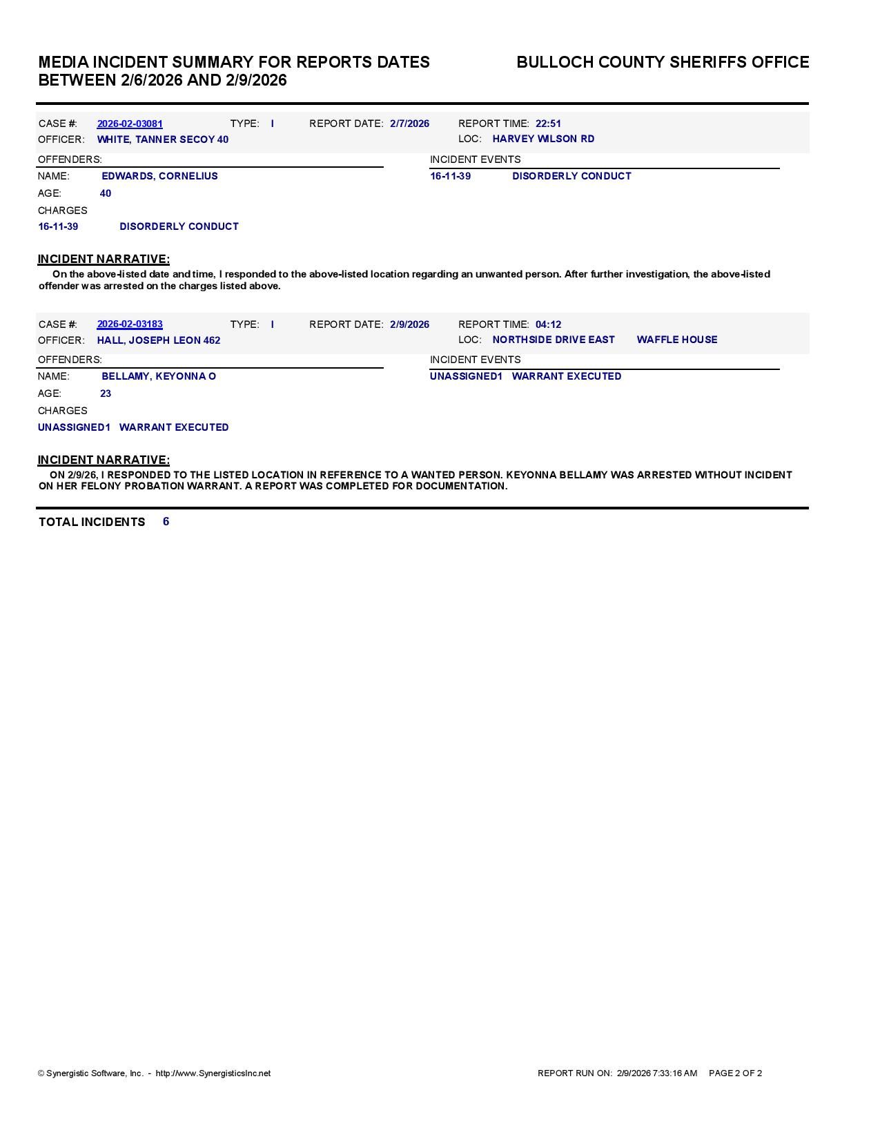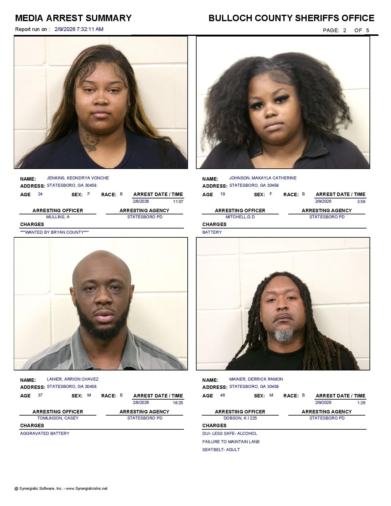 Bulloch Co. Jail Booking & Incident Report – 02/09/26