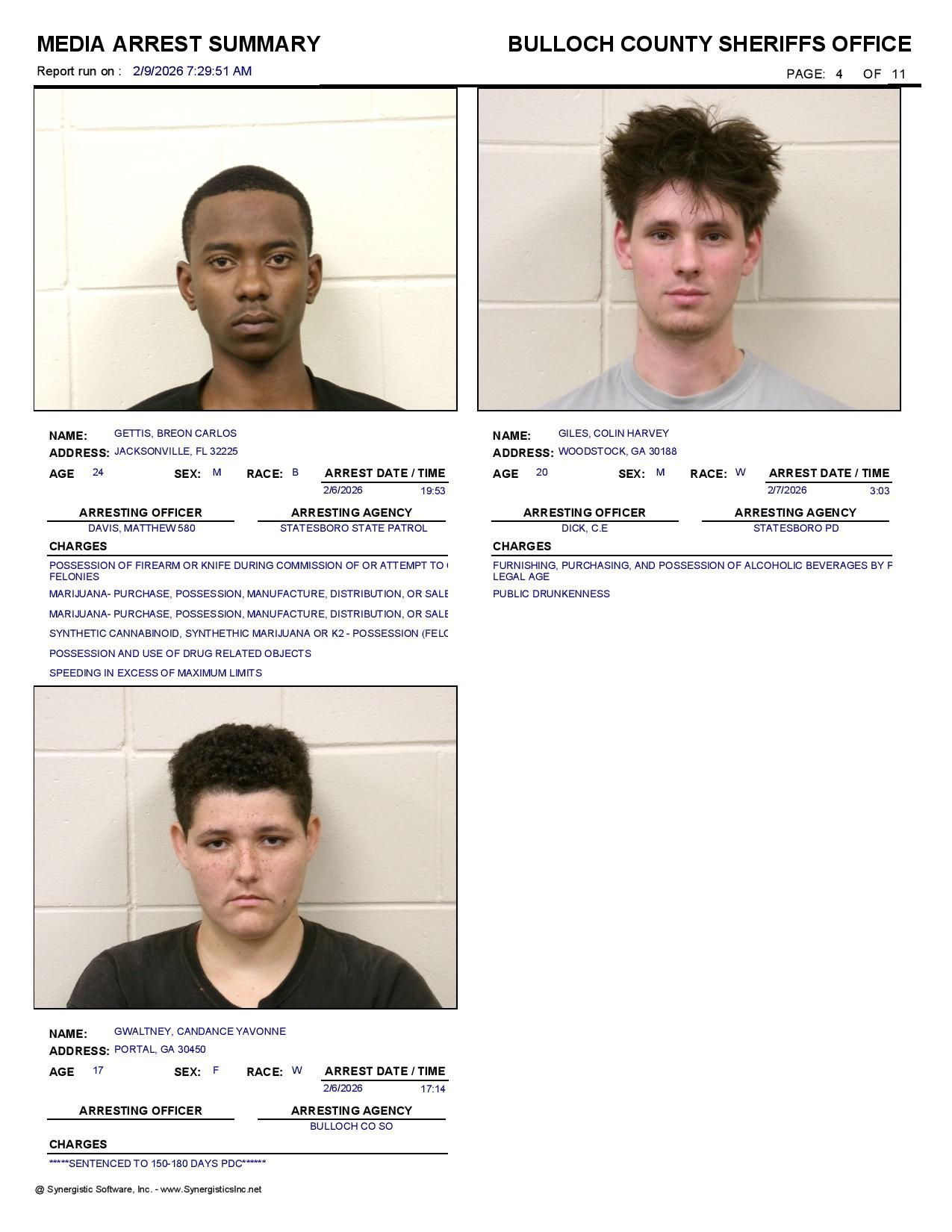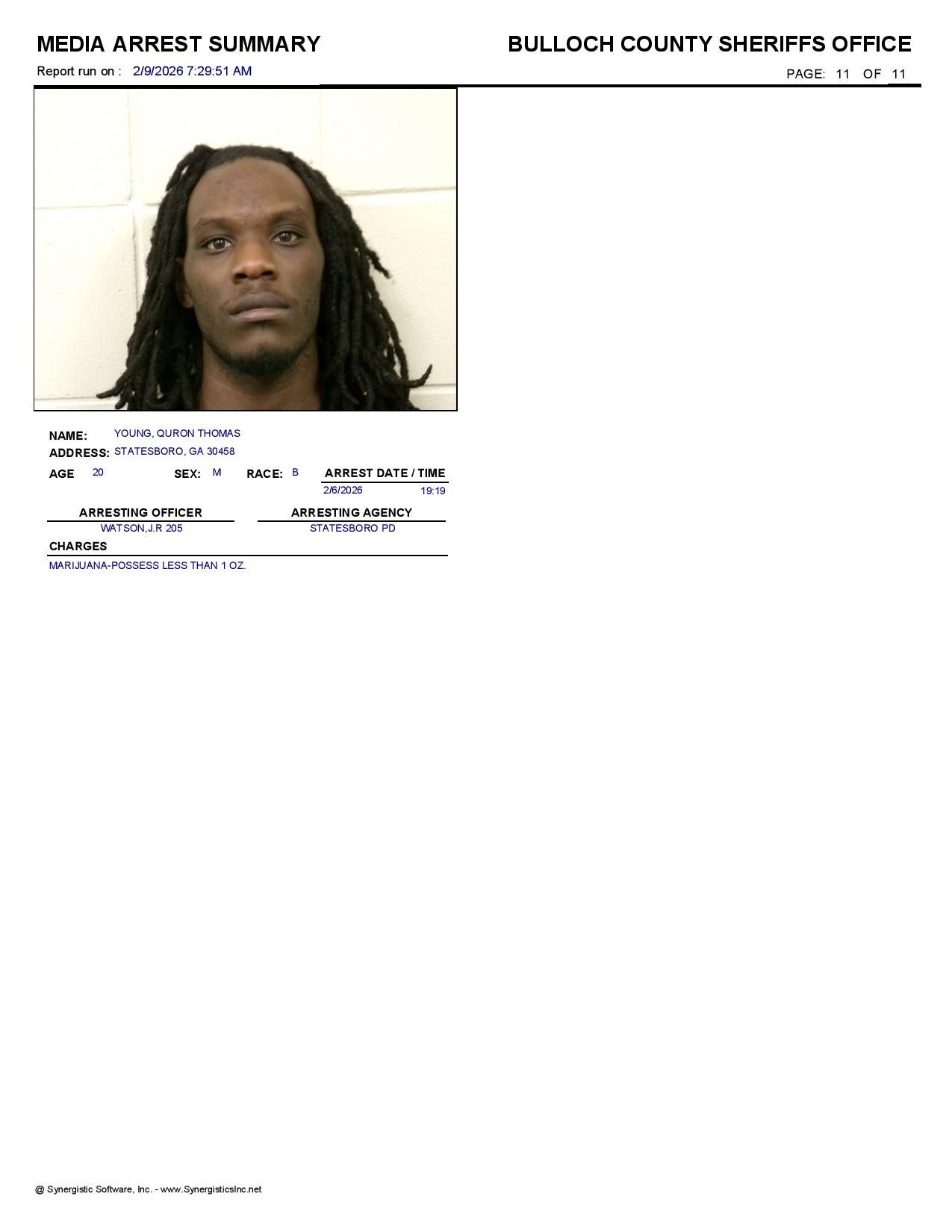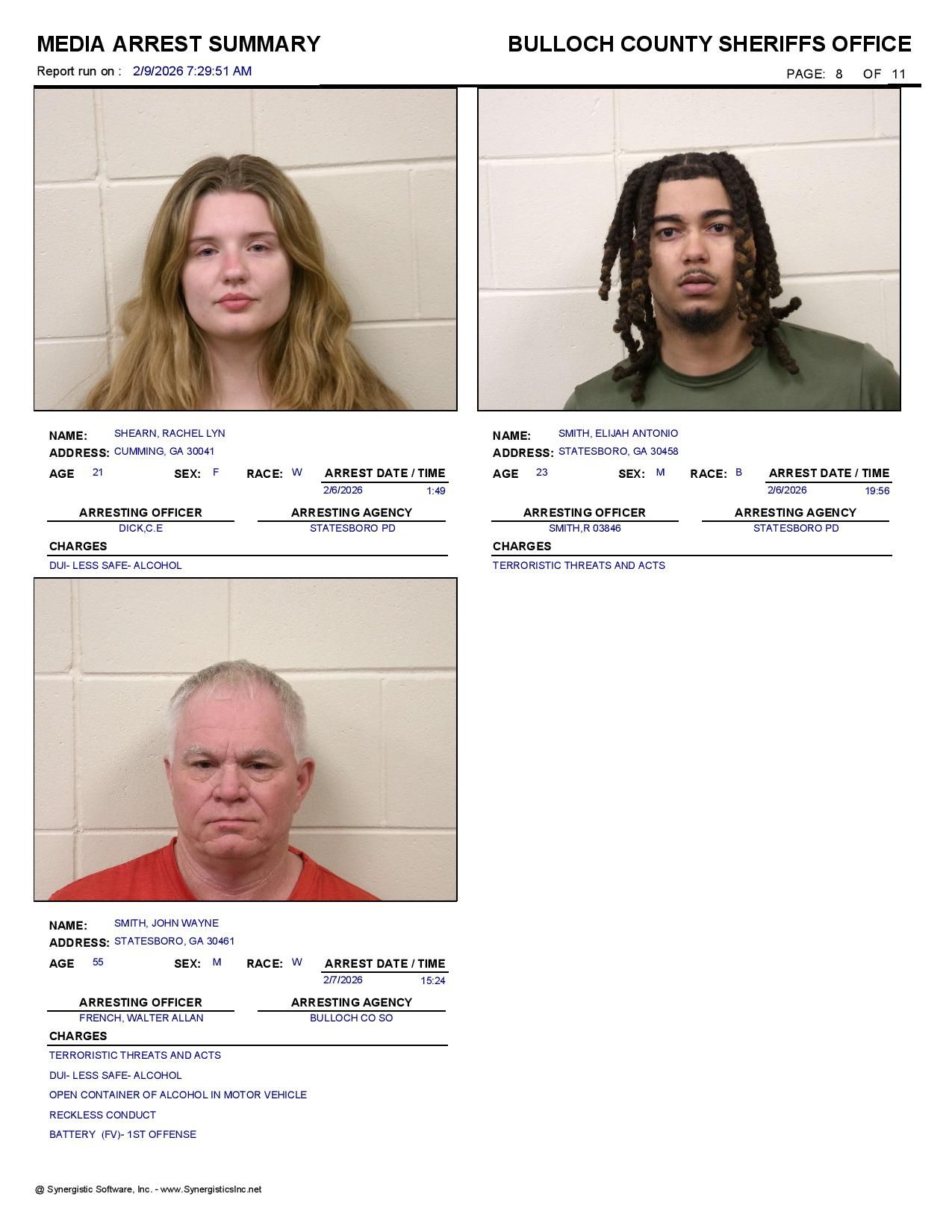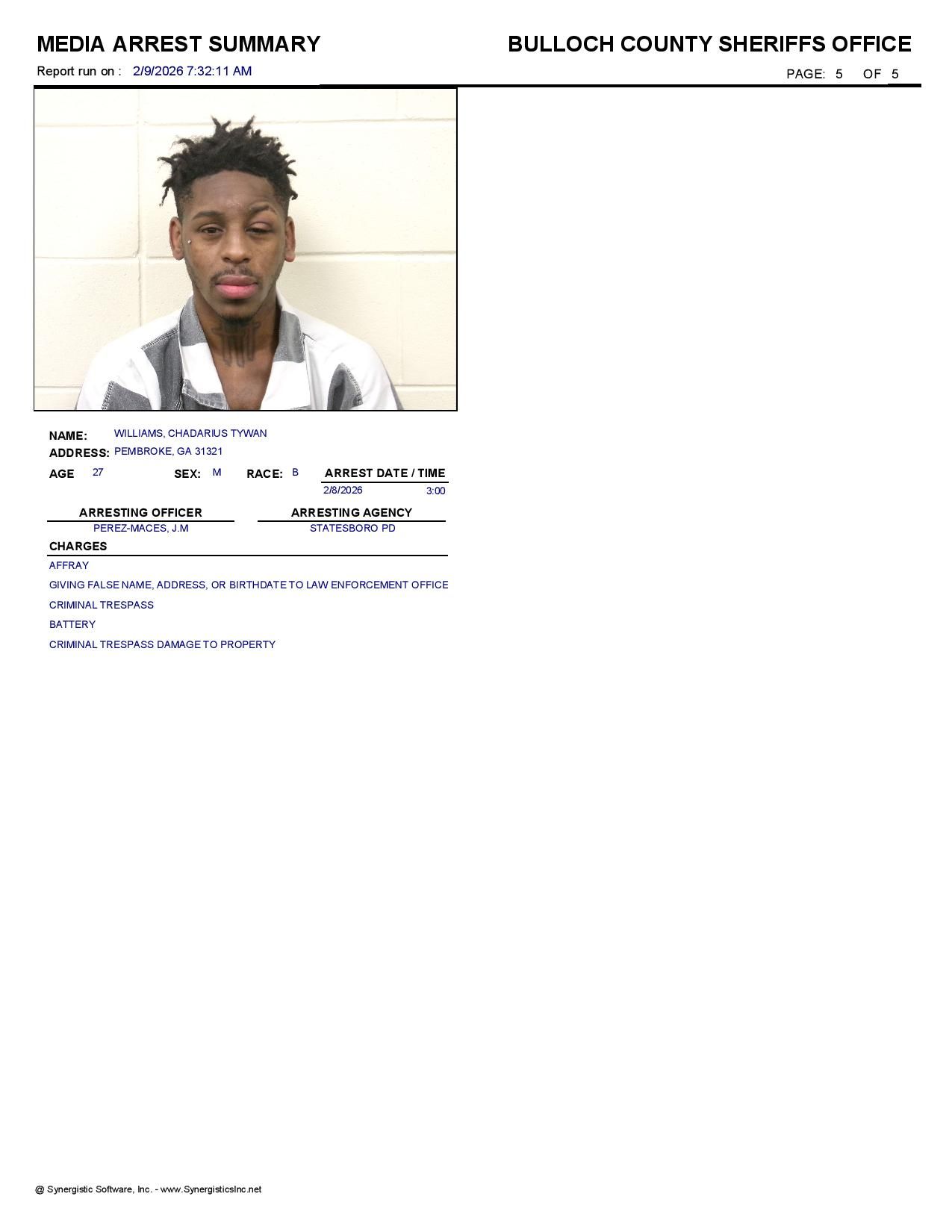 Bulloch Co. Jail Booking & Incident Report – 02/09/26