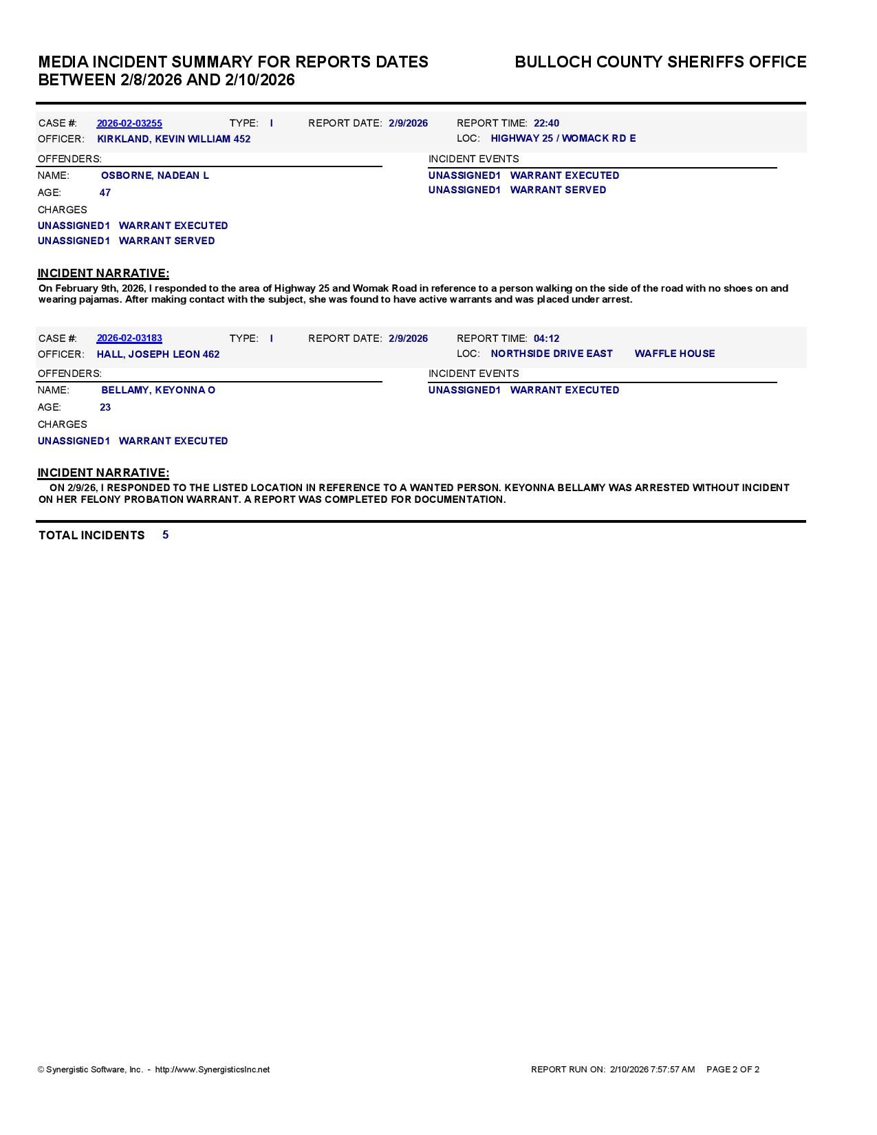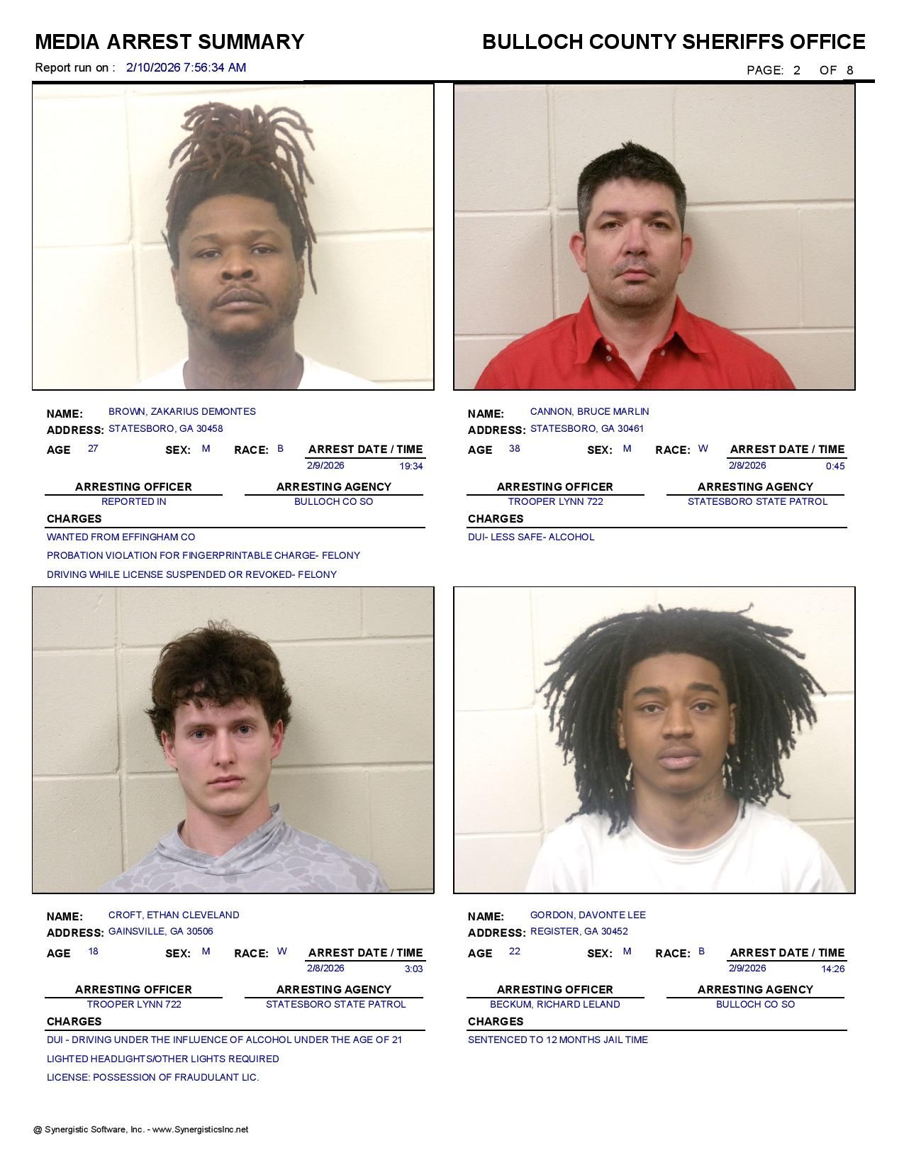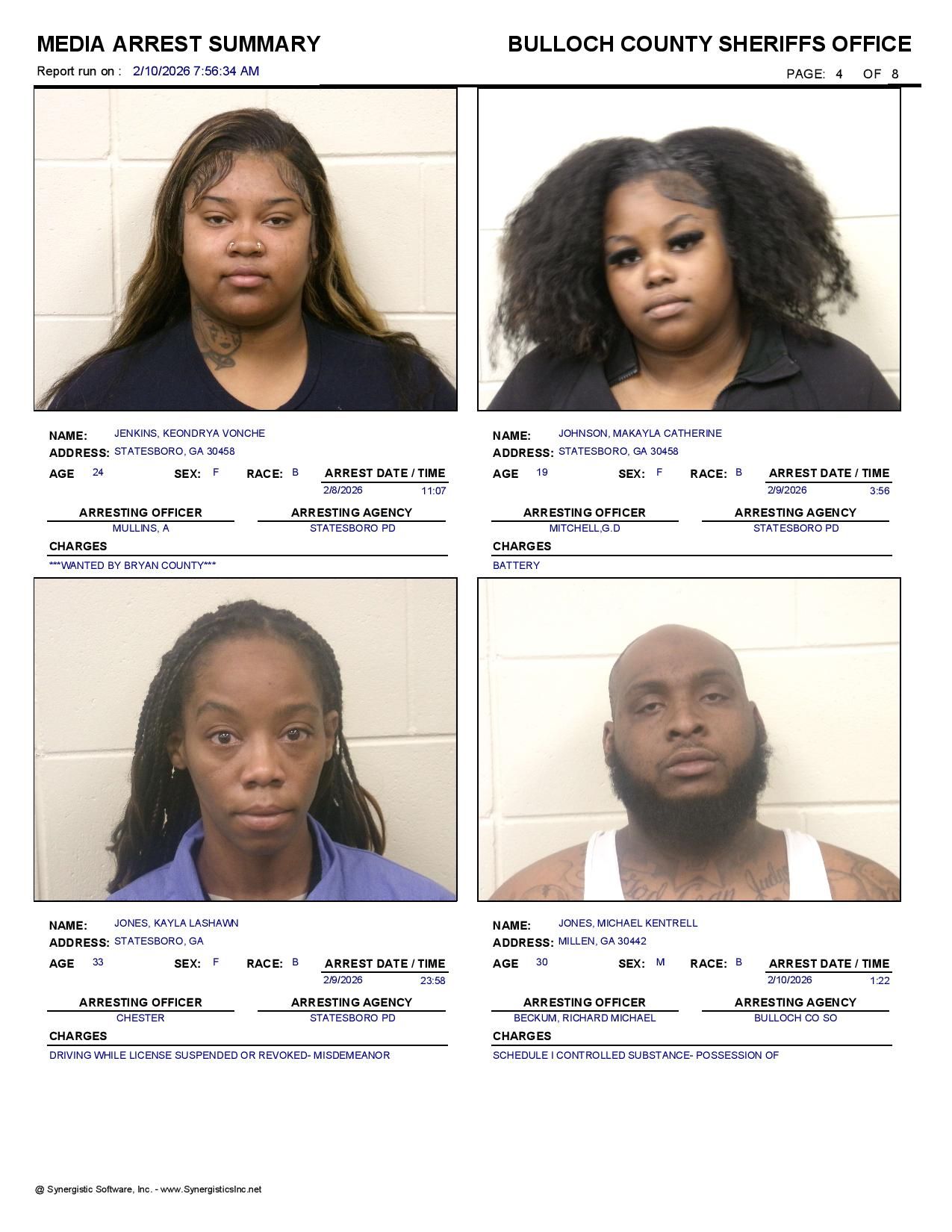 Bulloch Co. Jail Booking & Incident Report – 02/10/26