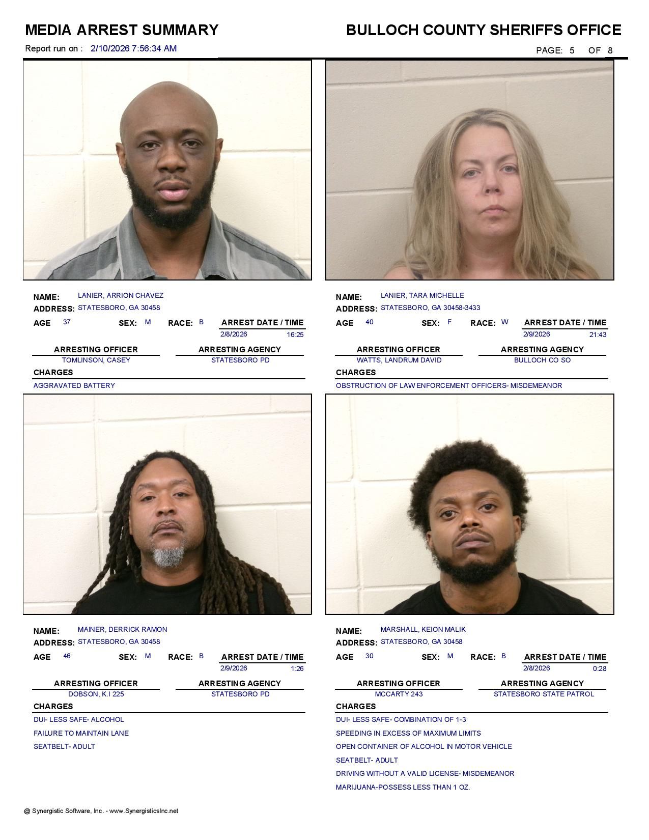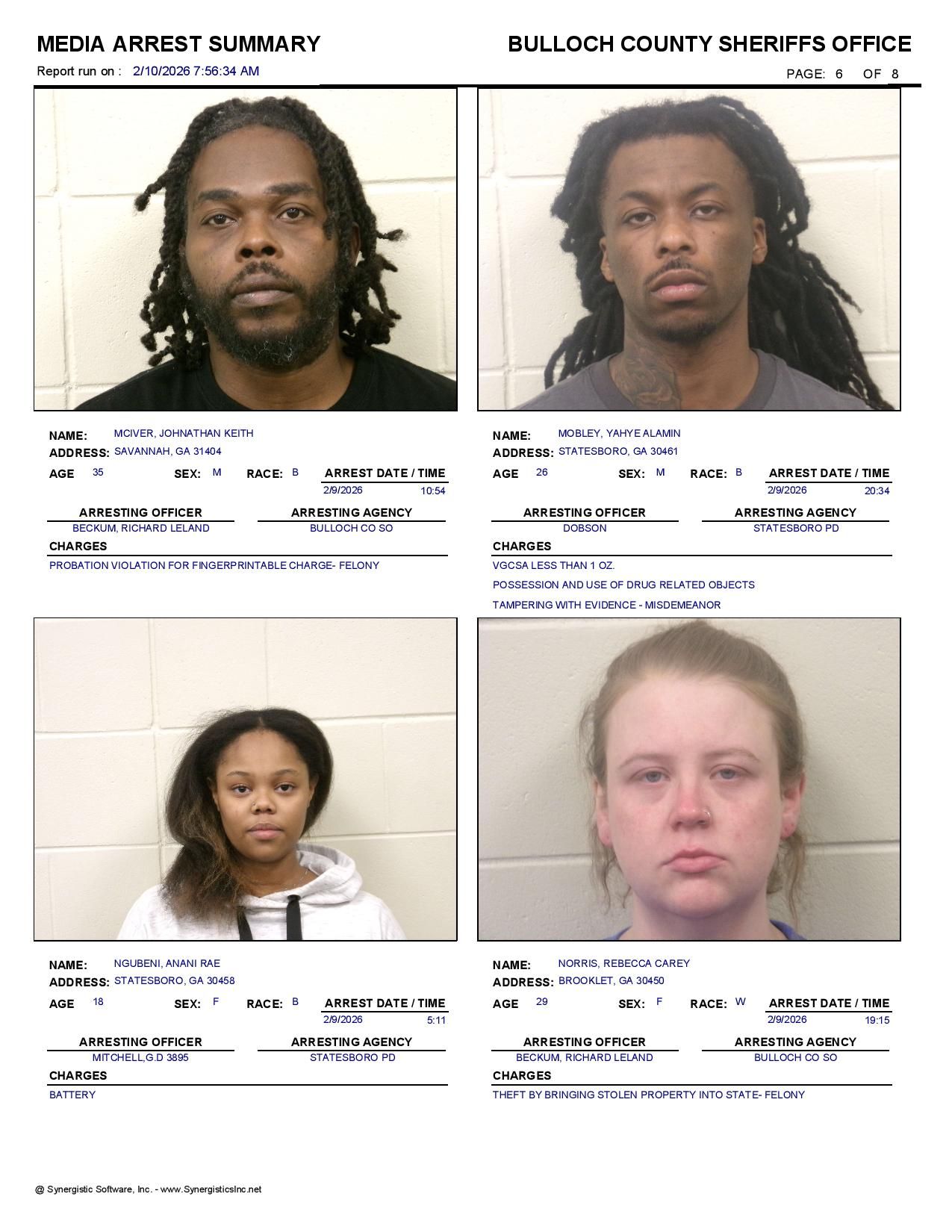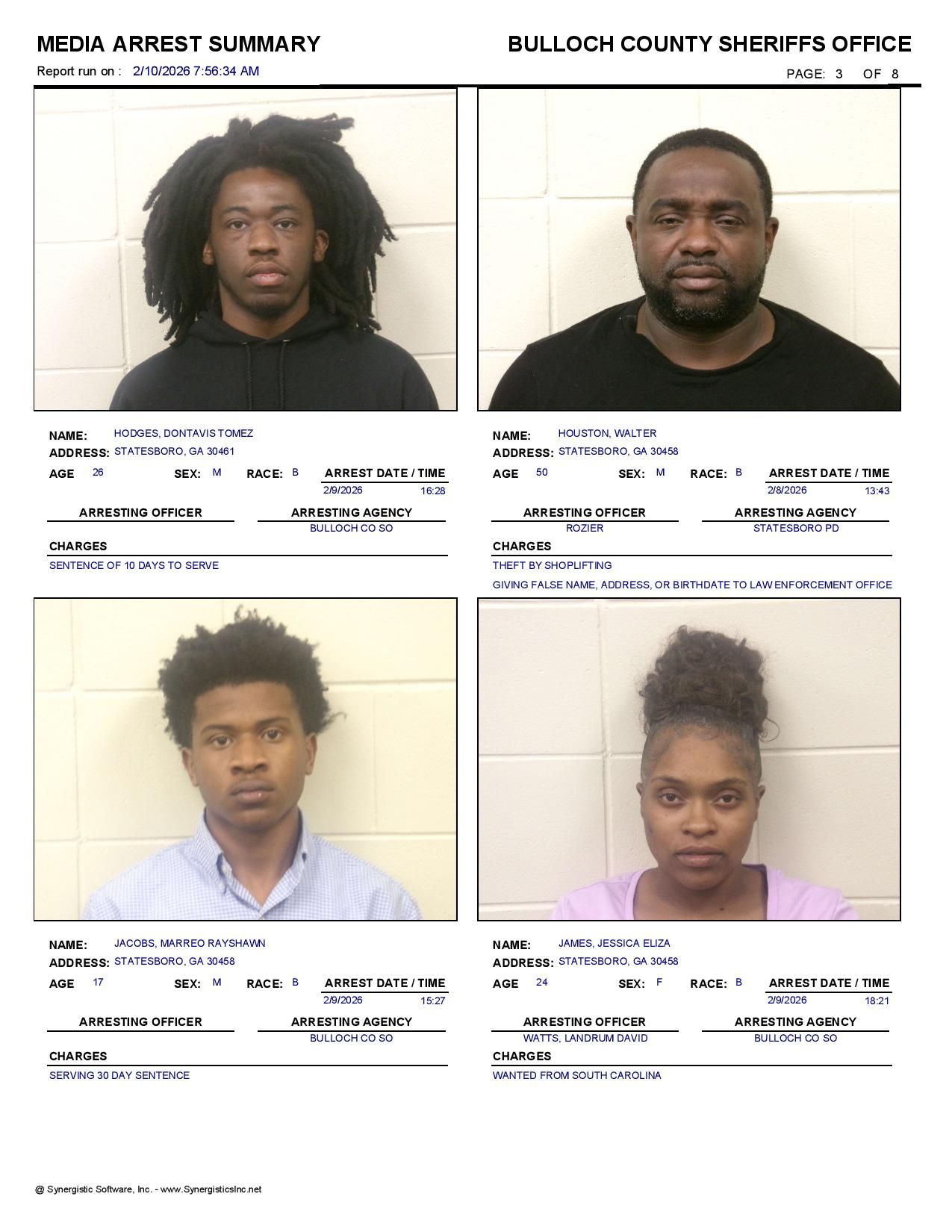 The Bulloch Co Jail Booking & Incident Report 02/10/26 details arrests from Bulloch Co., Statesboro, Brooklet, Portal, Register, and the Georgia State Patrol. Incident reports are from the Sheriff’s Office only.