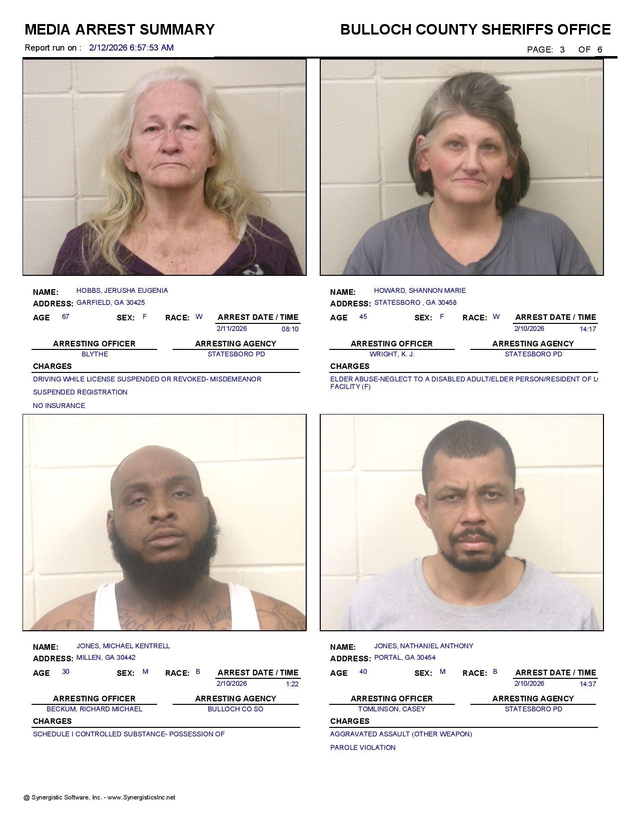 The Bulloch Co Jail Booking & Incident Report 02/12/26 details arrests from Bulloch Co., Statesboro, Brooklet, Portal, Register, and the Georgia State Patrol. Incident reports are from the Sheriff’s Office only.
