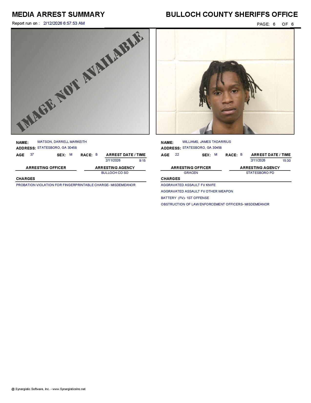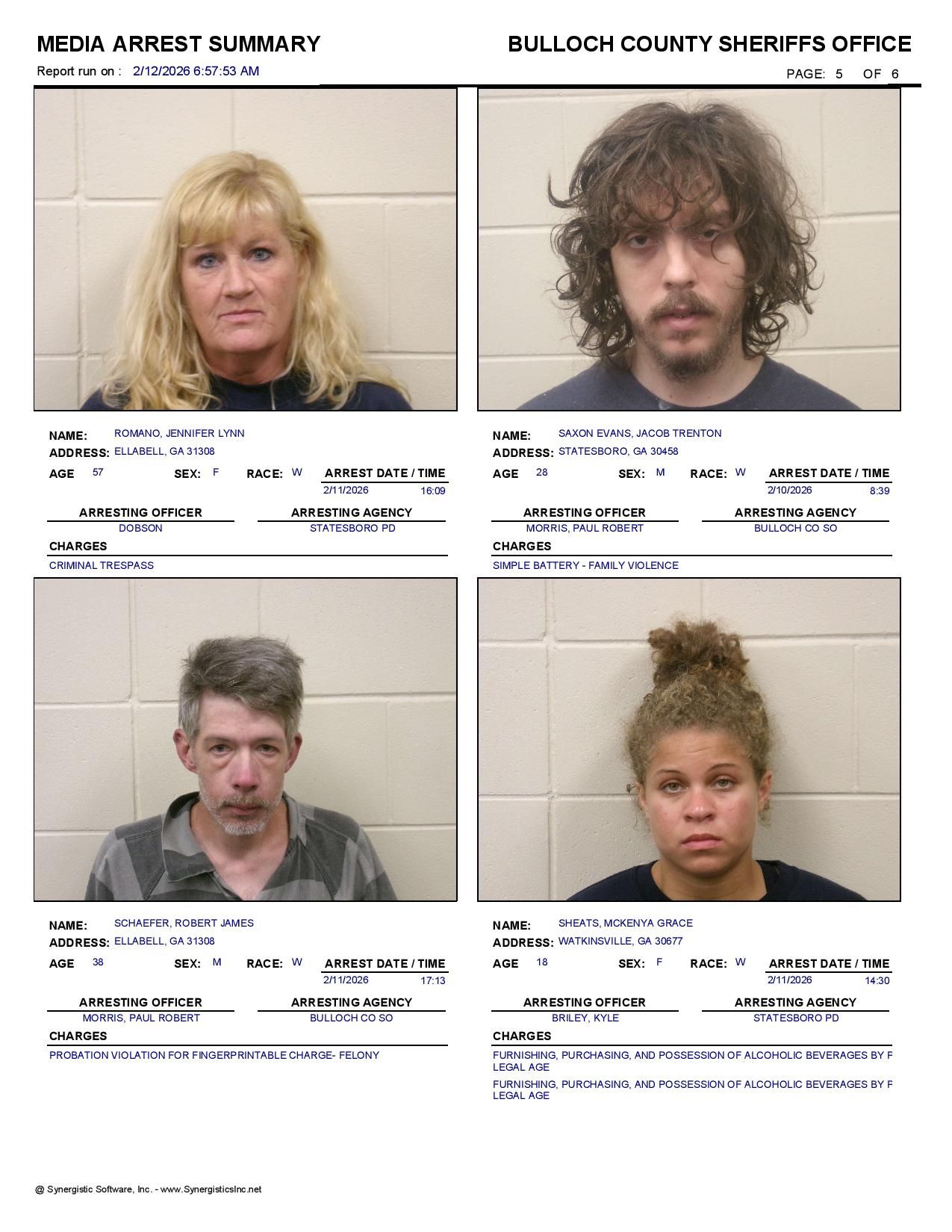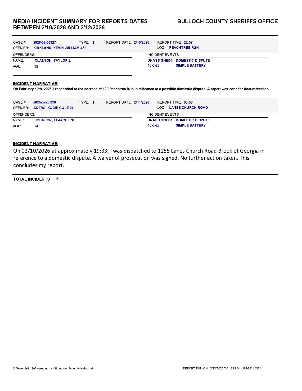 Bulloch Co. Jail Booking & Incident Report – 02/12/26