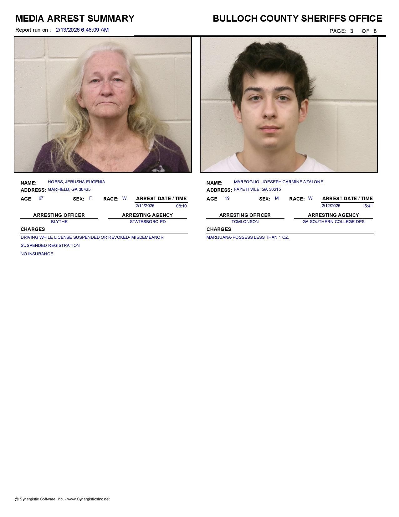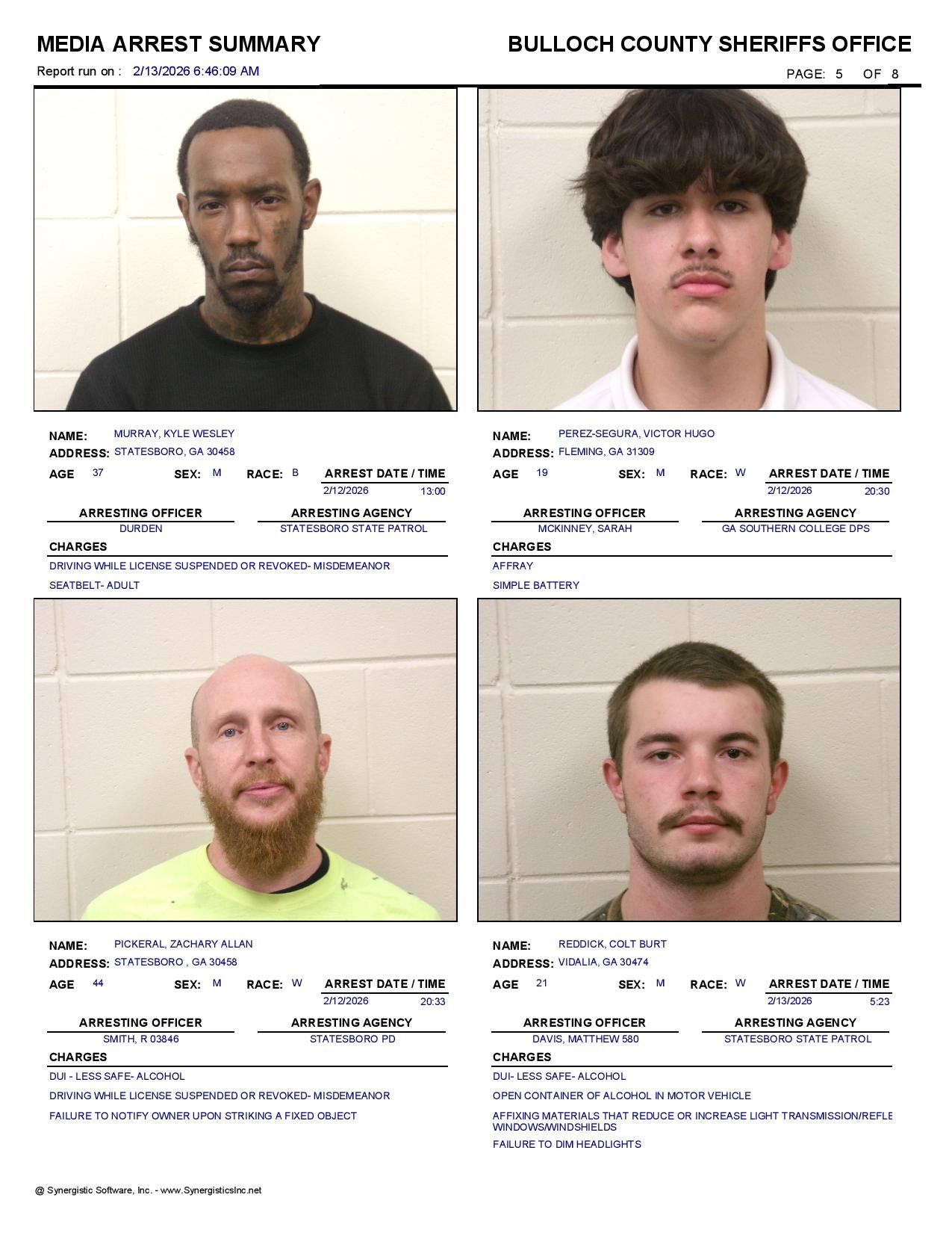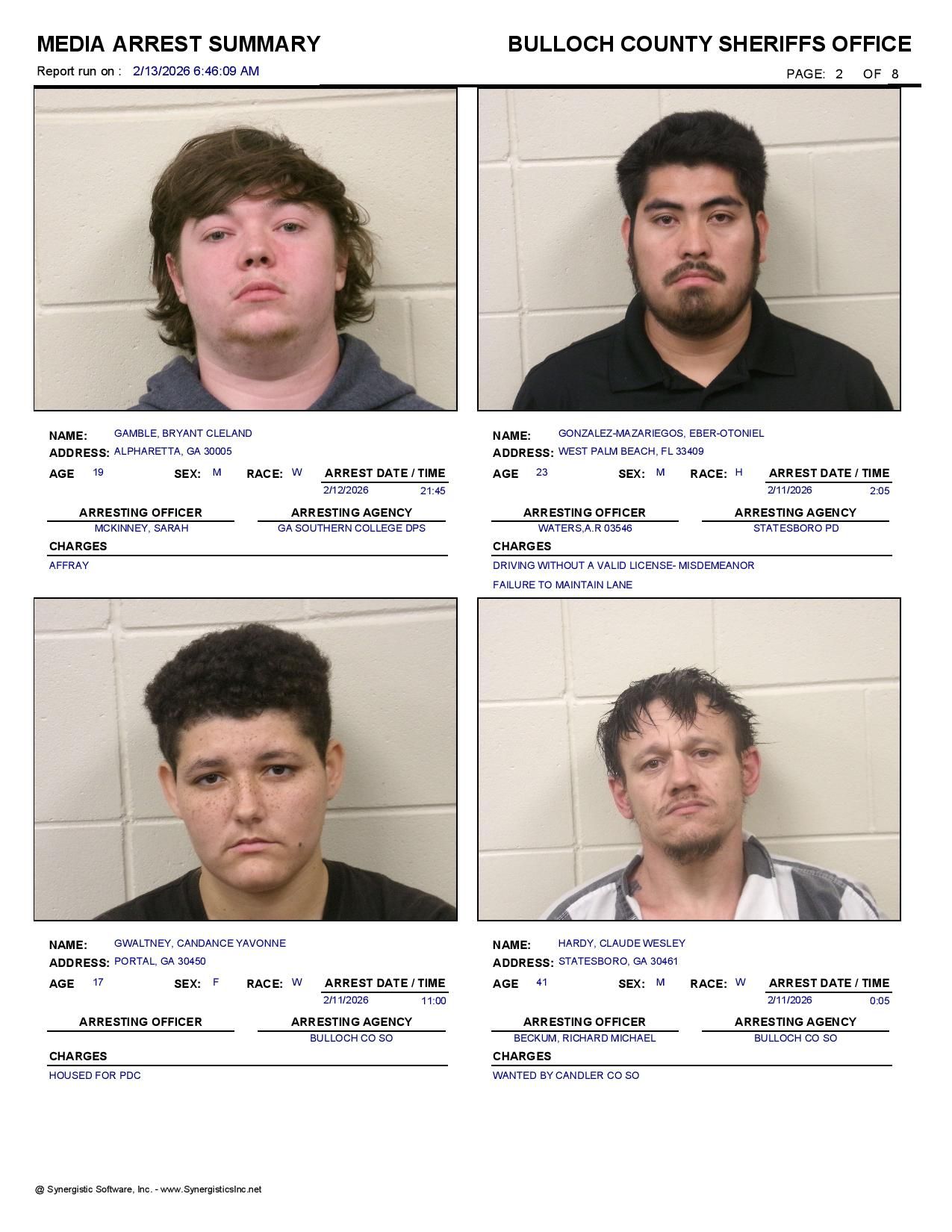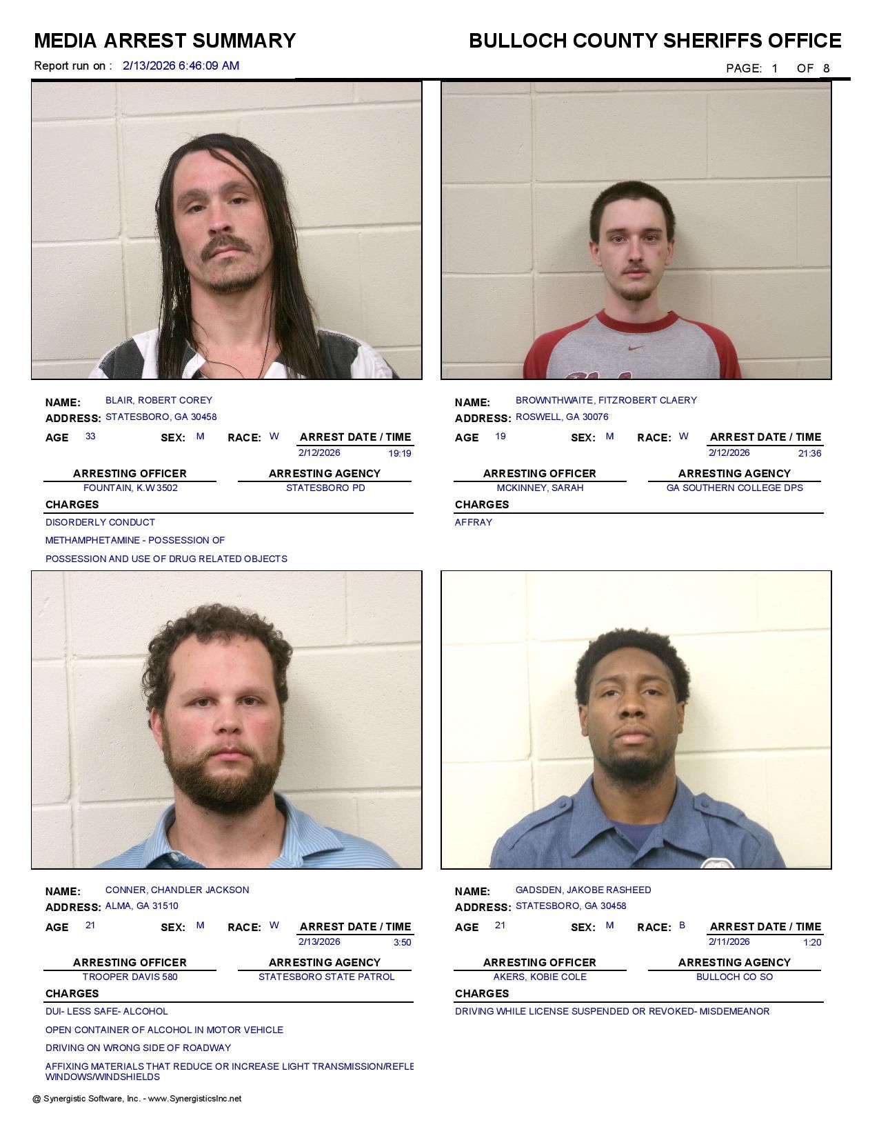 The Bulloch Co Jail Booking & Incident Report 02/13/26 details arrests from Bulloch Co., Statesboro, Brooklet, Portal, Register, and the Georgia State Patrol. Incident reports are from the Sheriff’s Office only.