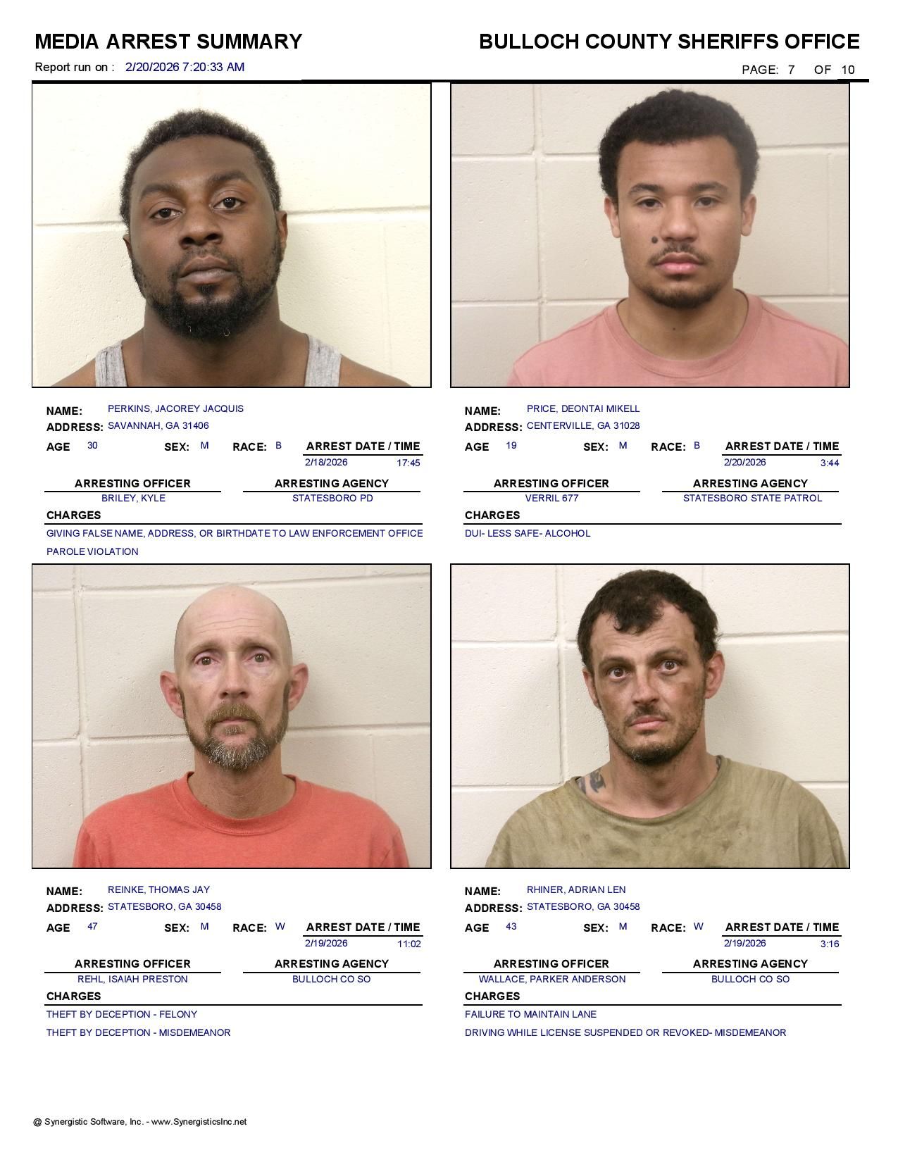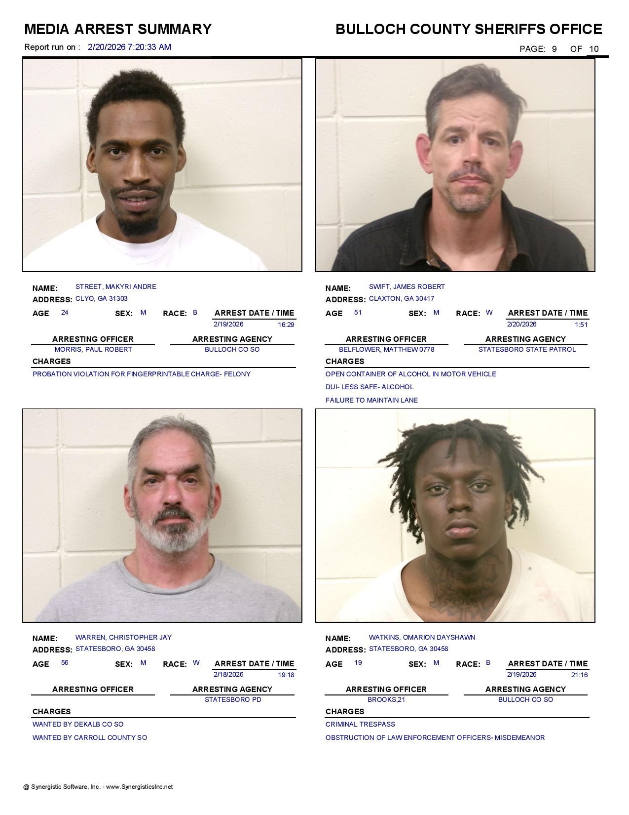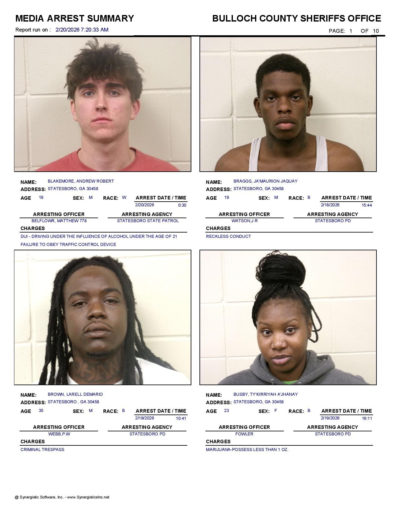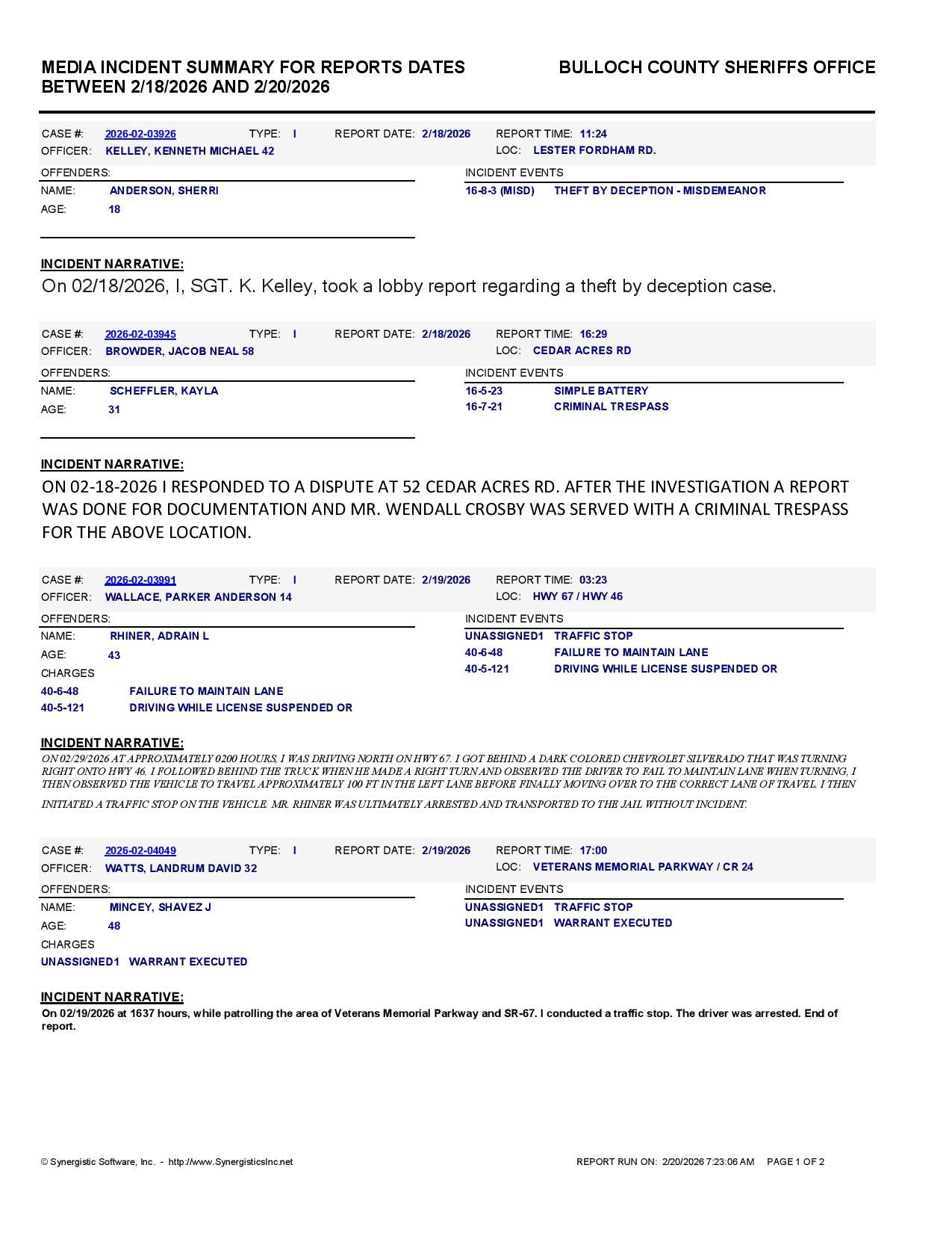 The Bulloch Co Jail Booking & Incident Report 02/20/26 details arrests from Bulloch Co., Statesboro, Brooklet, Portal, Register, and the Georgia State Patrol. Incident reports are from the Sheriff’s Office only.