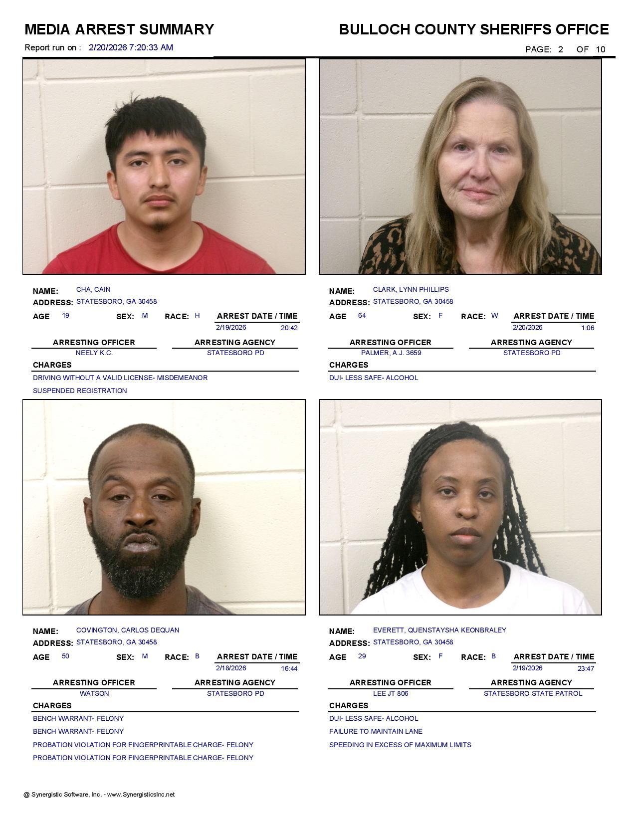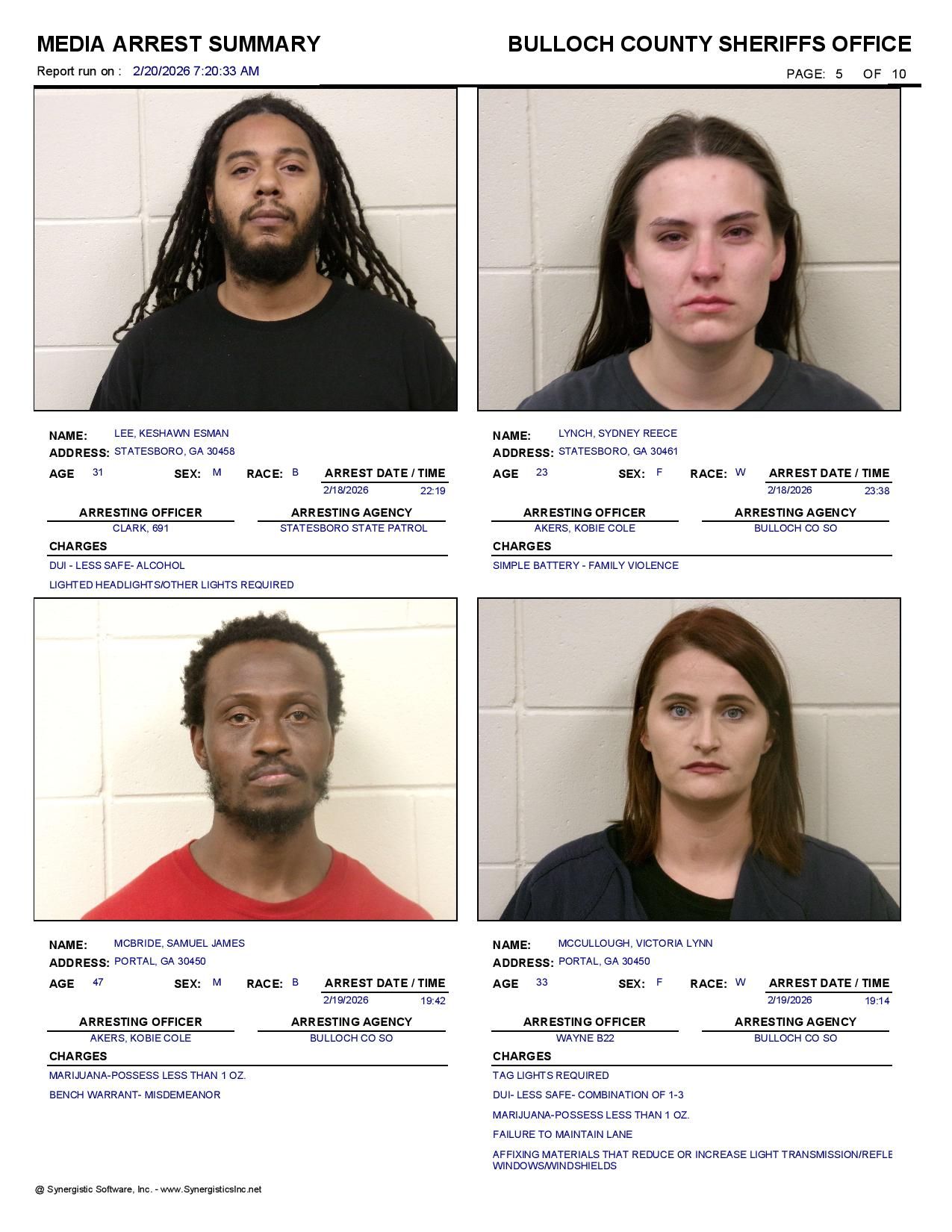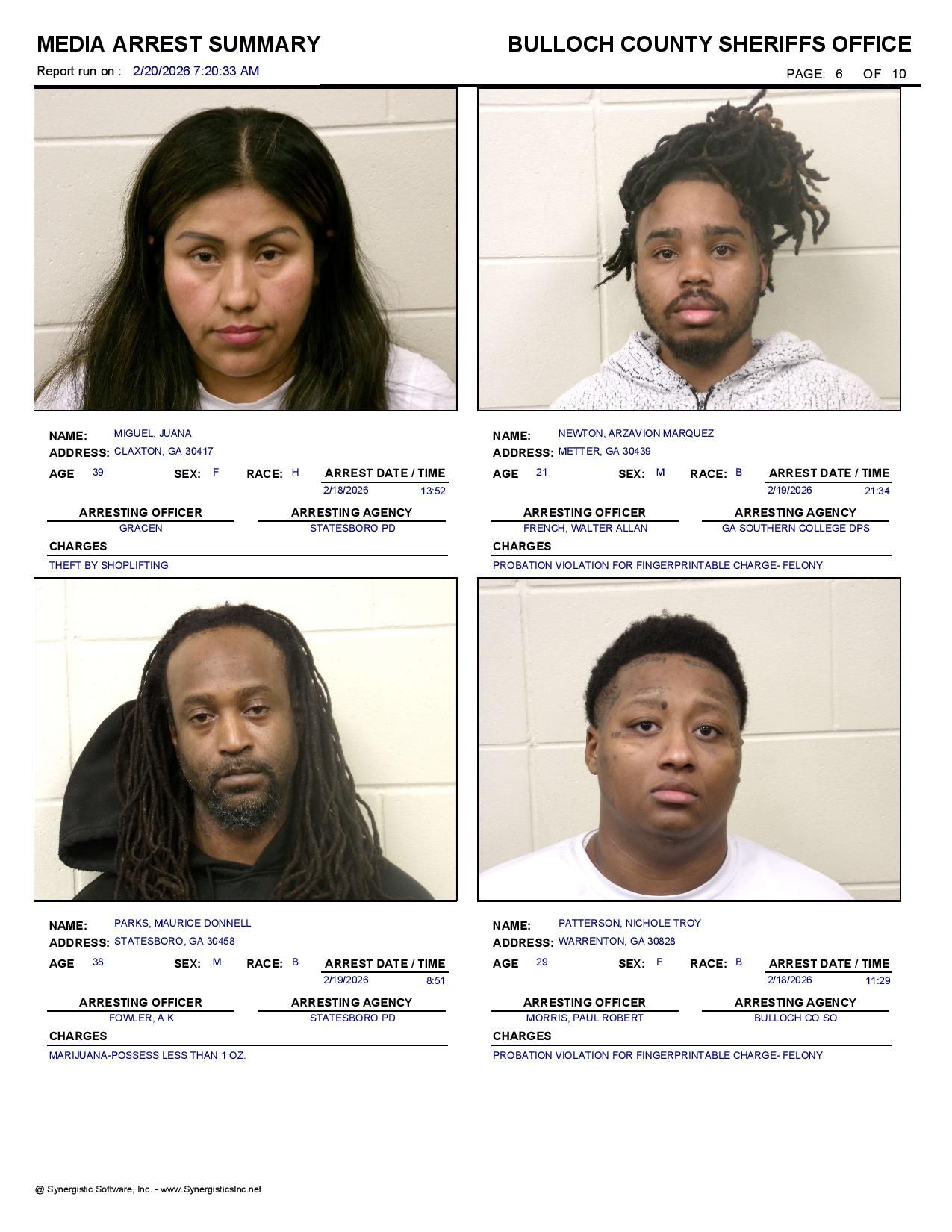 The Bulloch Co Jail Booking & Incident Report 02/20/26 details arrests from Bulloch Co., Statesboro, Brooklet, Portal, Register, and the Georgia State Patrol. Incident reports are from the Sheriff’s Office only.