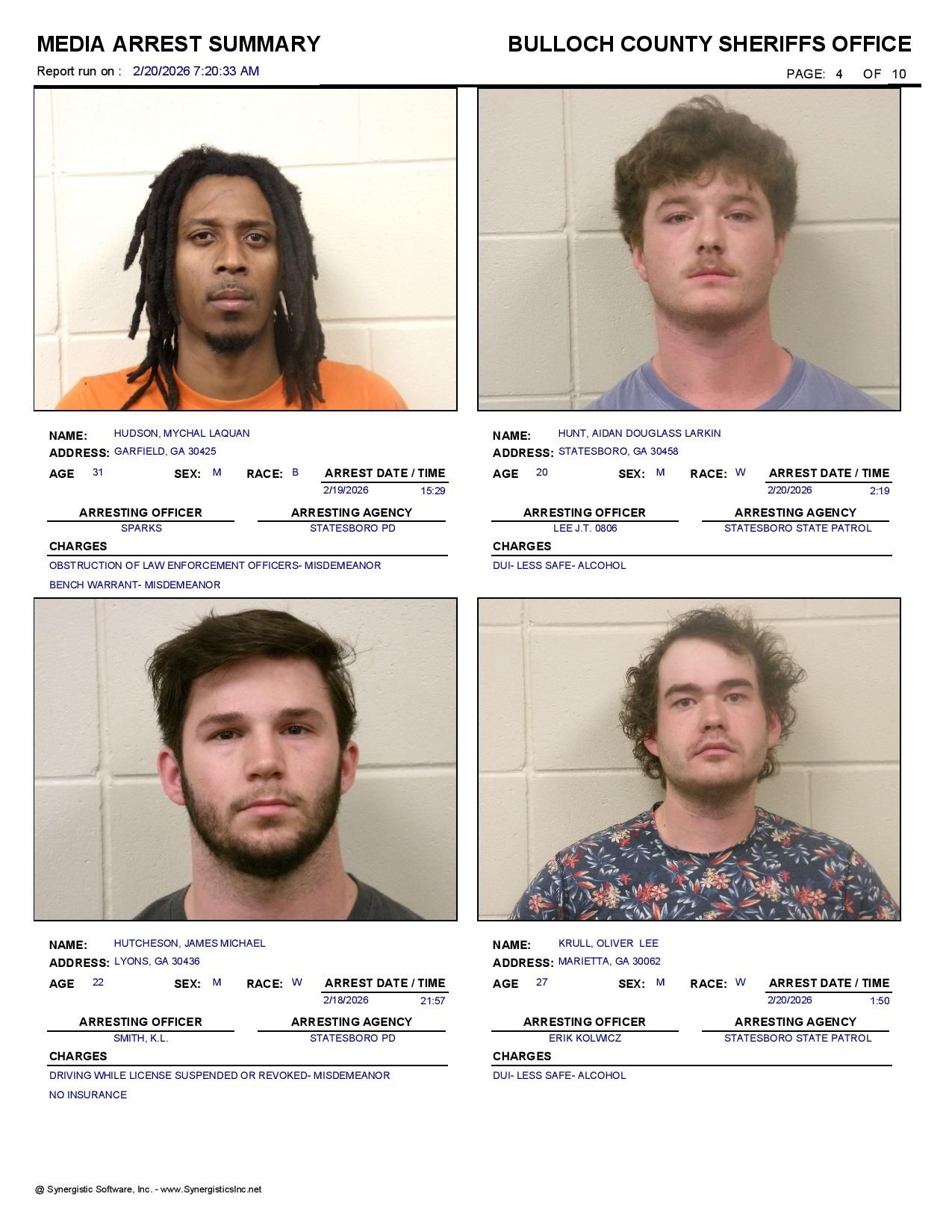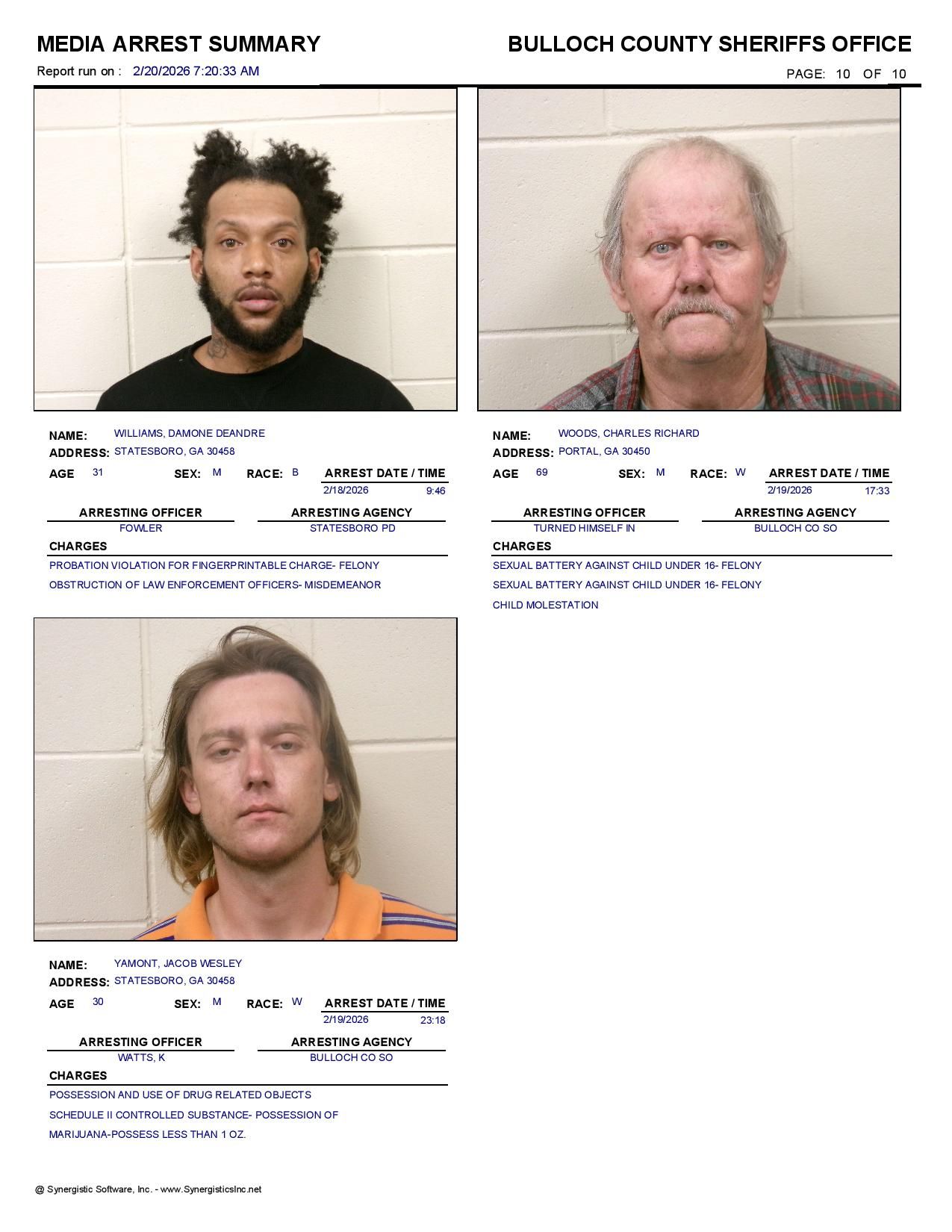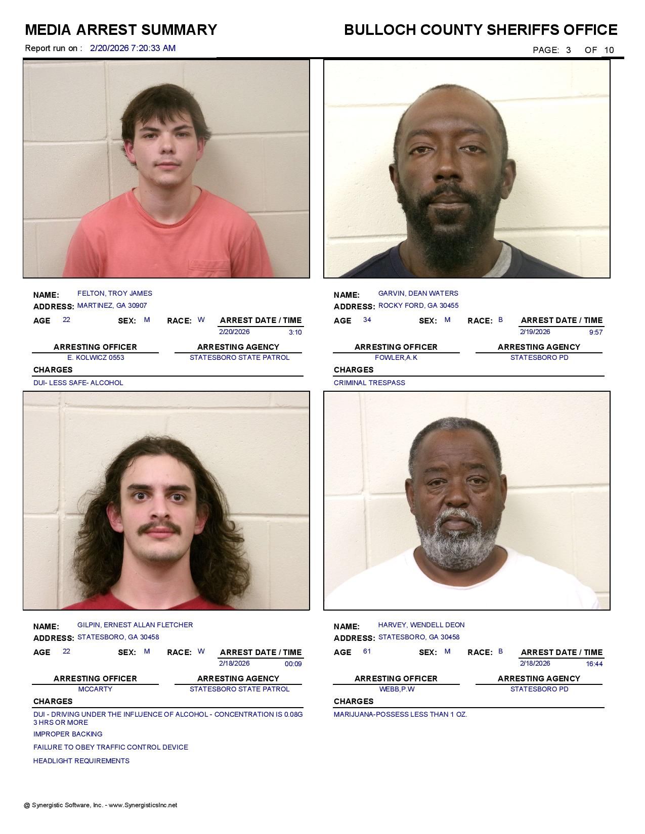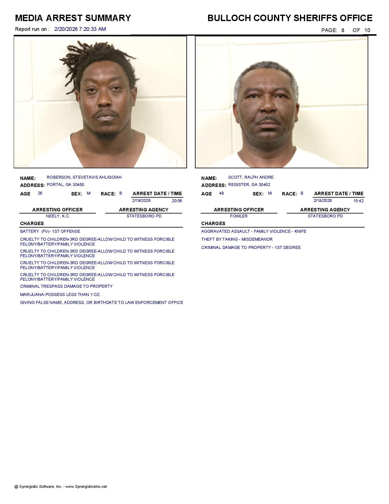 The Bulloch Co Jail Booking & Incident Report 02/20/26 details arrests from Bulloch Co., Statesboro, Brooklet, Portal, Register, and the Georgia State Patrol. Incident reports are from the Sheriff’s Office only.