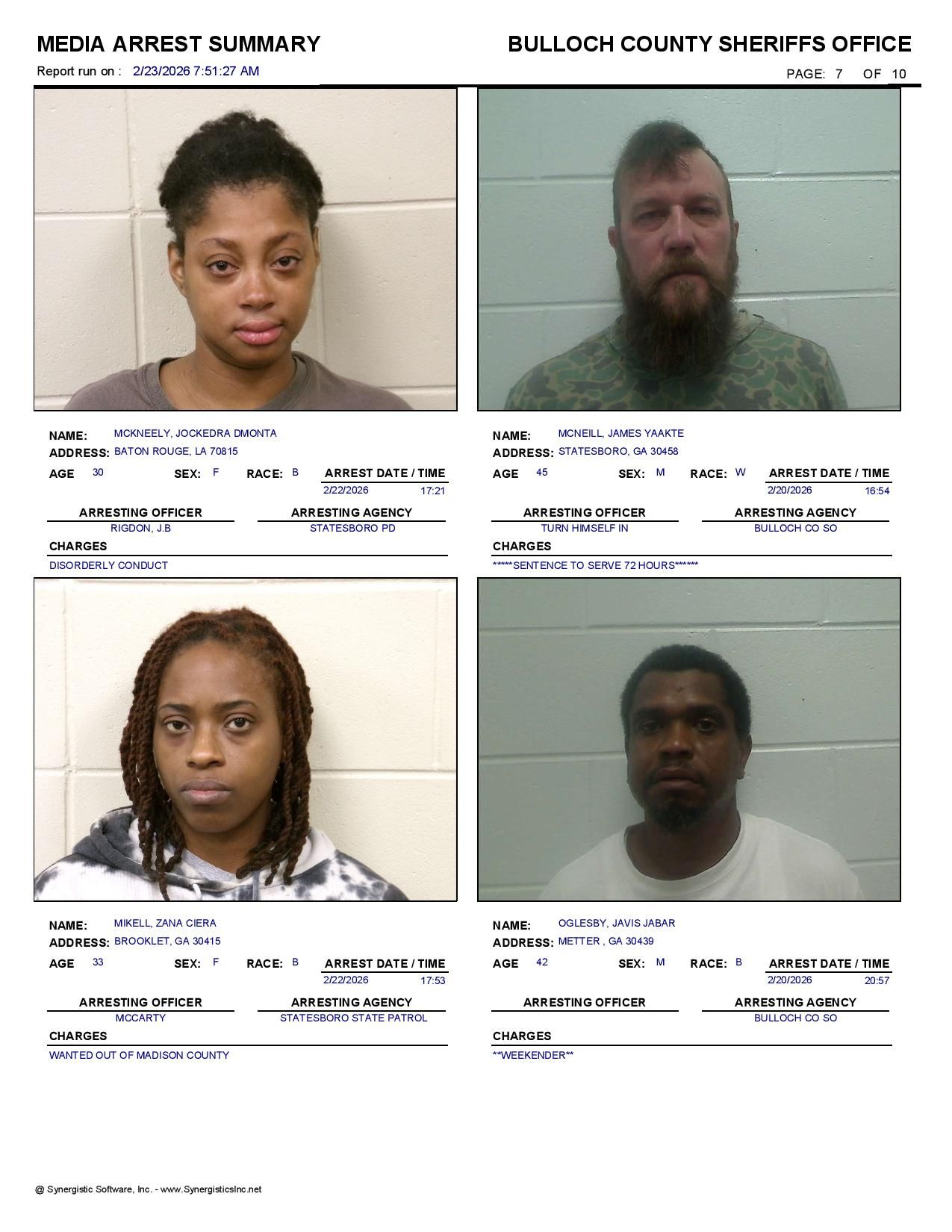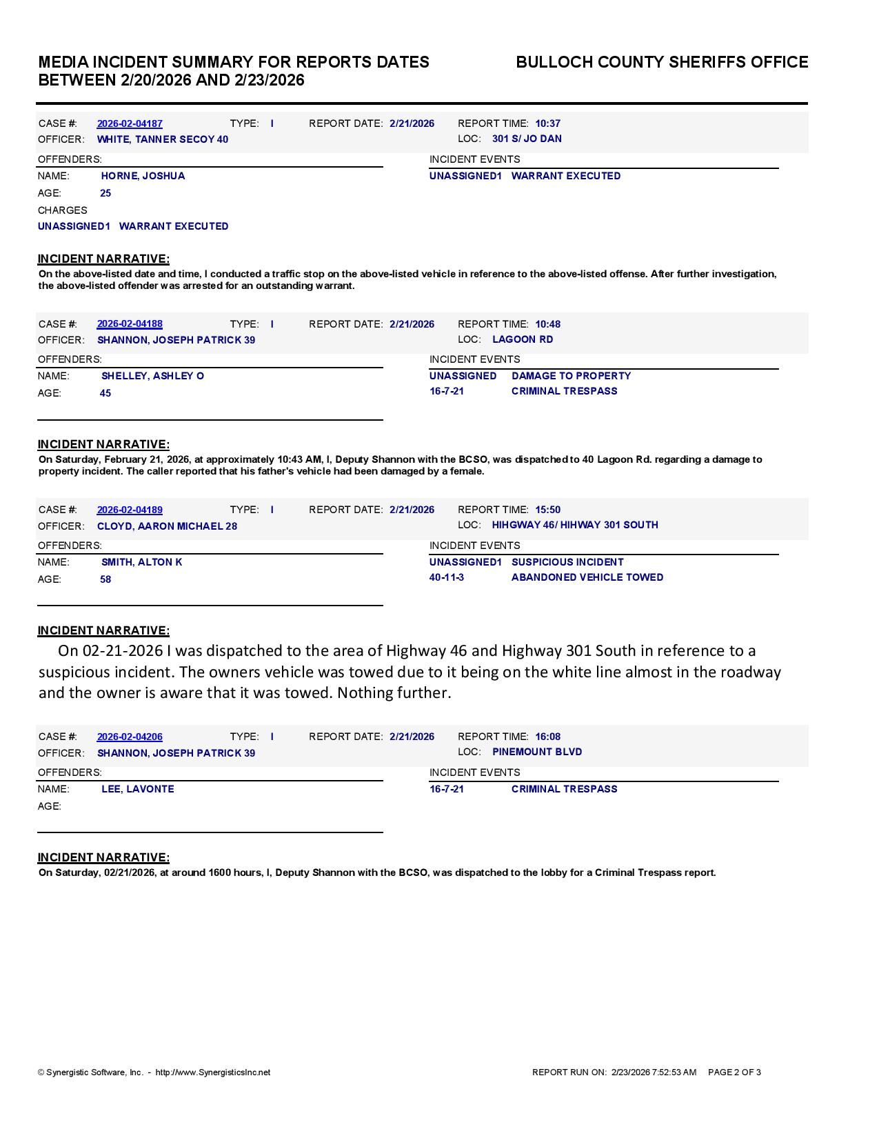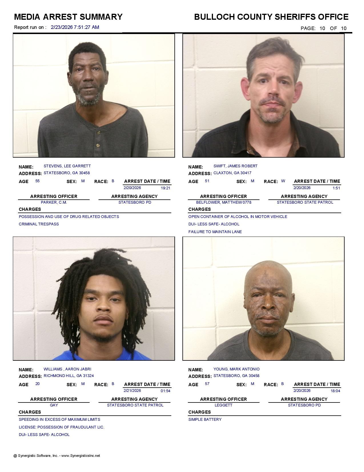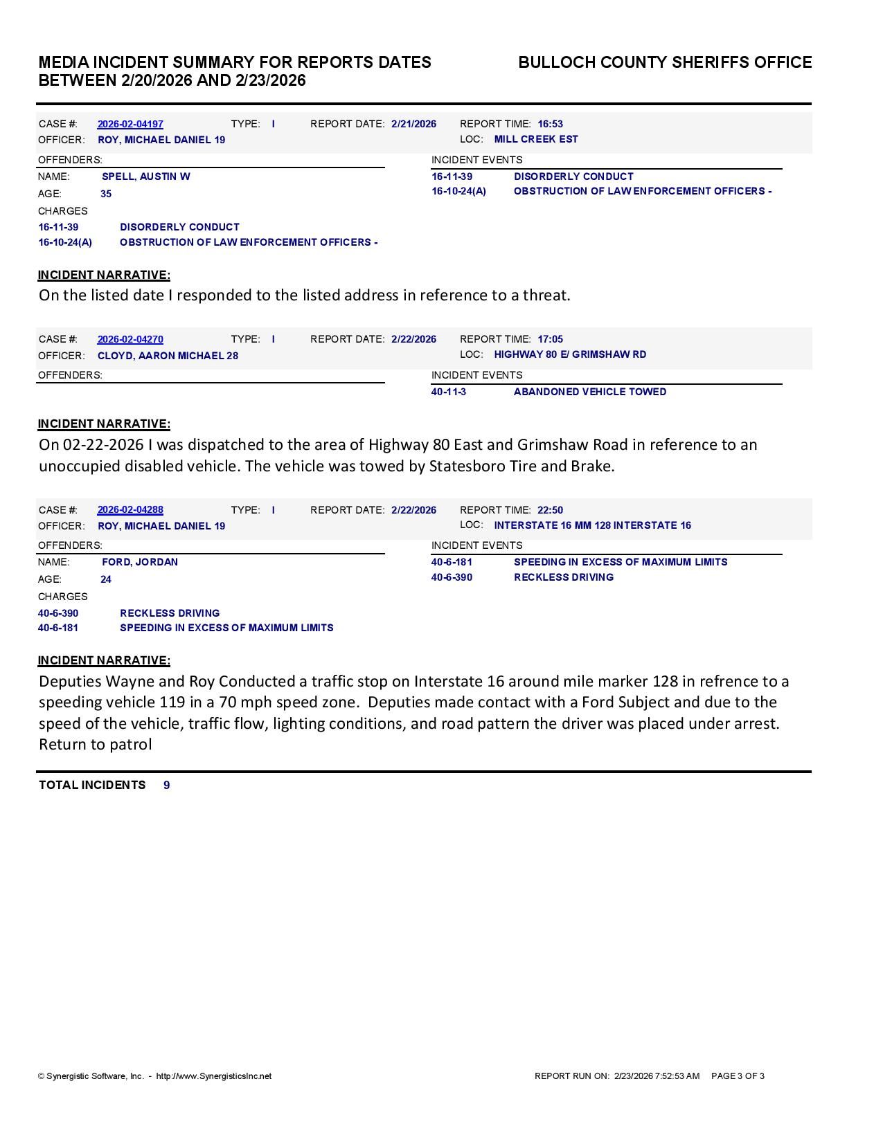 The Bulloch Co Jail Booking & Incident Report 02/23/26 details arrests from Bulloch Co., Statesboro, Brooklet, Portal, Register, and the Georgia State Patrol. Incident reports are from the Sheriff’s Office only.