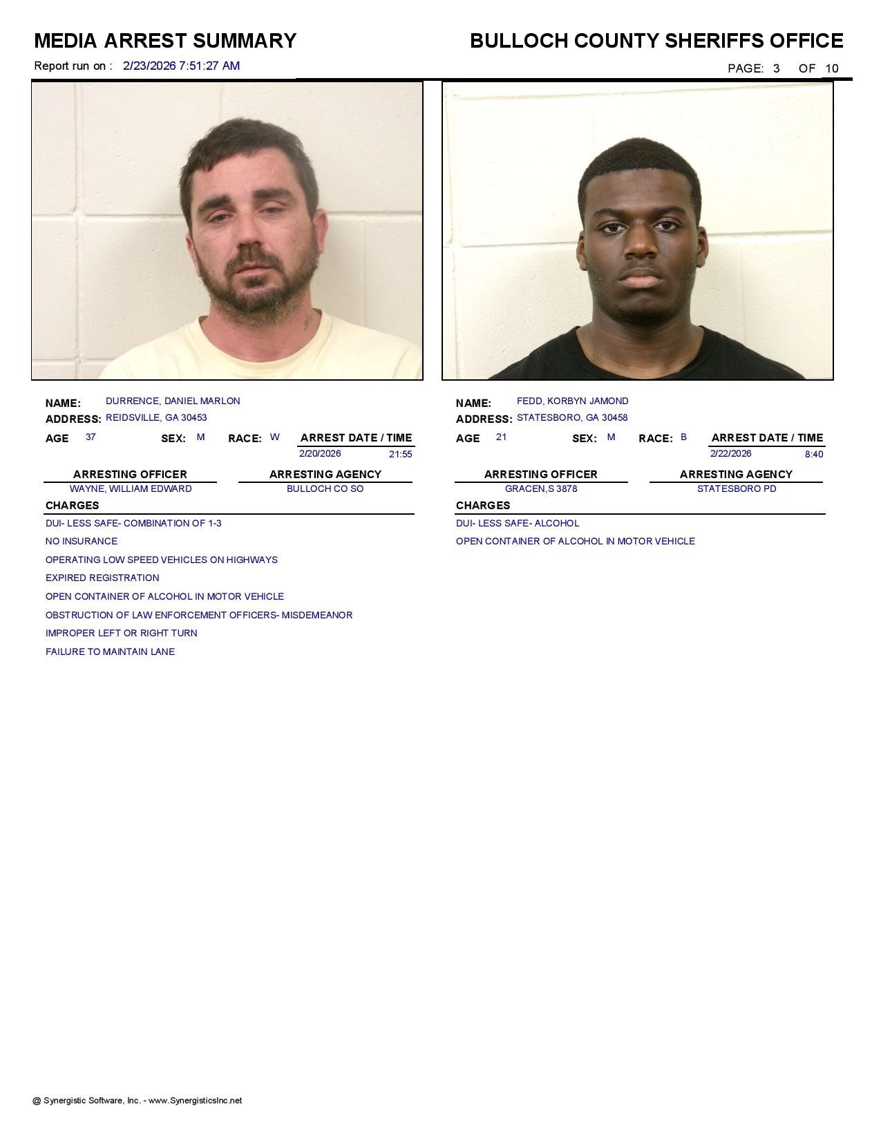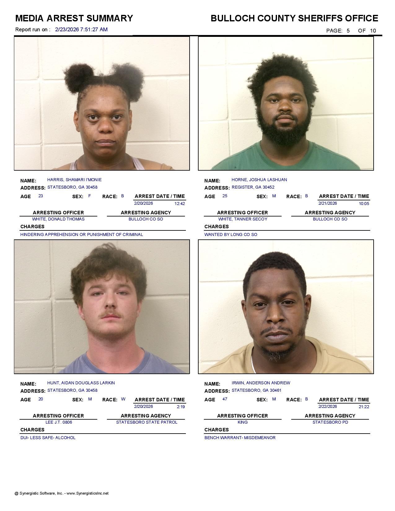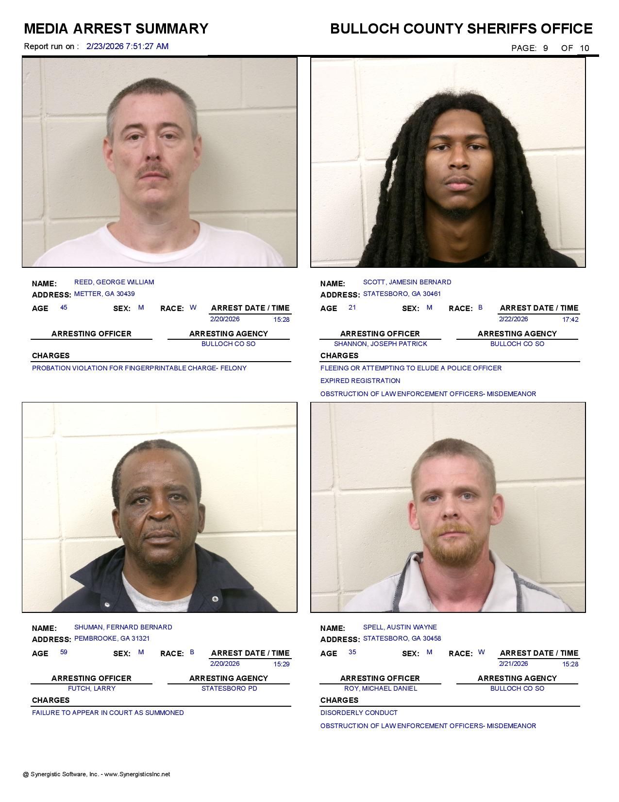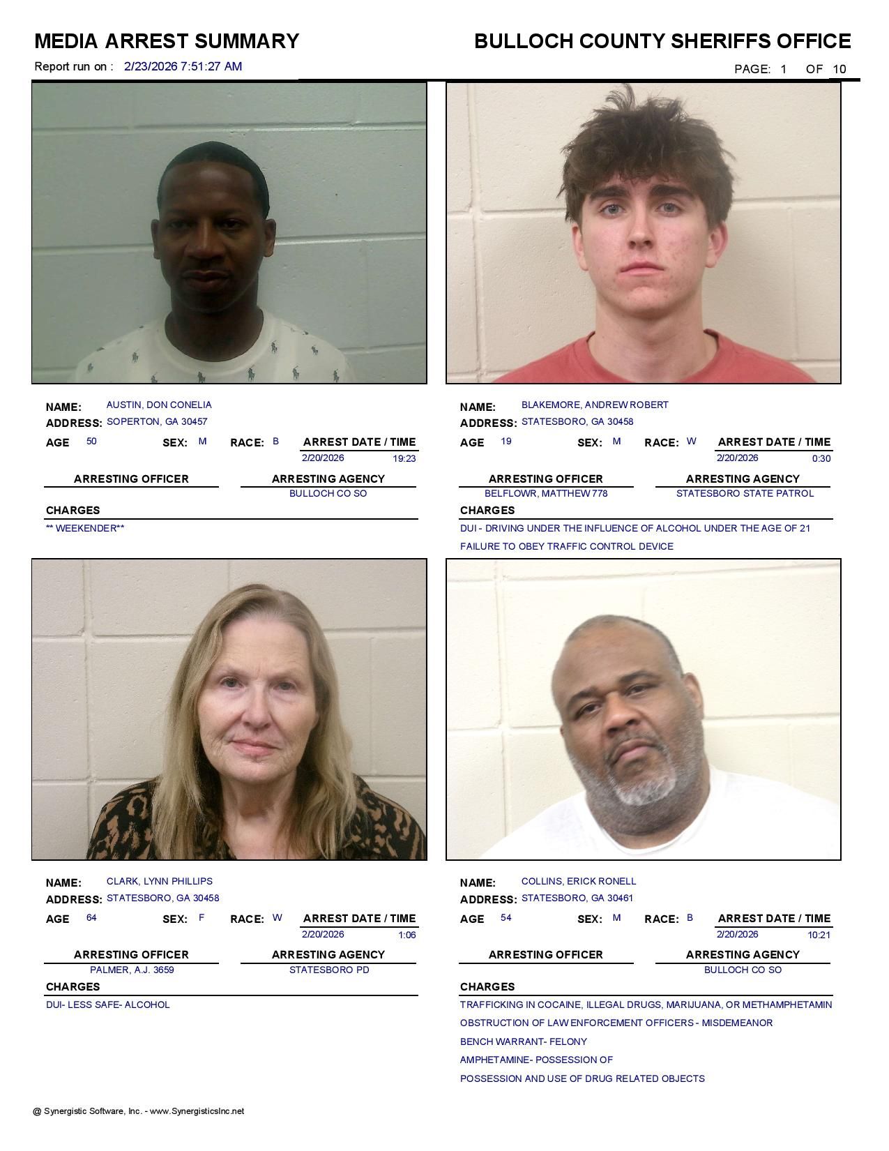 The Bulloch Co Jail Booking & Incident Report 02/23/26 details arrests from Bulloch Co., Statesboro, Brooklet, Portal, Register, and the Georgia State Patrol. Incident reports are from the Sheriff’s Office only.