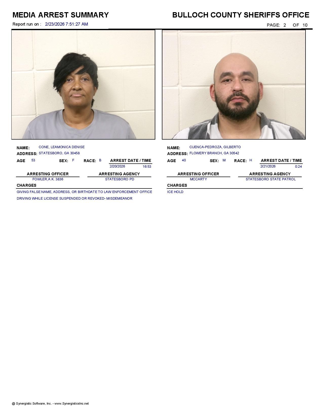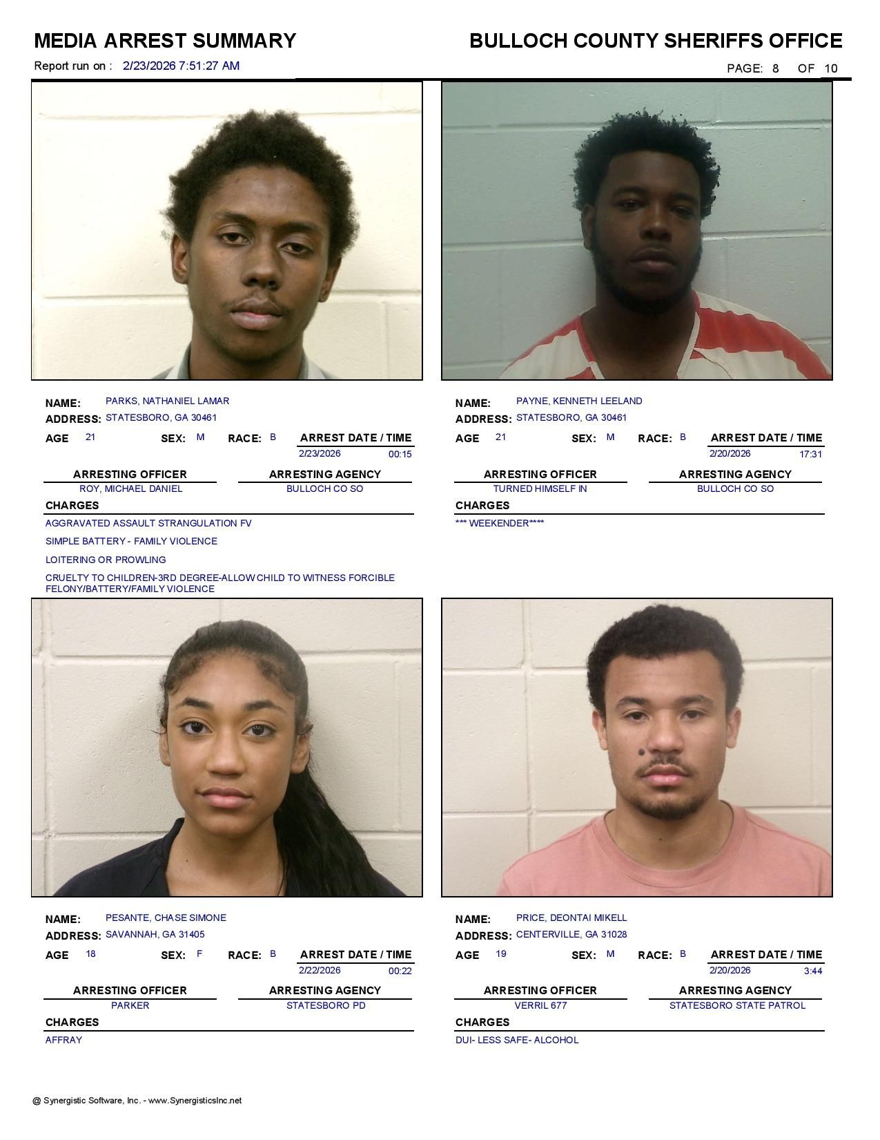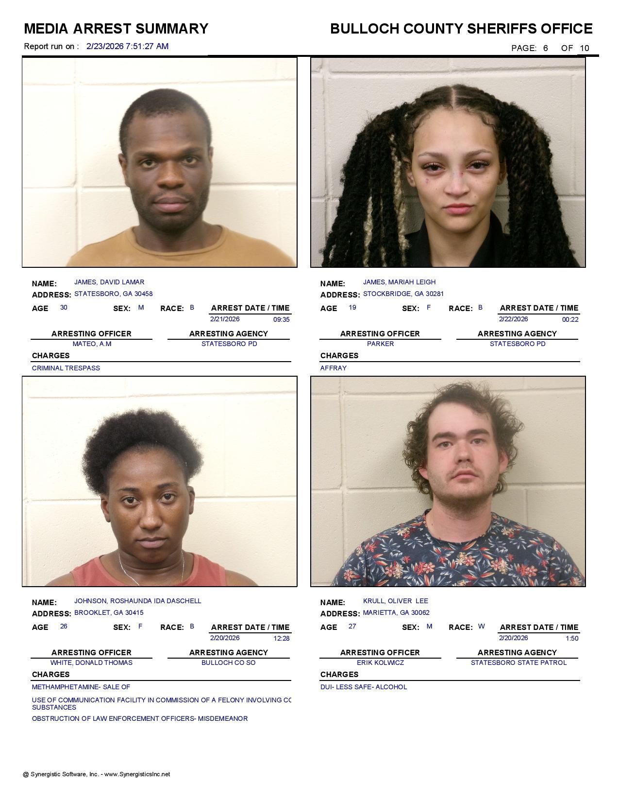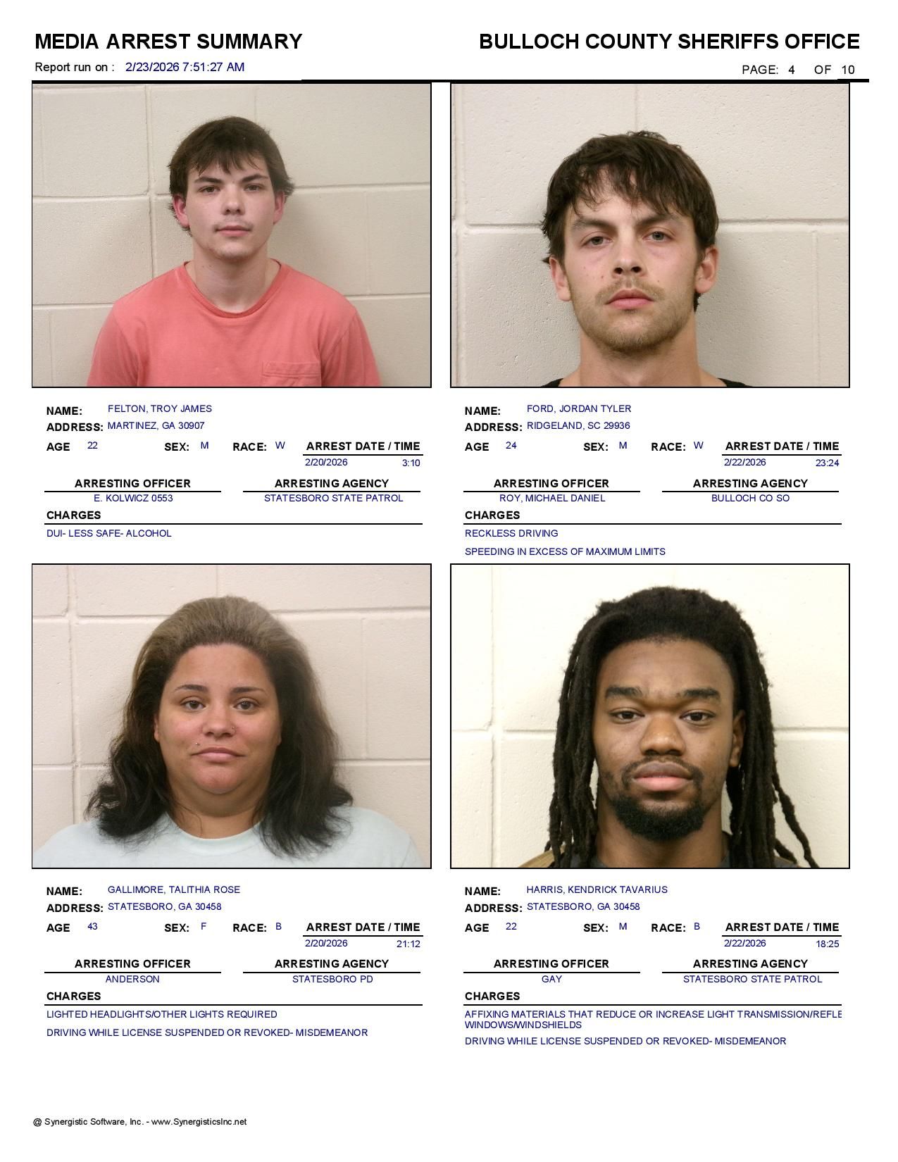 The Bulloch Co Jail Booking & Incident Report 02/23/26 details arrests from Bulloch Co., Statesboro, Brooklet, Portal, Register, and the Georgia State Patrol. Incident reports are from the Sheriff’s Office only.