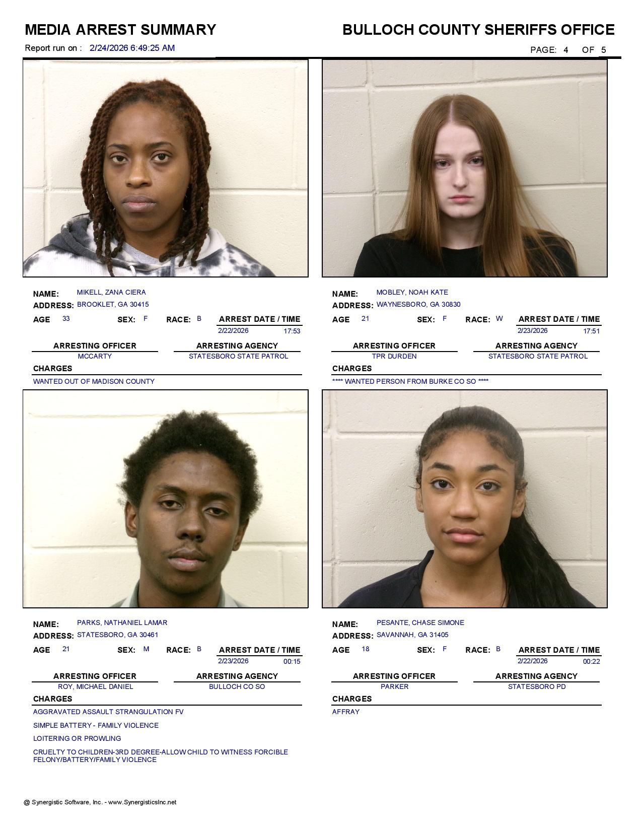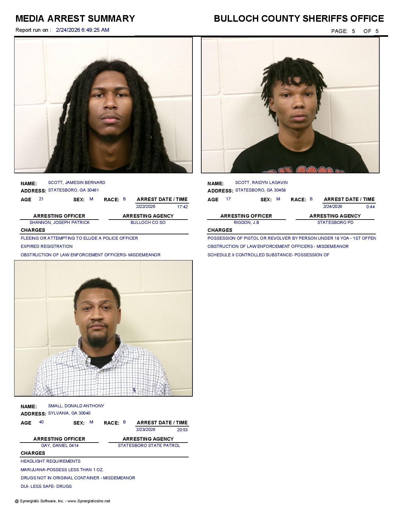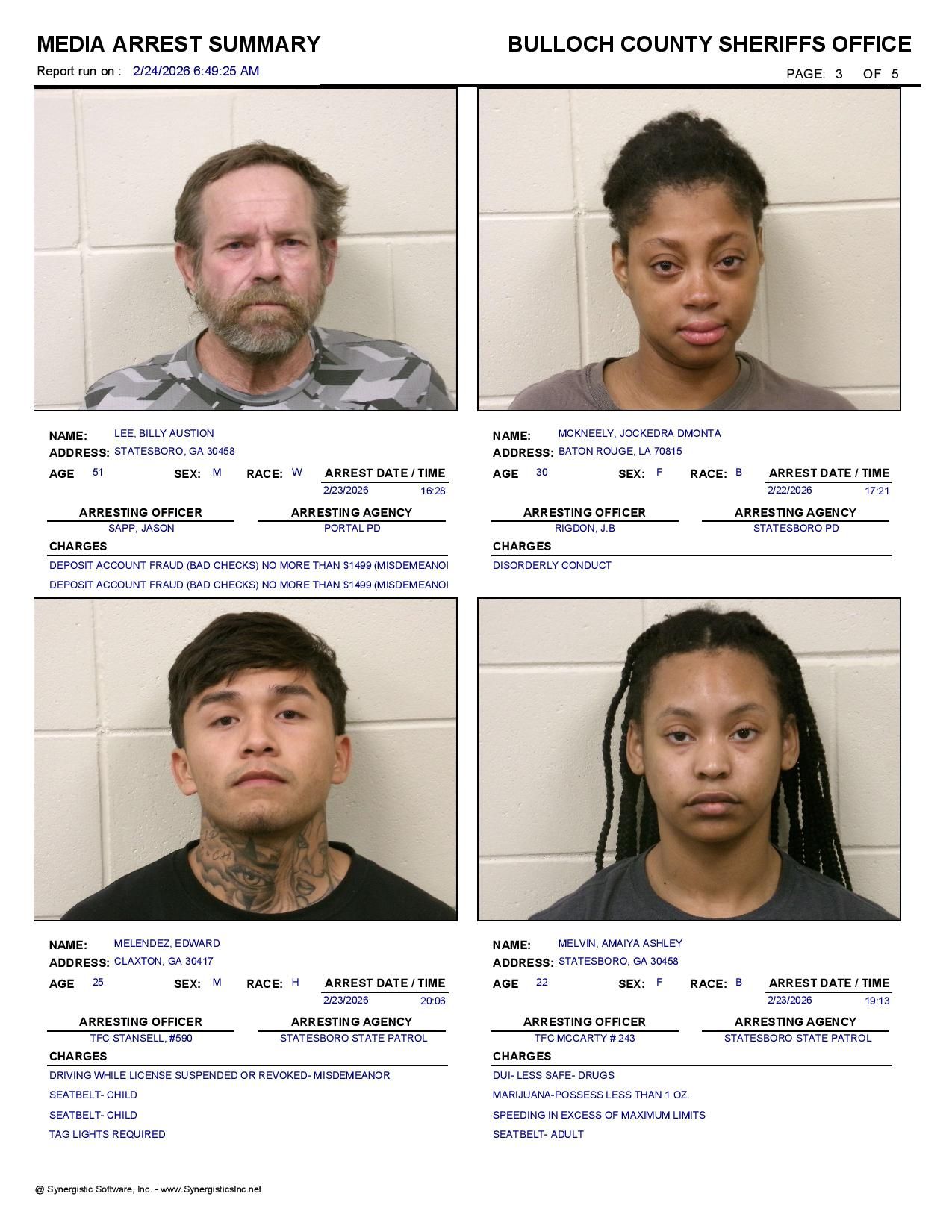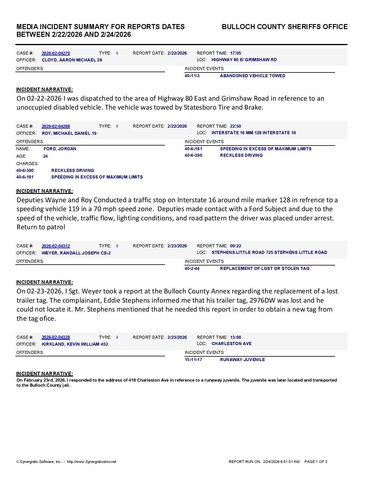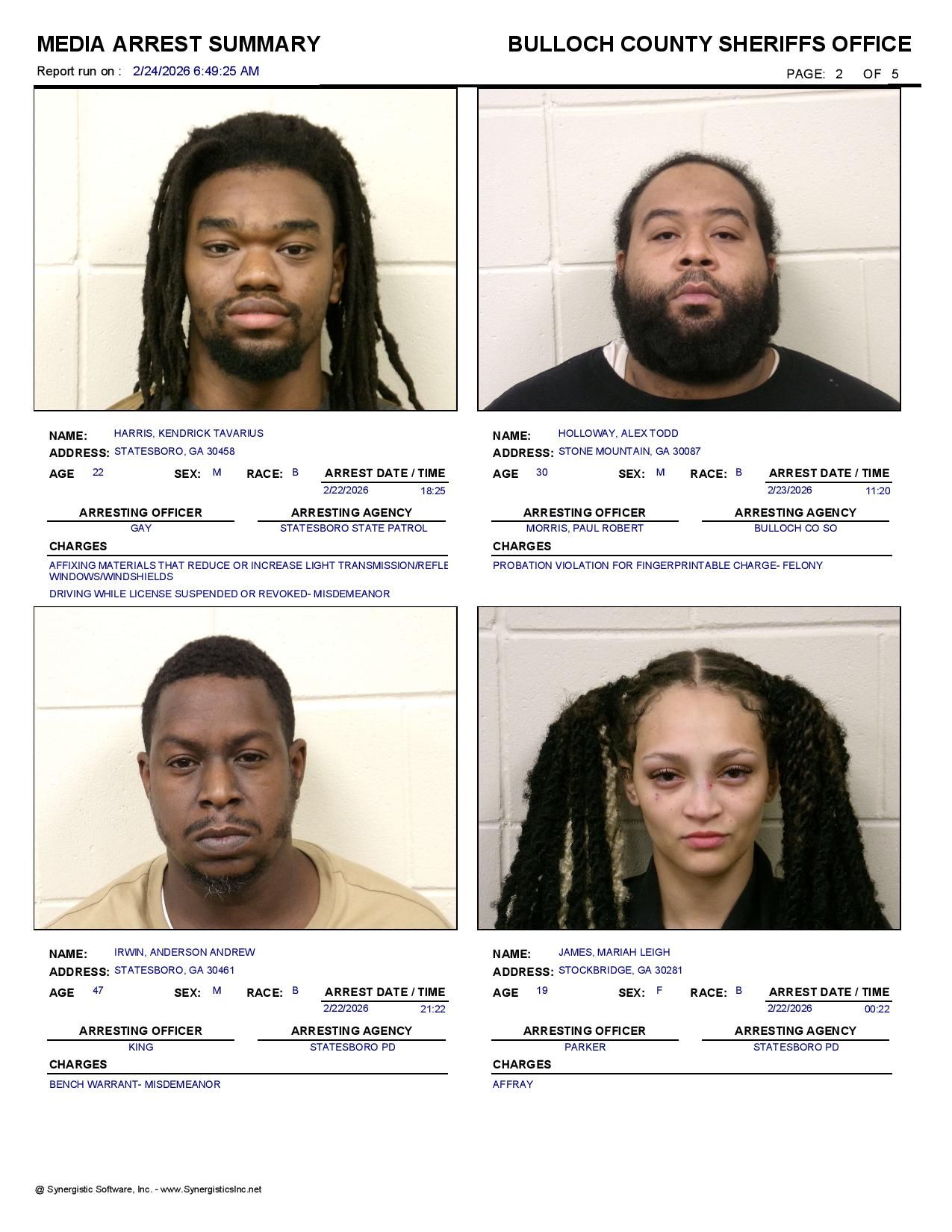 The Bulloch Co Jail Booking & Incident Report 02/24/26 details arrests from Bulloch Co., Statesboro, Brooklet, Portal, Register, and the Georgia State Patrol. Incident reports are from the Sheriff’s Office only.