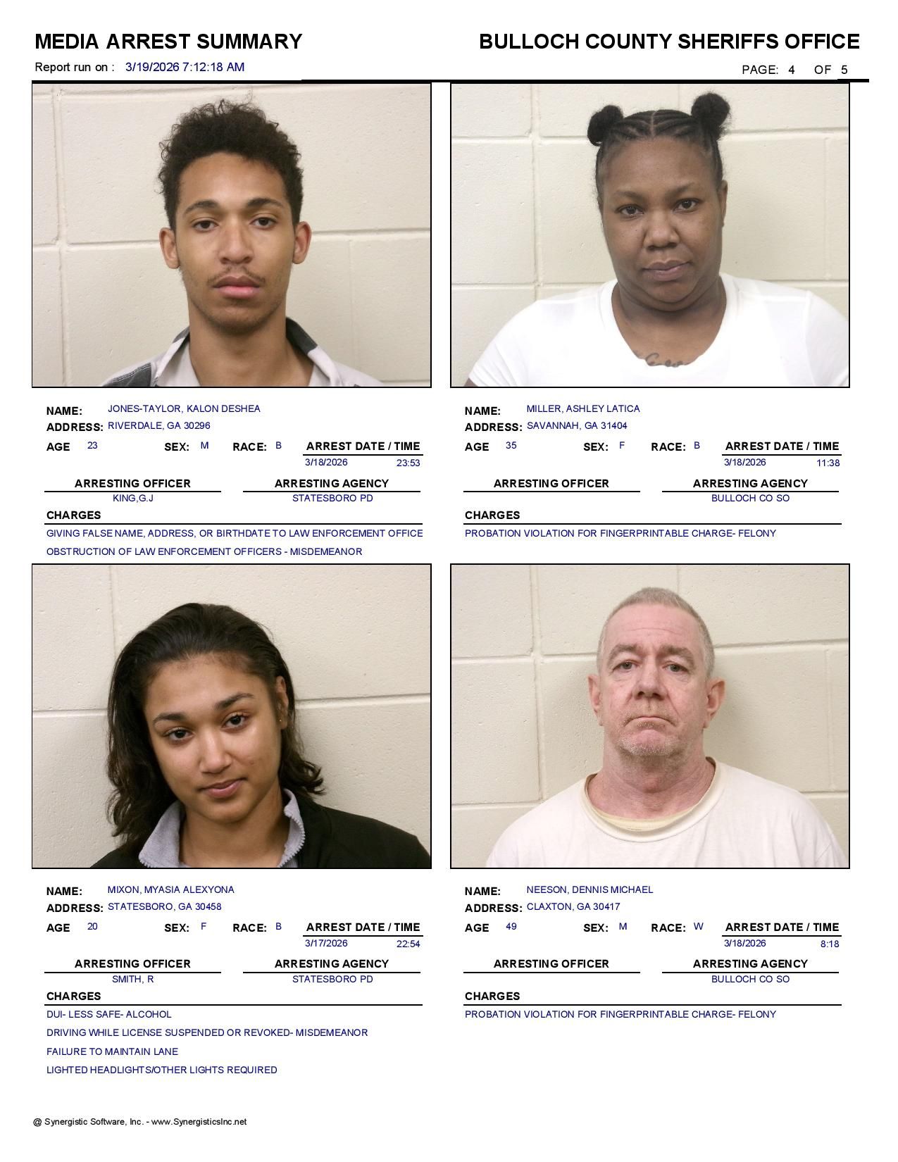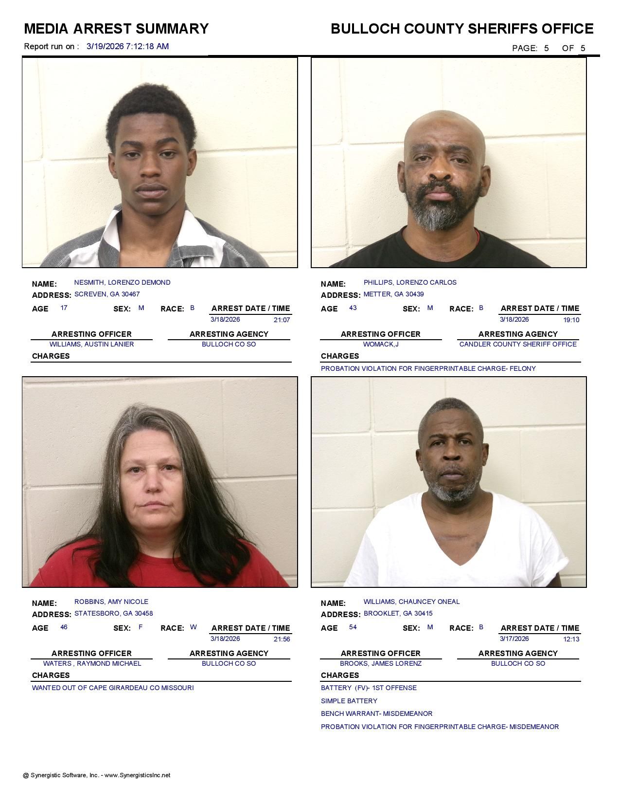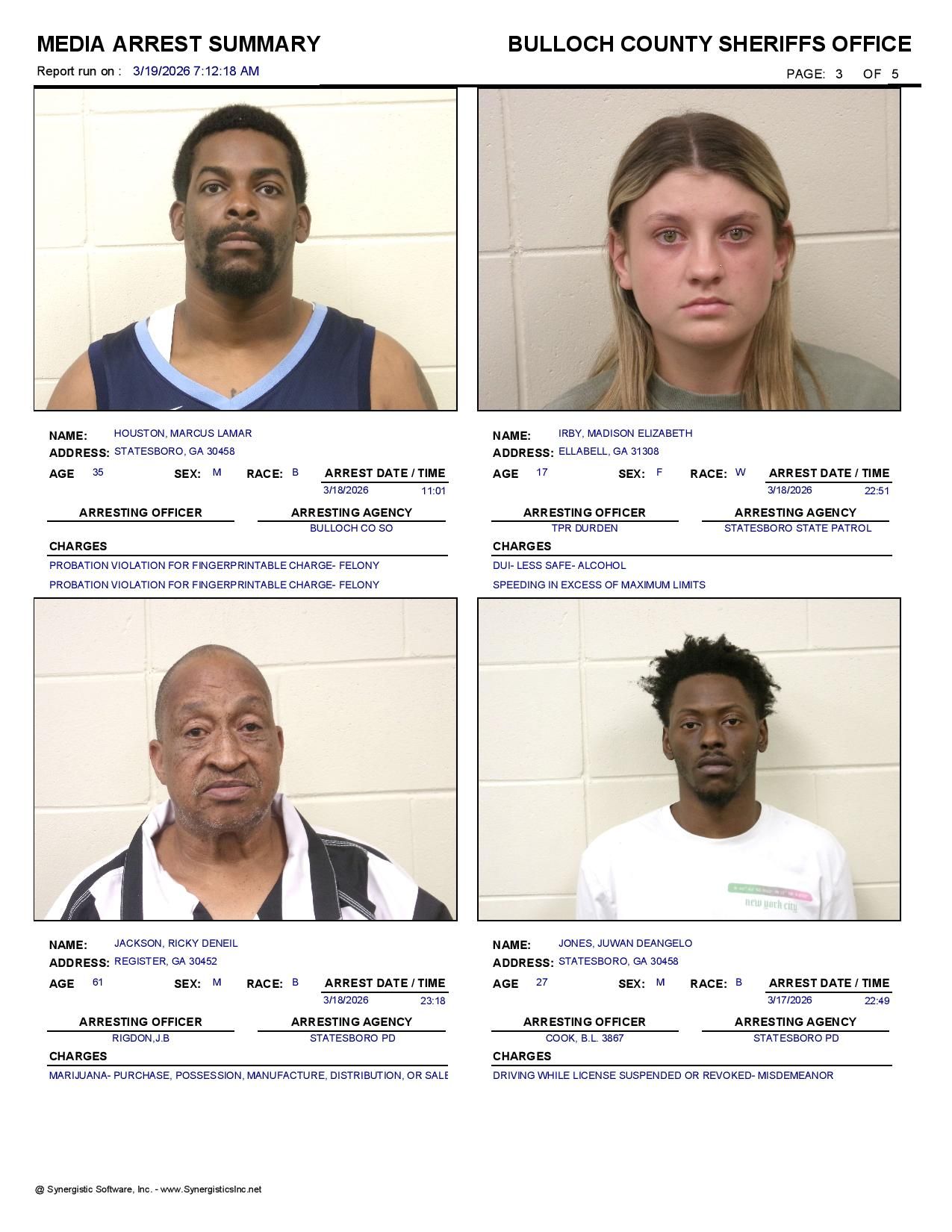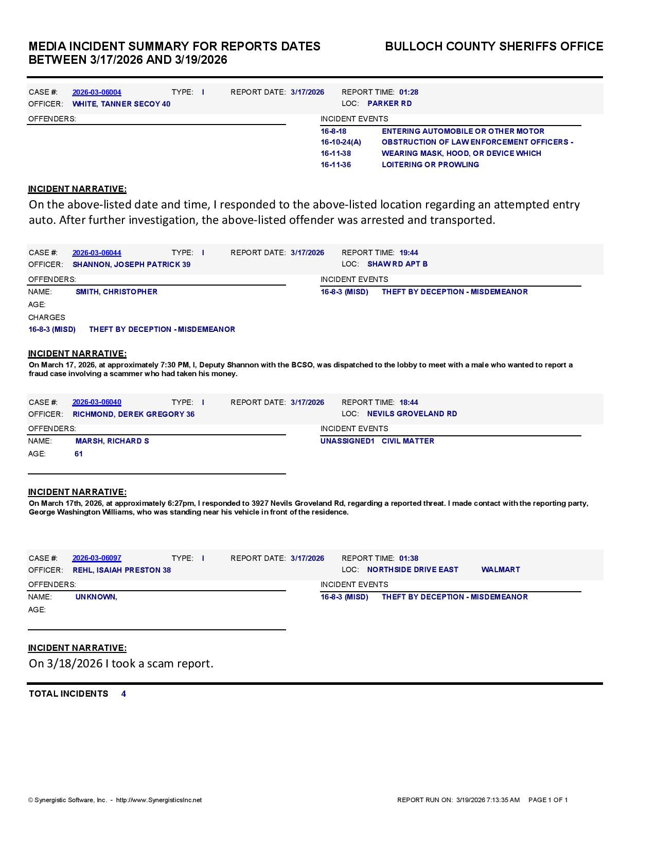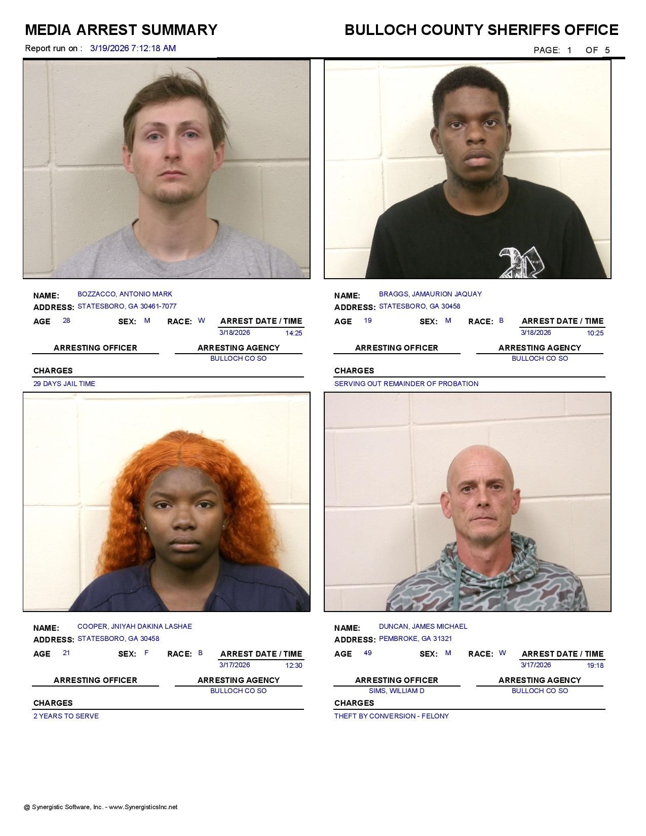 The Bulloch Co Jail Booking & Incident Report 03/19/26 details arrests from Bulloch Co., Statesboro, Brooklet, Portal, Register, and the Georgia State Patrol. Incident reports are from the Sheriff’s Office only.