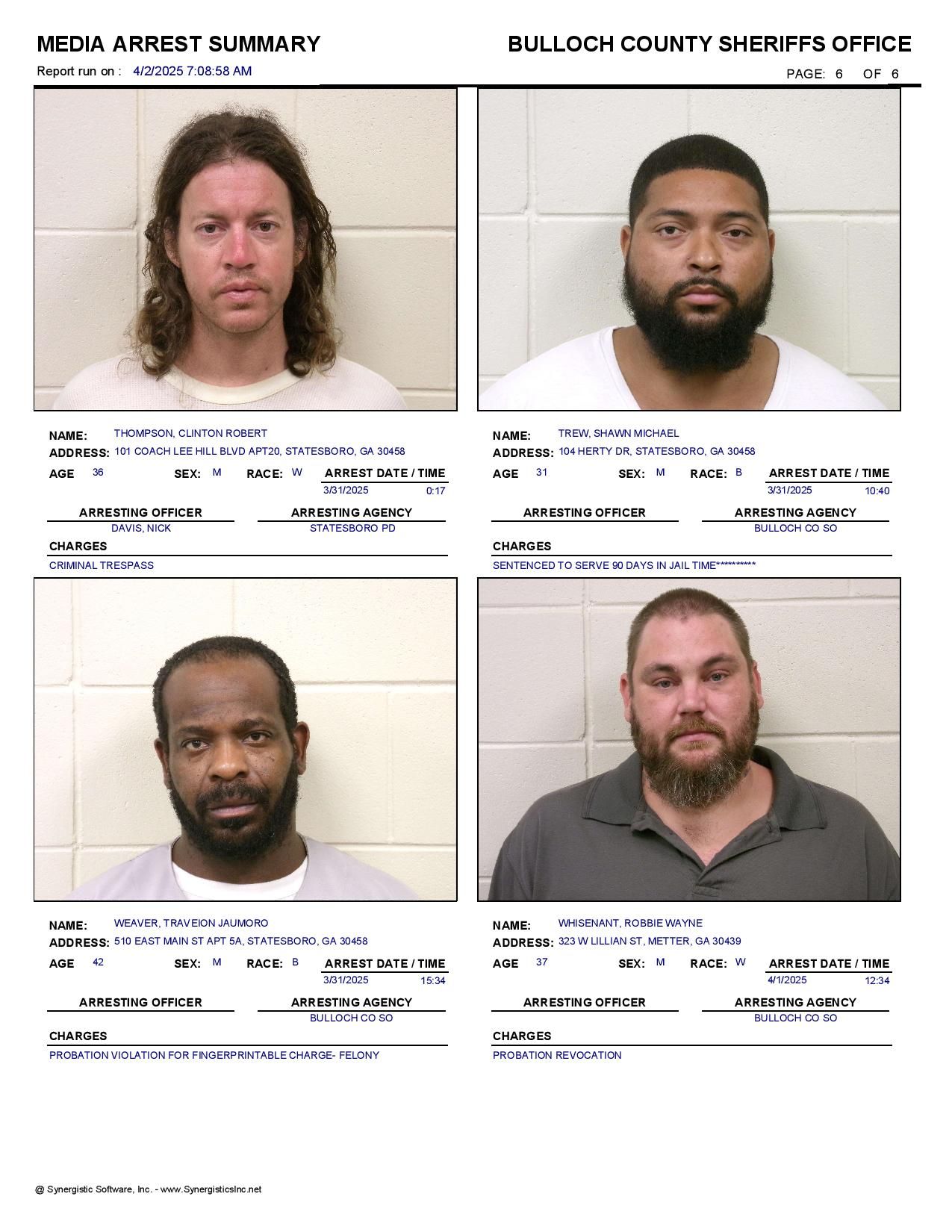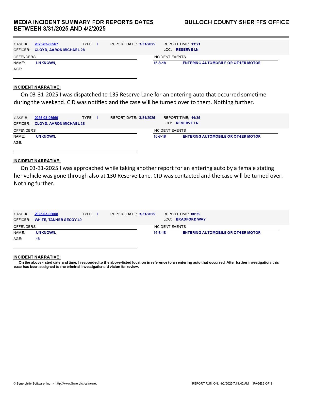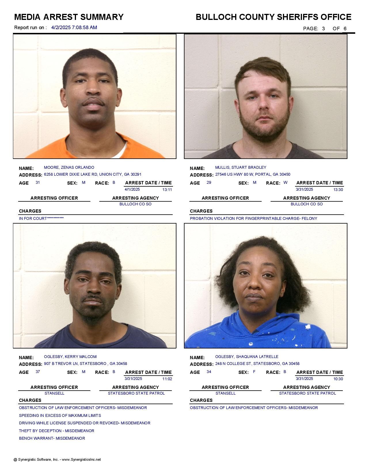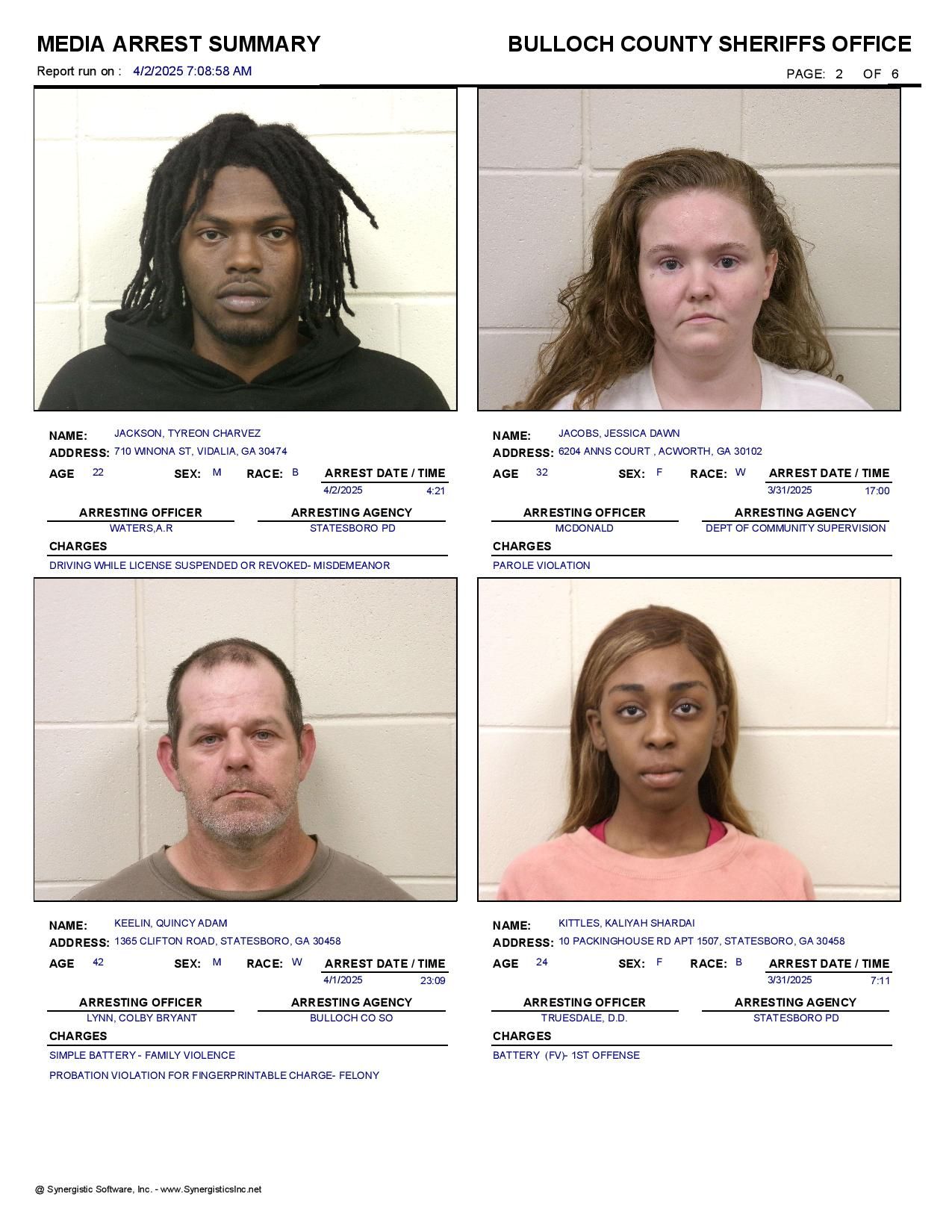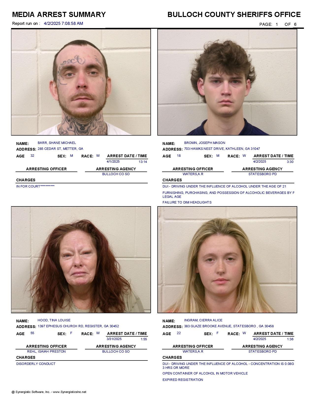The Bulloch Co Jail Booking & Incident Report 04/02/25 details arrests from Bulloch Co., Statesboro, Brooklet, Portal, Register, and the Georgia State Patrol. Incident reports are from the Sheriff’s Office only.