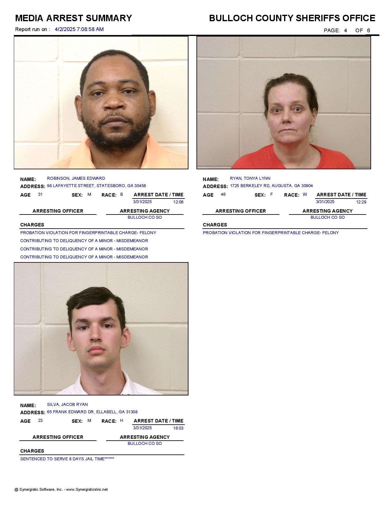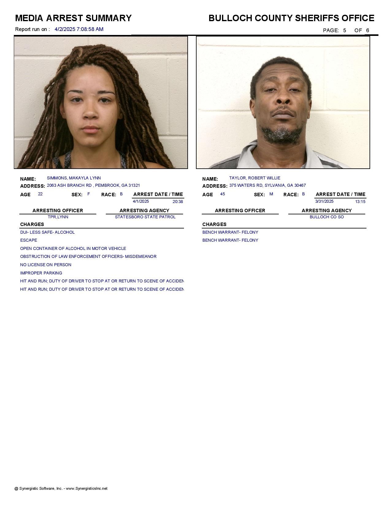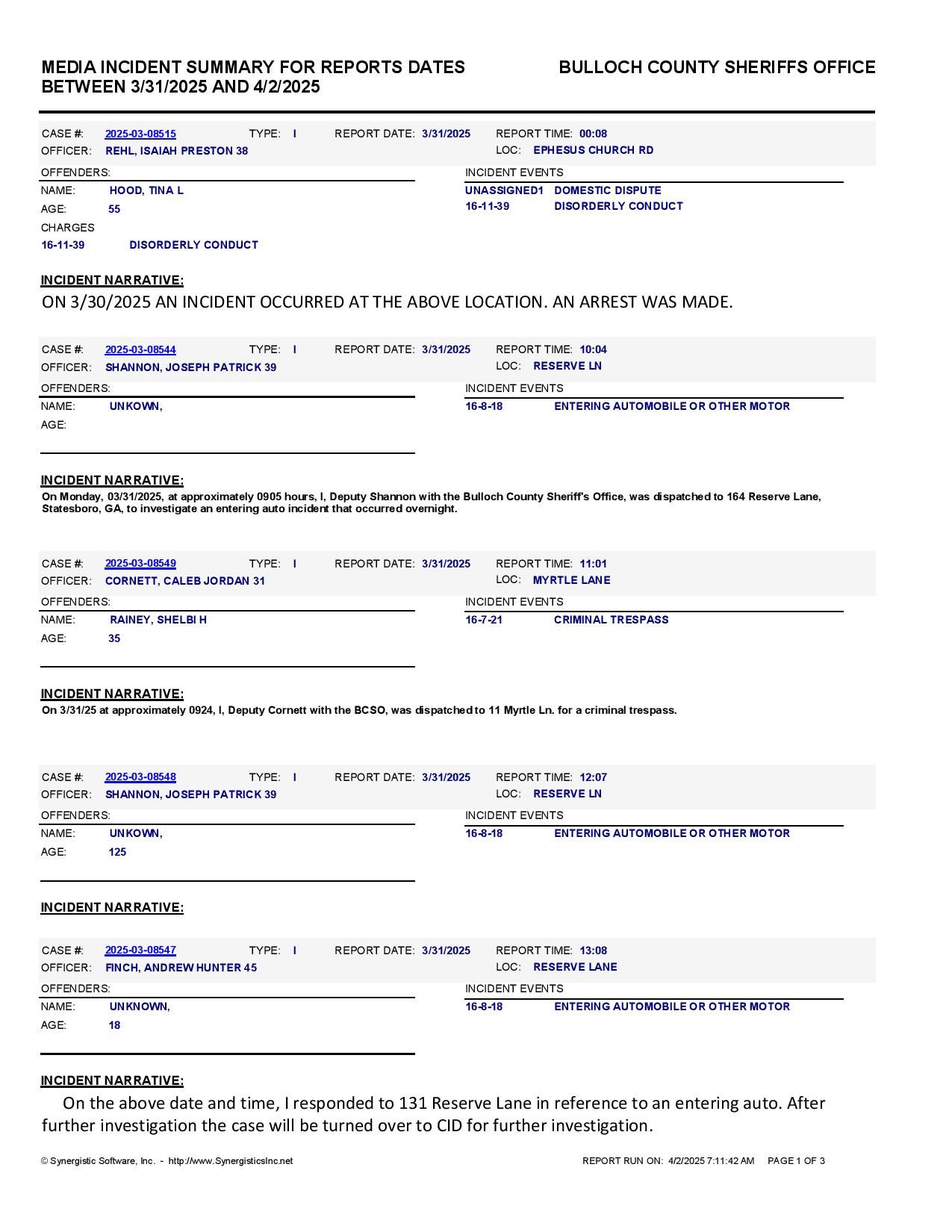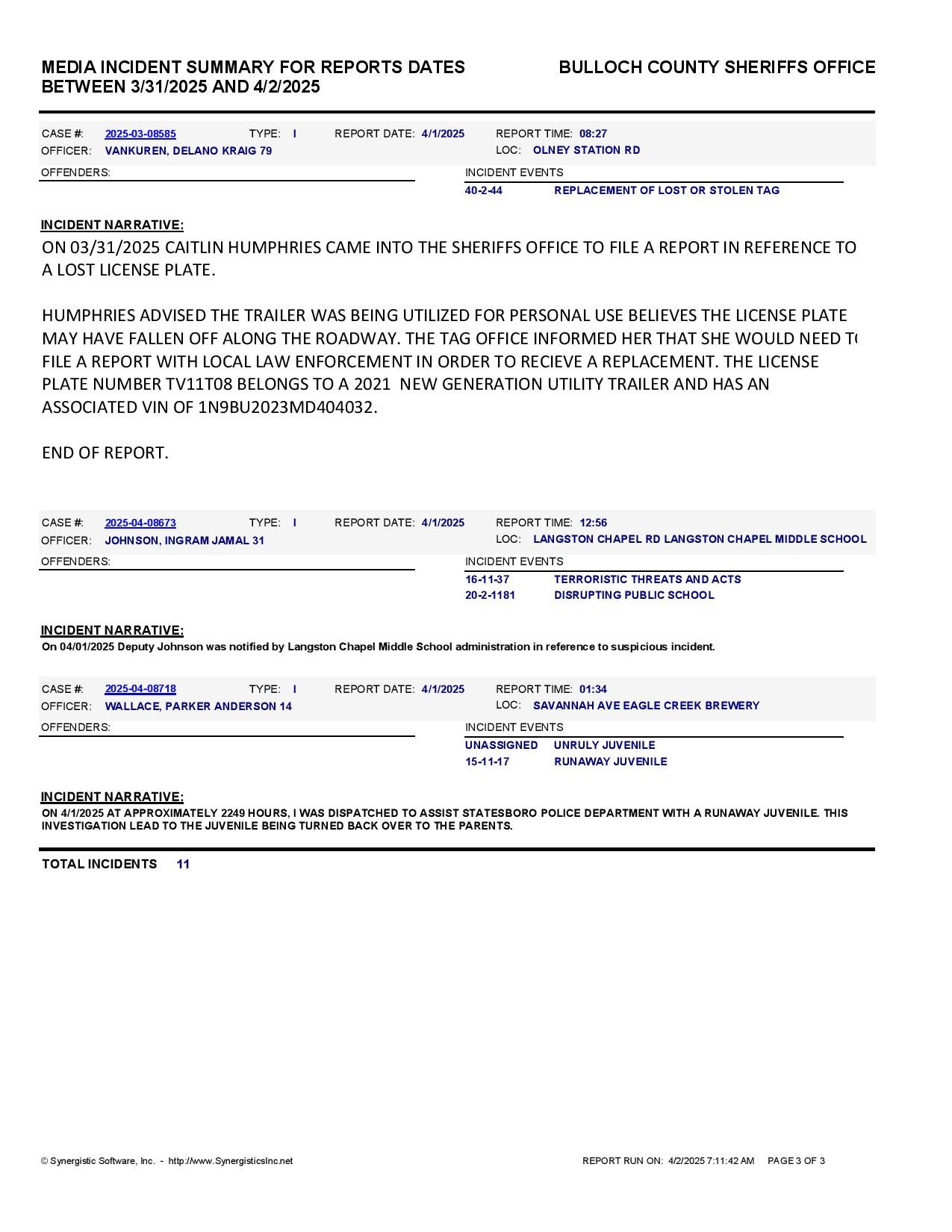 Bulloch Co. Jail Booking & Incident Report – 04/02/25