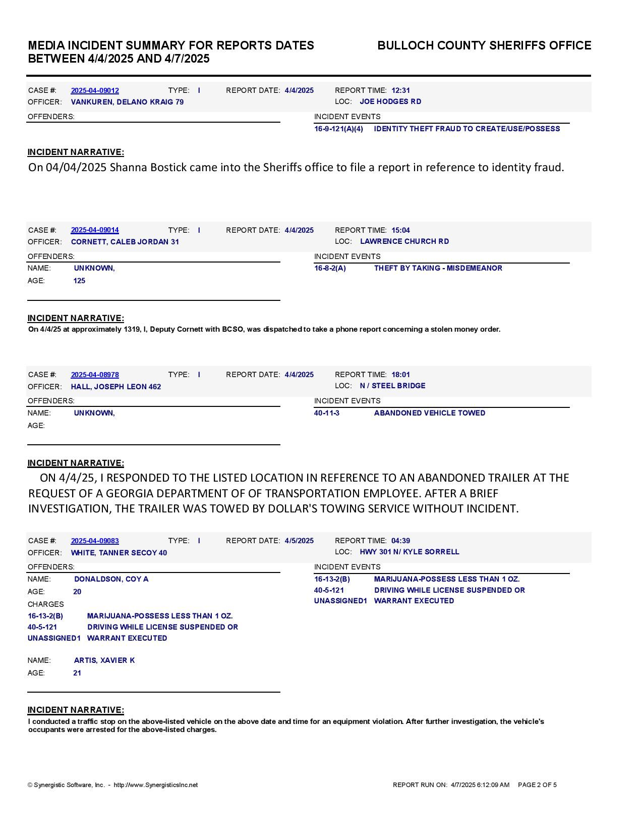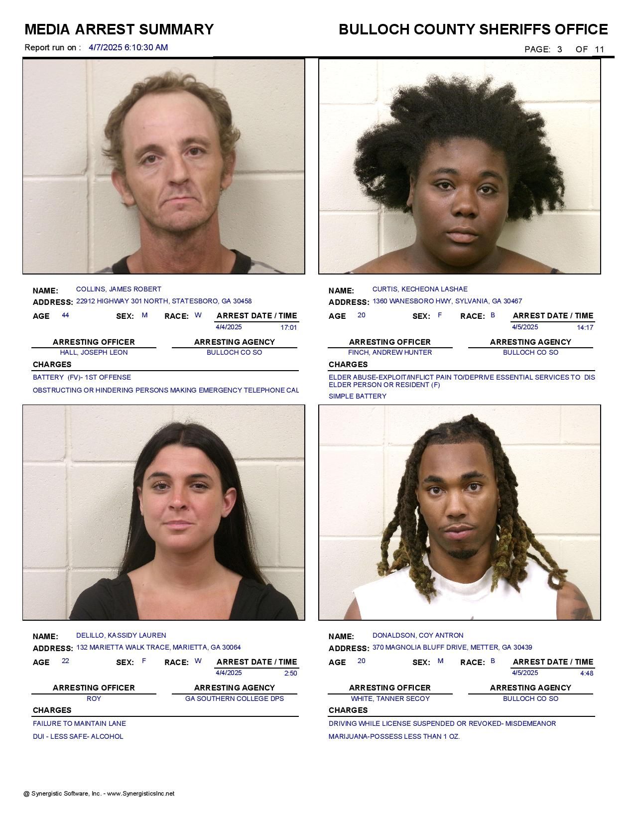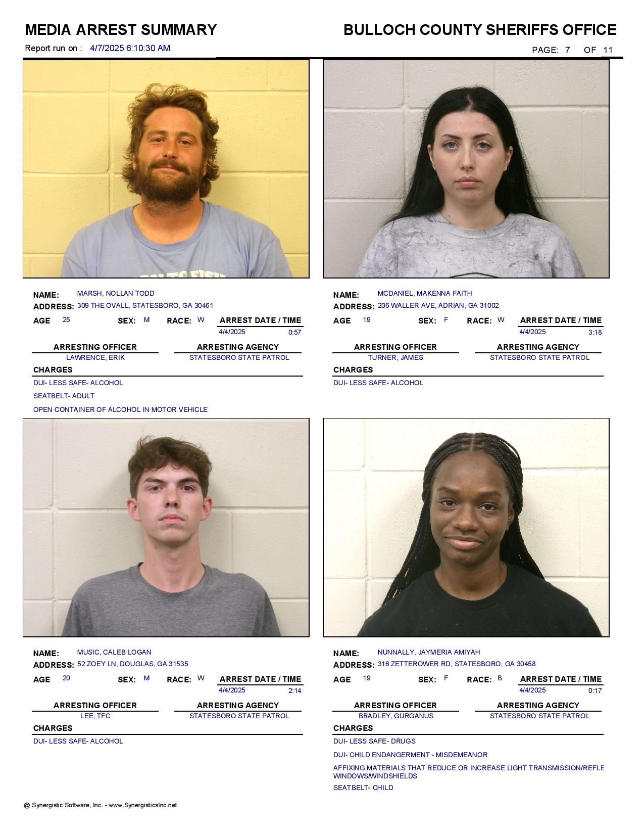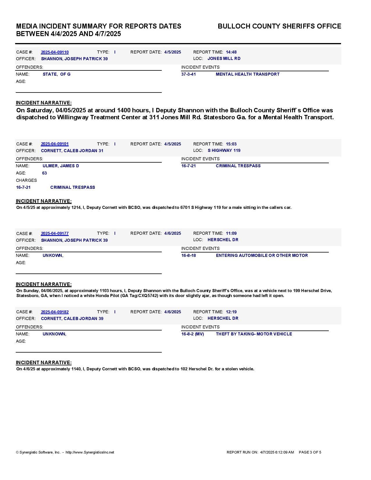 The Bulloch Co Jail Booking & Incident Report 04/07/25 details arrests from Bulloch Co., Statesboro, Brooklet, Portal, Register, and the Georgia State Patrol. Incident reports are from the Sheriff’s Office only.