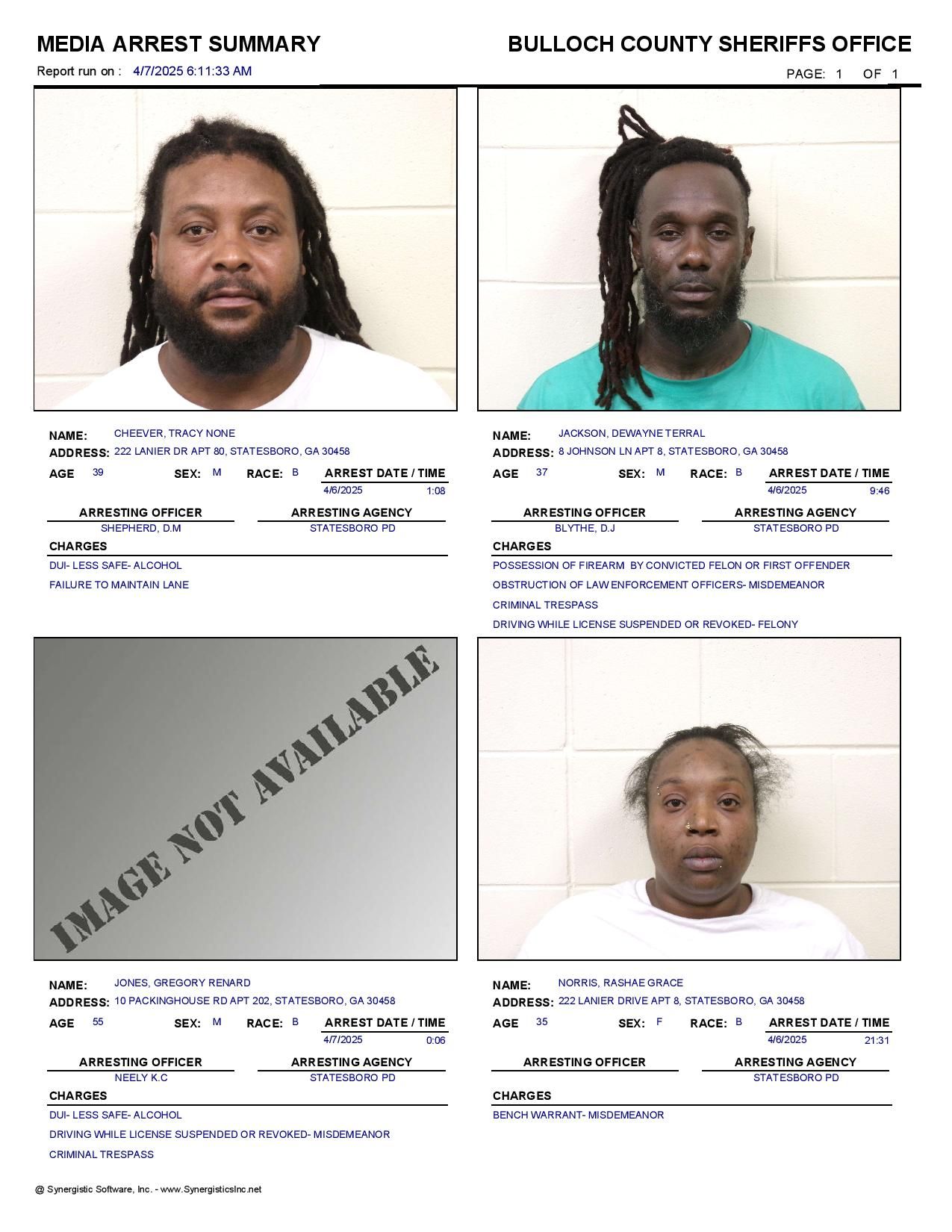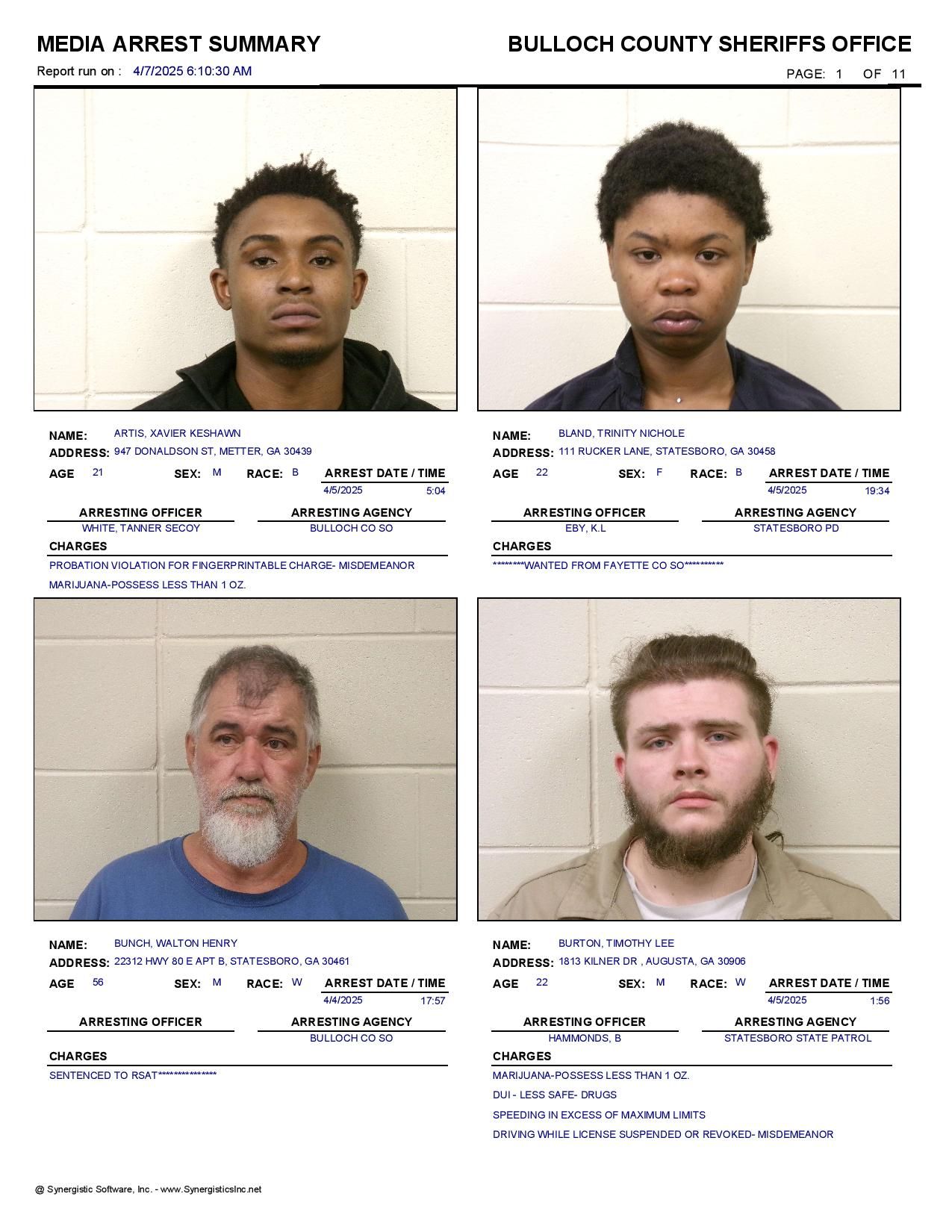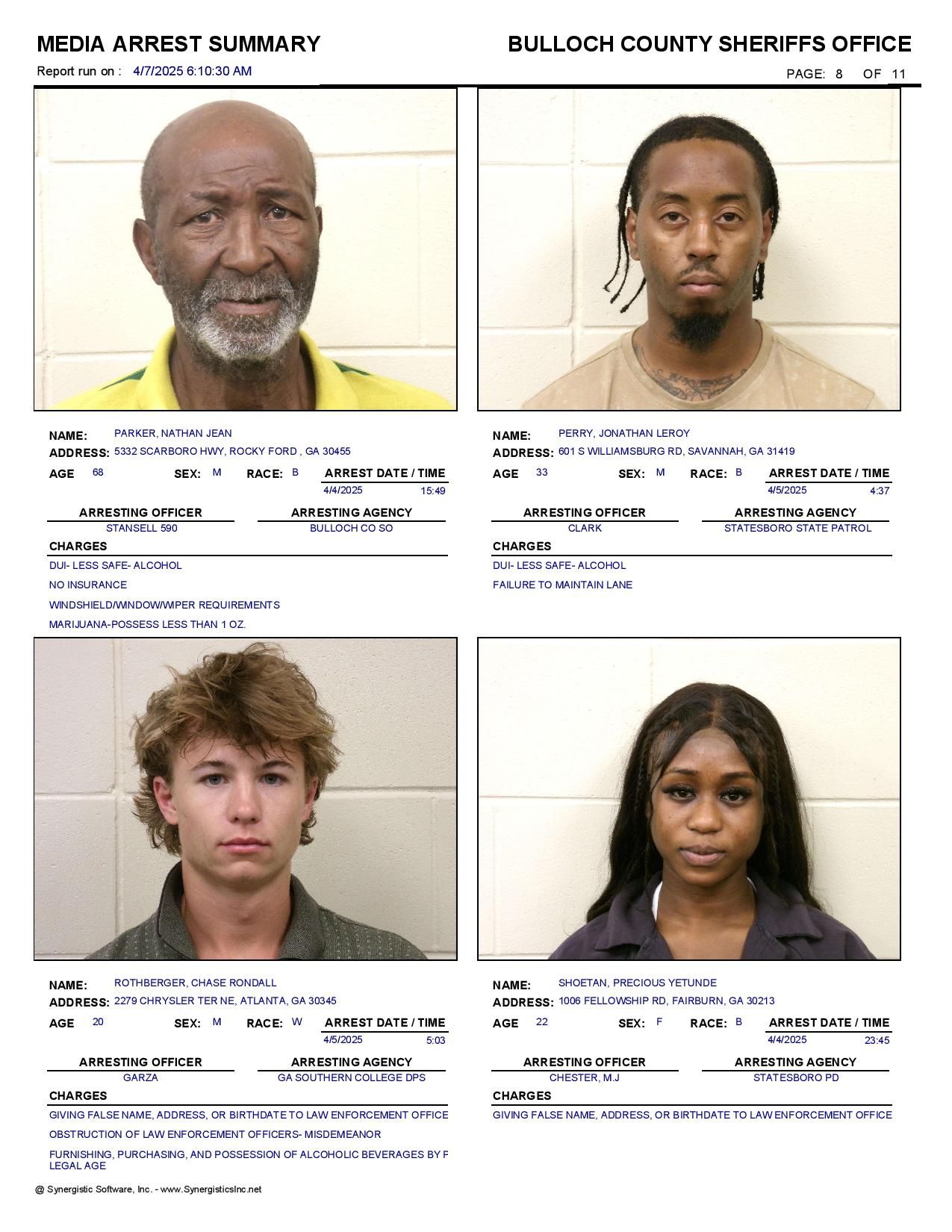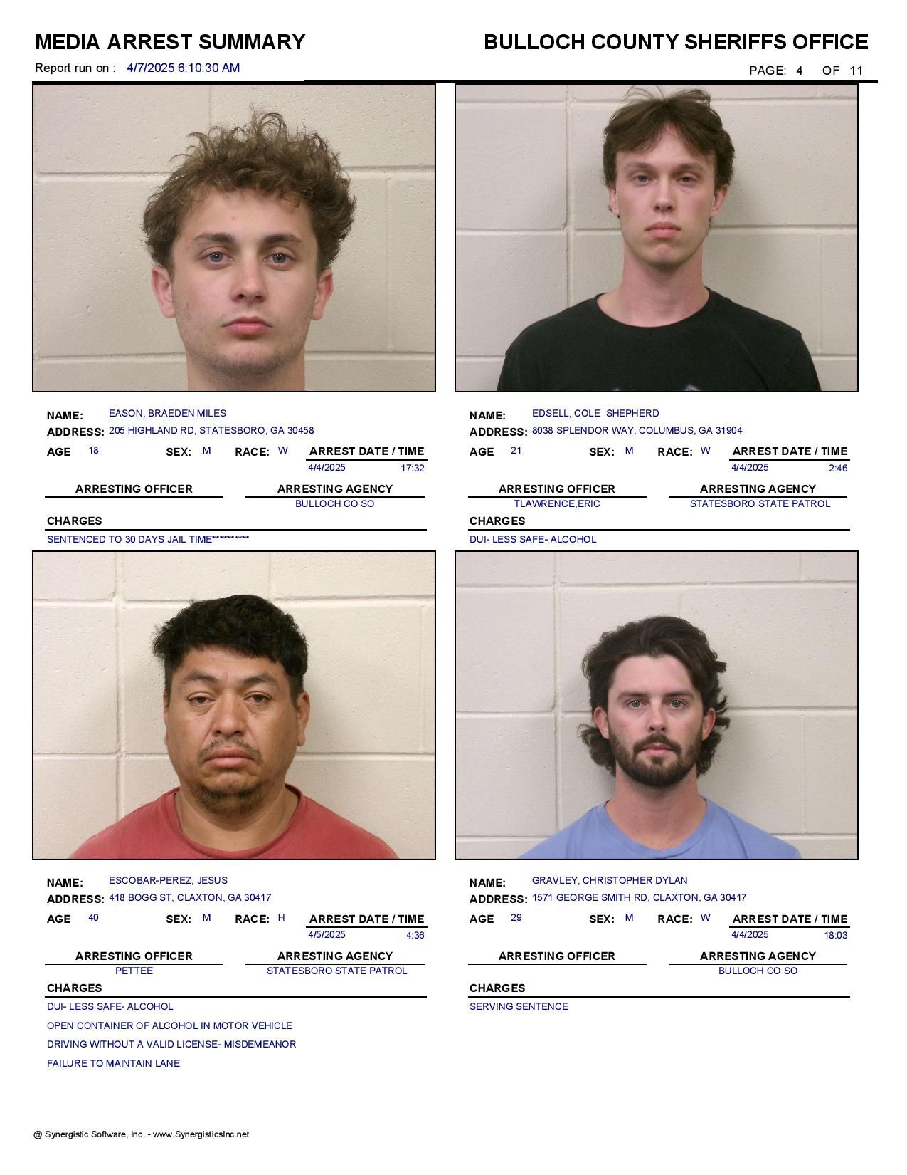 The Bulloch Co Jail Booking & Incident Report 04/07/25 details arrests from Bulloch Co., Statesboro, Brooklet, Portal, Register, and the Georgia State Patrol. Incident reports are from the Sheriff’s Office only.