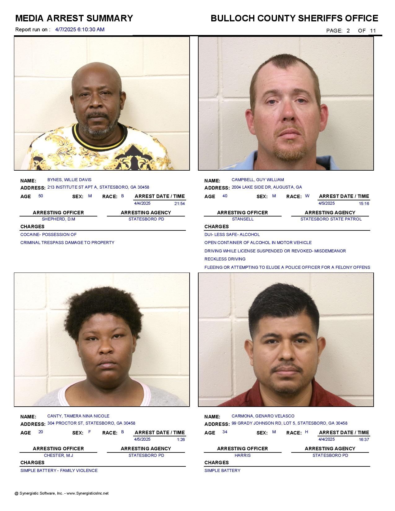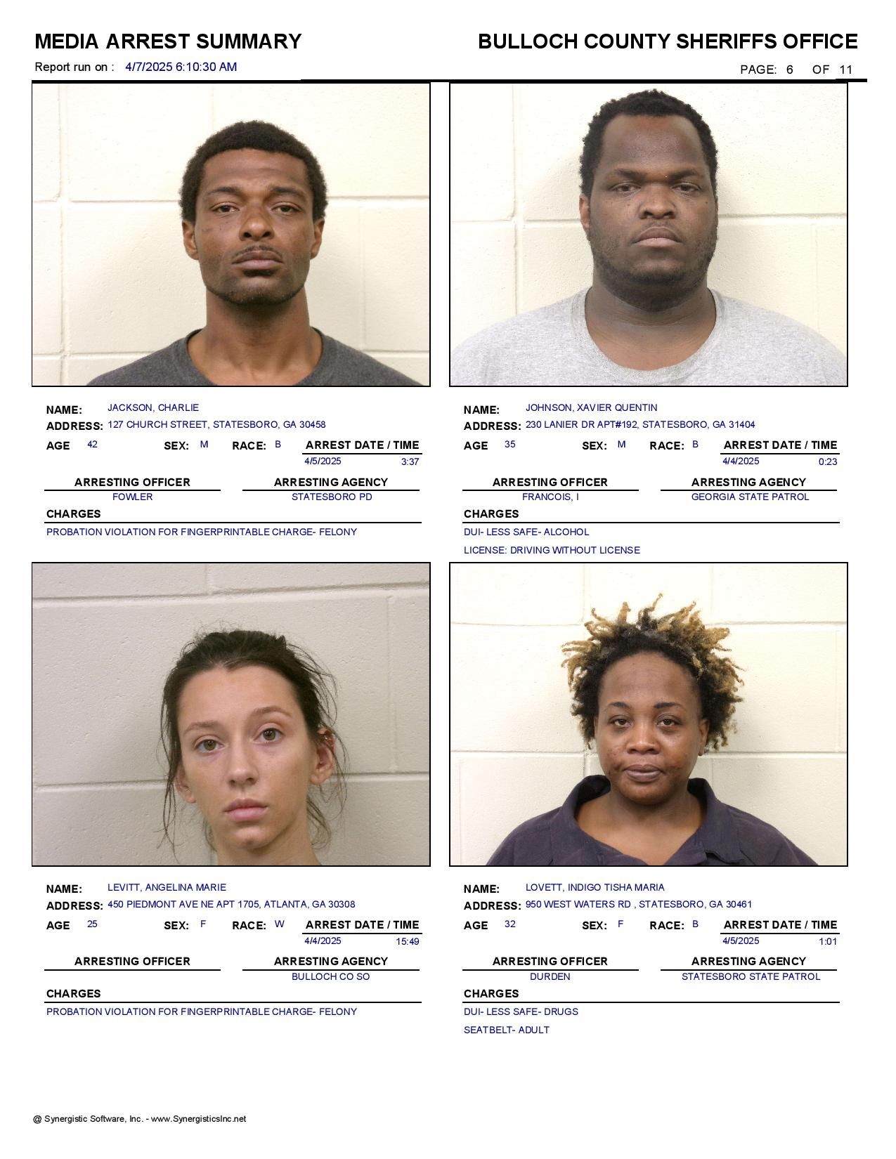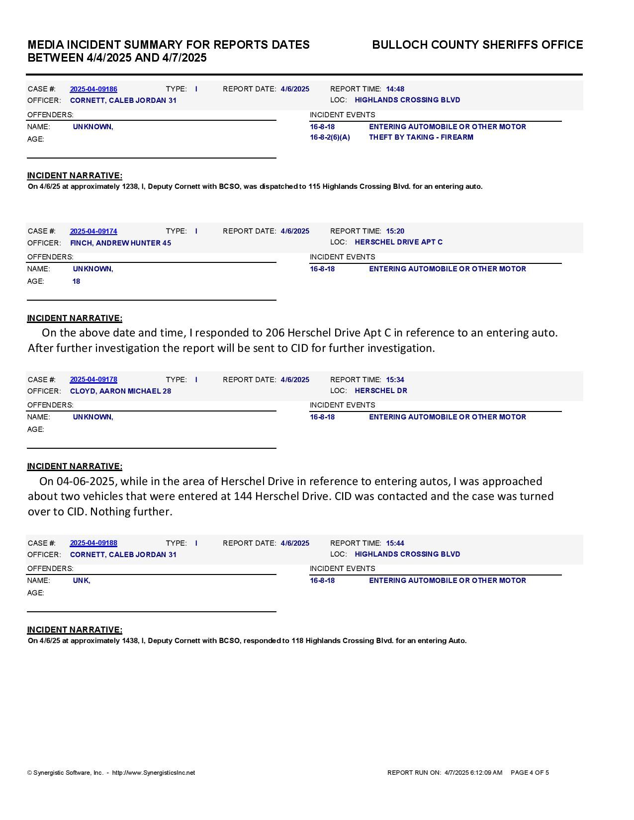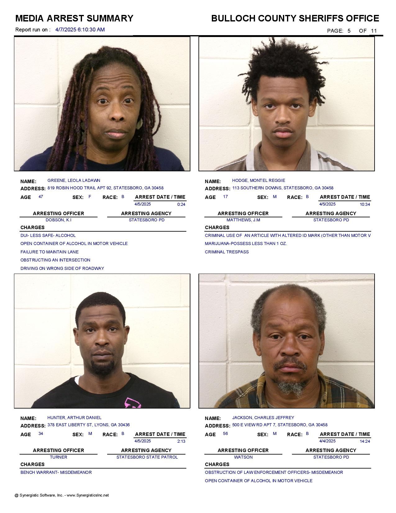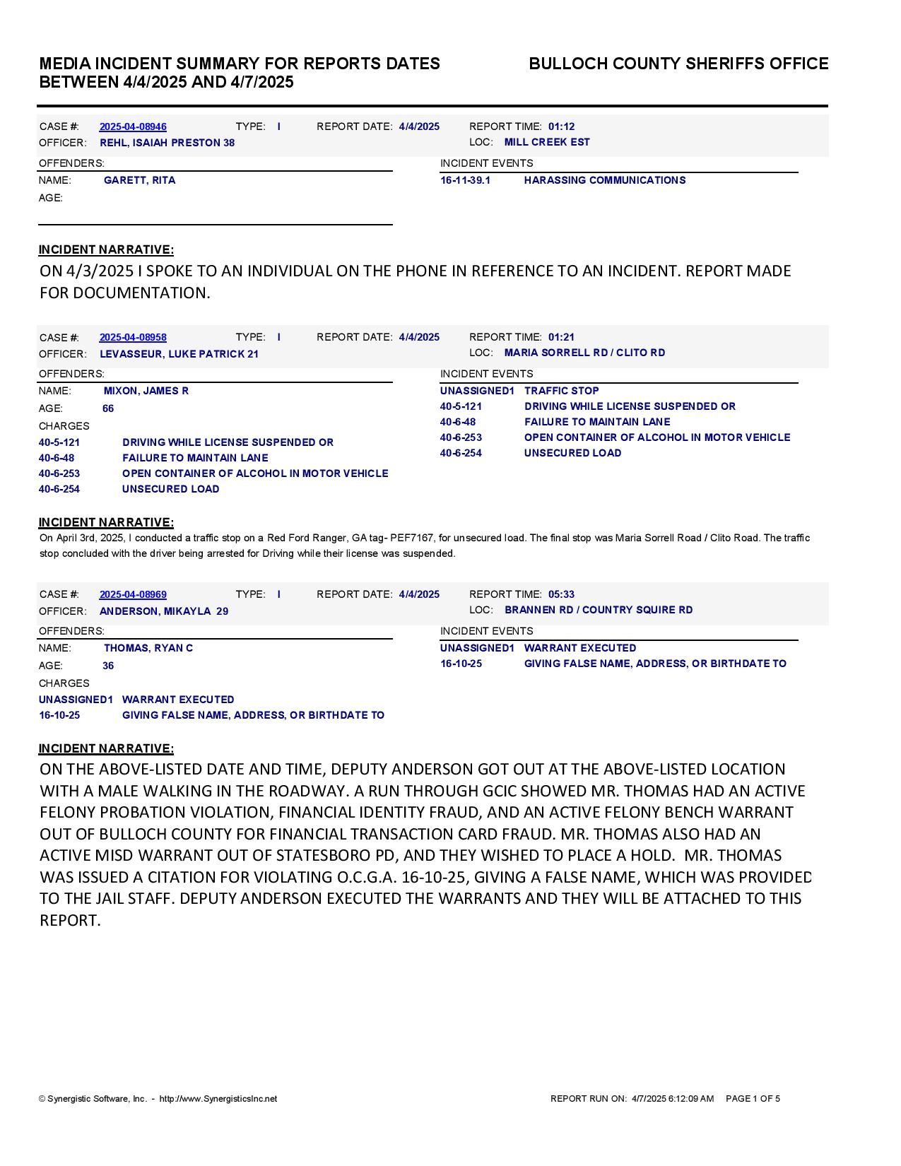 The Bulloch Co Jail Booking & Incident Report 04/07/25 details arrests from Bulloch Co., Statesboro, Brooklet, Portal, Register, and the Georgia State Patrol. Incident reports are from the Sheriff’s Office only.