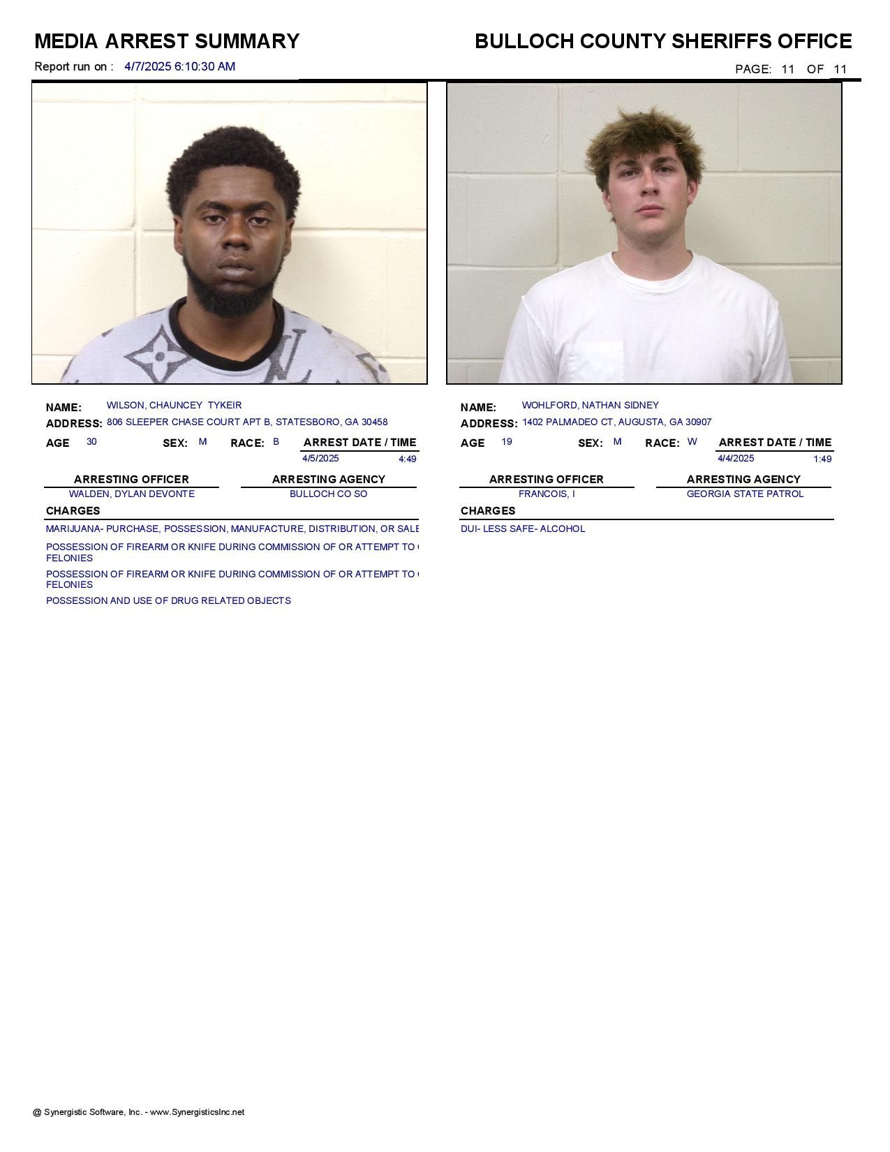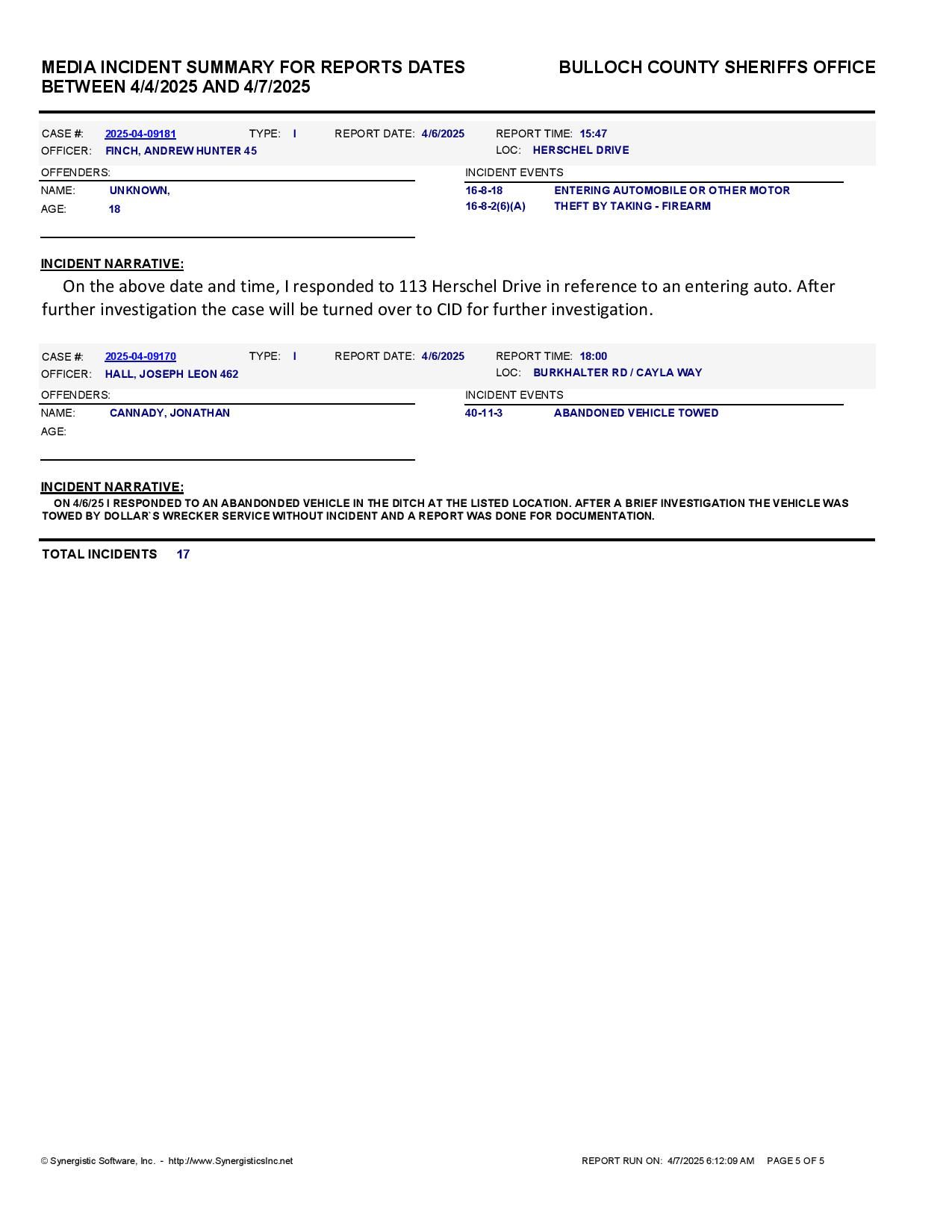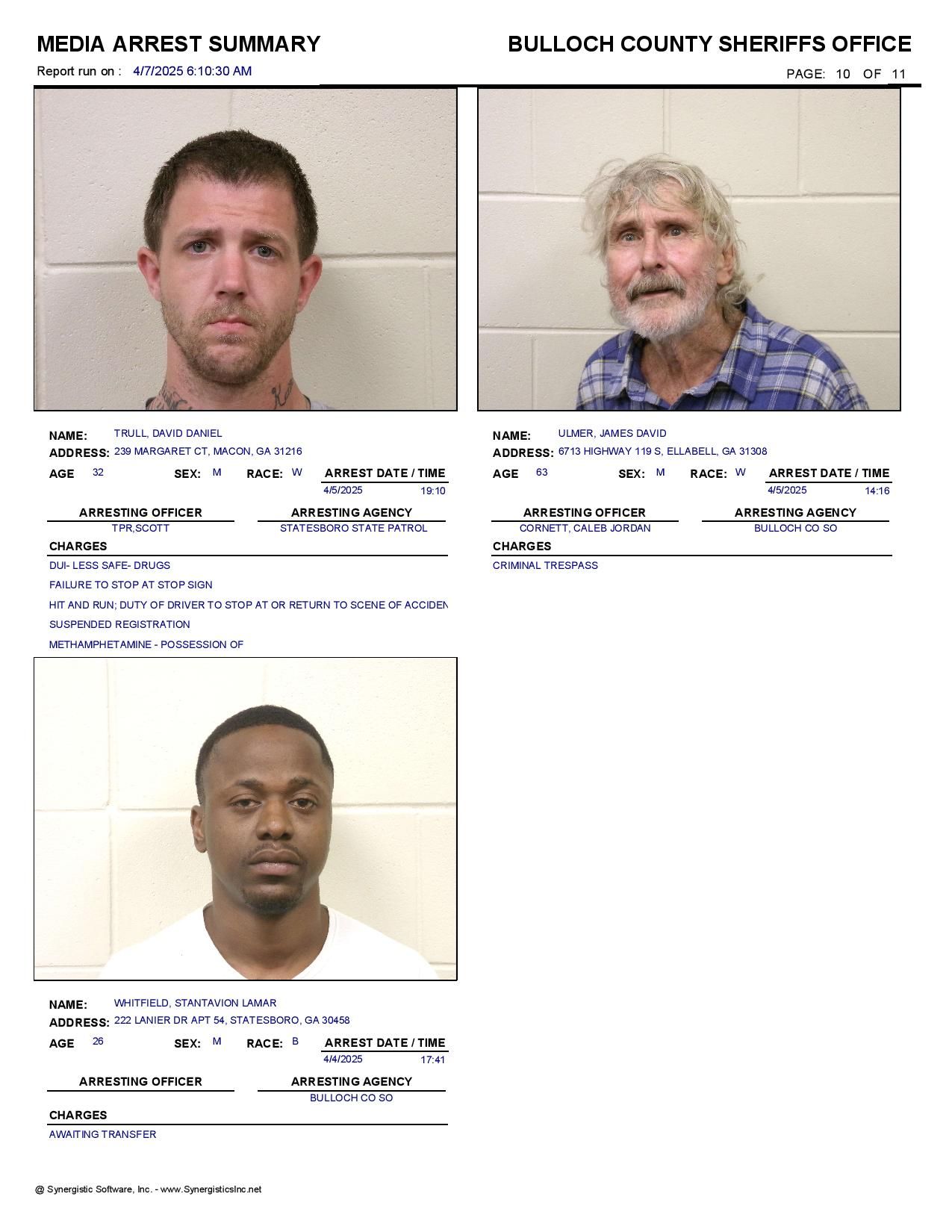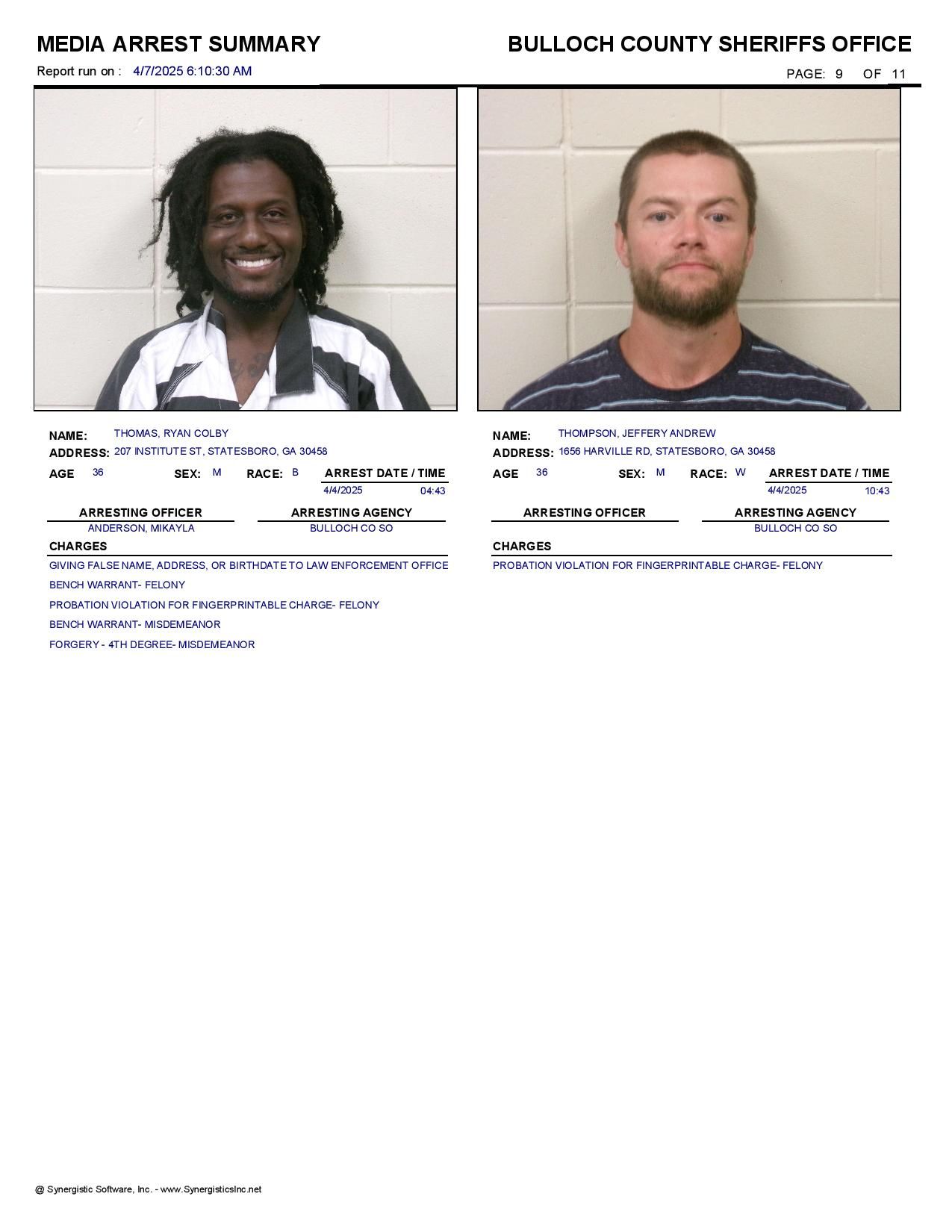 The Bulloch Co Jail Booking & Incident Report 04/07/25 details arrests from Bulloch Co., Statesboro, Brooklet, Portal, Register, and the Georgia State Patrol. Incident reports are from the Sheriff’s Office only.