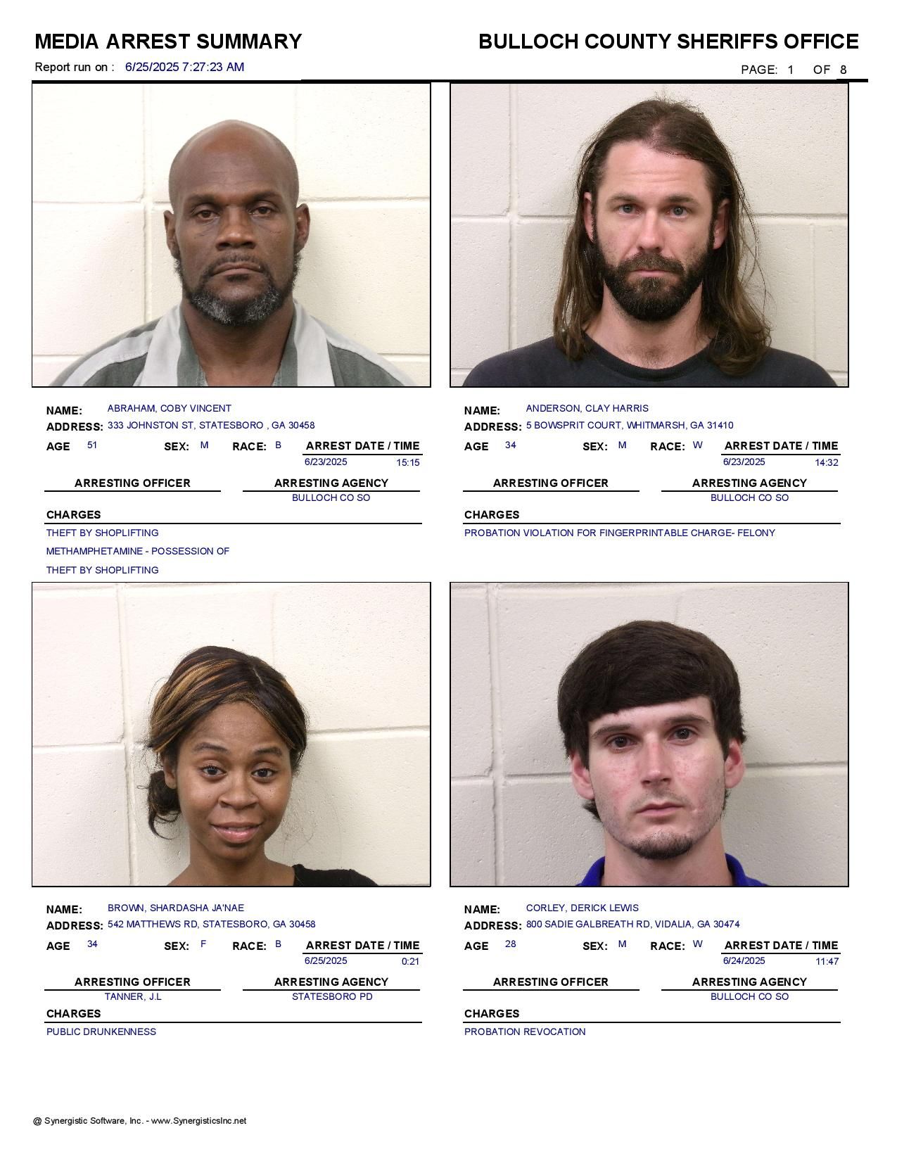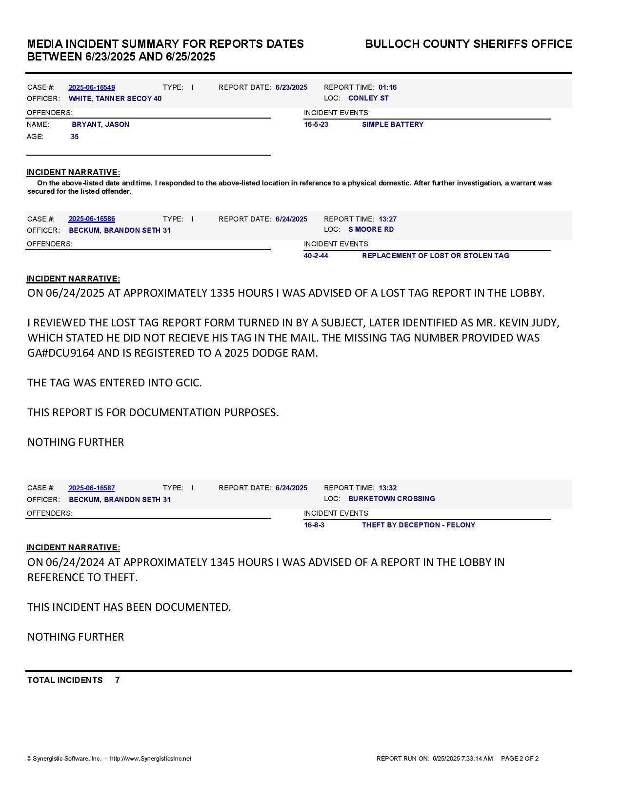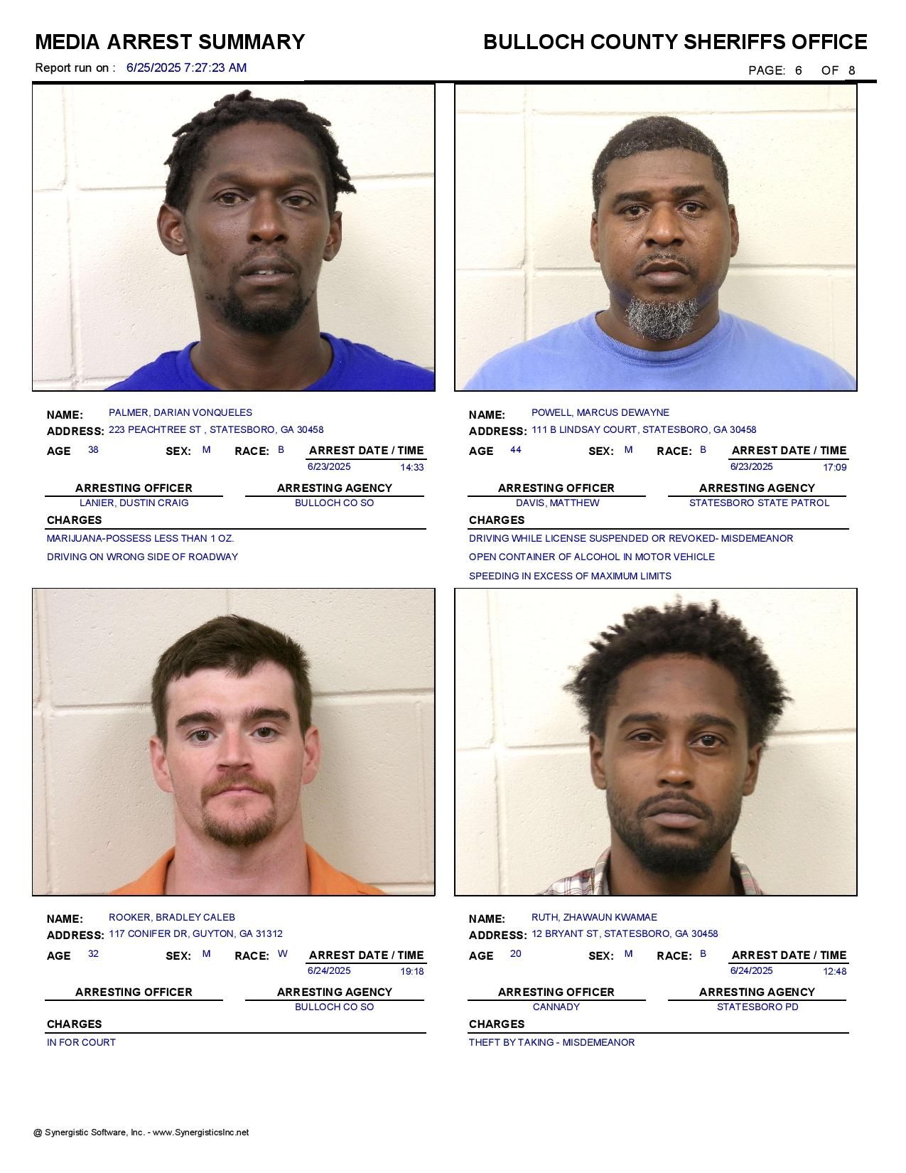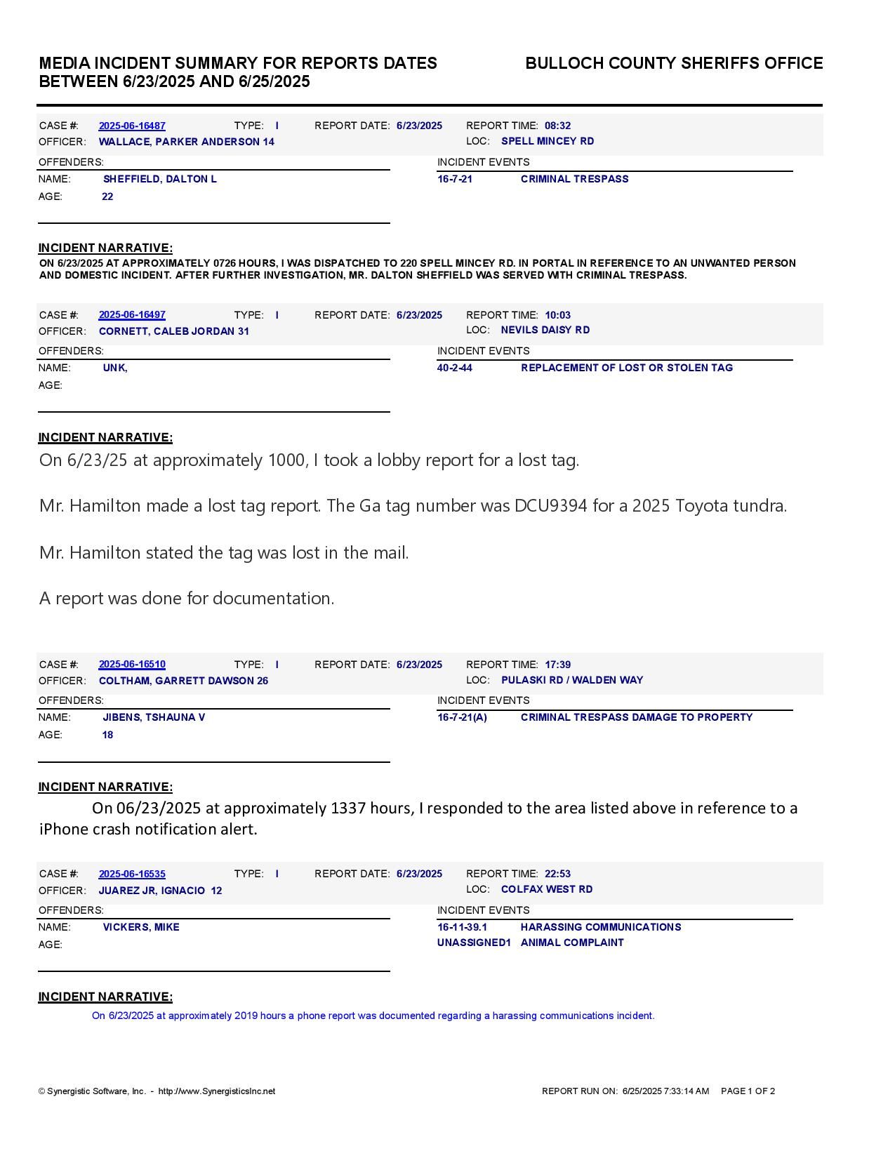 The Bulloch Co Jail Booking & Incident Report 06/25/25 details arrests from Bulloch Co., Statesboro, Brooklet, Portal, Register, and the Georgia State Patrol. Incident reports are from the Sheriff’s Office only.