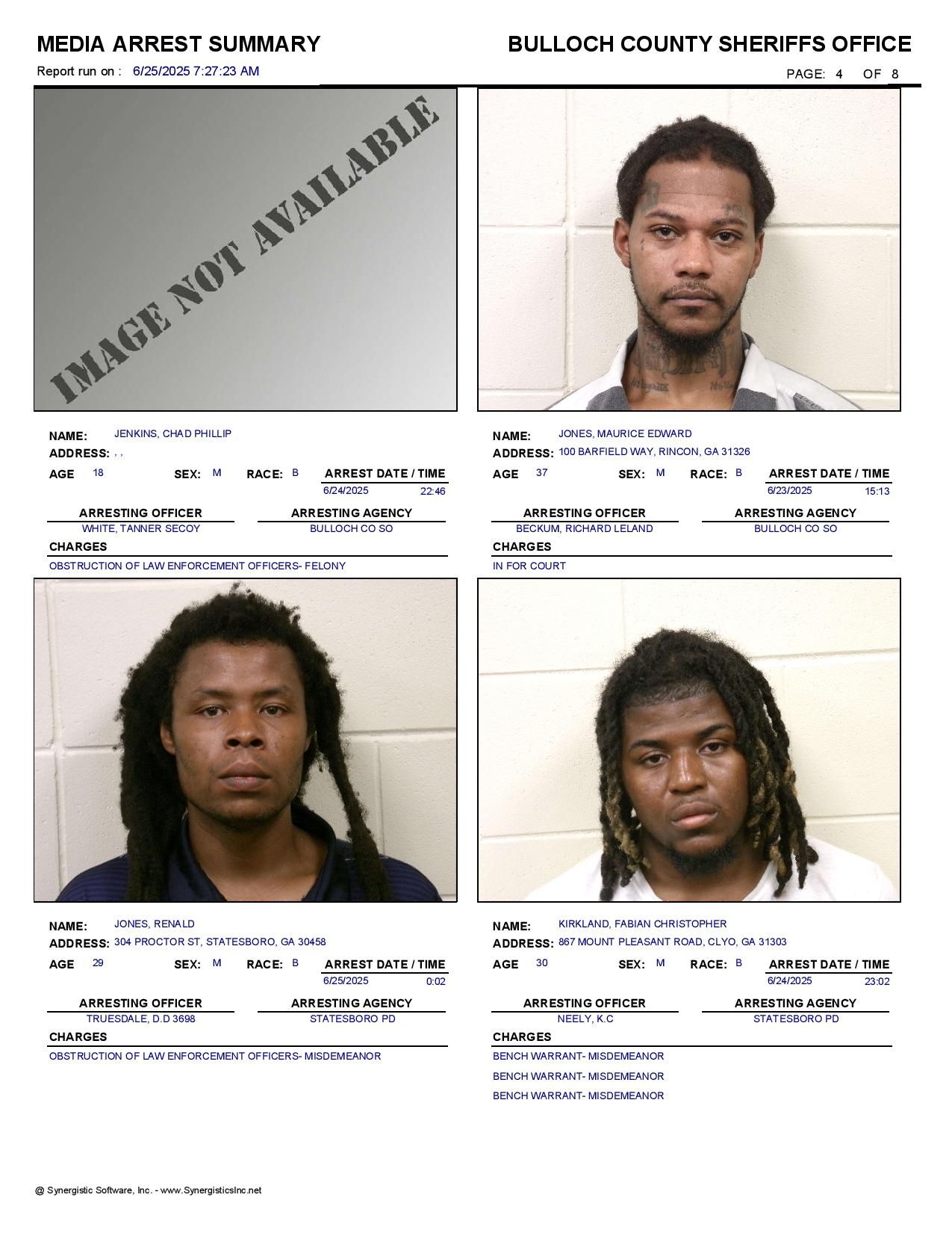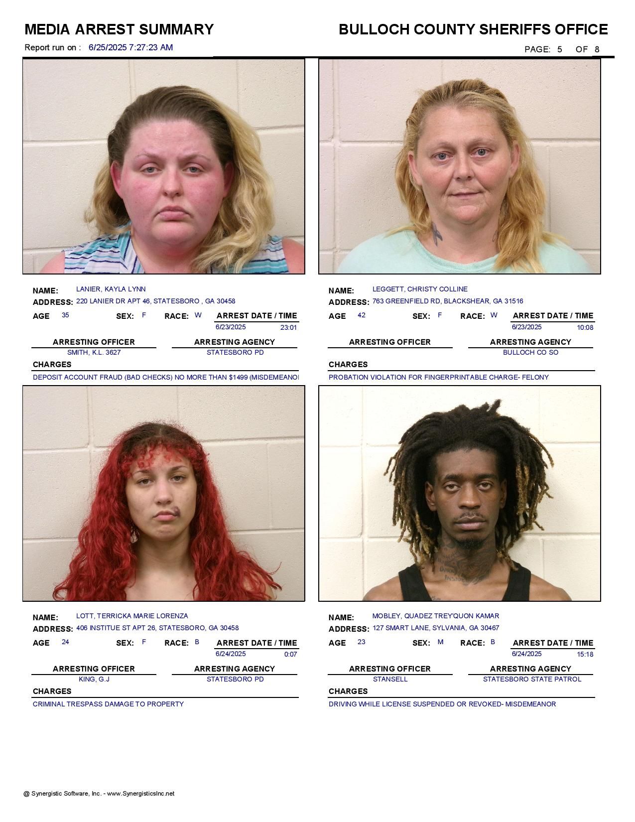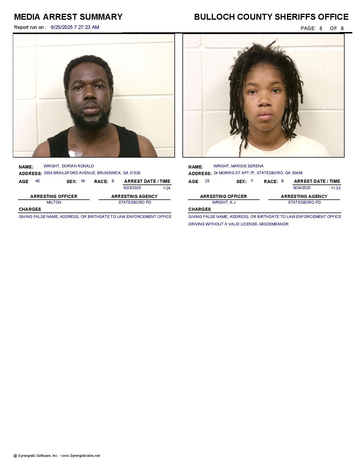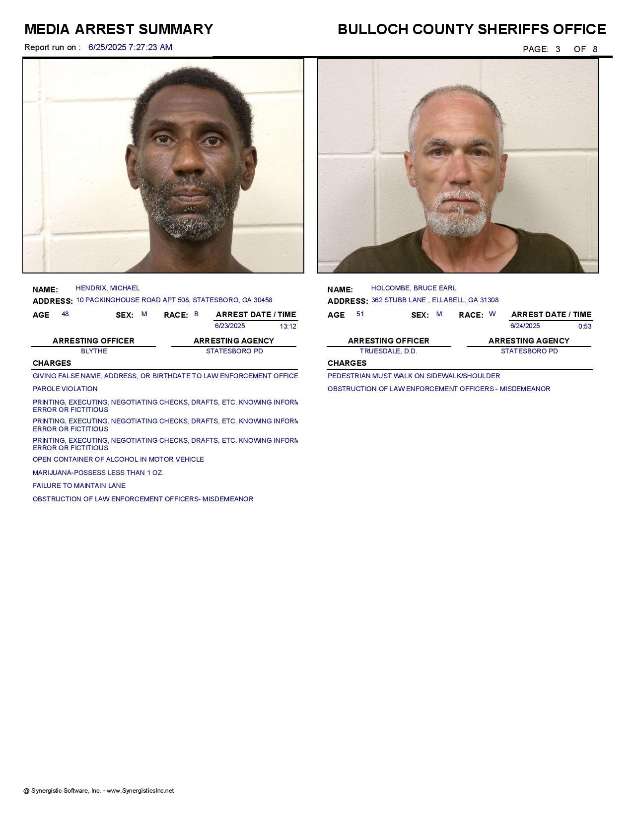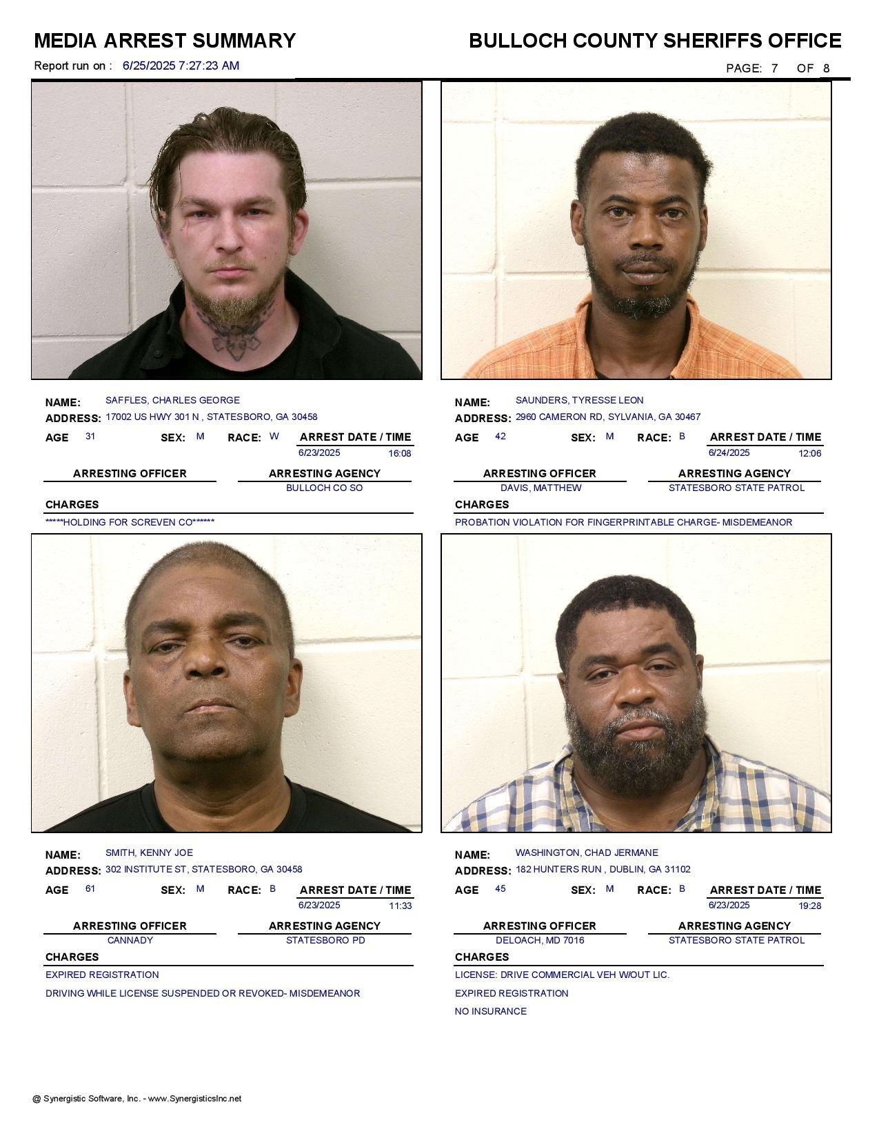 The Bulloch Co Jail Booking & Incident Report 06/25/25 details arrests from Bulloch Co., Statesboro, Brooklet, Portal, Register, and the Georgia State Patrol. Incident reports are from the Sheriff’s Office only.