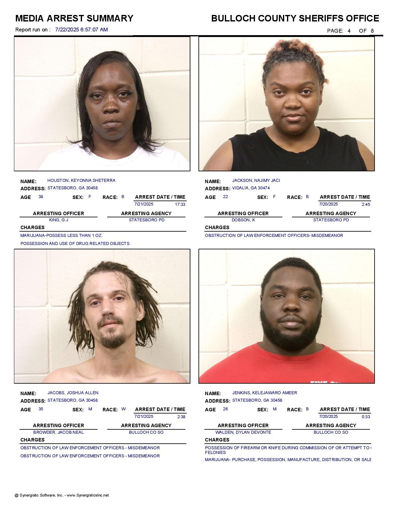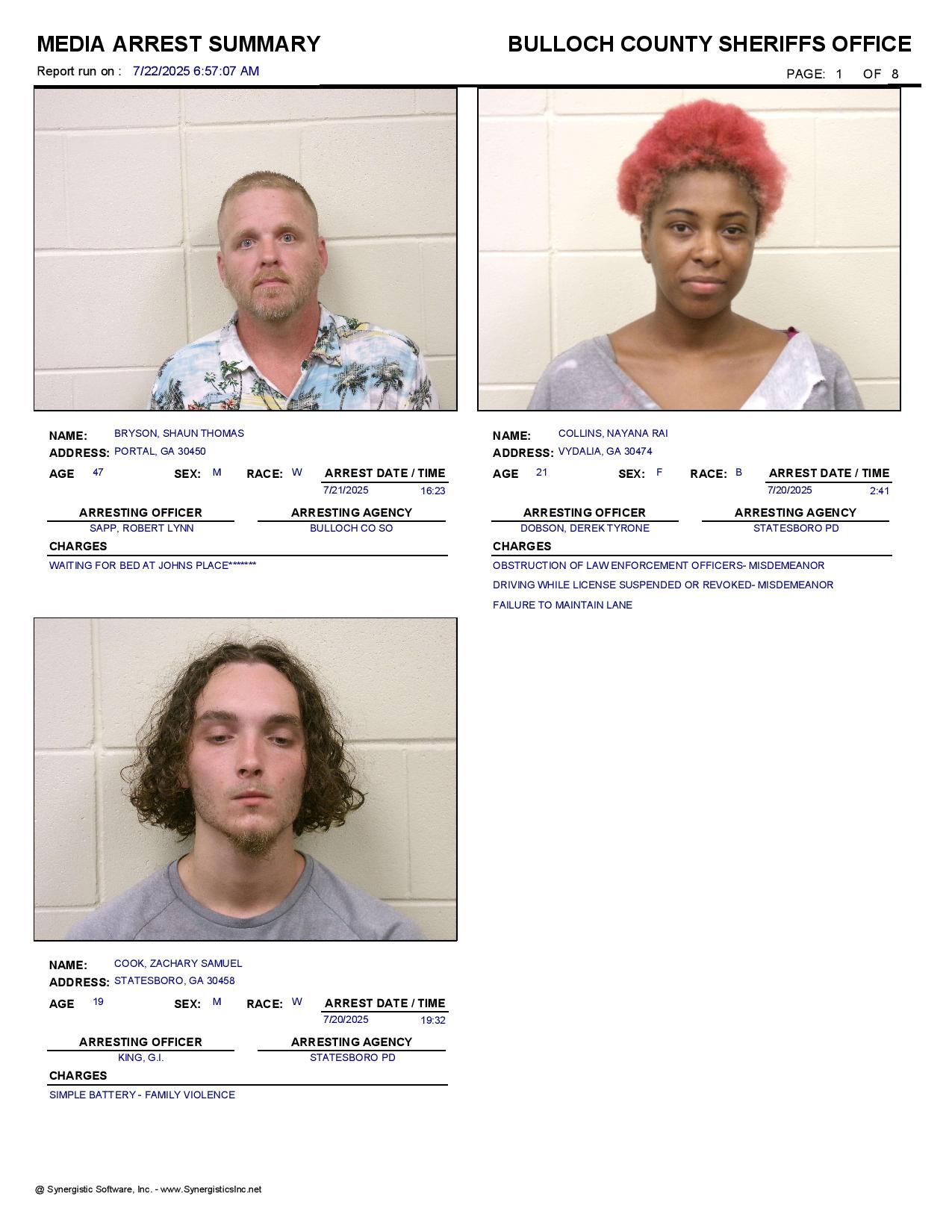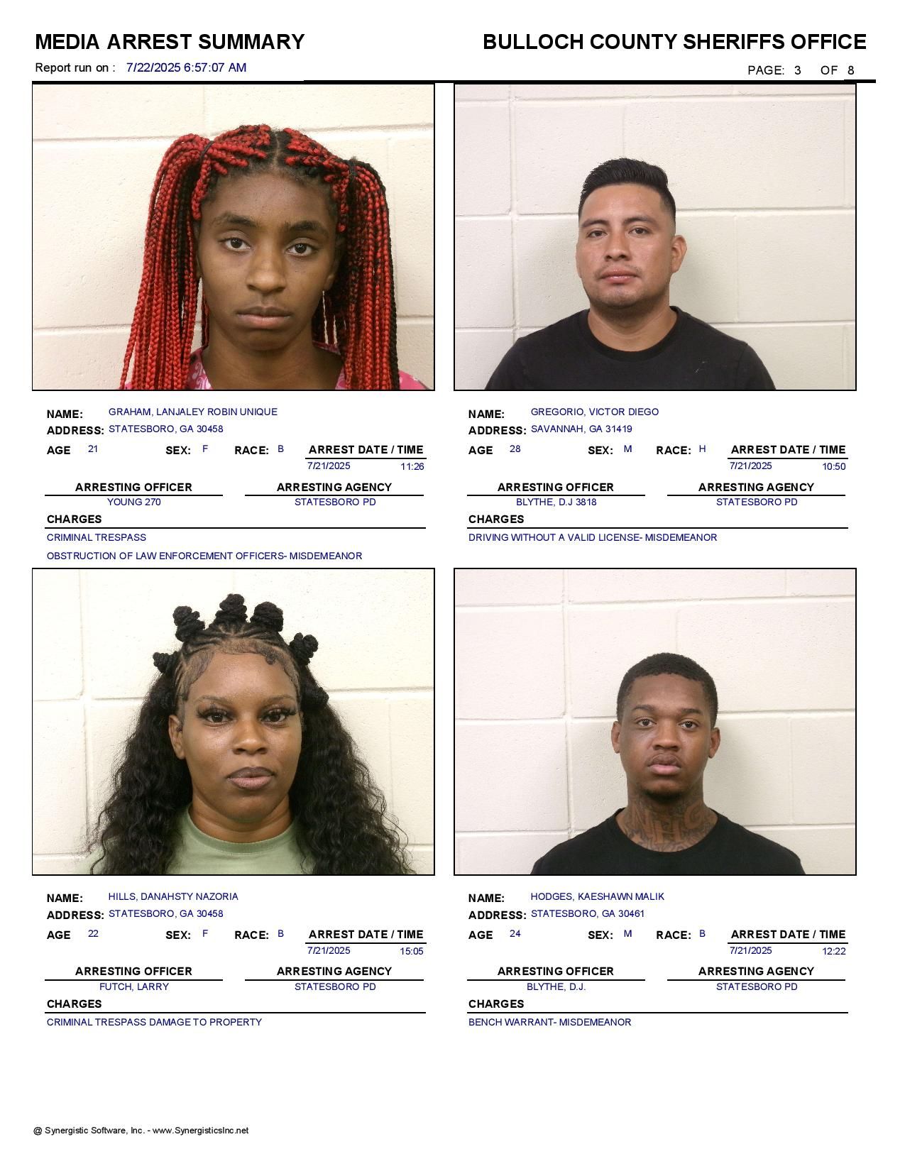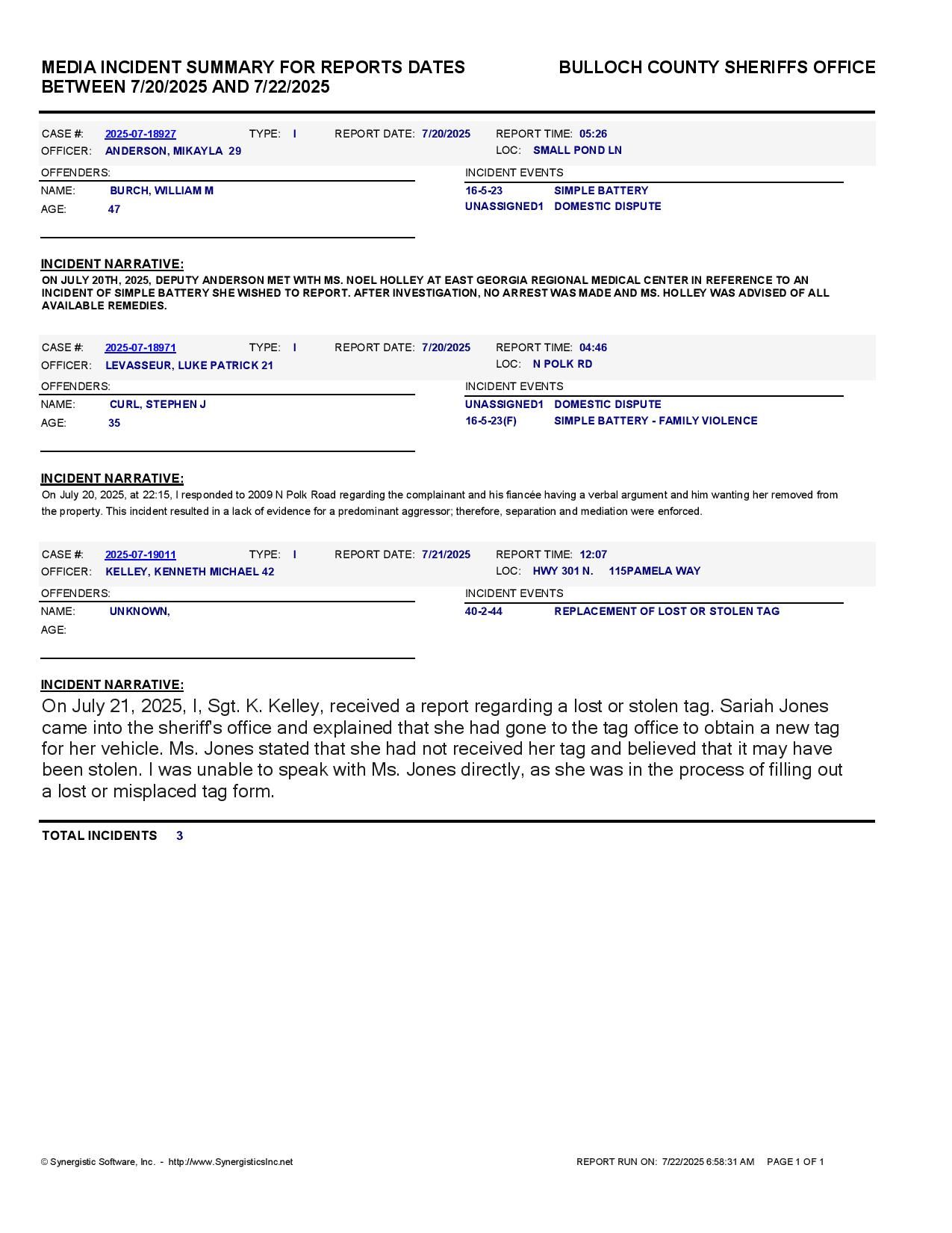 The Bulloch Co Jail Booking & Incident Report 07/22/25 details arrests from Bulloch Co., Statesboro, Brooklet, Portal, Register, and the Georgia State Patrol. Incident reports are from the Sheriff’s Office only.