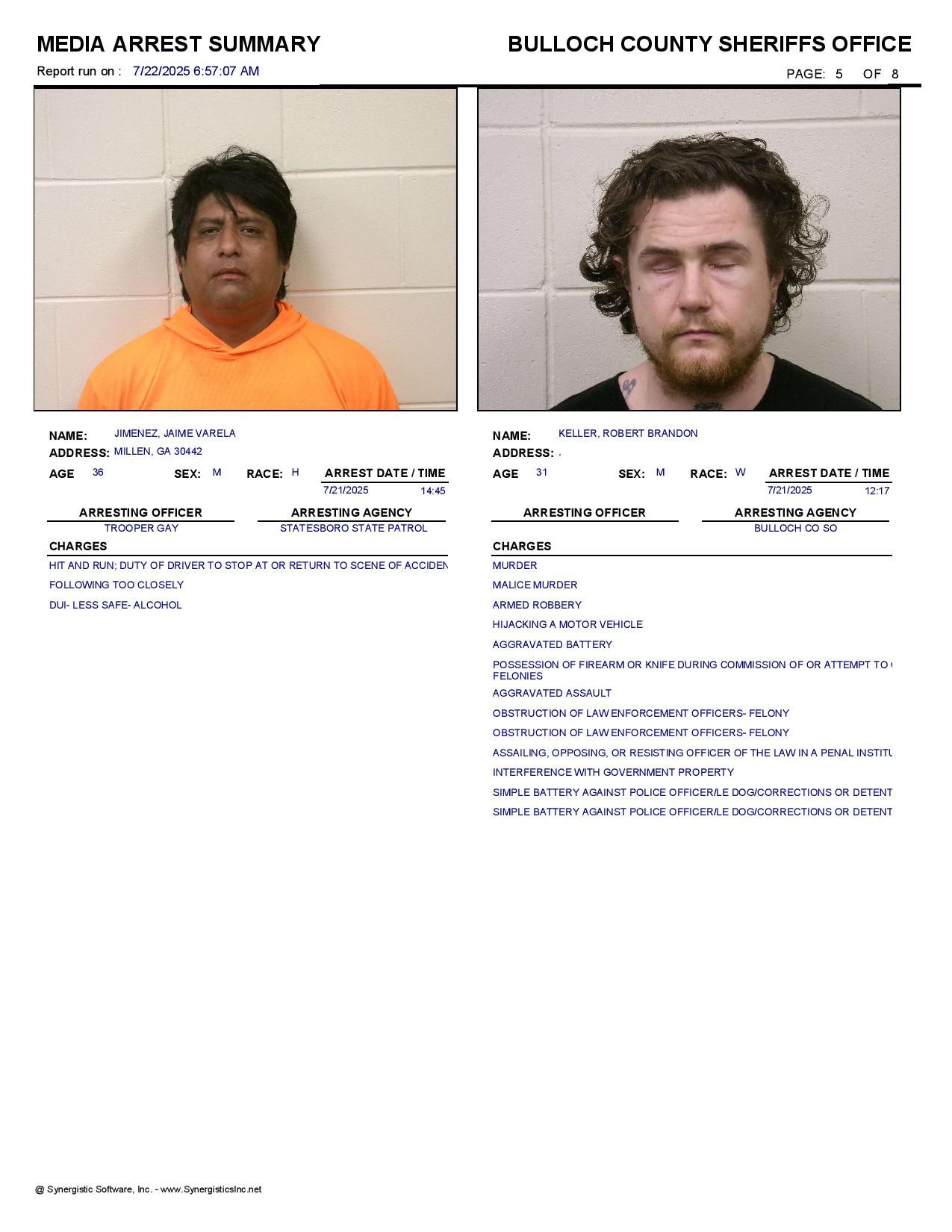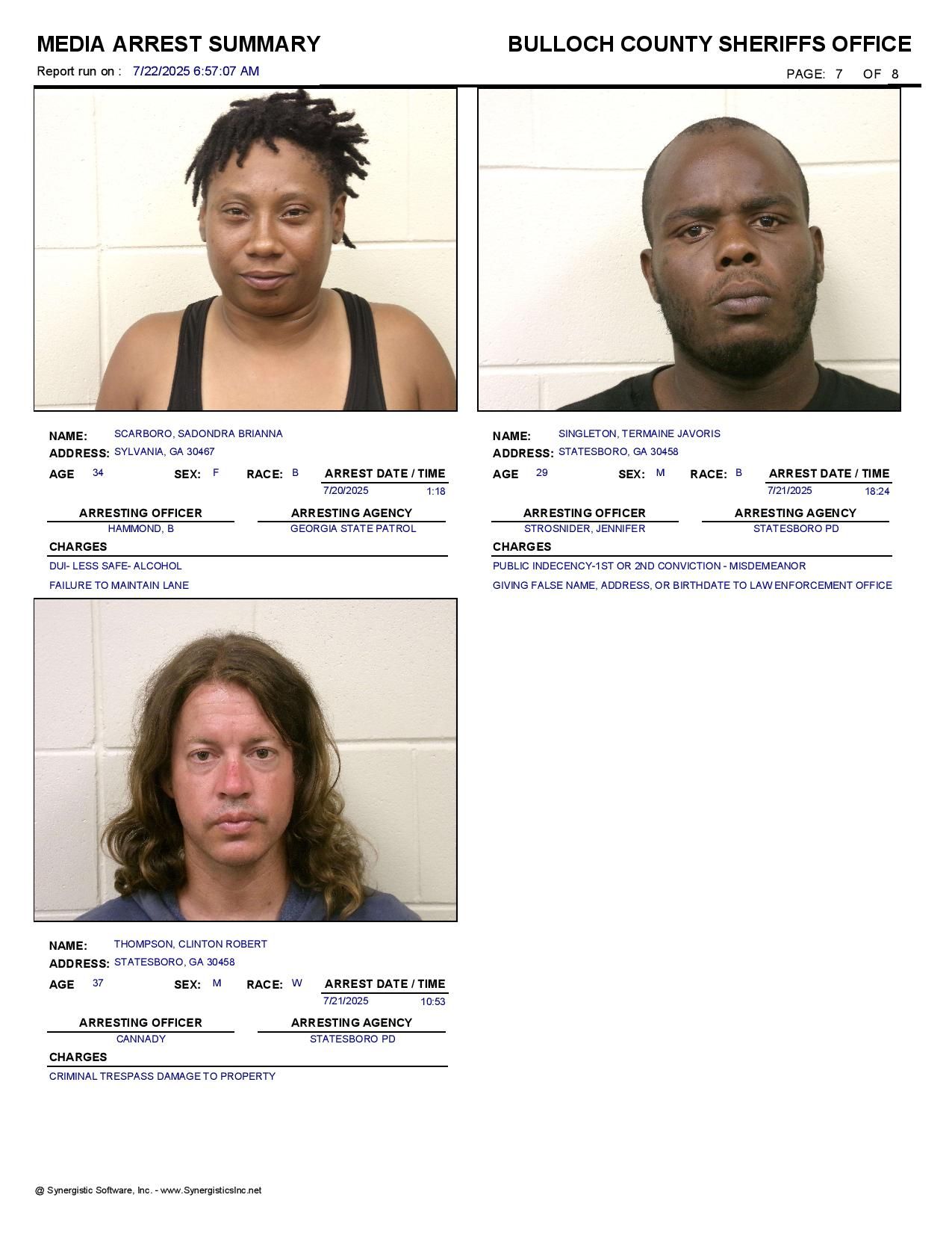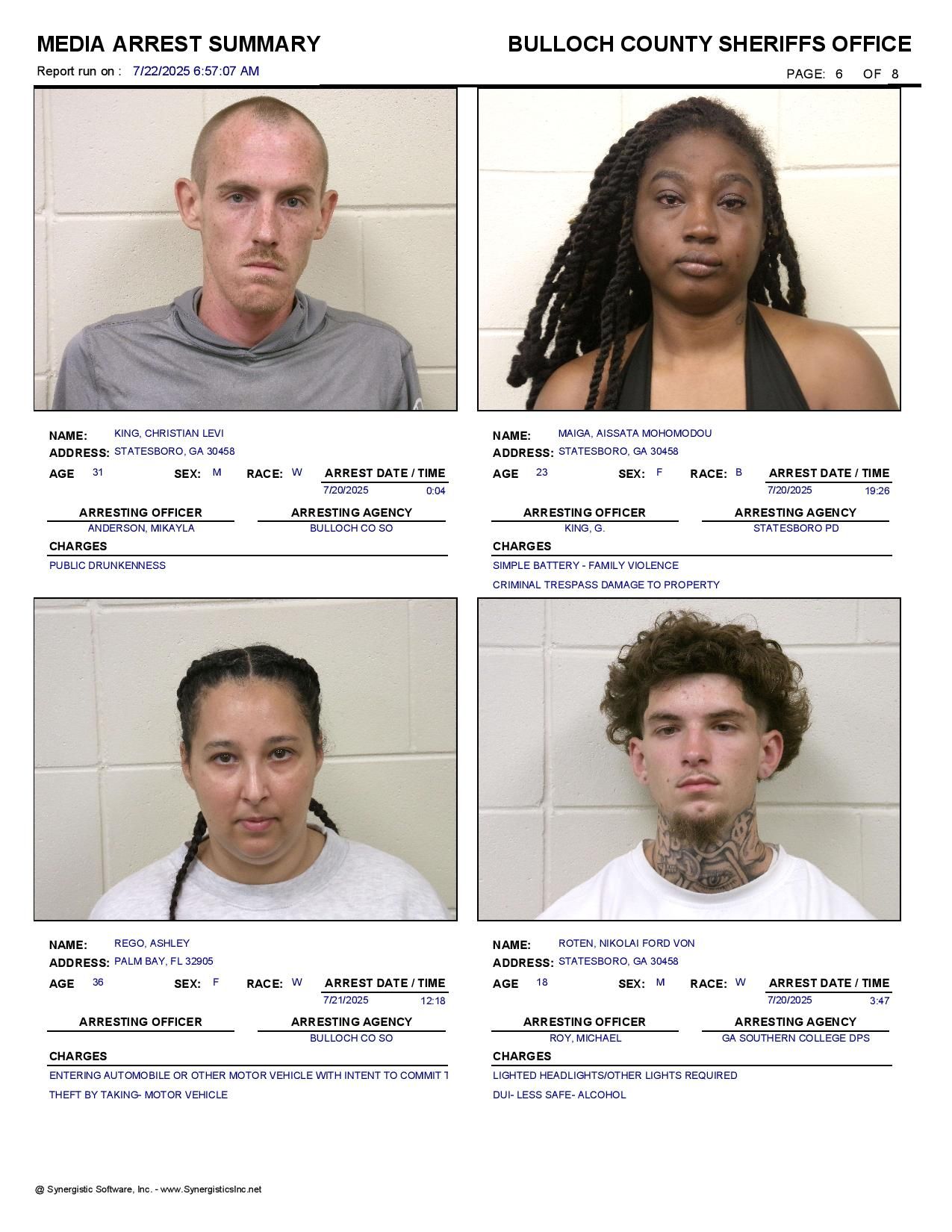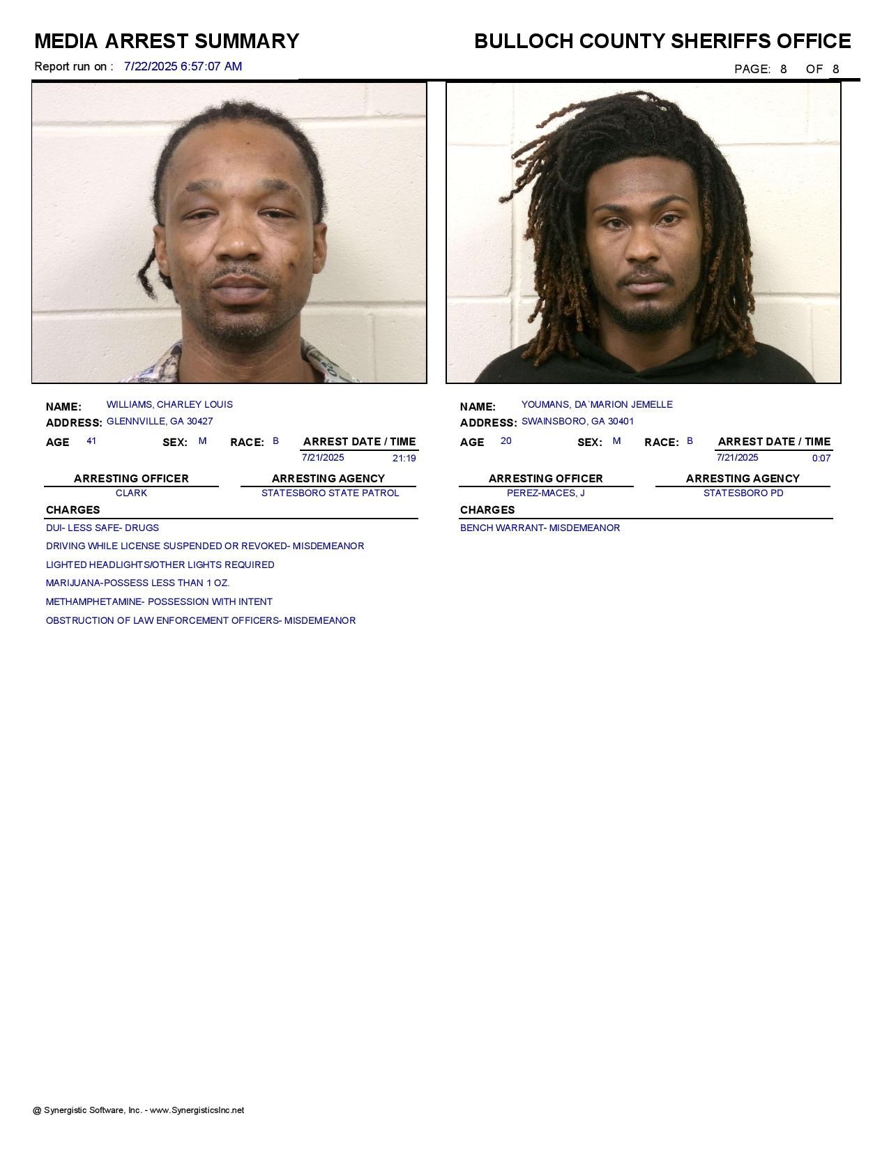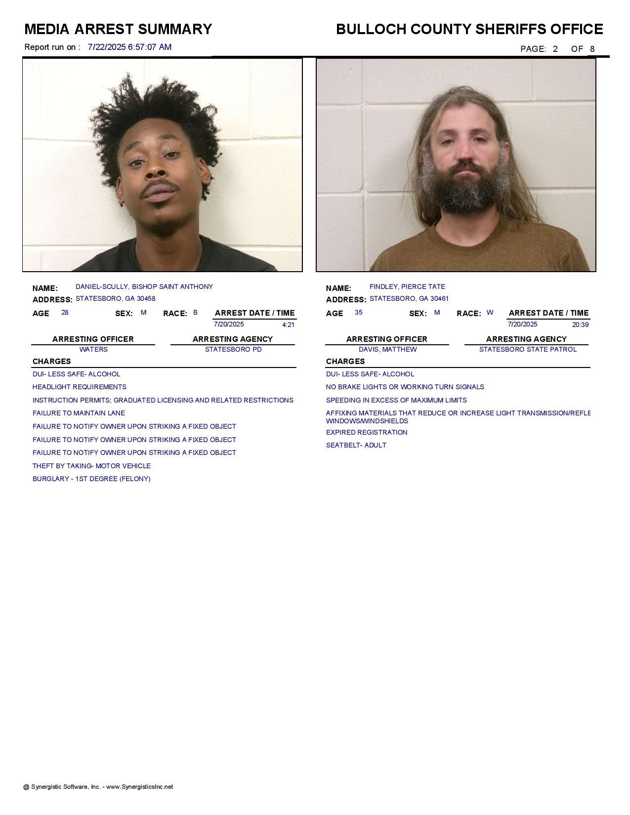 The Bulloch Co Jail Booking & Incident Report 07/22/25 details arrests from Bulloch Co., Statesboro, Brooklet, Portal, Register, and the Georgia State Patrol. Incident reports are from the Sheriff’s Office only.
