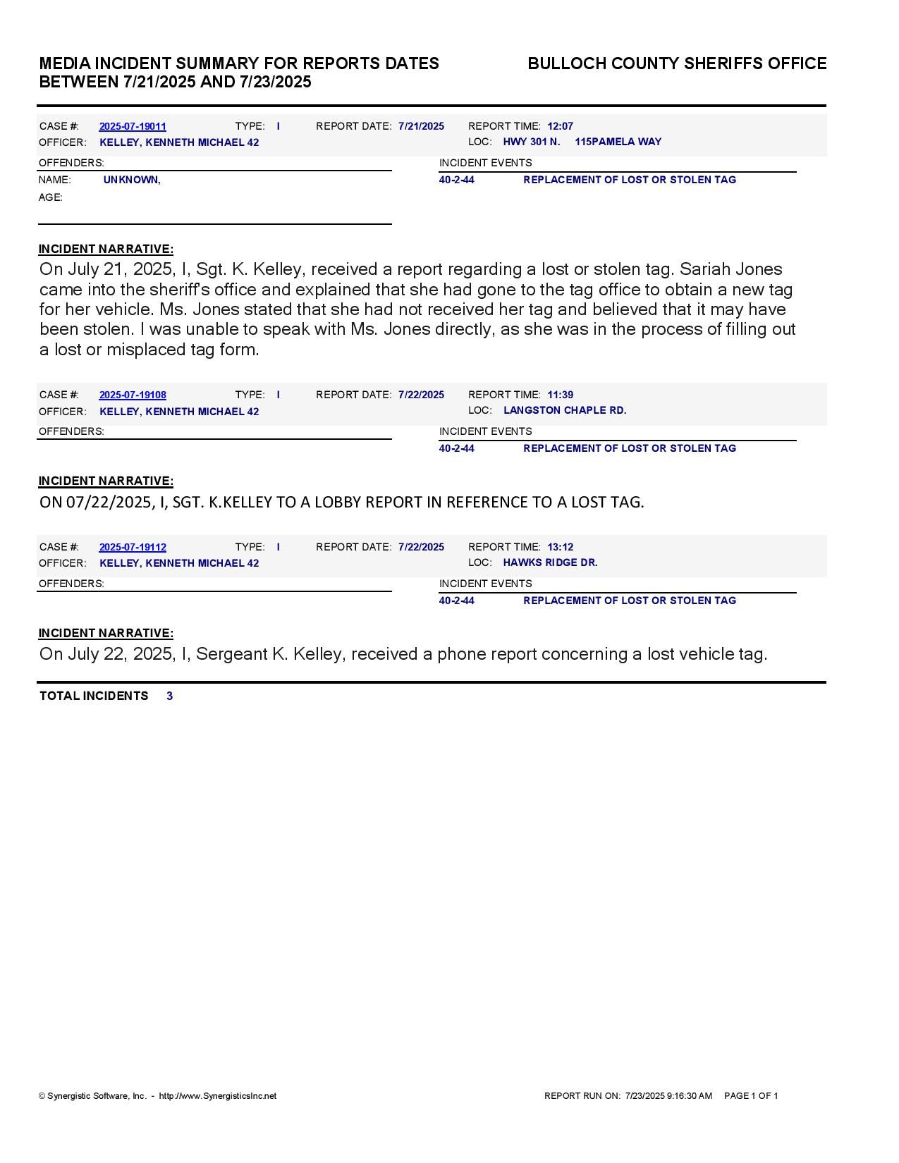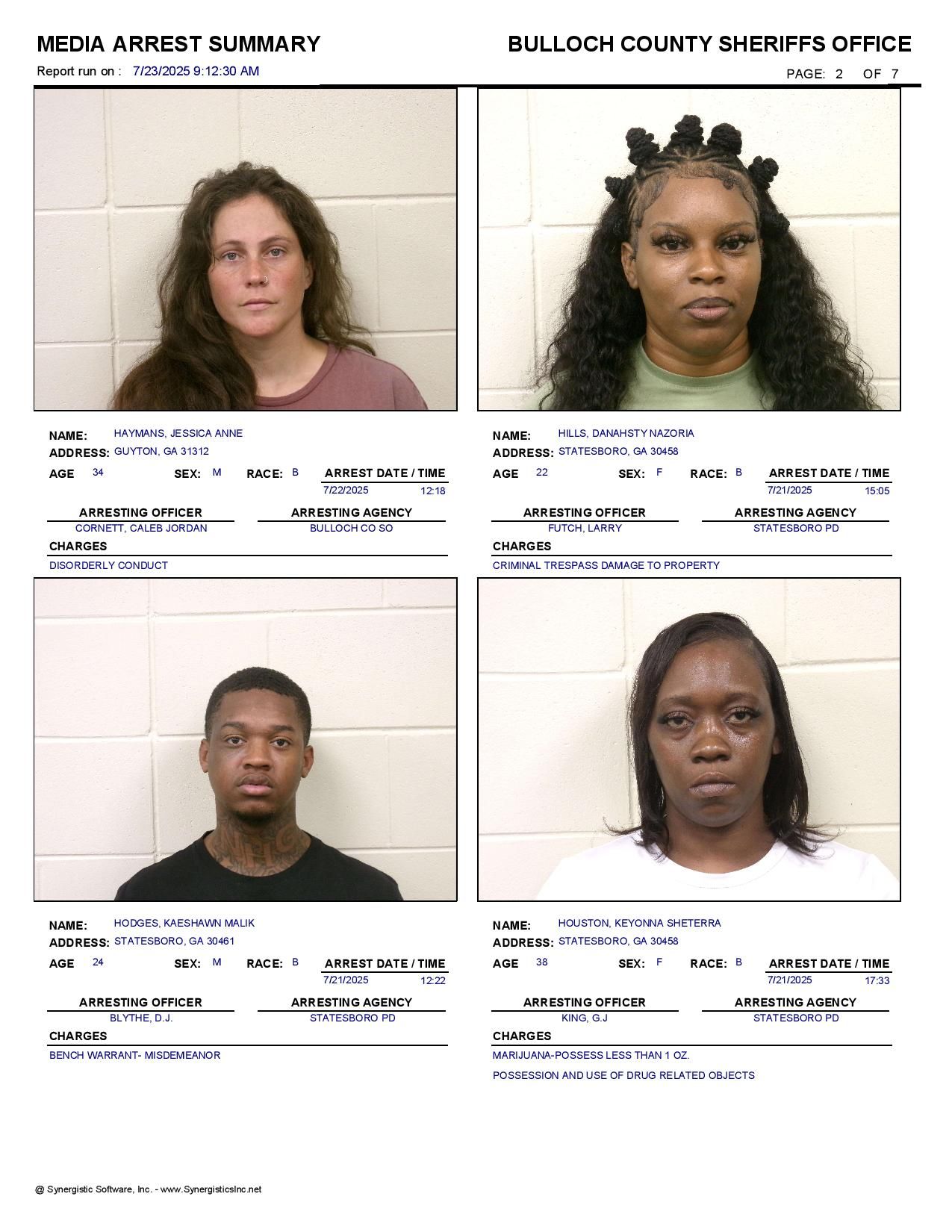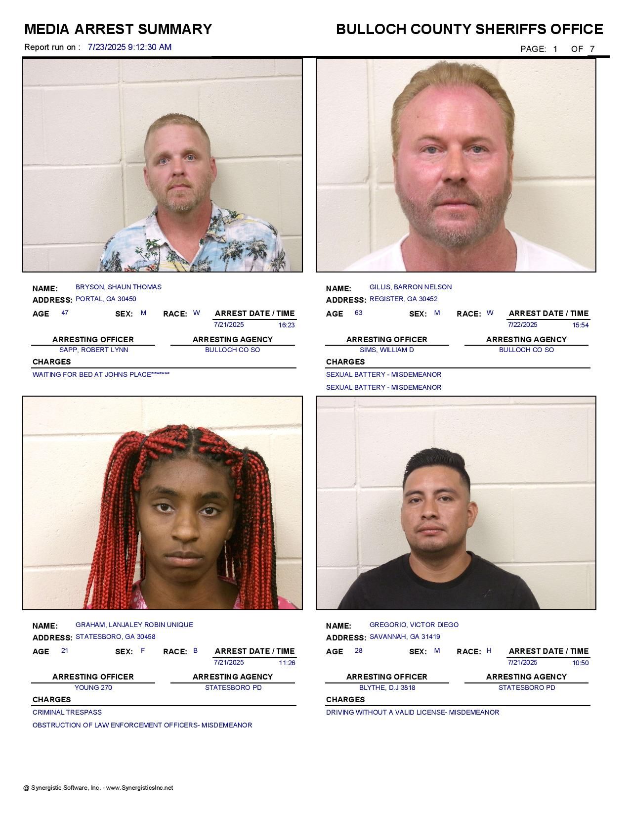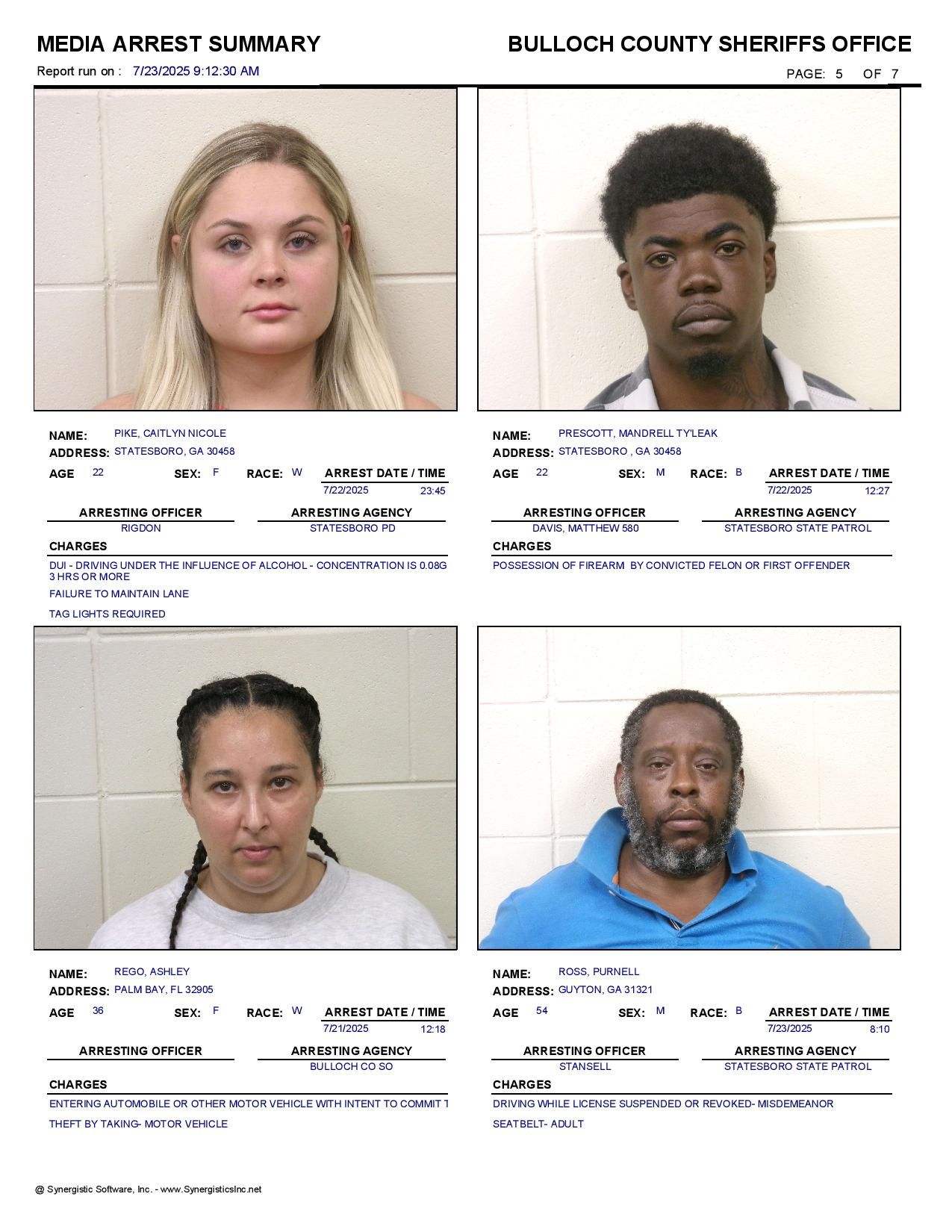 The Bulloch Co Jail Booking & Incident Report 07/23/25 details arrests from Bulloch Co., Statesboro, Brooklet, Portal, Register, and the Georgia State Patrol. Incident reports are from the Sheriff’s Office only.