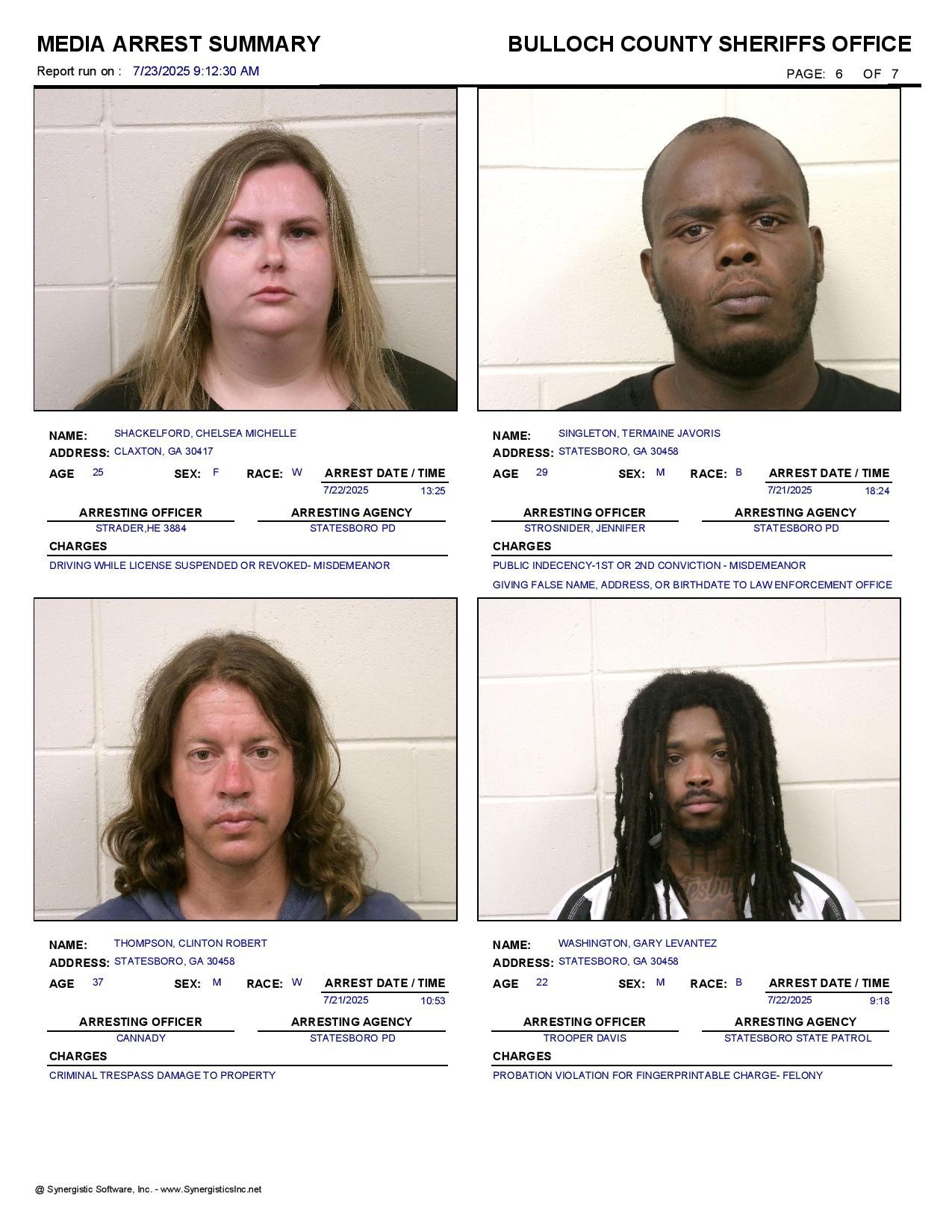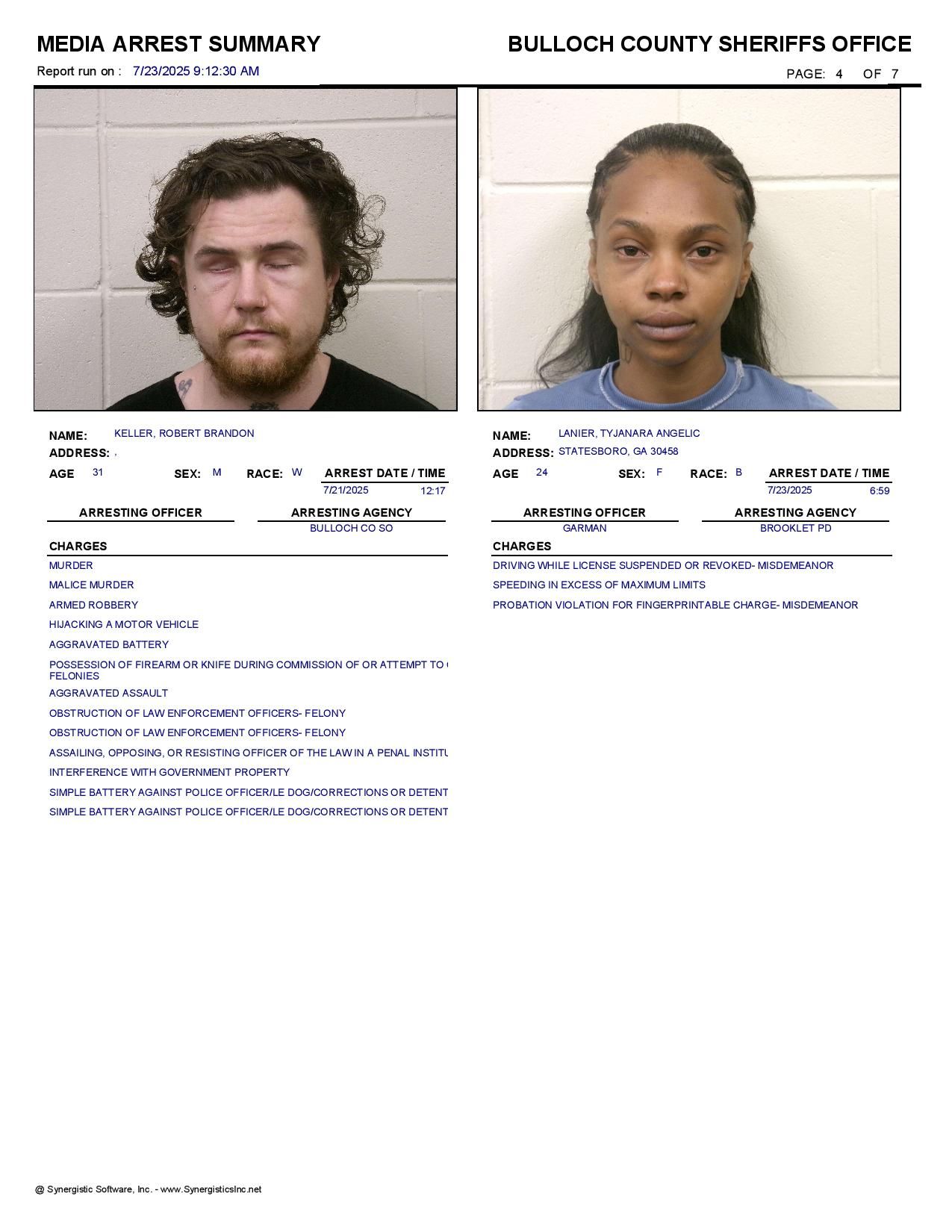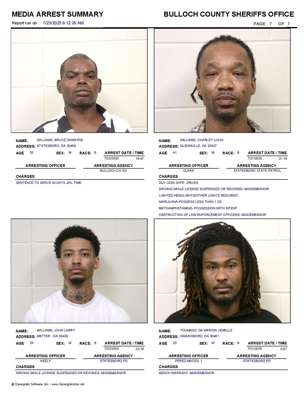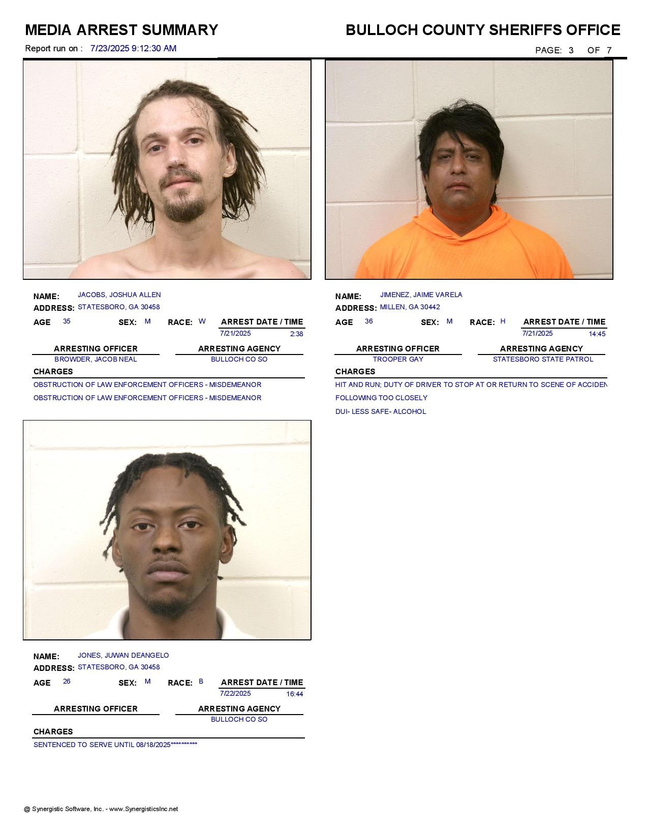 The Bulloch Co Jail Booking & Incident Report 07/23/25 details arrests from Bulloch Co., Statesboro, Brooklet, Portal, Register, and the Georgia State Patrol. Incident reports are from the Sheriff’s Office only.
