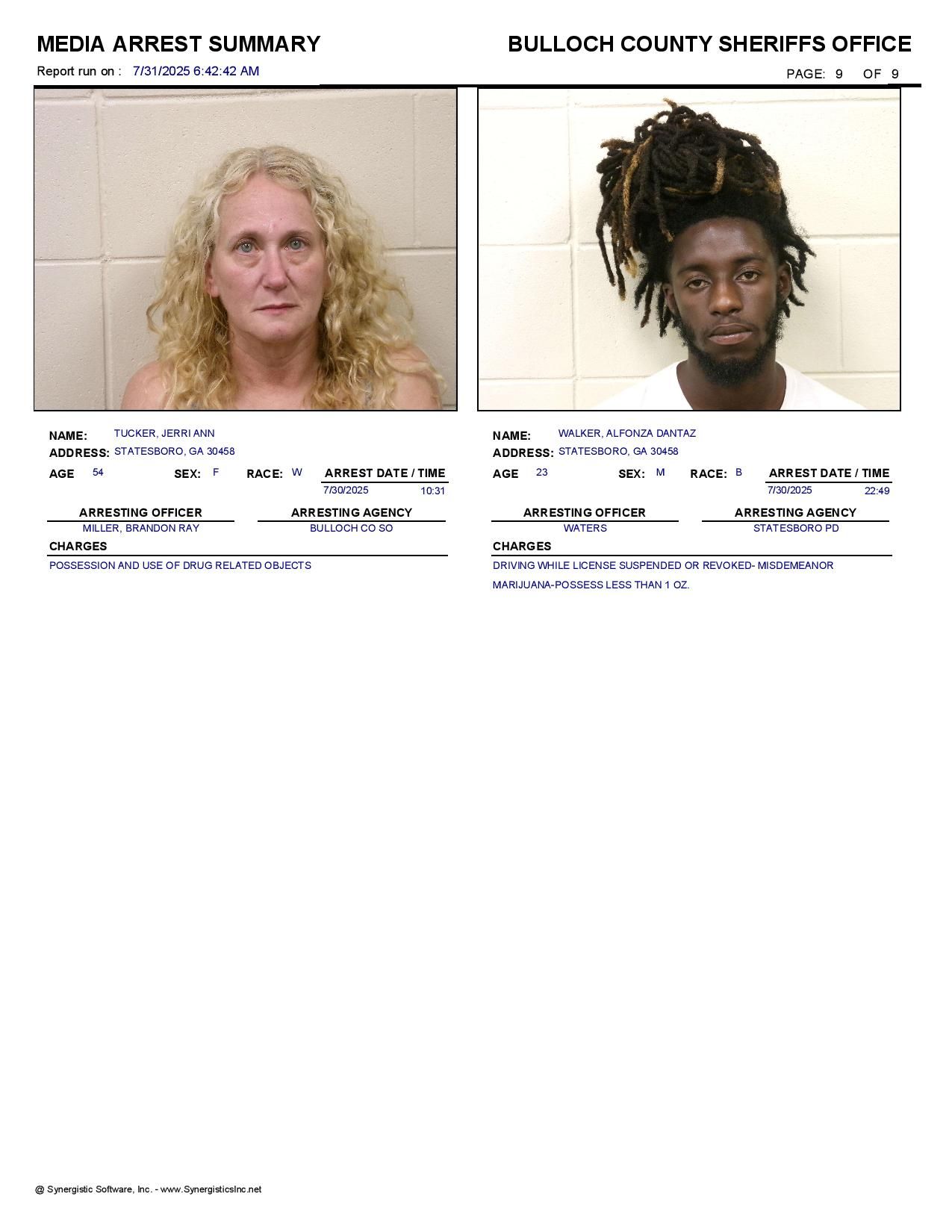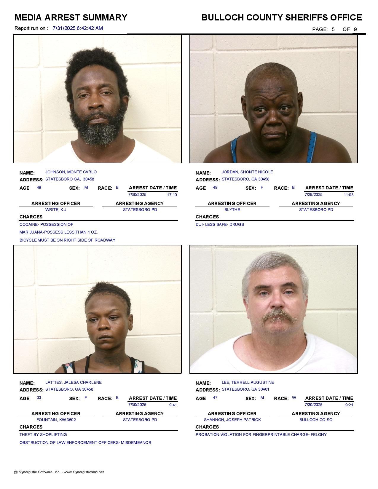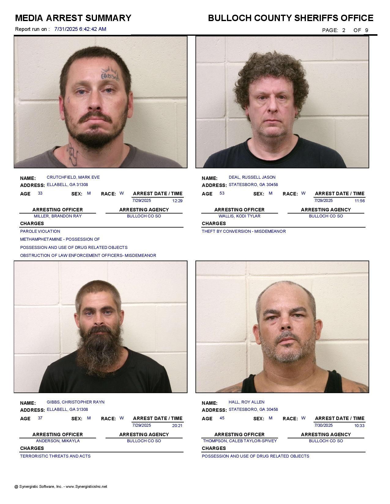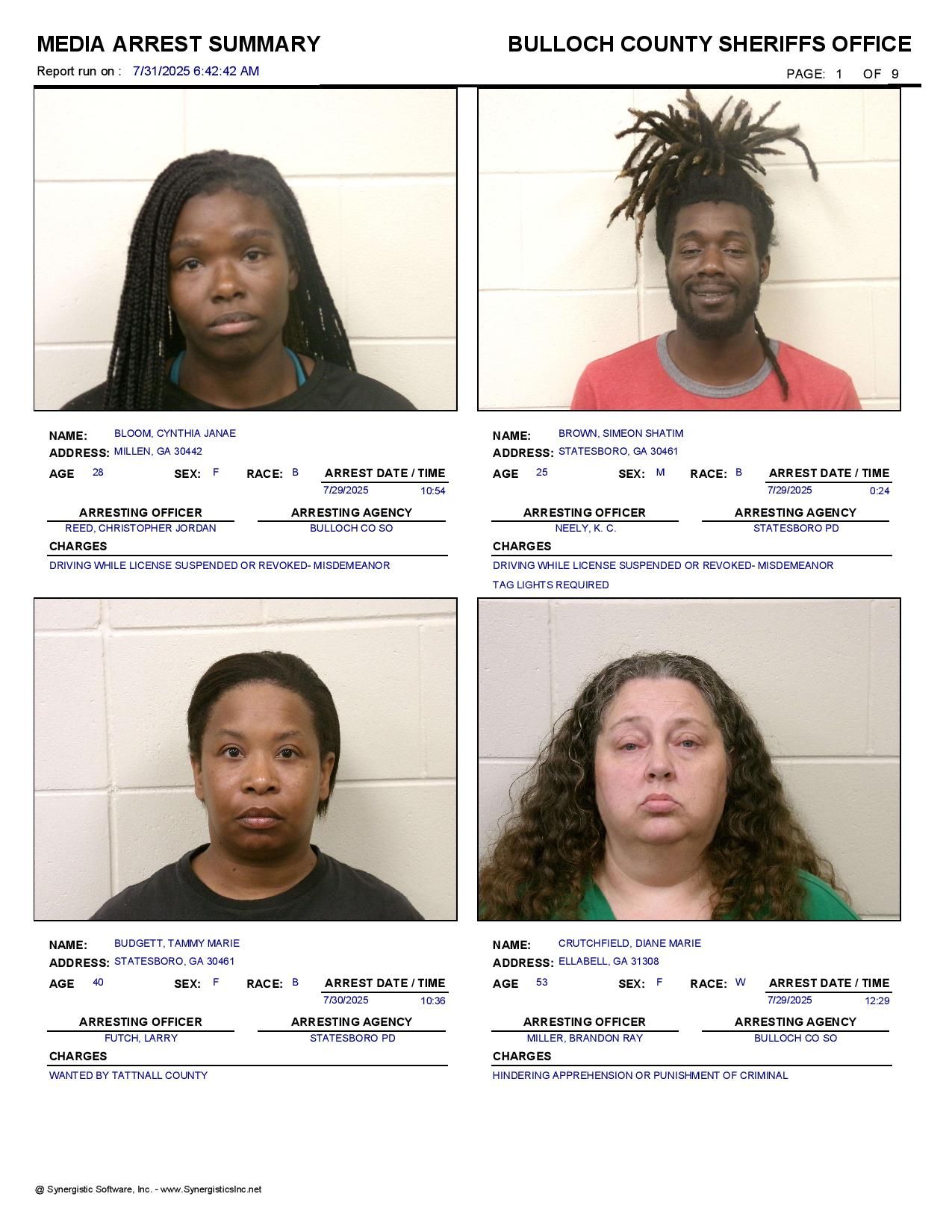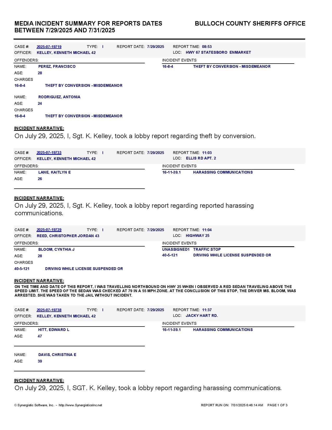 The Bulloch Co Jail Booking & Incident Report 07/31/25 details arrests from Bulloch Co., Statesboro, Brooklet, Portal, Register, and the Georgia State Patrol. Incident reports are from the Sheriff’s Office only.