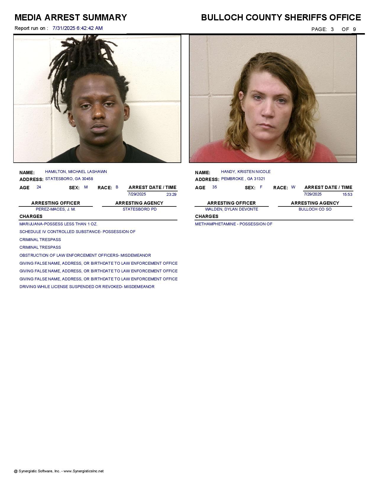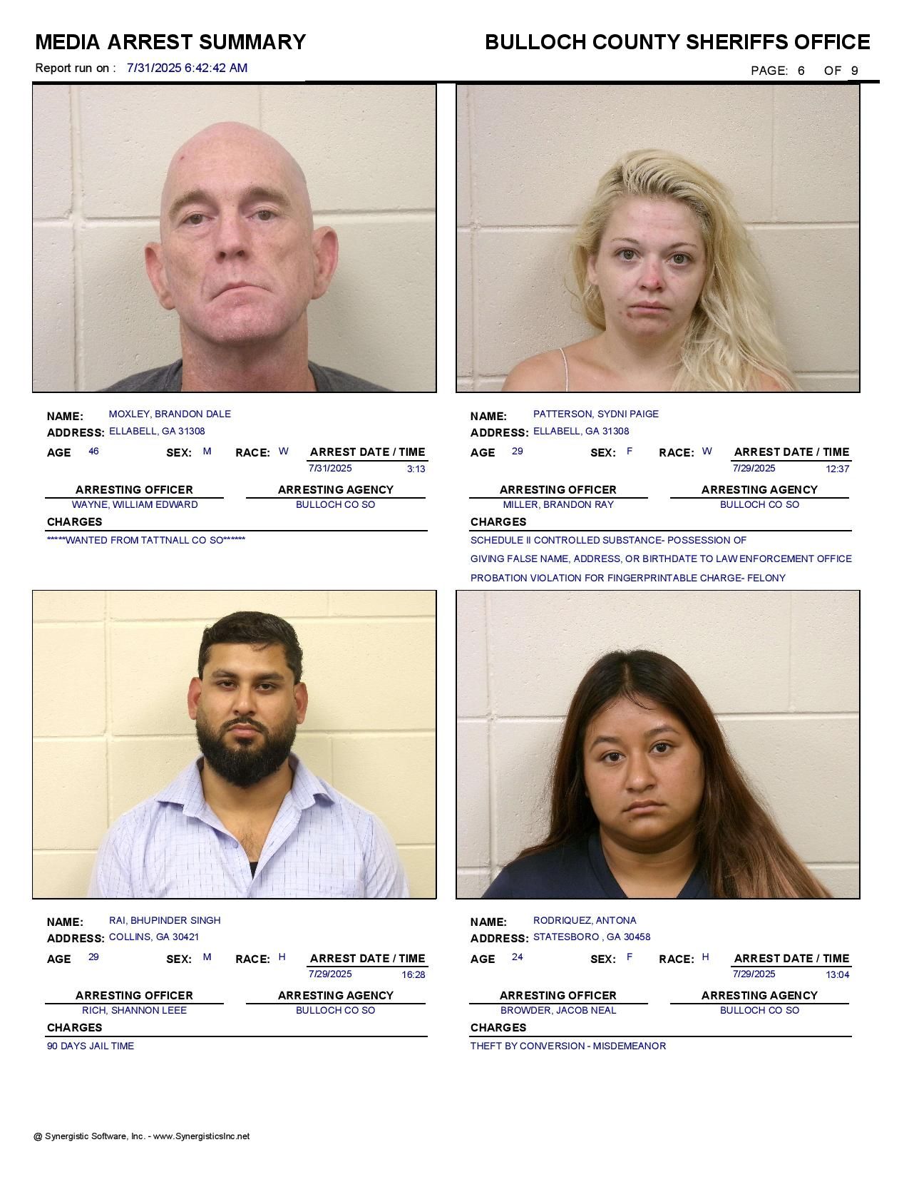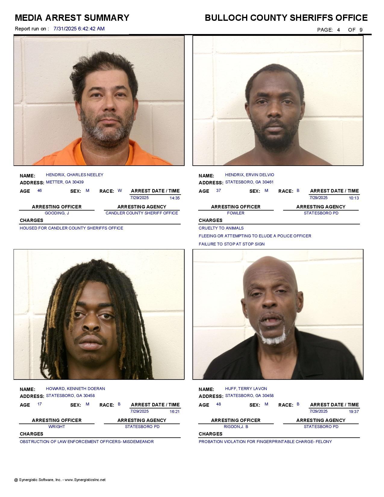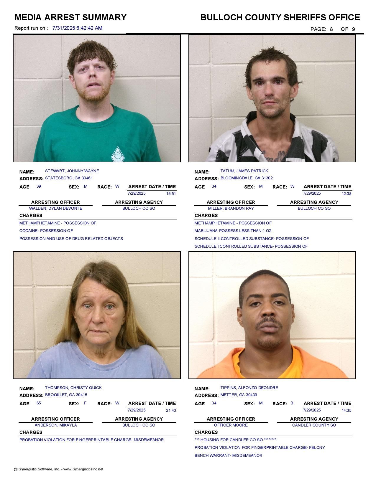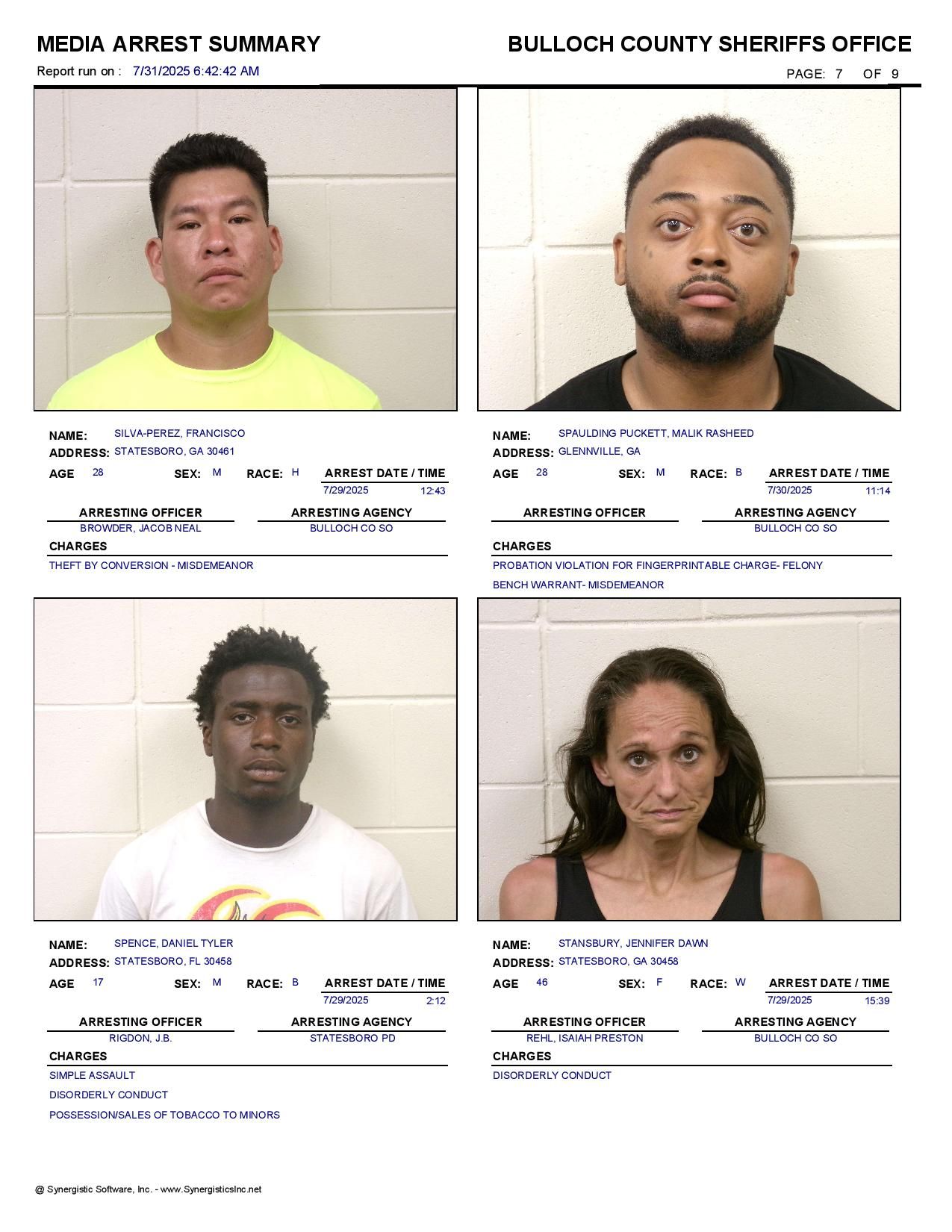 The Bulloch Co Jail Booking & Incident Report 07/31/25 details arrests from Bulloch Co., Statesboro, Brooklet, Portal, Register, and the Georgia State Patrol. Incident reports are from the Sheriff’s Office only.